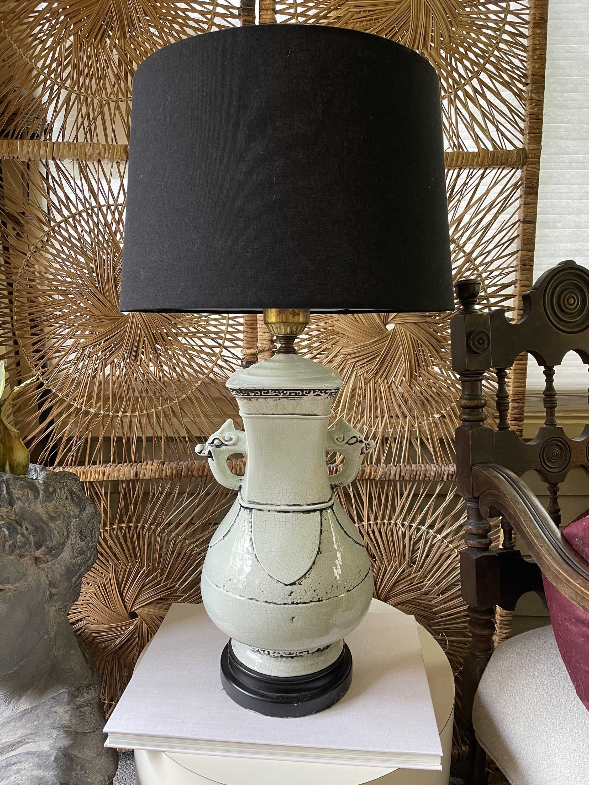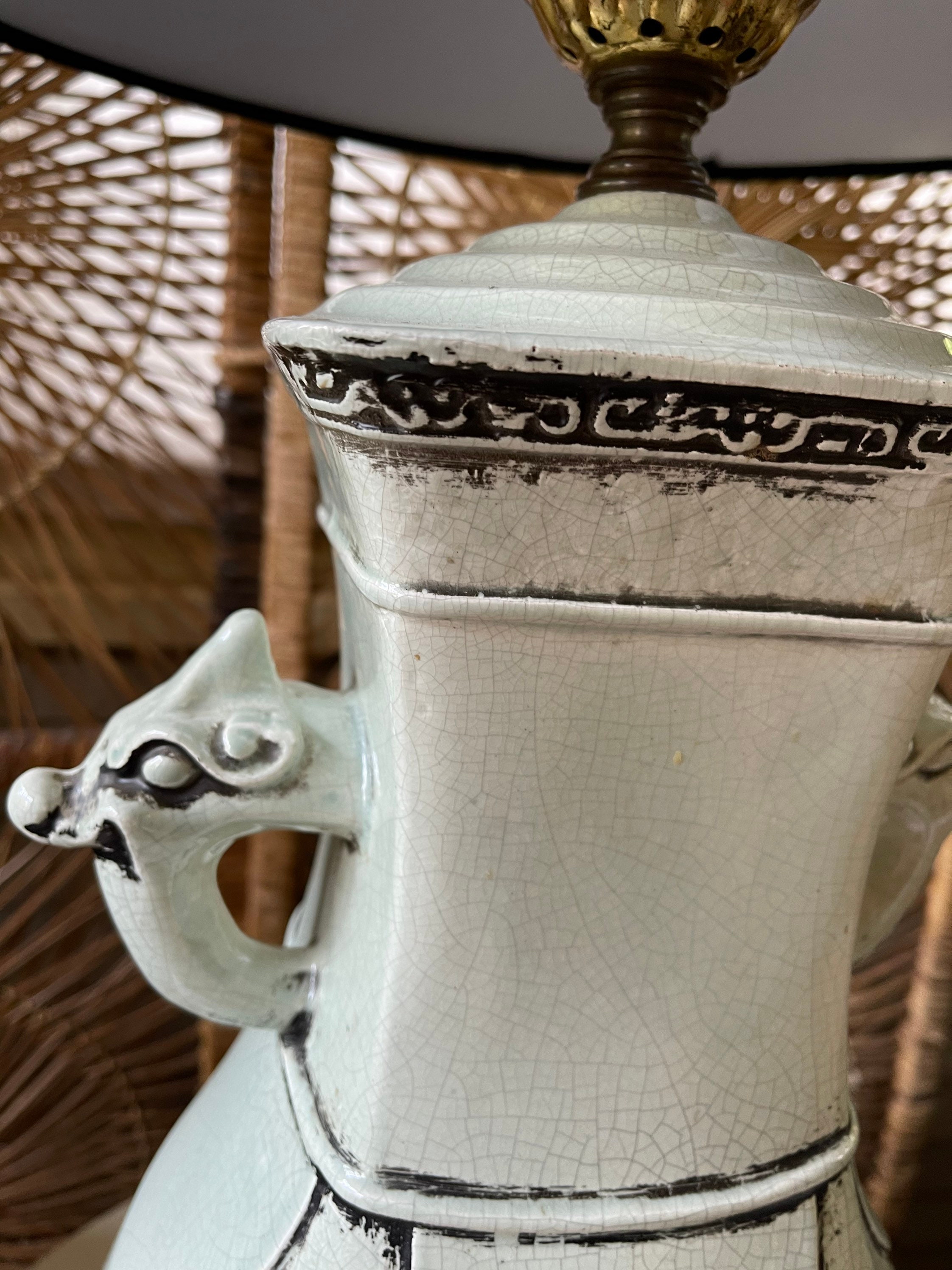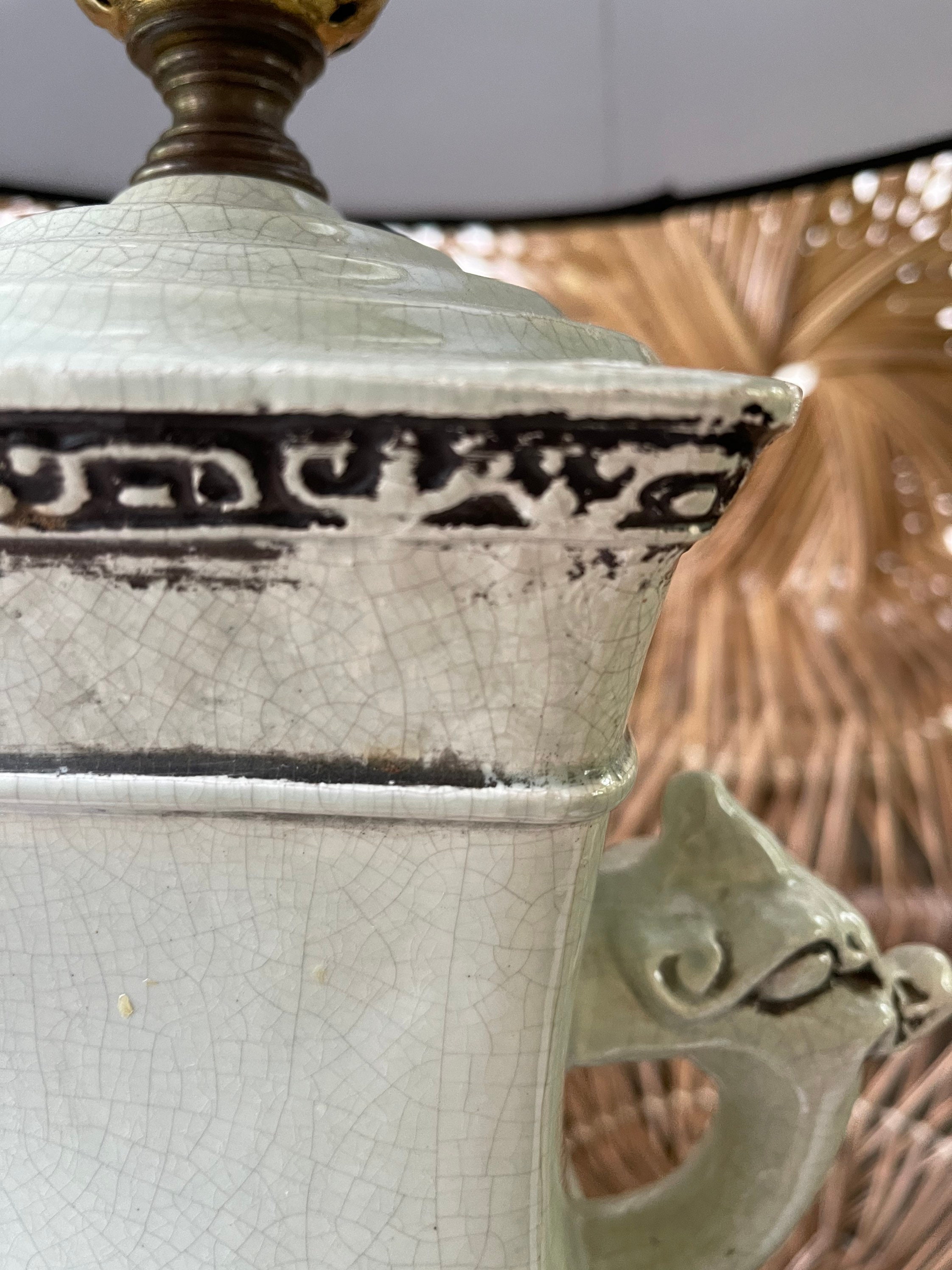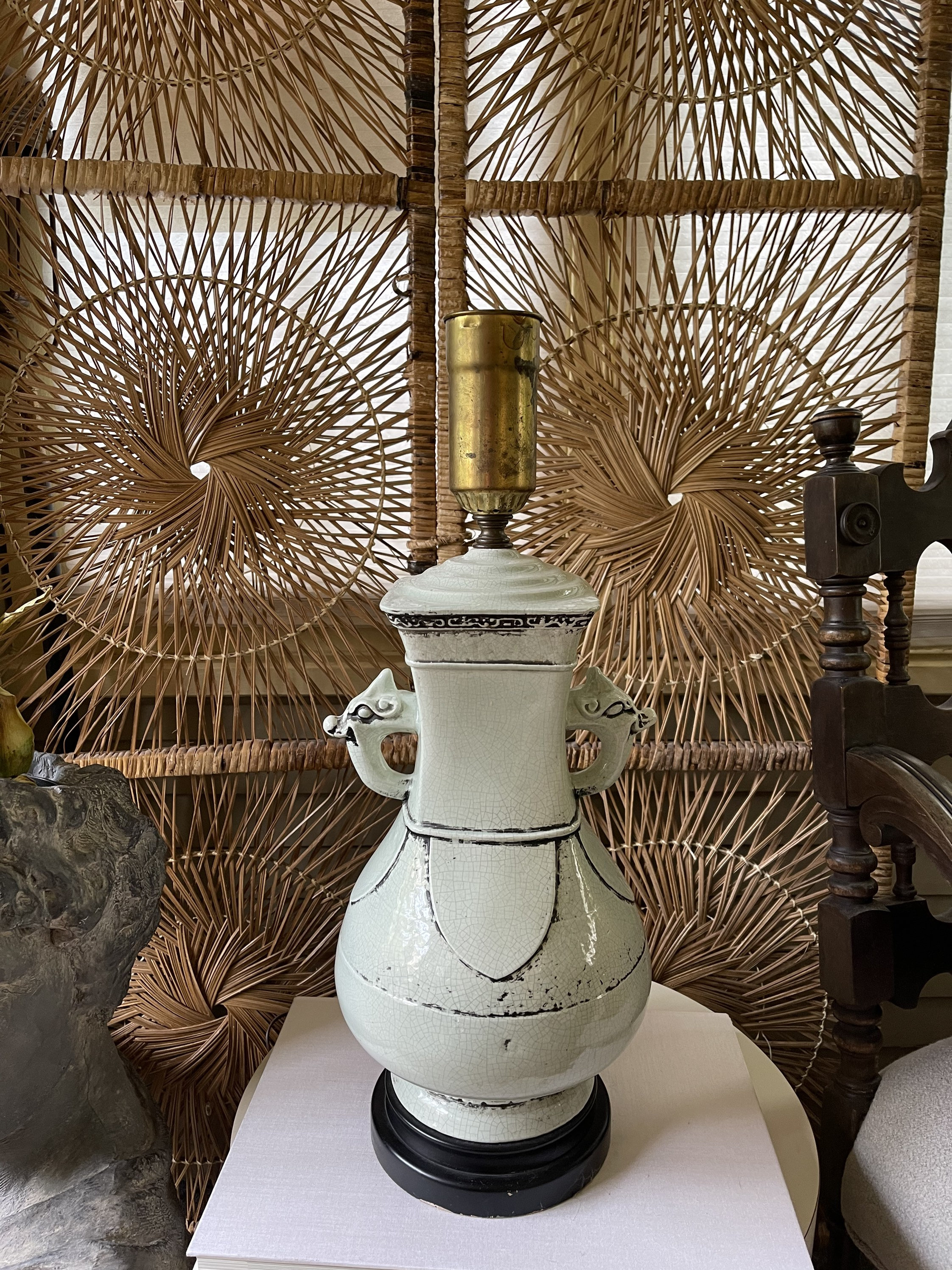 Stunning lamp , presented in a soft muted barely light blue with an intentional crackle glaze throughout, accents of black paint around the raised designs, it has two handles , each the head of a foo dog. Squares across the neck with designs at neck and base edge. Gorgeous in every way, the lamp has been fitted with a ceramic socket adaptor inside the antique brass cup.