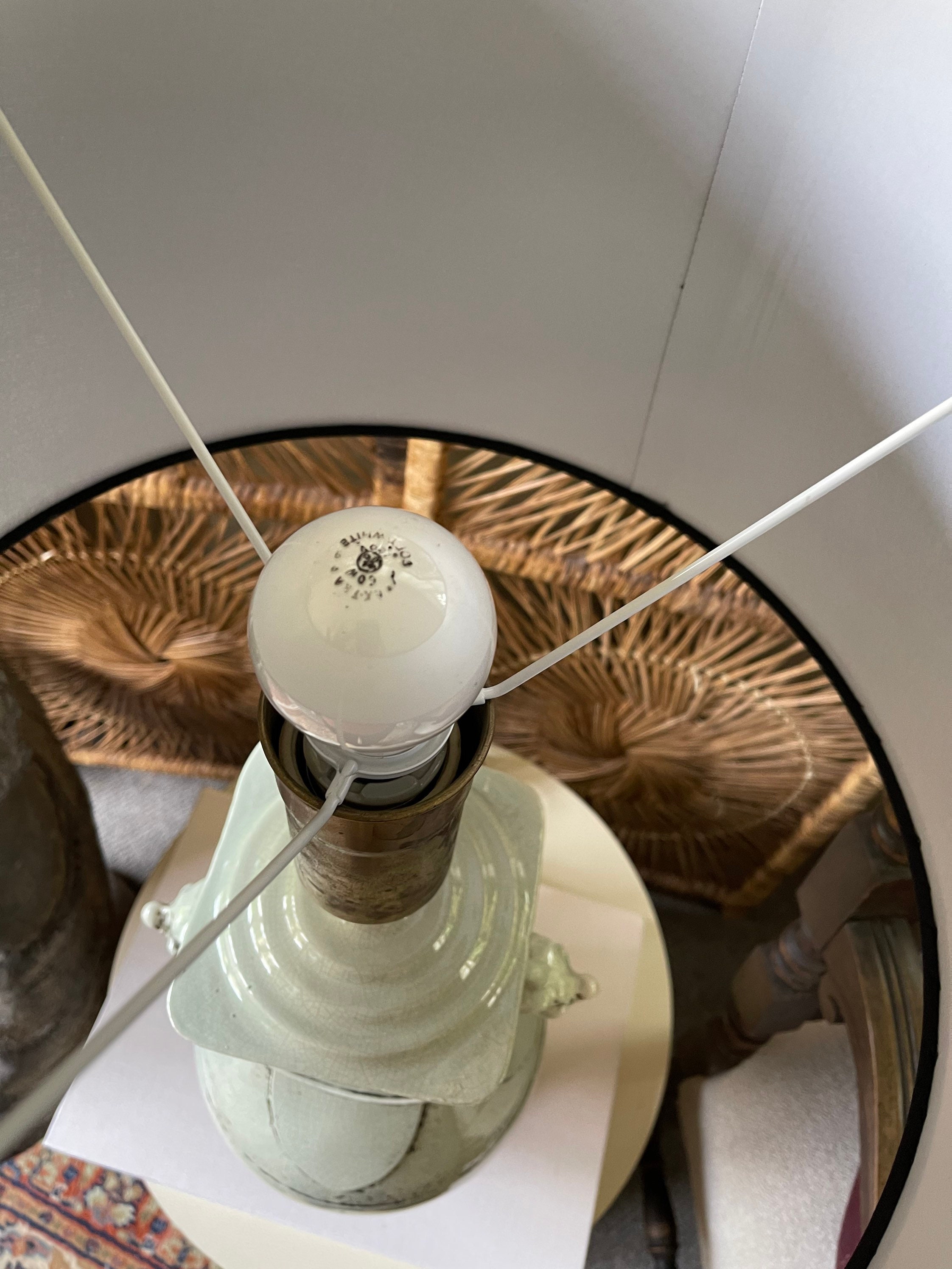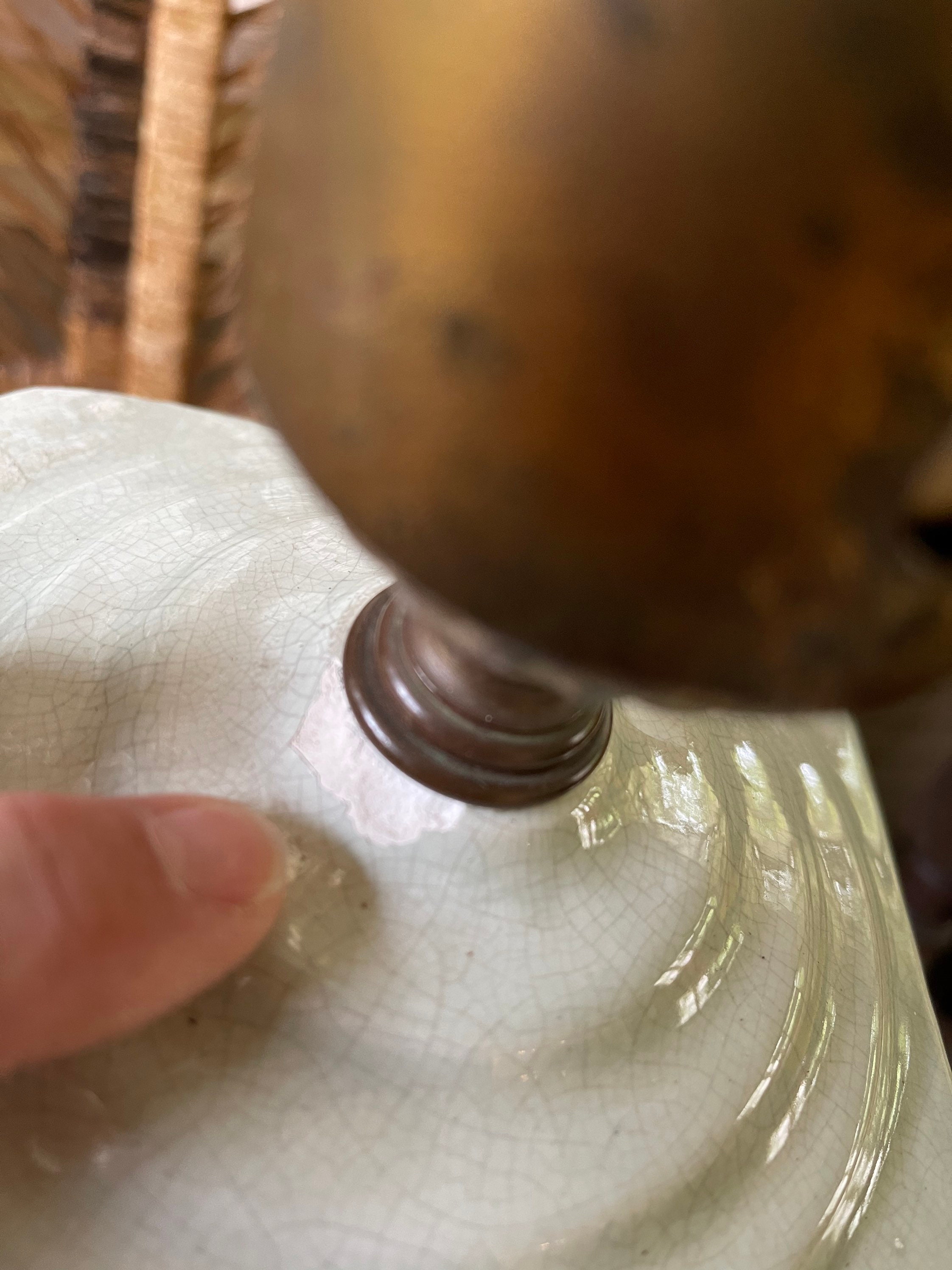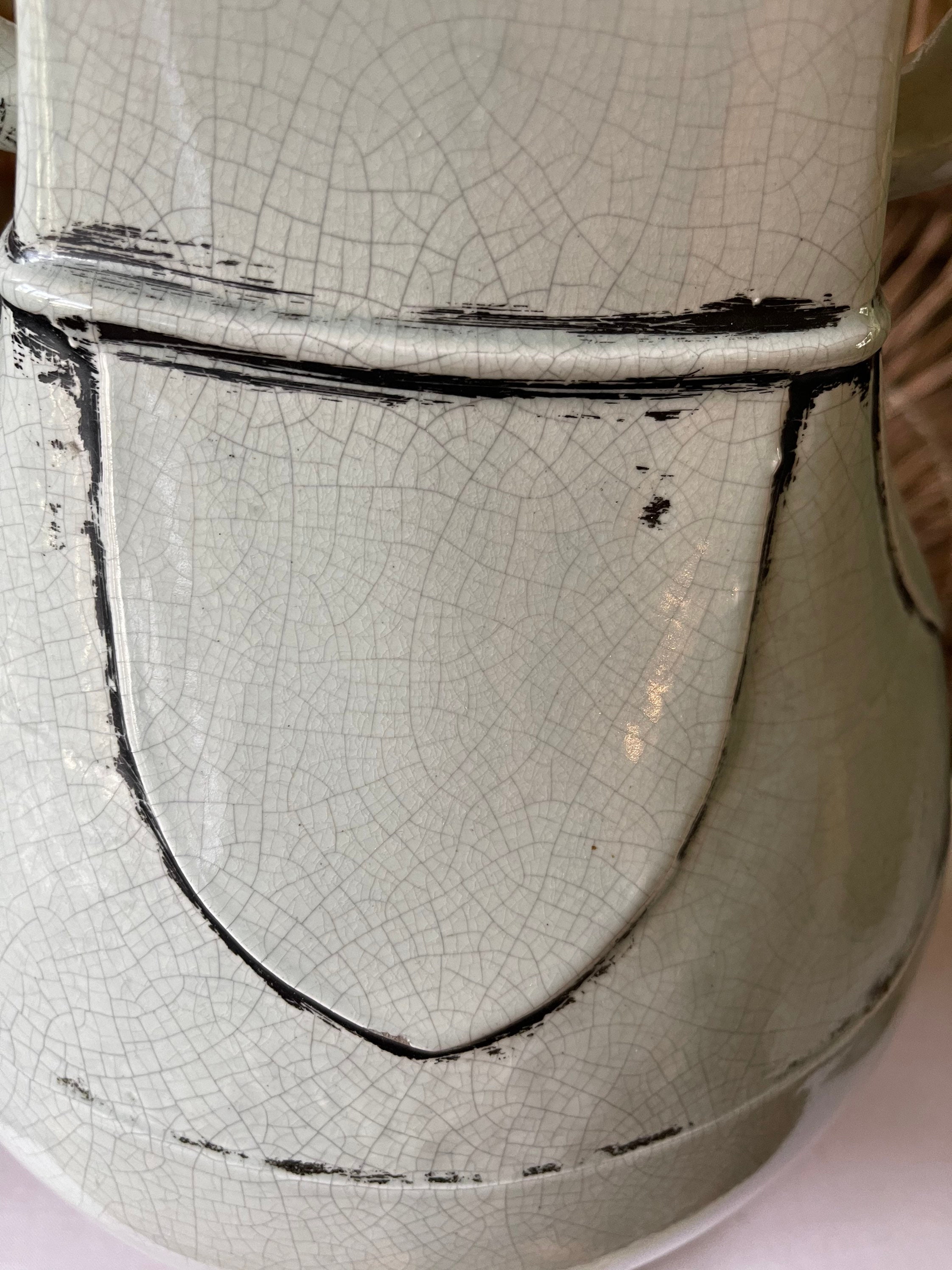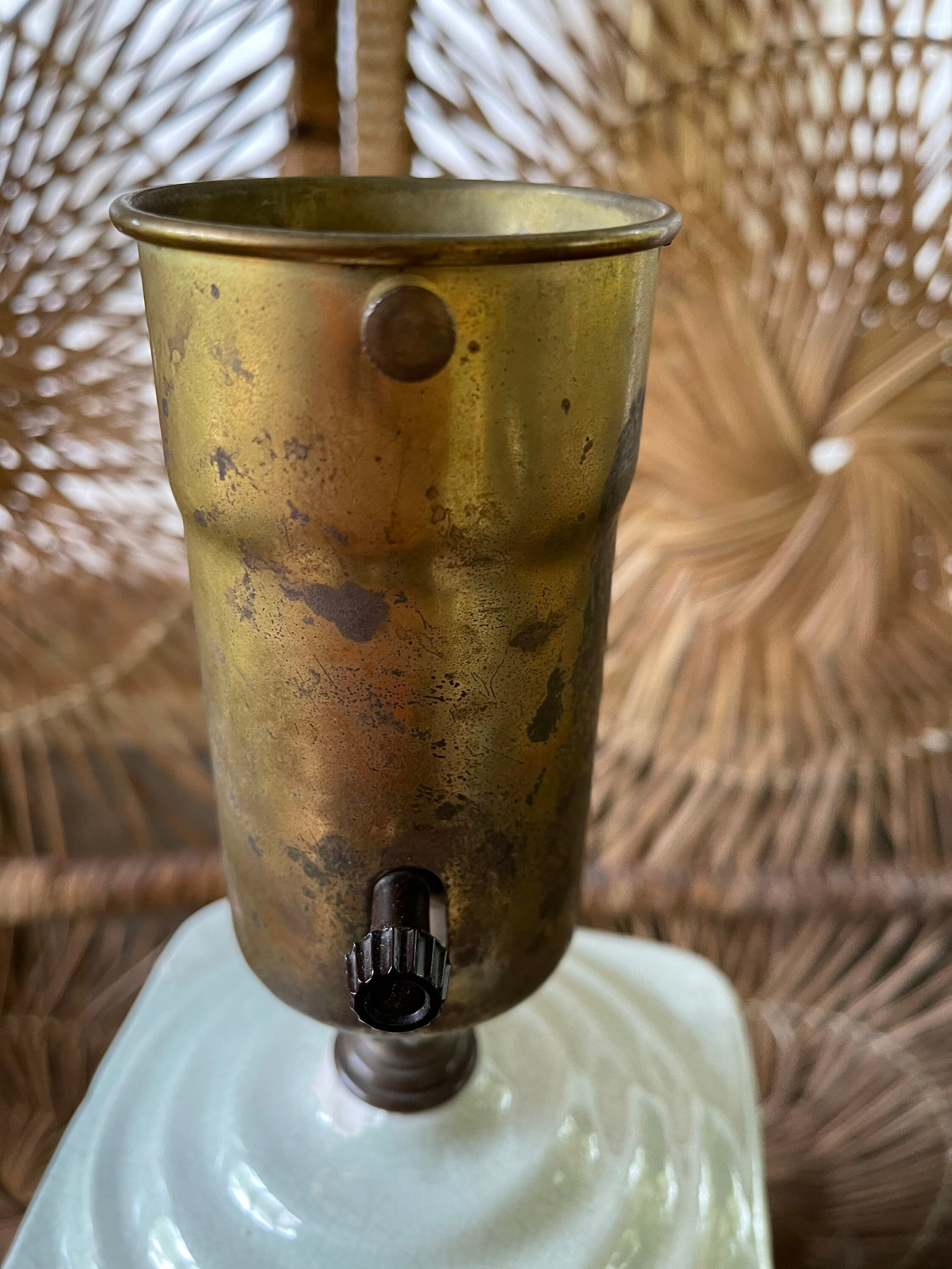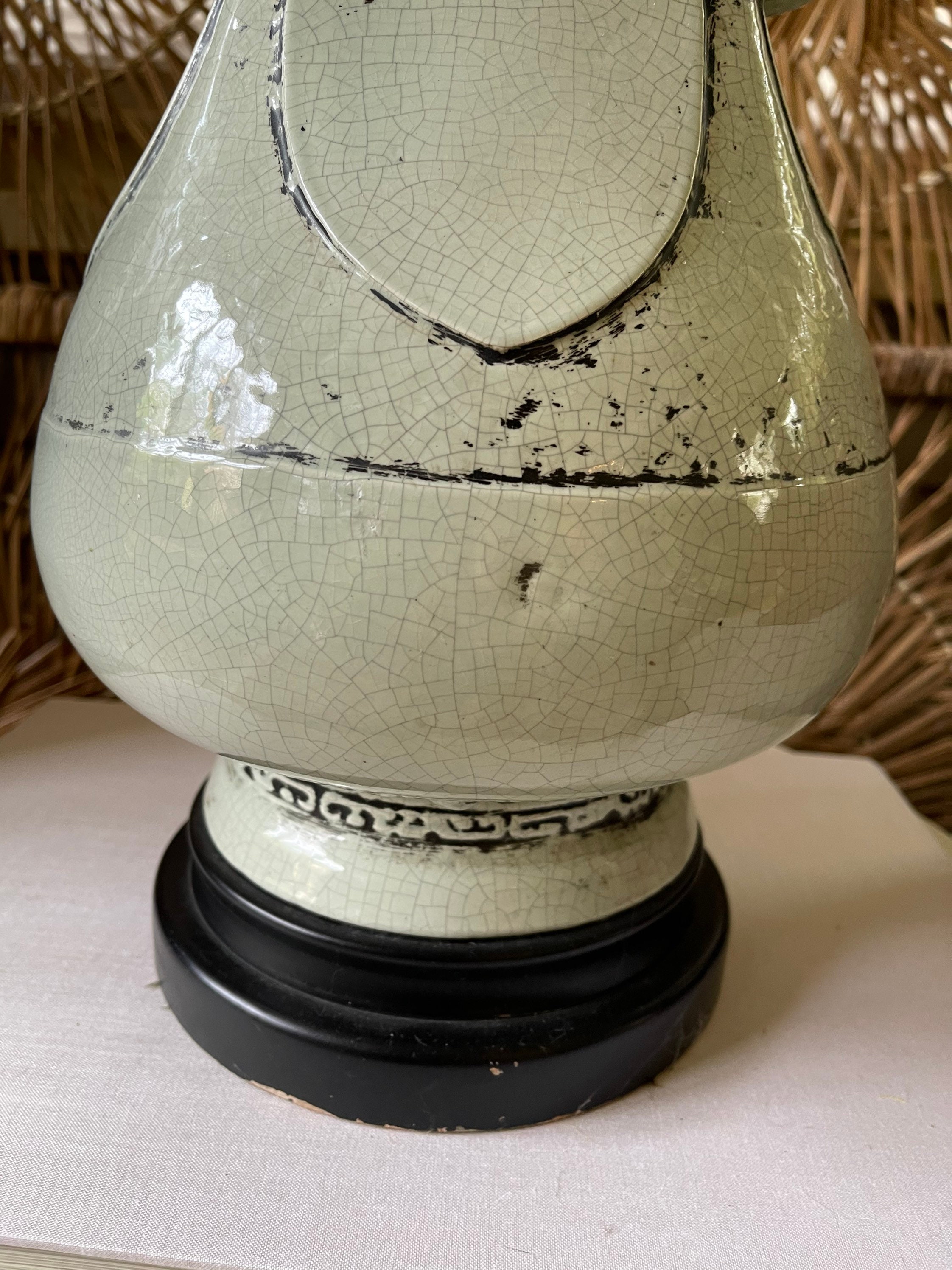 Stunning lamp , presented in a soft muted barely light blue with an intentional crackle glaze throughout, accents of black paint around the raised designs, it has two handles , each the head of a foo dog. Squares across the neck with designs at neck and base edge. Gorgeous in every way, the lamp has been fitted with a ceramic socket adaptor inside the antique brass cup.