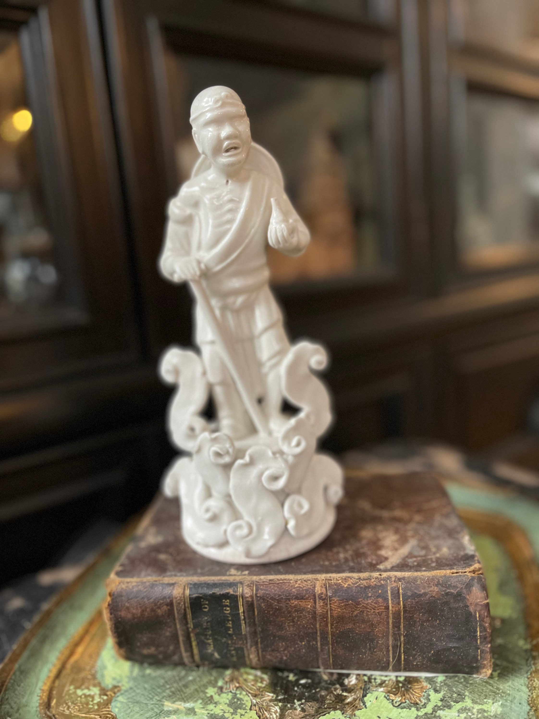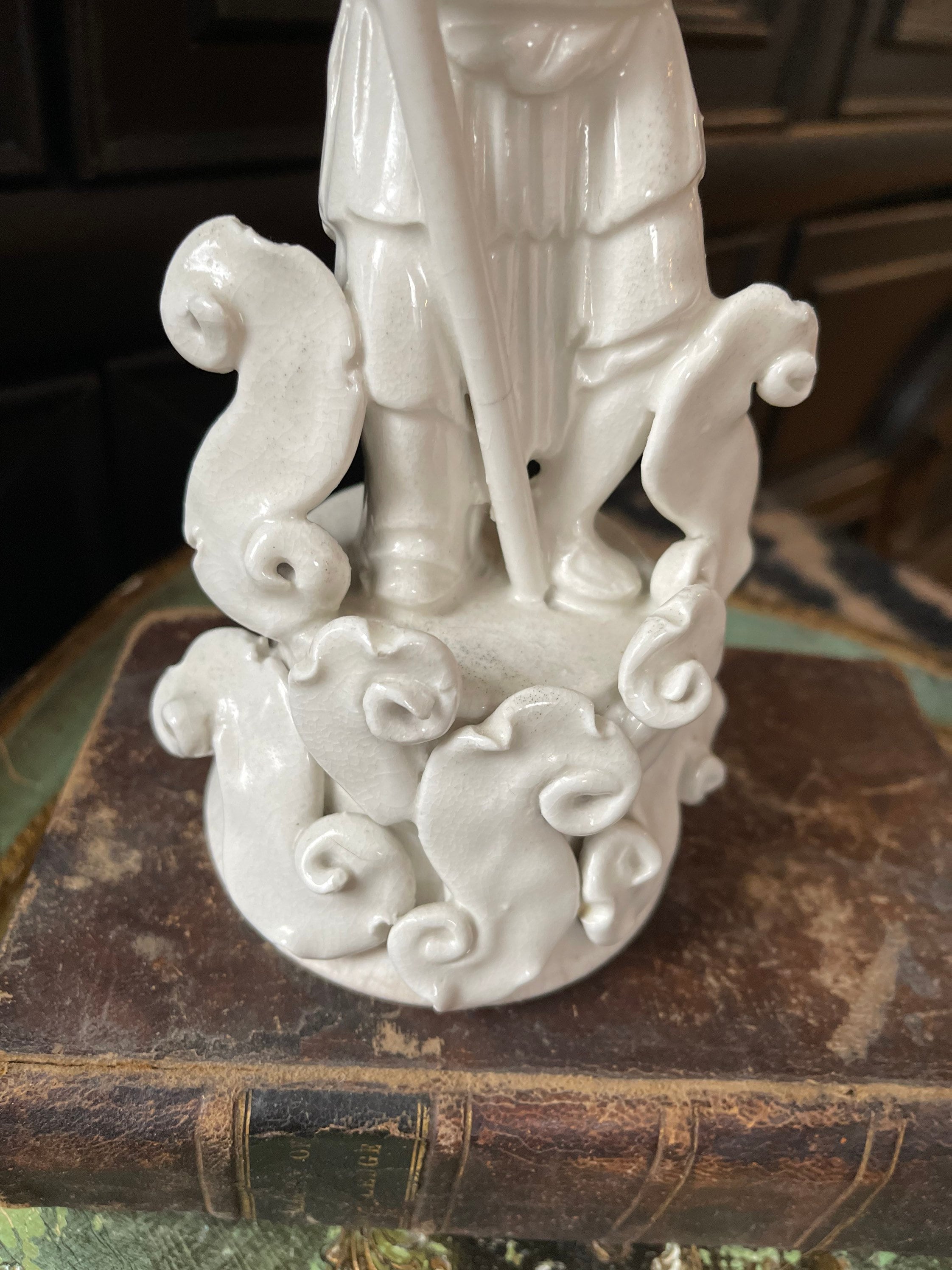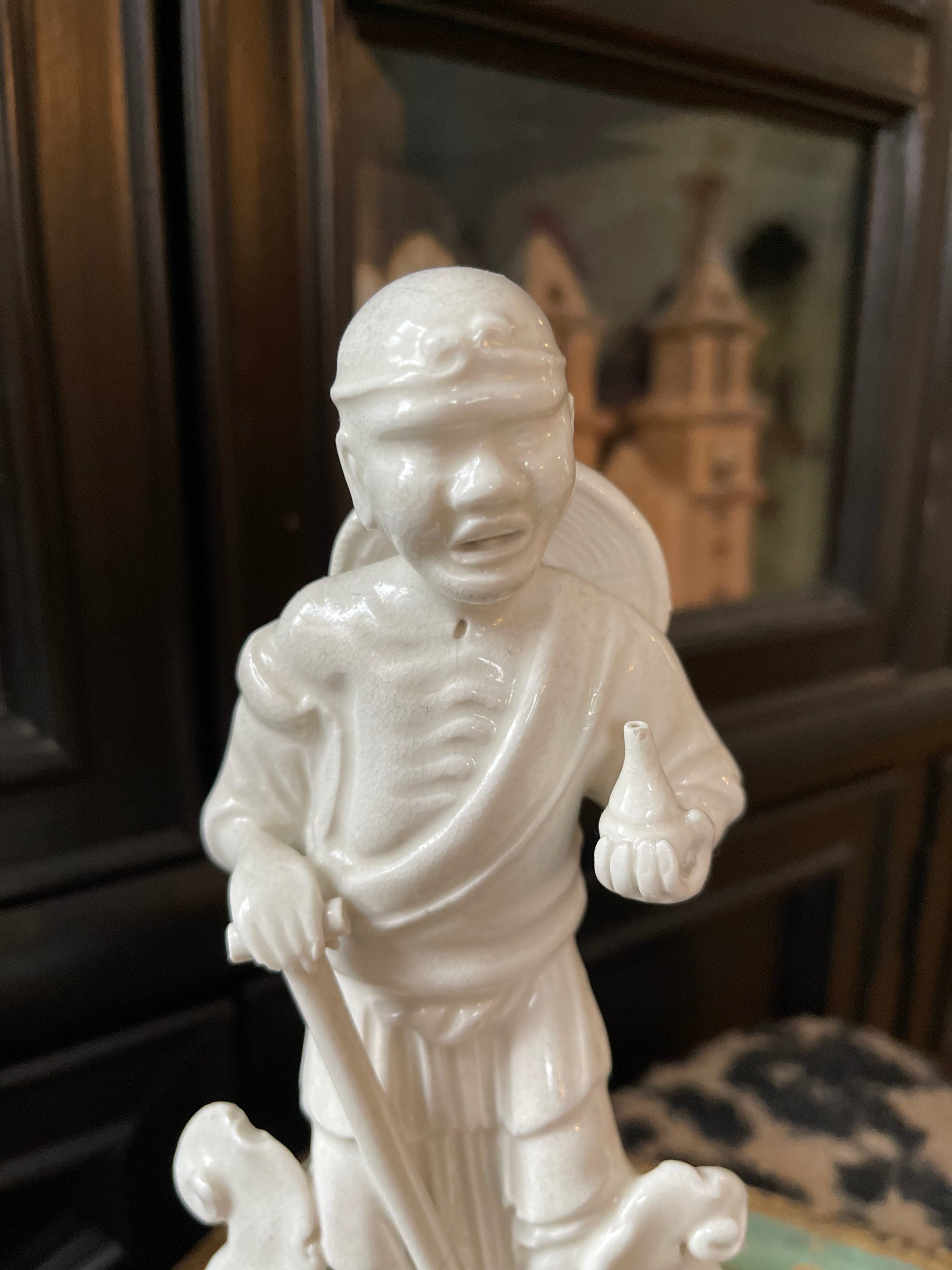 Early 20th century Blanc de Chine statue of a man standing atop a pedestal of waves, holding an uncapped decanter in a hand and resting his other hand upon a cane. Lovely detail, finely done
