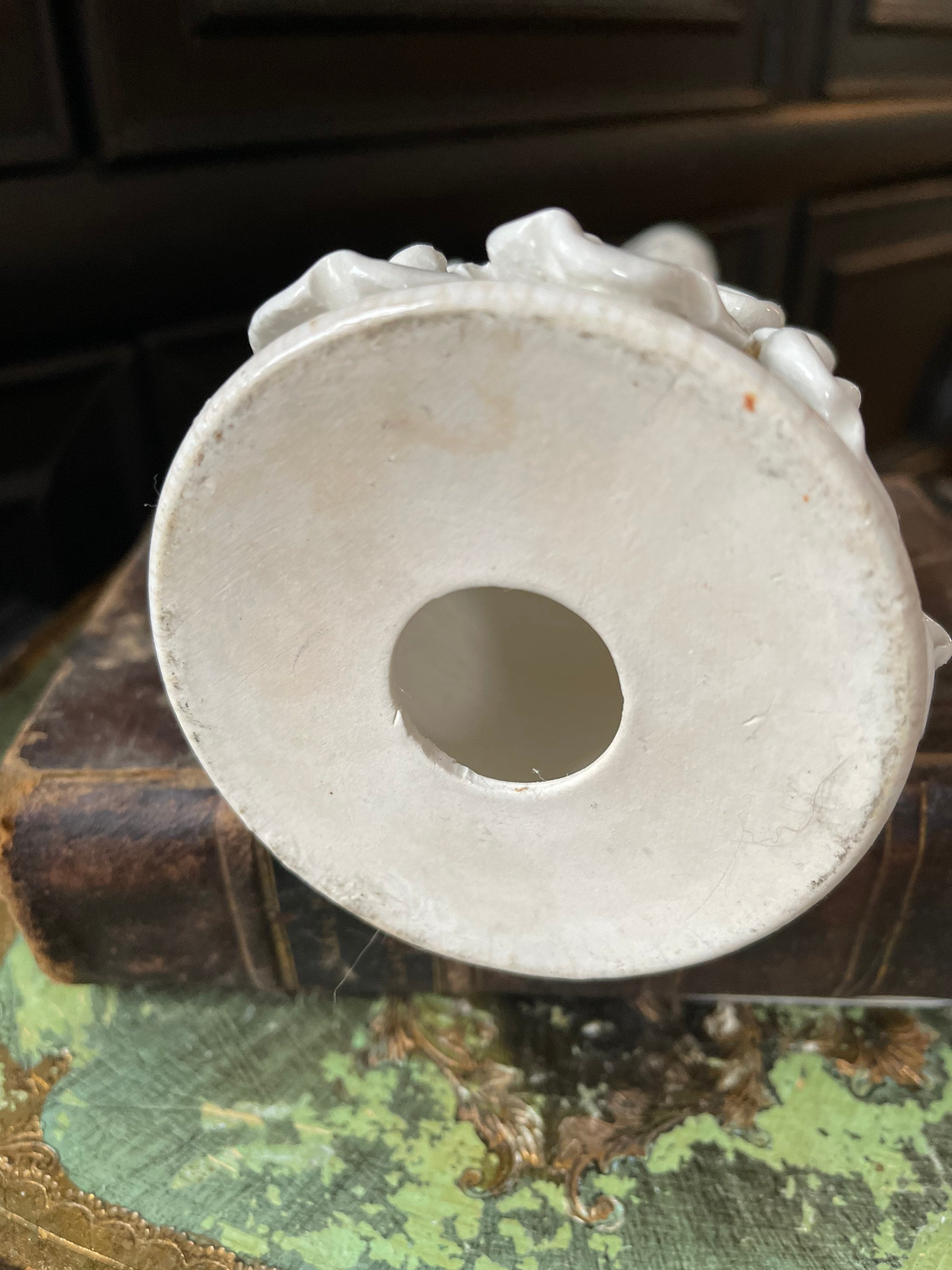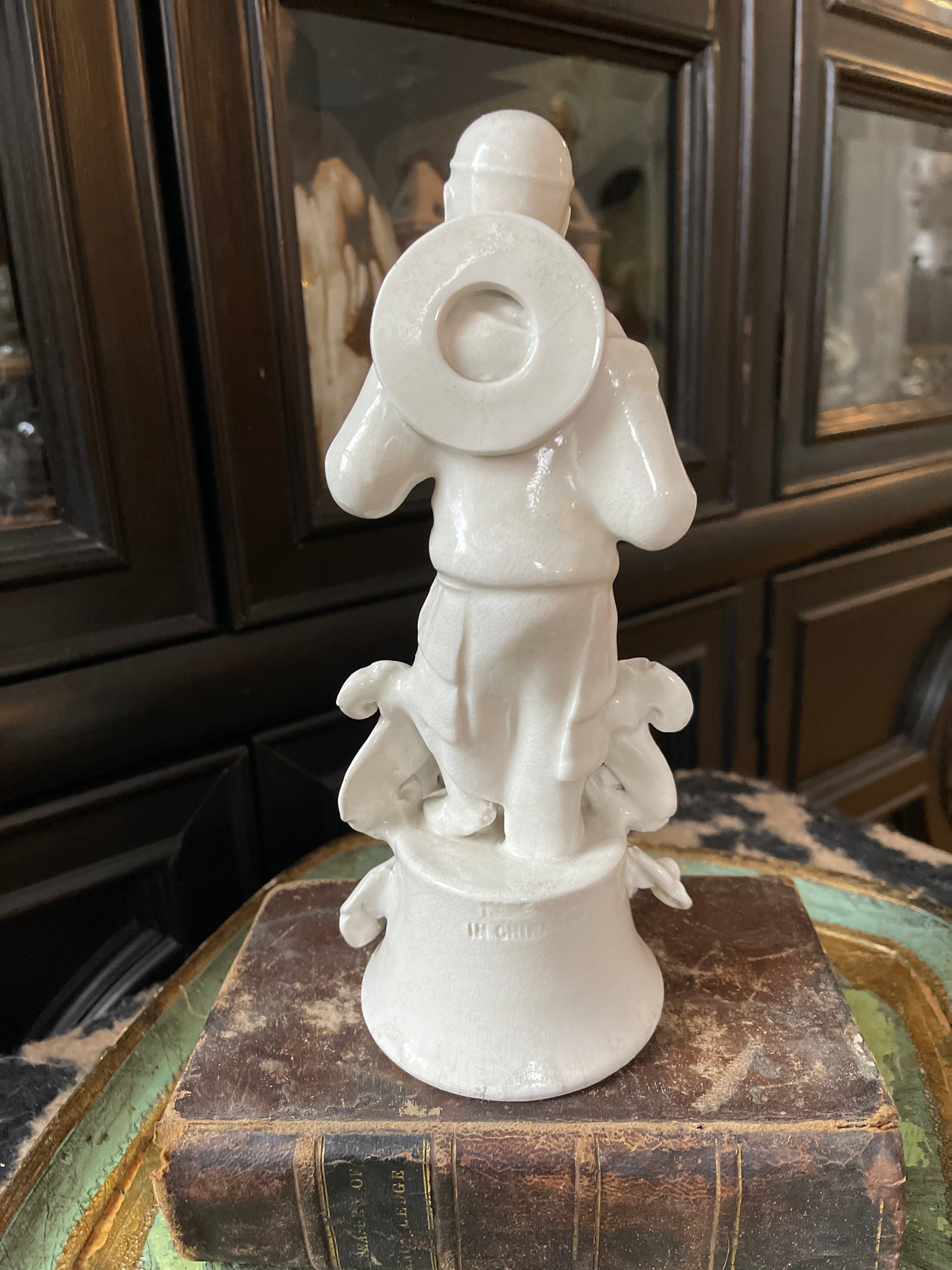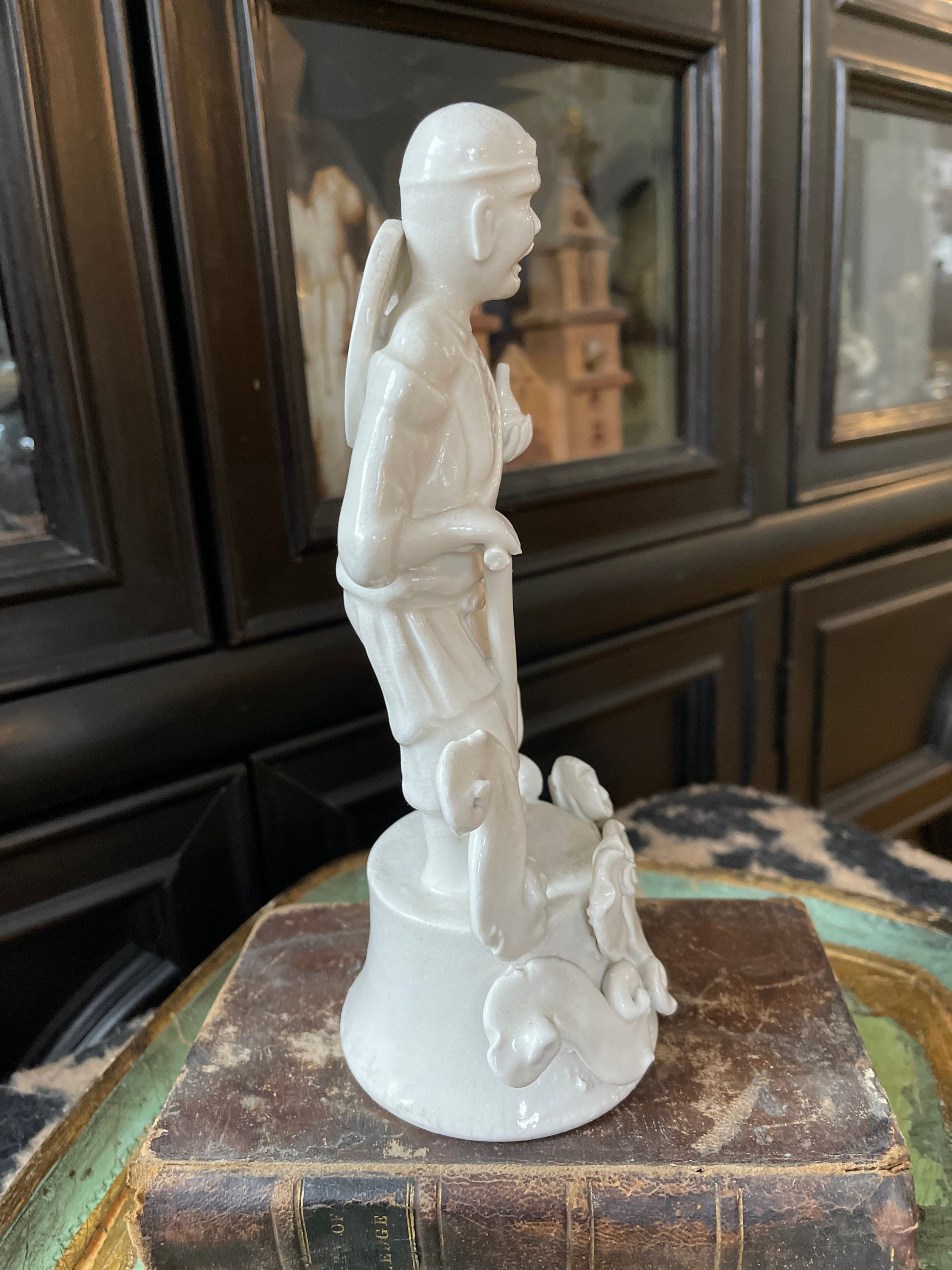 Early 20th century Blanc de Chine statue of a man standing atop a pedestal of waves, holding an uncapped decanter in a hand and resting his other hand upon a cane. Lovely detail, finely done
