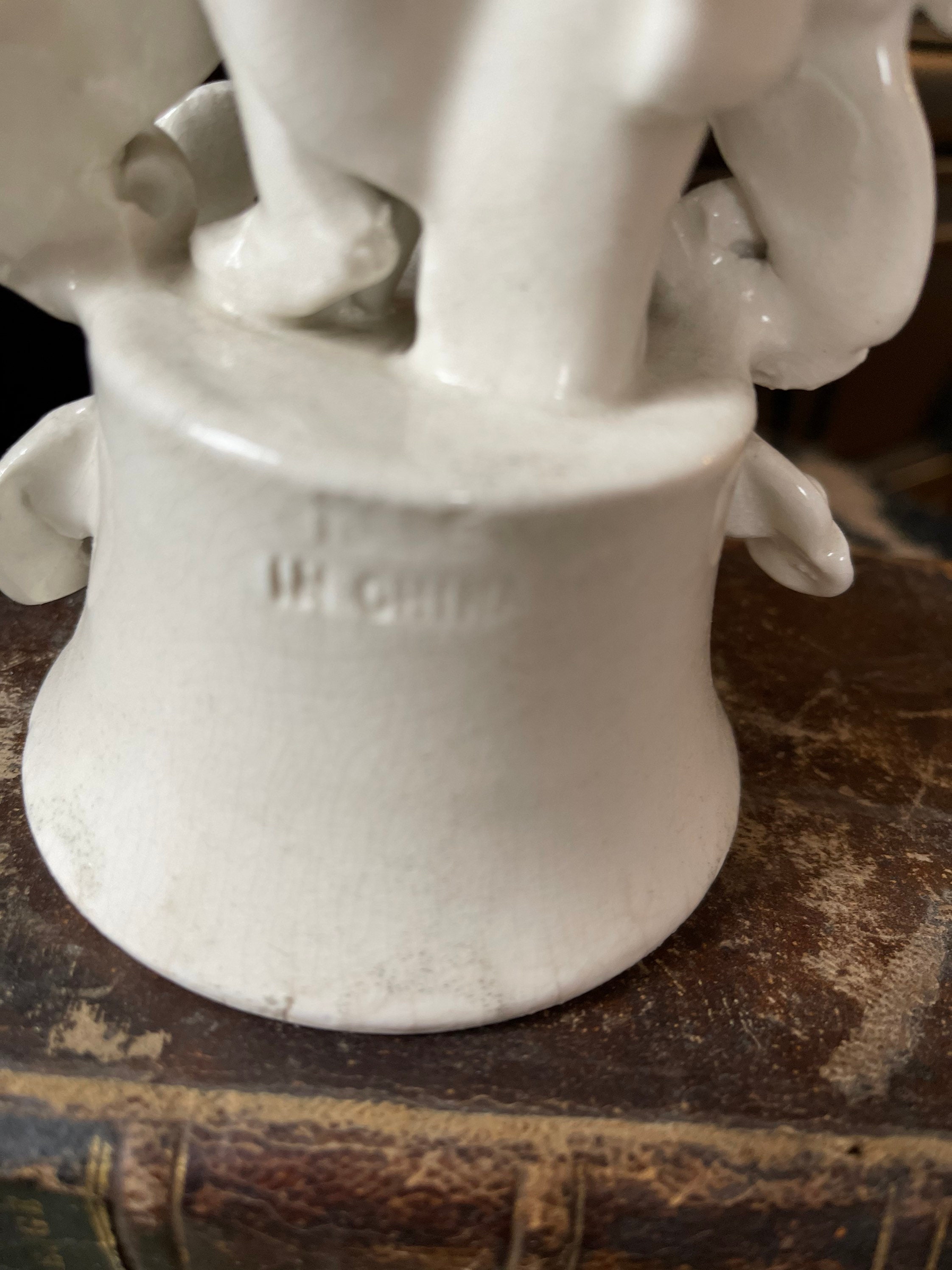 Minor crazing to surface, the tip of his pinky and ring finger of hand resting upon cane are no longer present (less than 1/8” - very teeny). Surface dust.