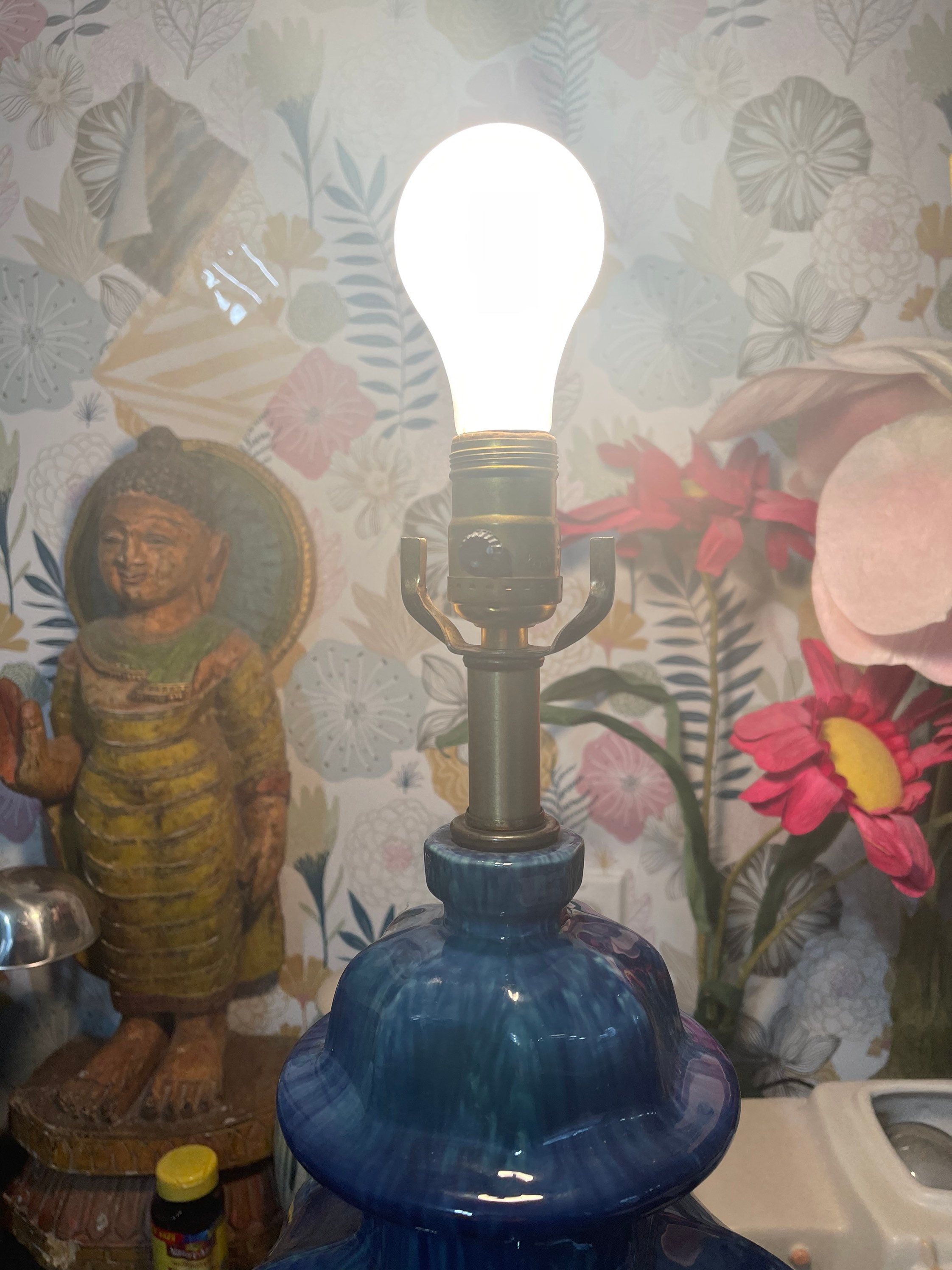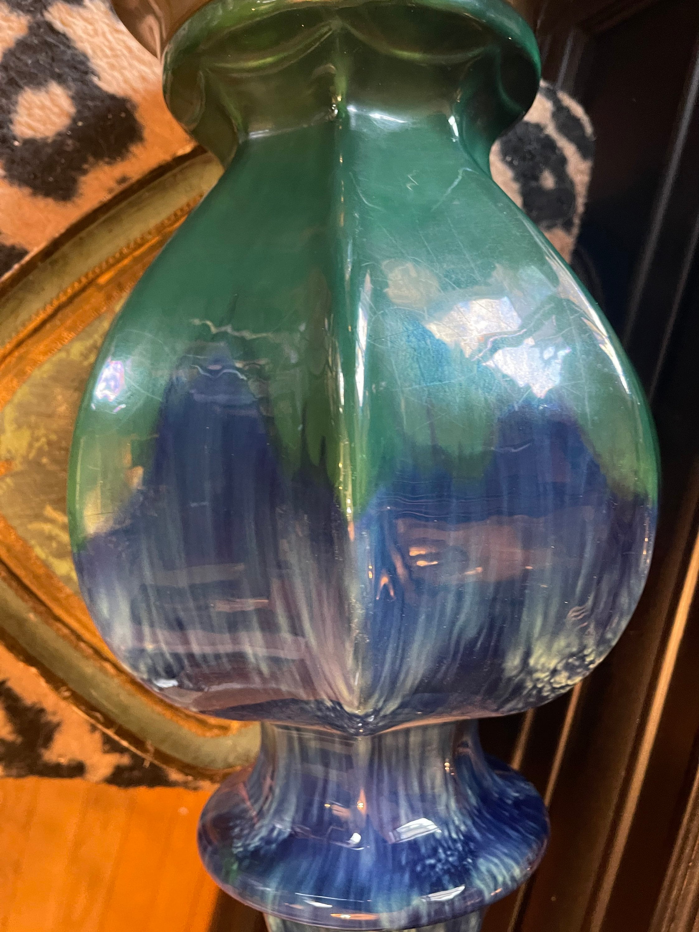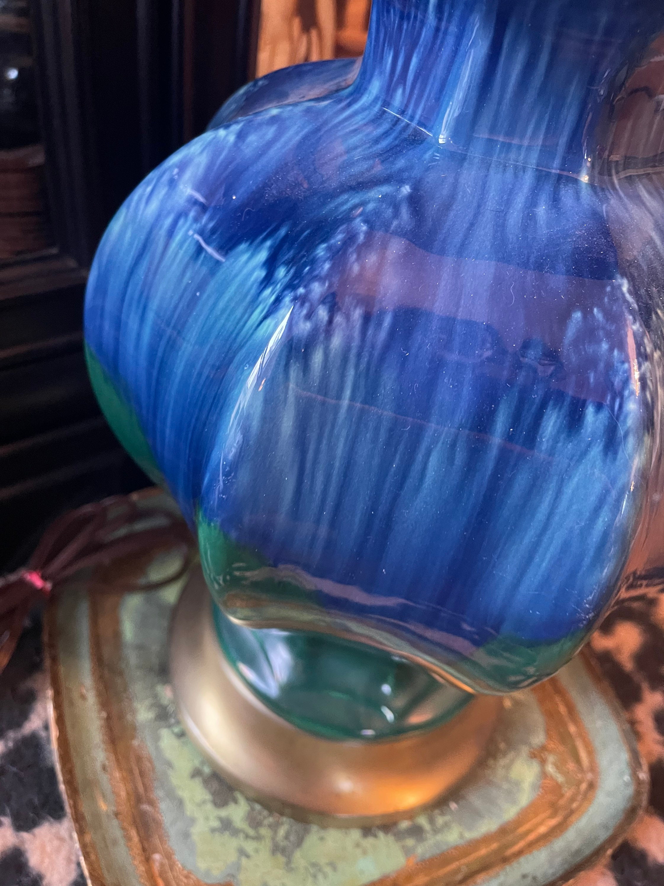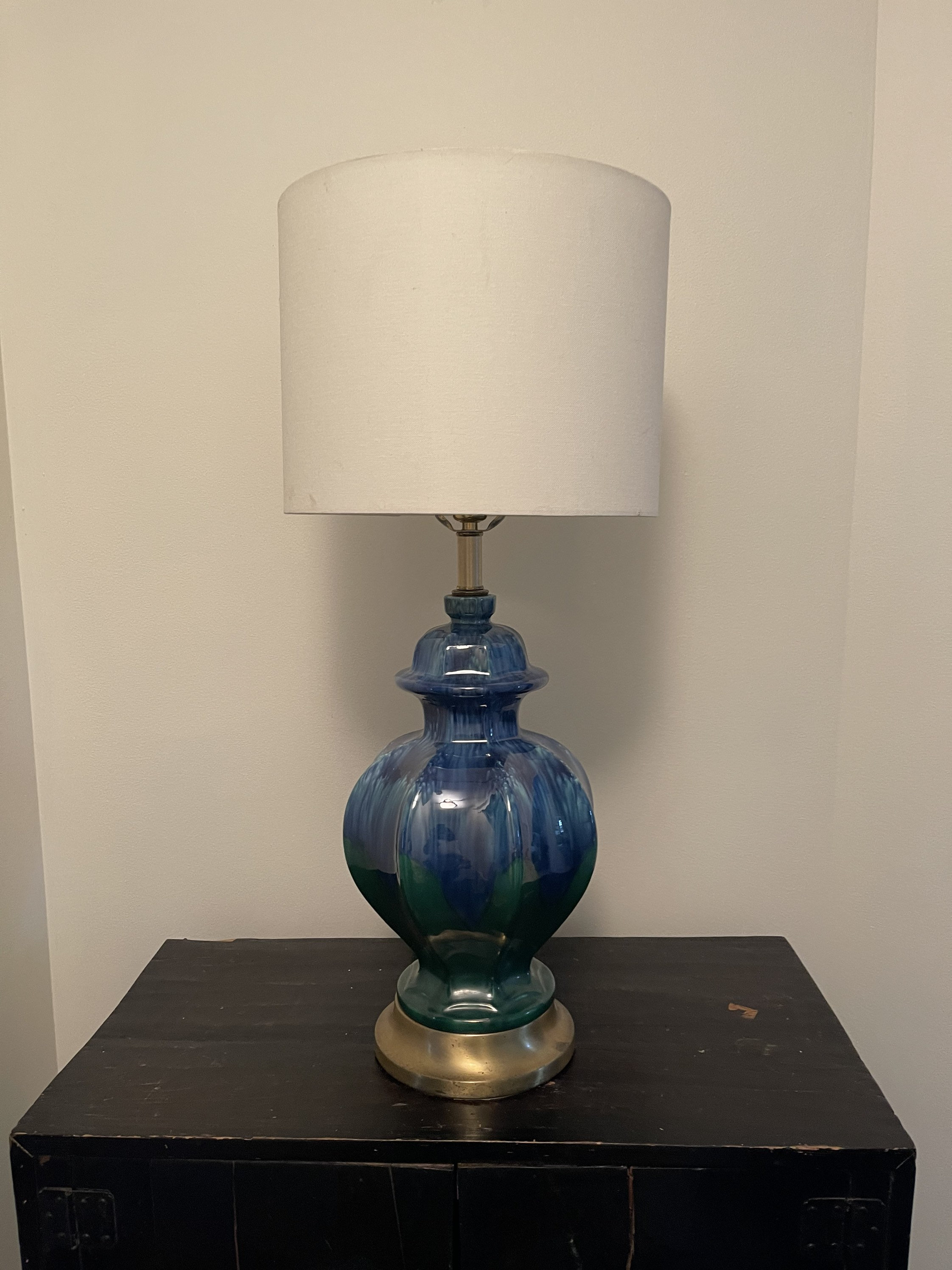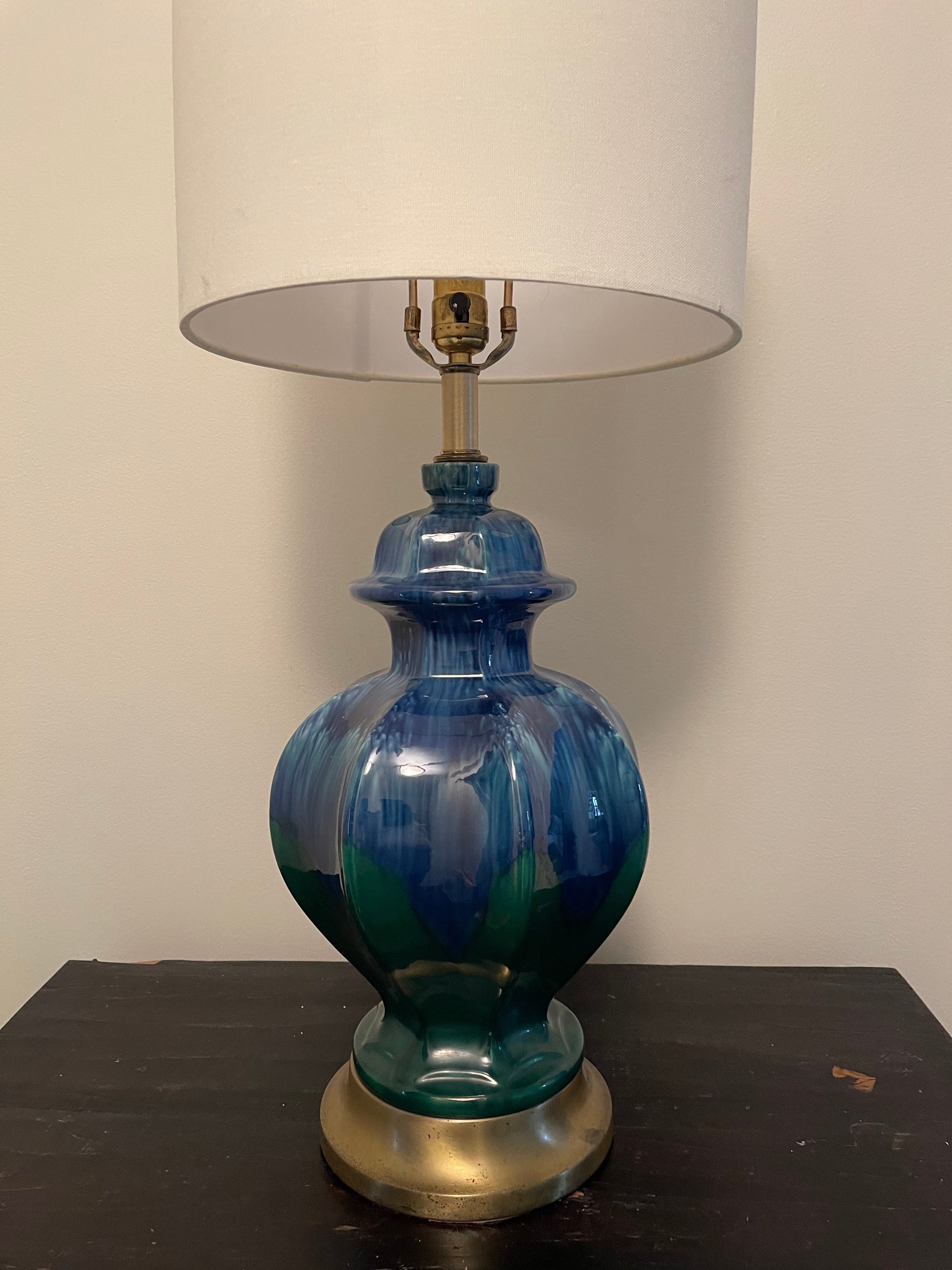 Lovely drip glaze lamp in hues of royal blue toe metal green that drip and blend down the body shaped as a ginger jar. Lamp rests upon a brushed brass vase. Gorgeous pop of color!