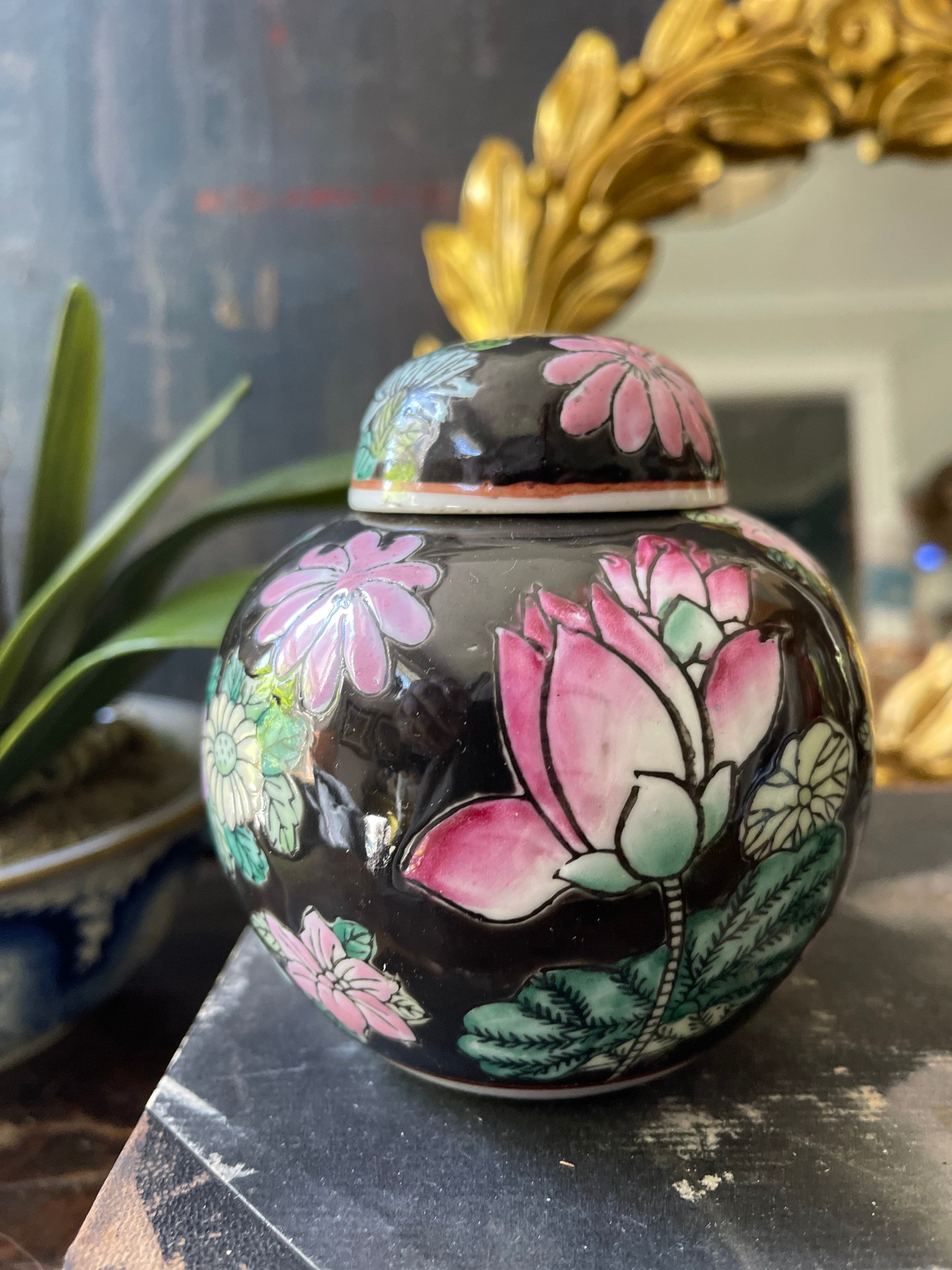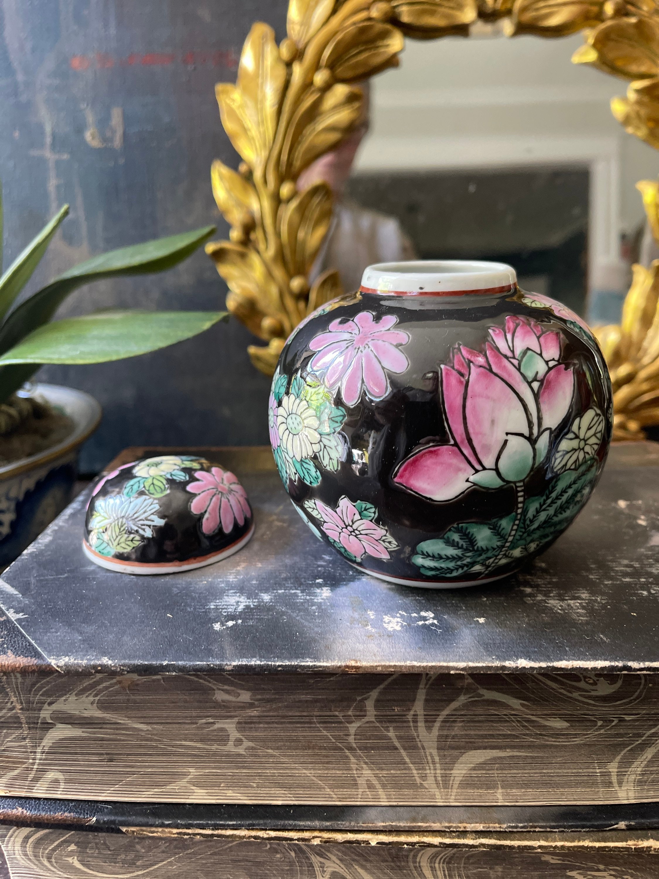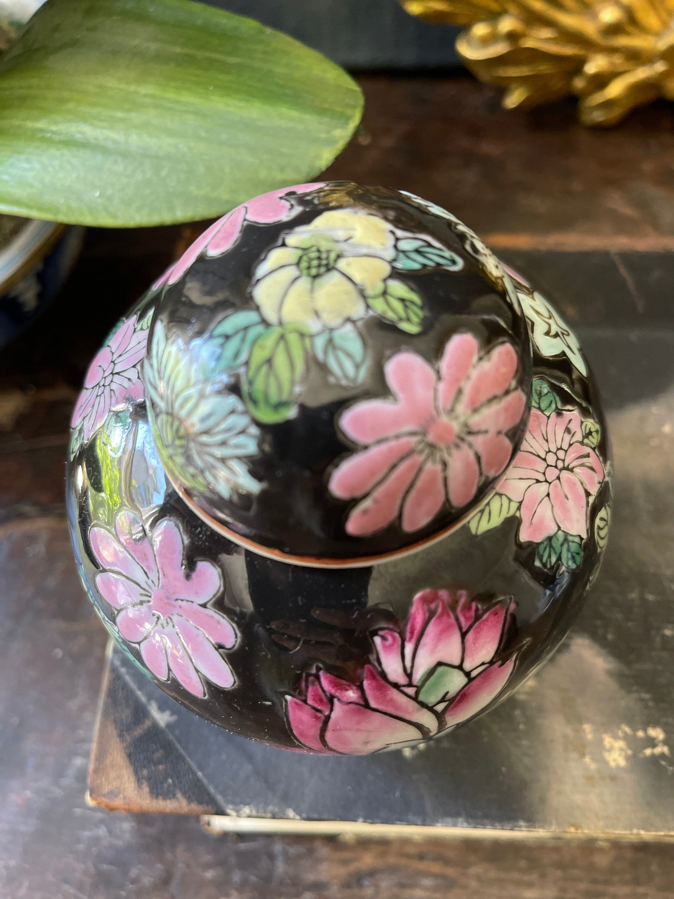 Lovely small ginger jar, measuring 4.5” x 4.5”, this round bodied vessel is lovely in its midnight glossy black glaze with peta pink and buttery yellow blooms bursting among green foliage. We have a soft spot for ginger jars, and particularly love all the black ceramics! This black glaze adds a touch of modernity to a vintage piece!