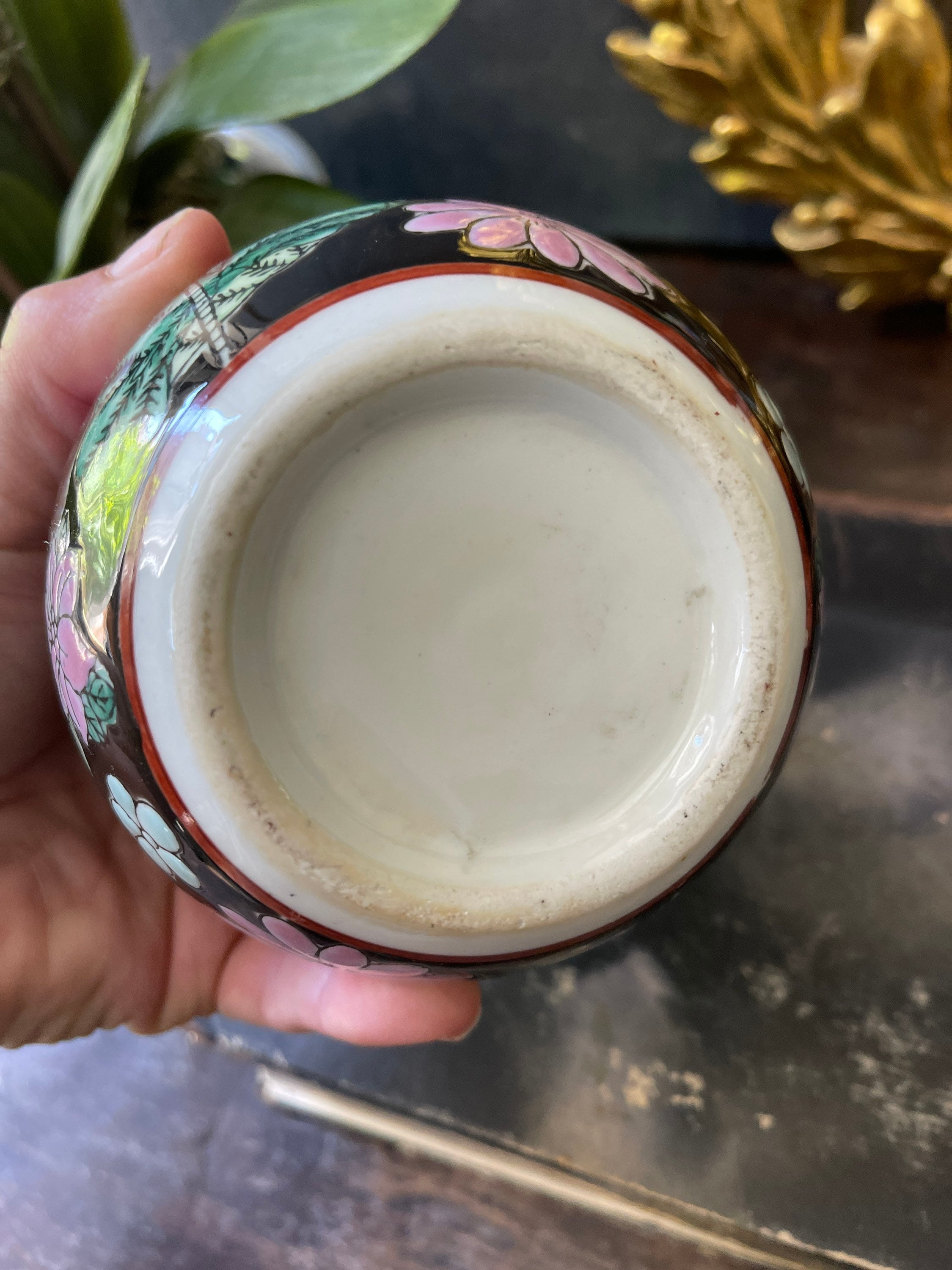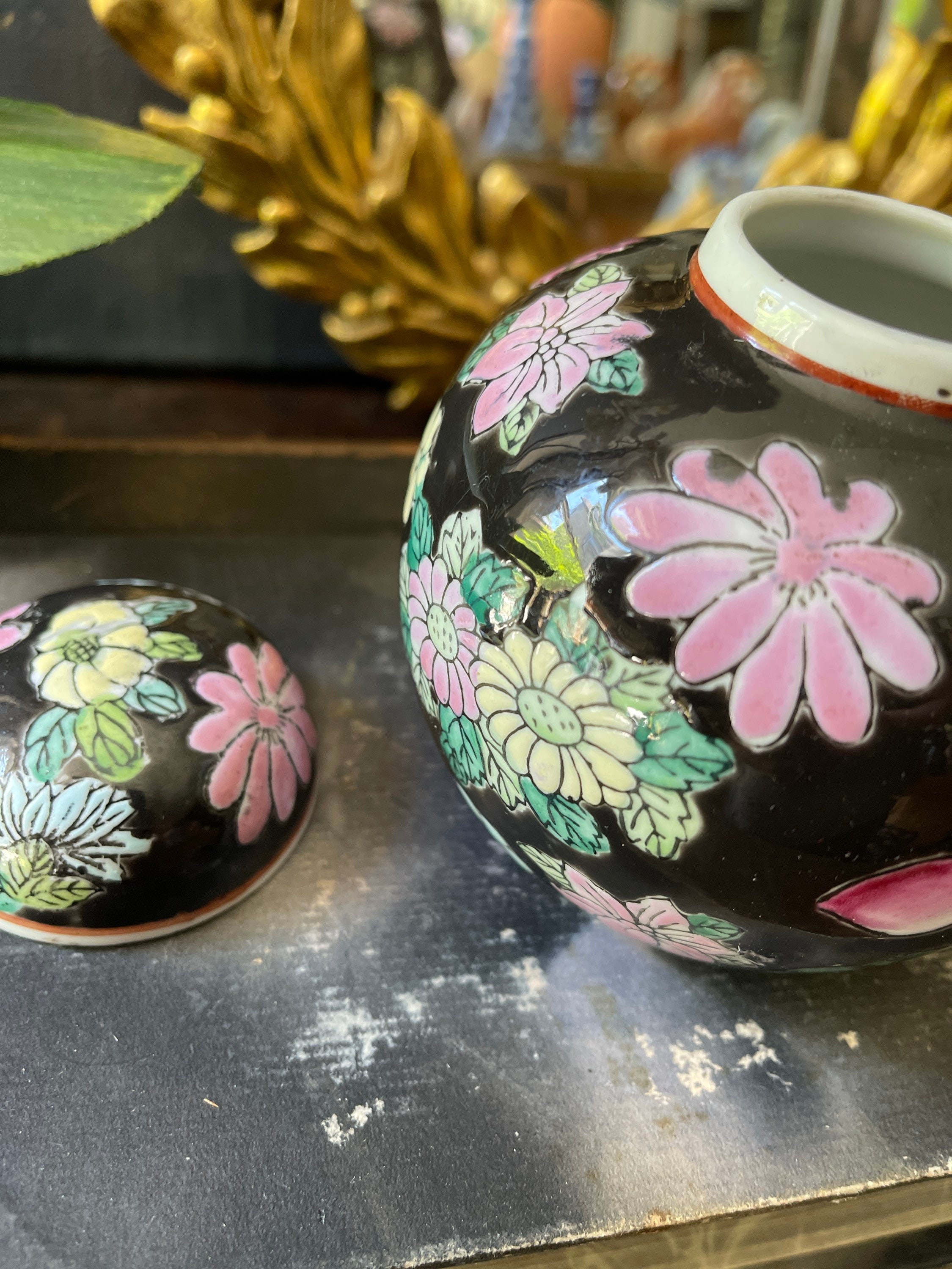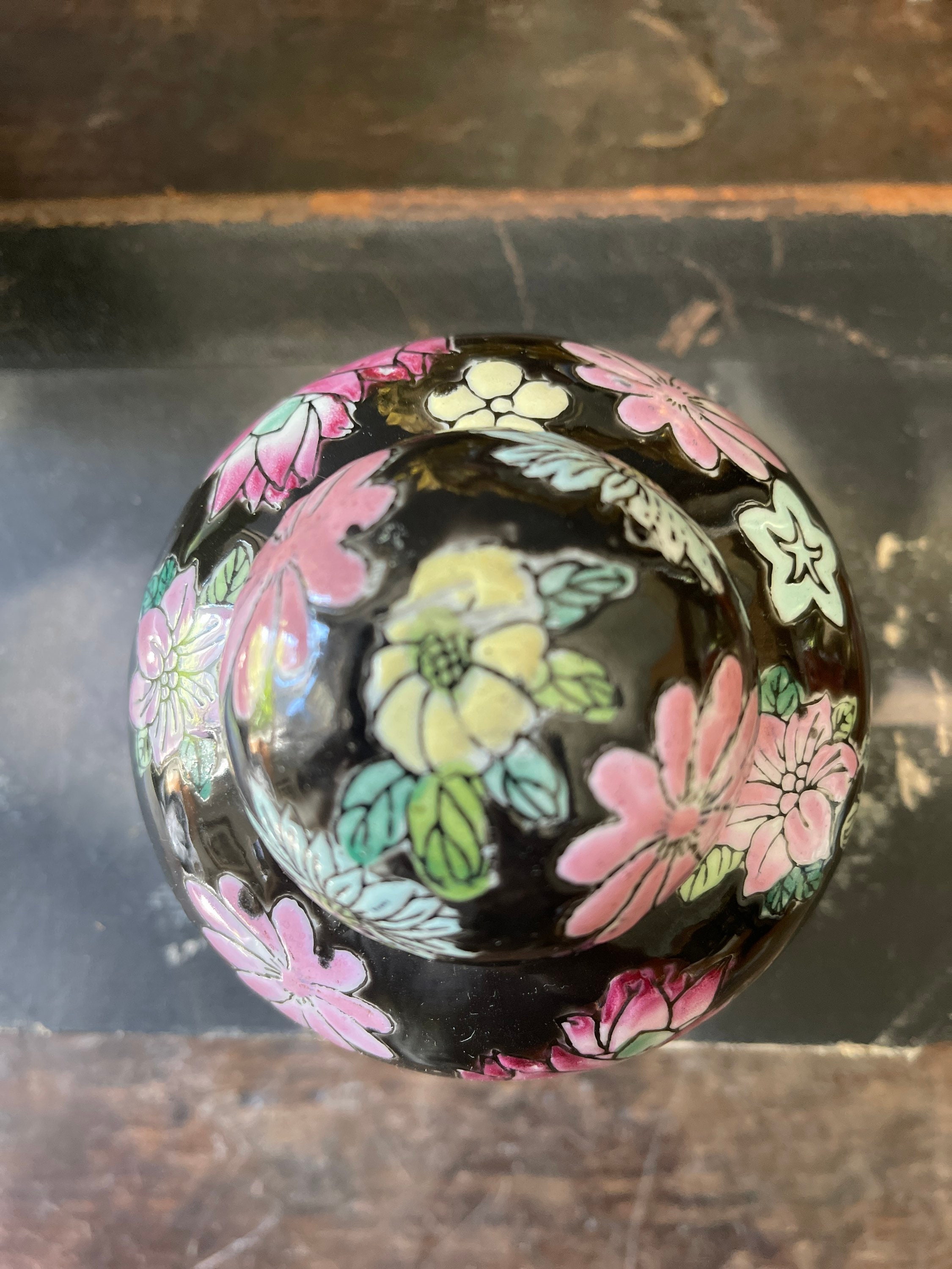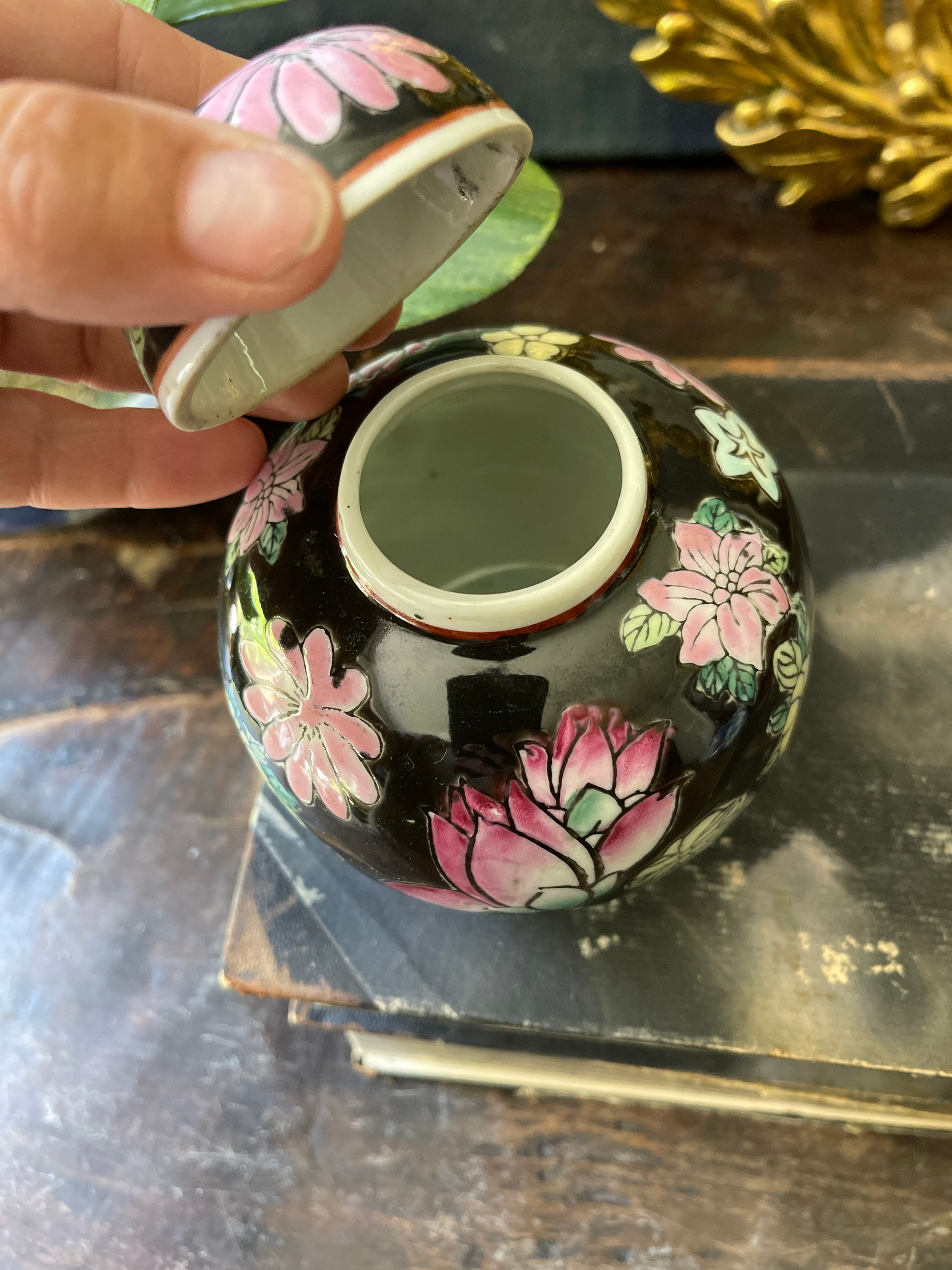 Lovely small ginger jar, measuring 4.5” x 4.5”, this round bodied vessel is lovely in its midnight glossy black glaze with peta pink and buttery yellow blooms bursting among green foliage. We have a soft spot for ginger jars, and particularly love all the black ceramics! This black glaze adds a touch of modernity to a vintage piece!