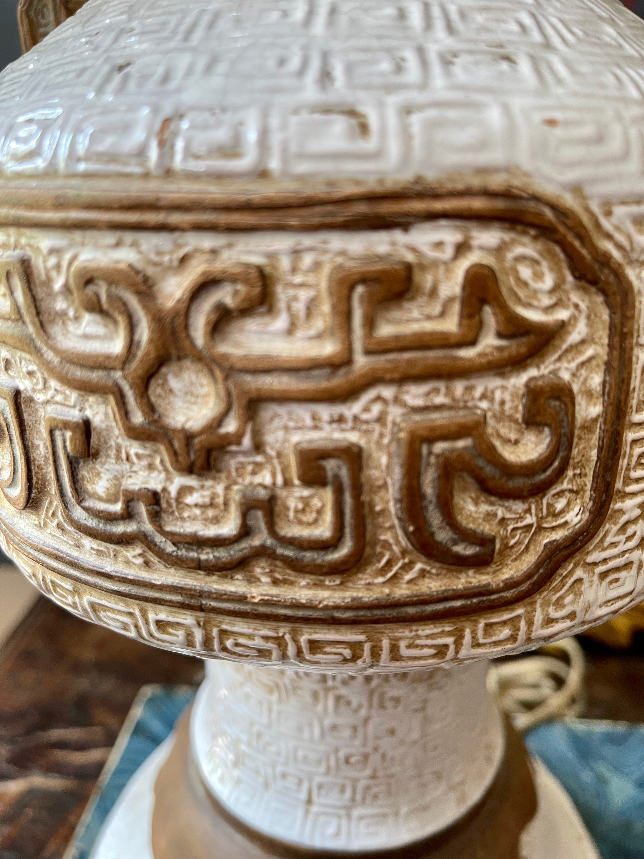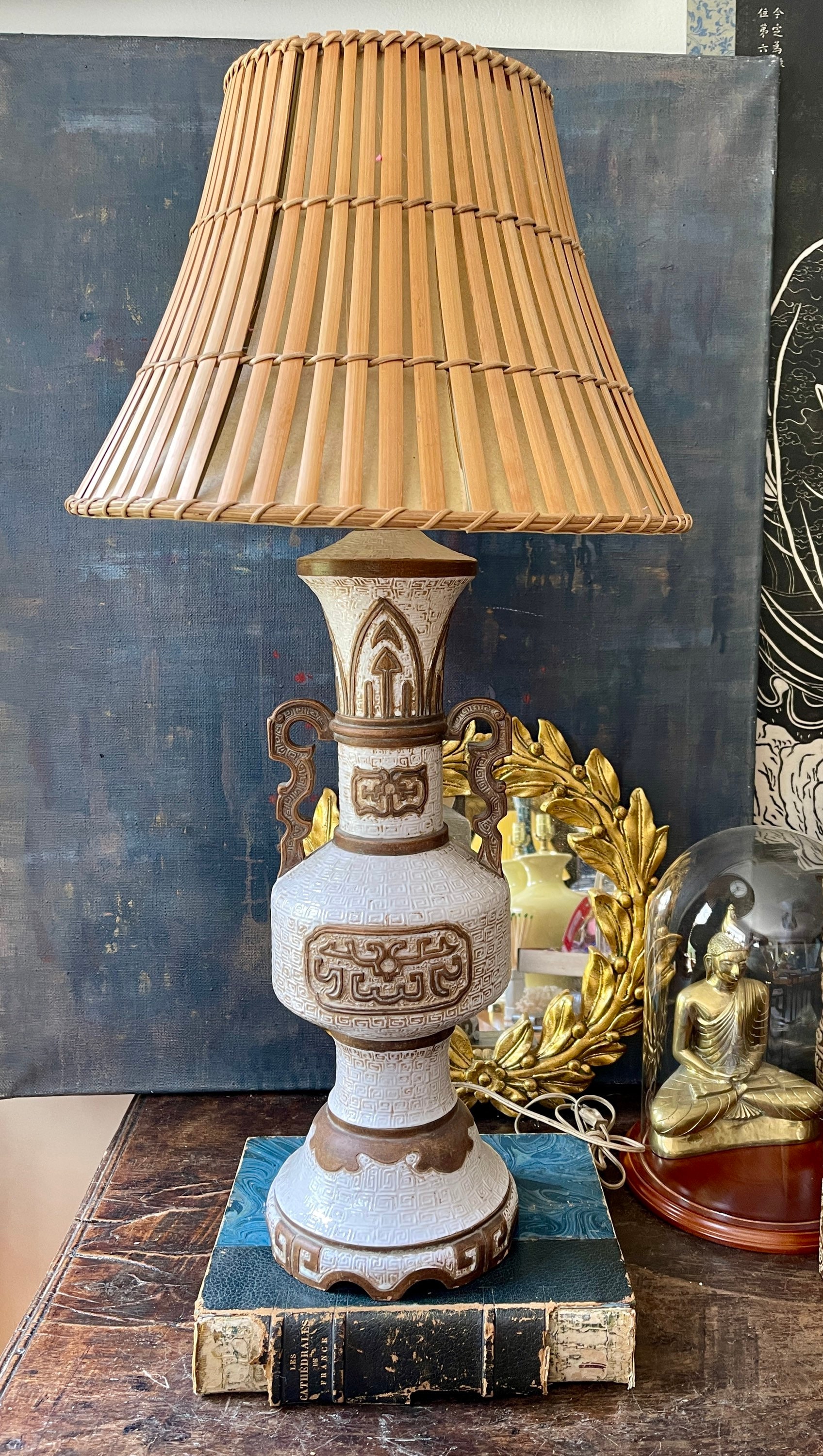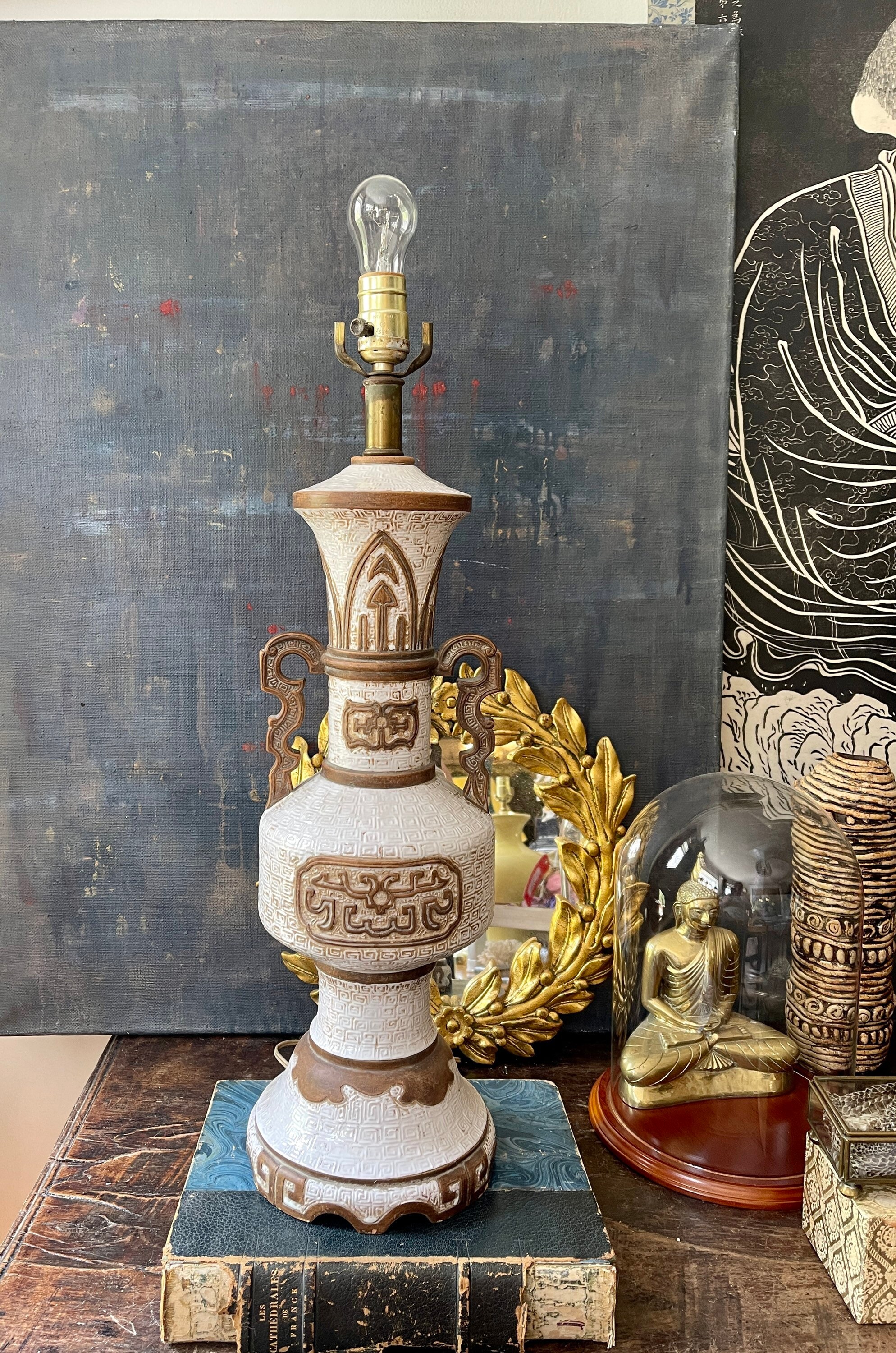 Stunning lamp, Made in Italy, this lamp is made of a terracotta clay. Glazed white over a Greek key design that is incised into the clay over the entire body of the lamp. Both sides of lamp are decorated the same, with a central panel of Asian motif. Large scrolling handles in a brown sculpt and arch on each side, Greek key pattern repeats in the handles. Wonderful lamp to mix into a modern decor, full of James Mont style, it transcends time.