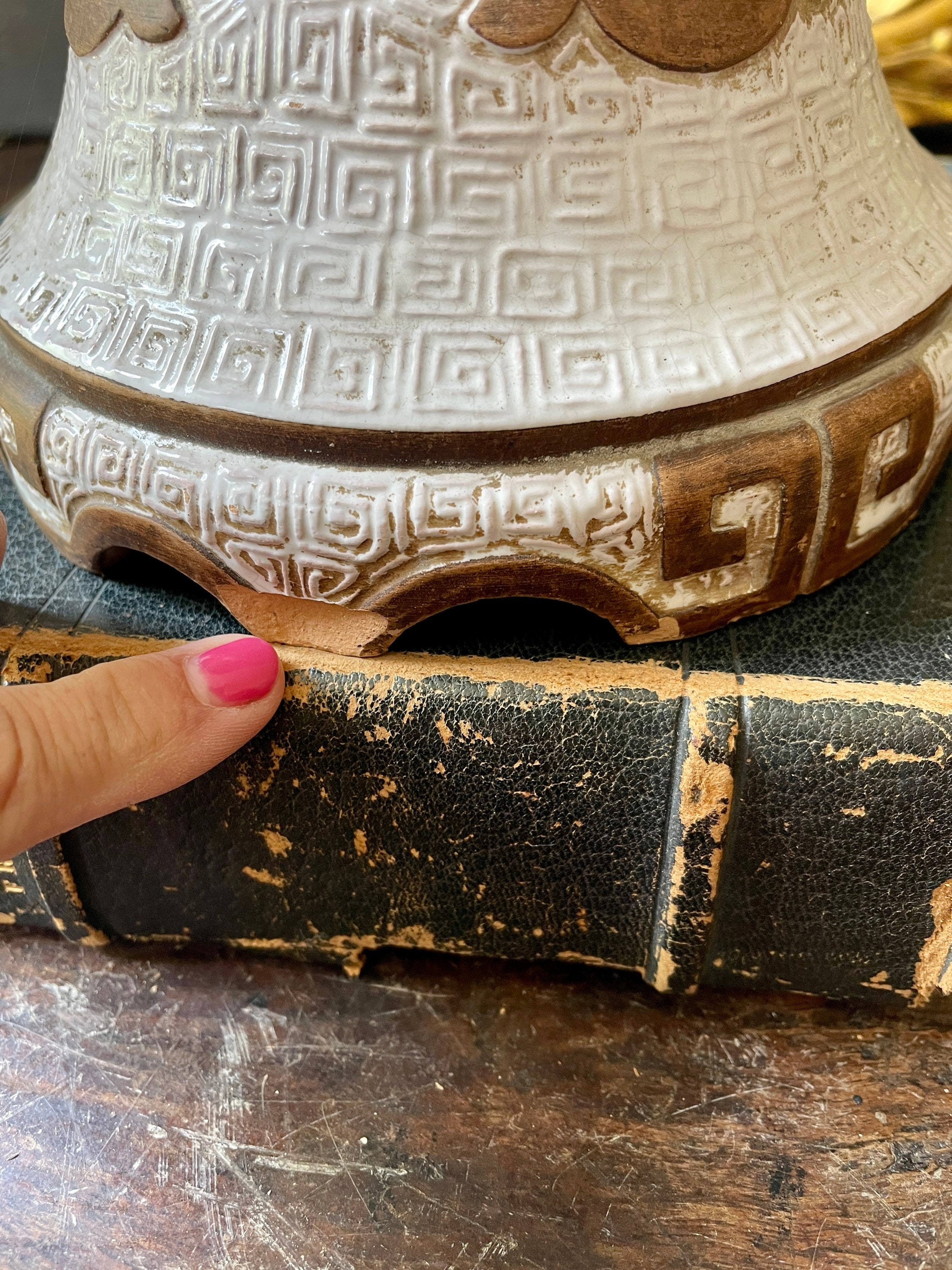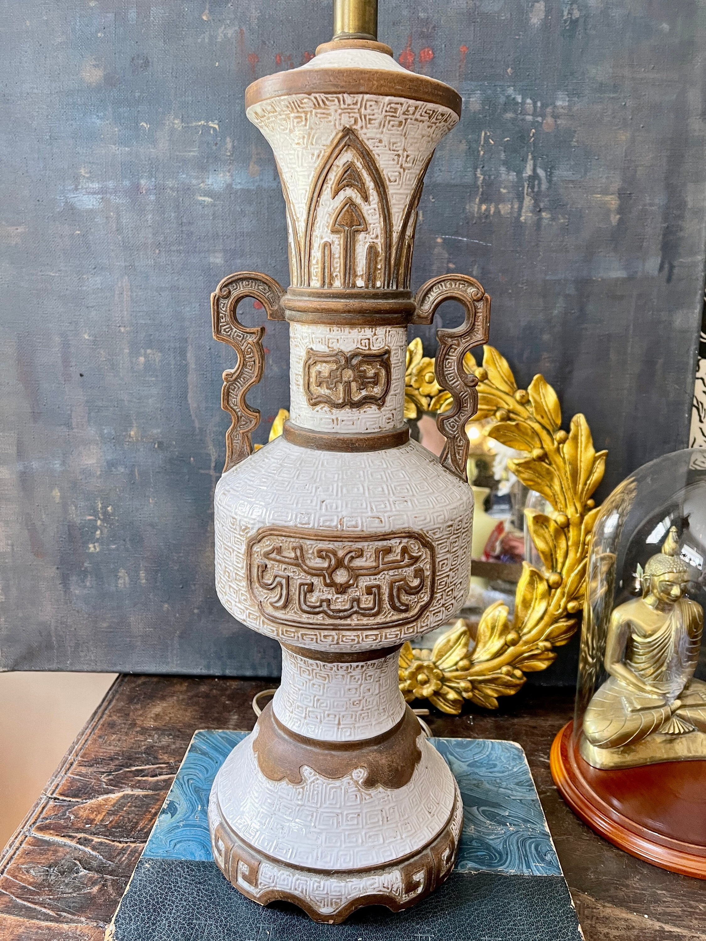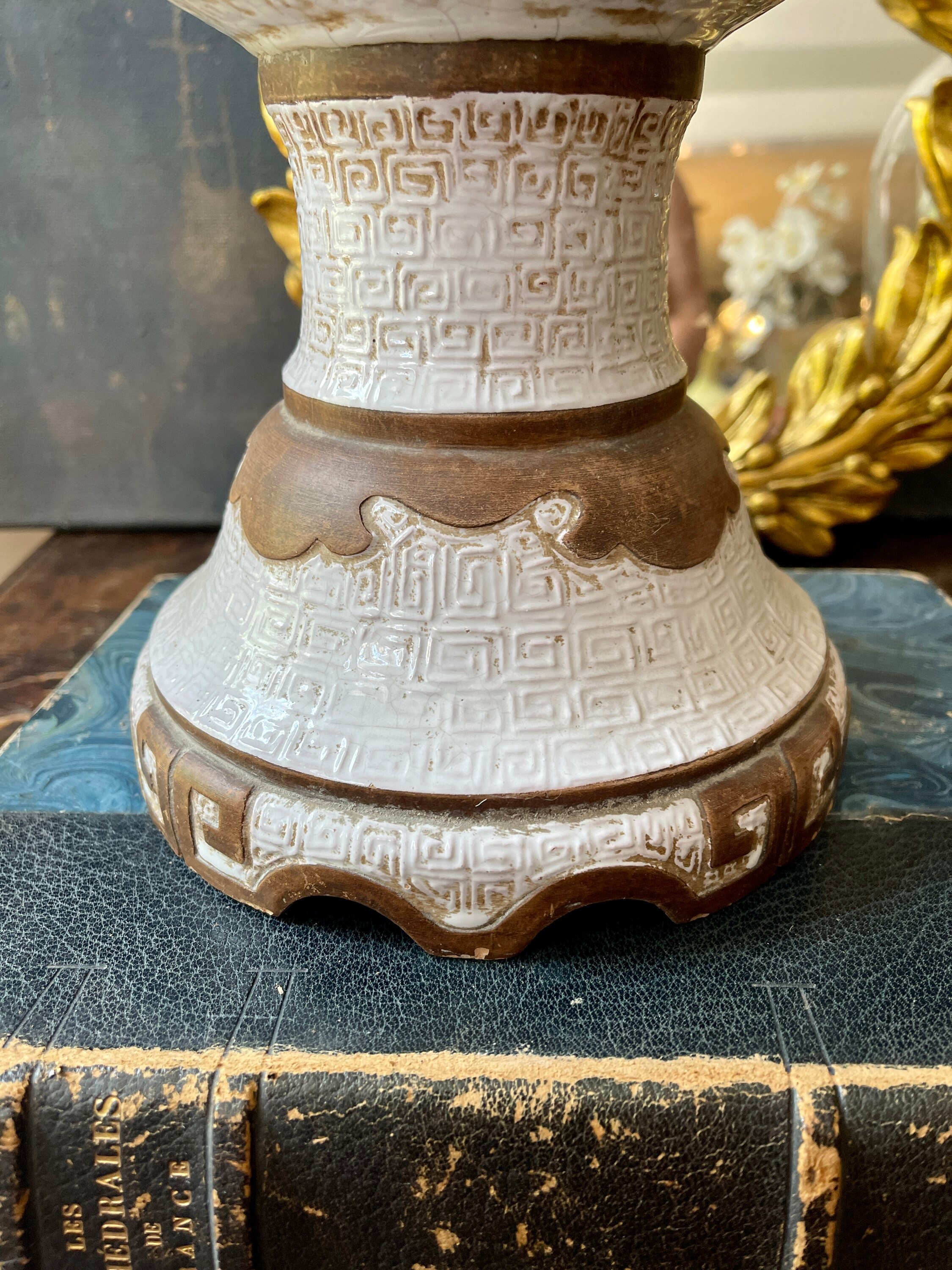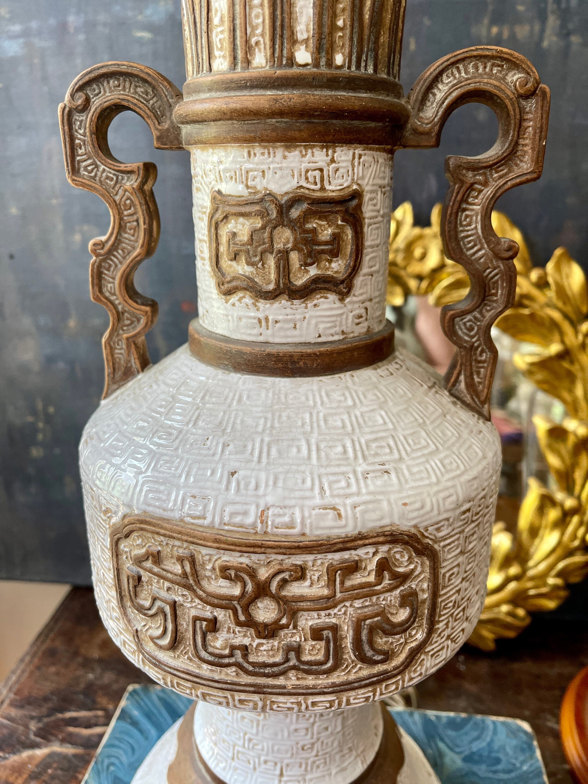 Stunning lamp, Made in Italy, this lamp is made of a terracotta clay. Glazed white over a Greek key design that is incised into the clay over the entire body of the lamp. Both sides of lamp are decorated the same, with a central panel of Asian motif. Large scrolling handles in a brown sculpt and arch on each side, Greek key pattern repeats in the handles. Wonderful lamp to mix into a modern decor, full of James Mont style, it transcends time.