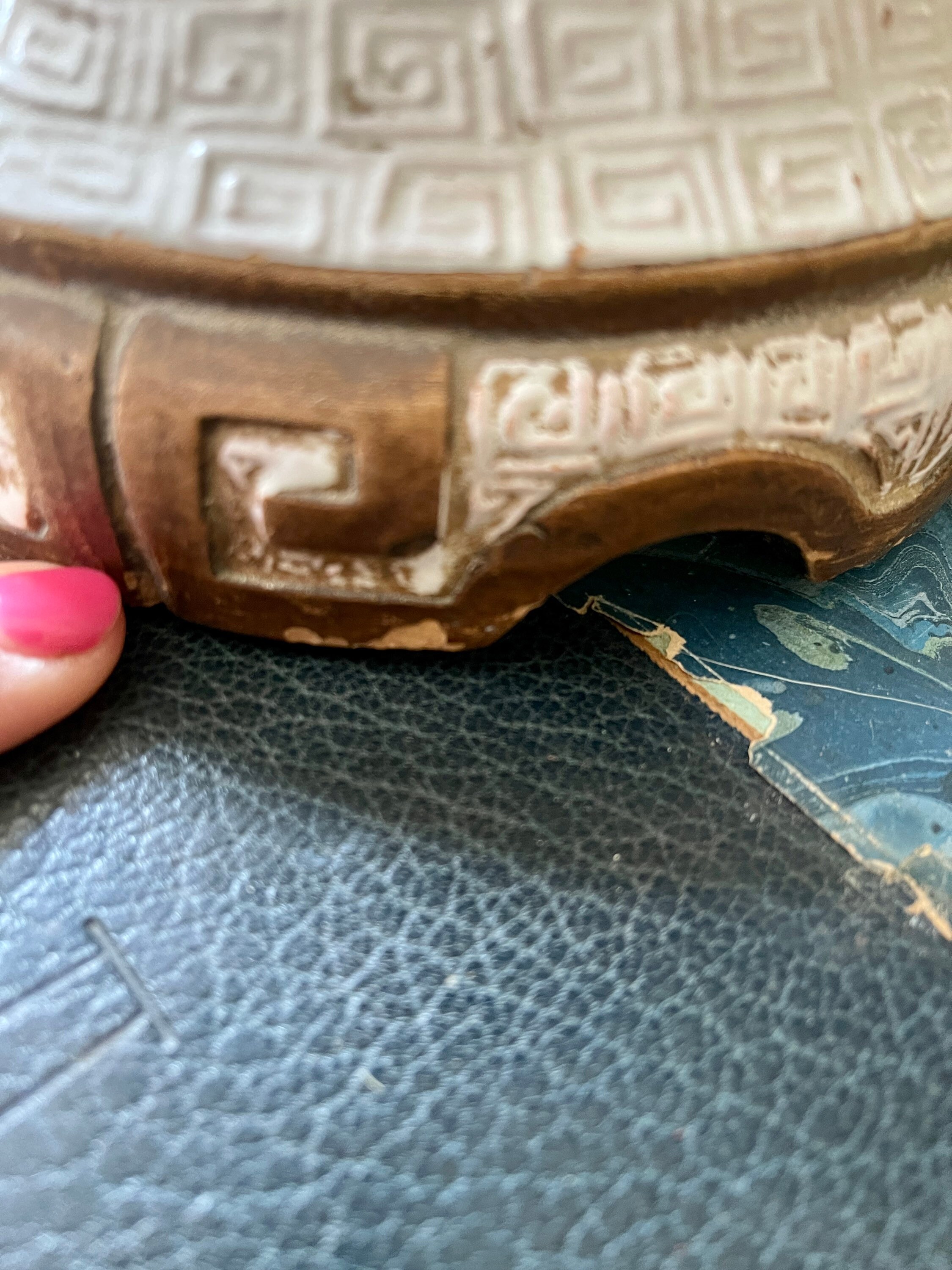 Lamp base at bottom has a 1.25” chip (see photo), a few other scuffs along bottom edge. Minor surface dust.