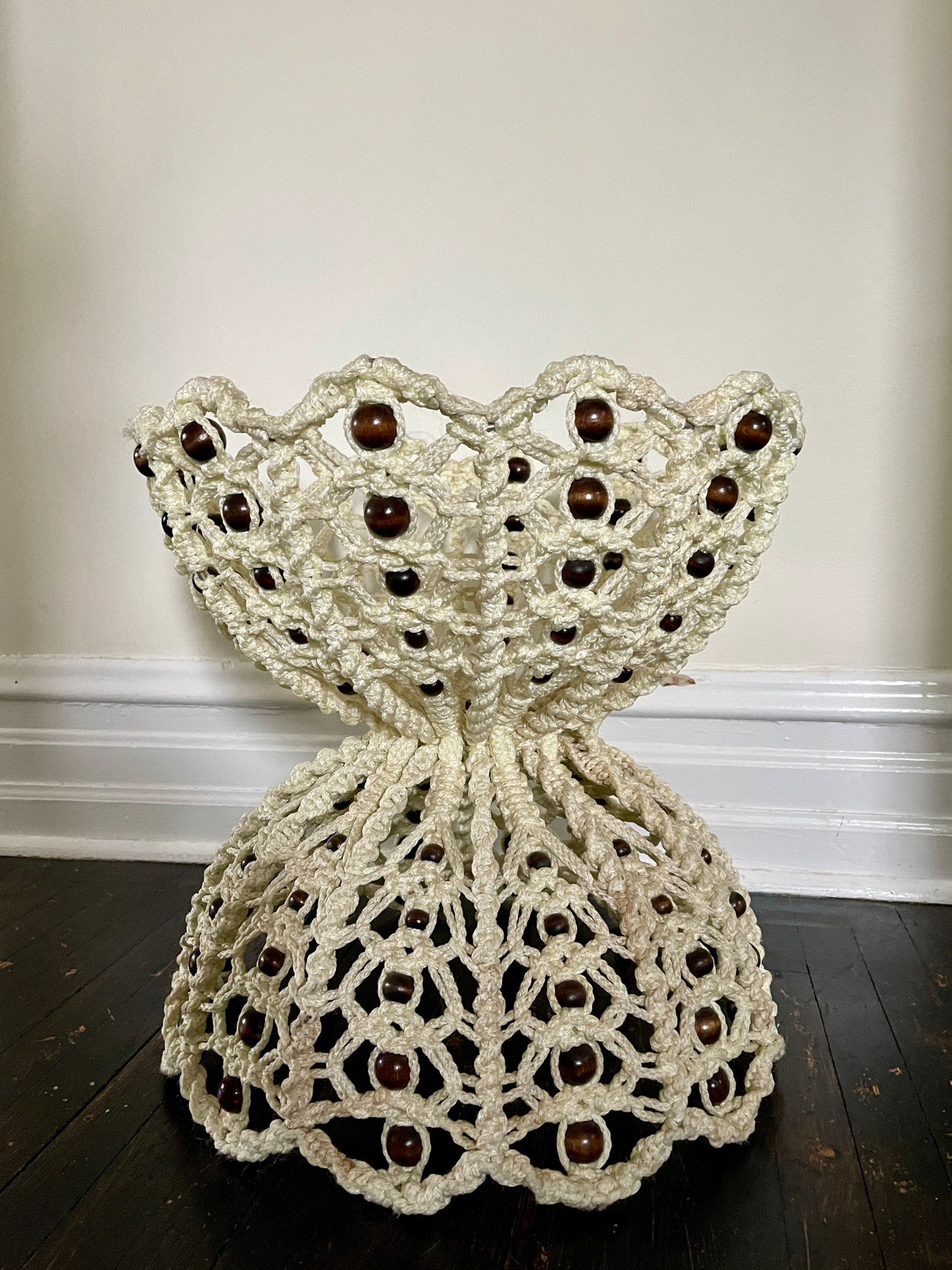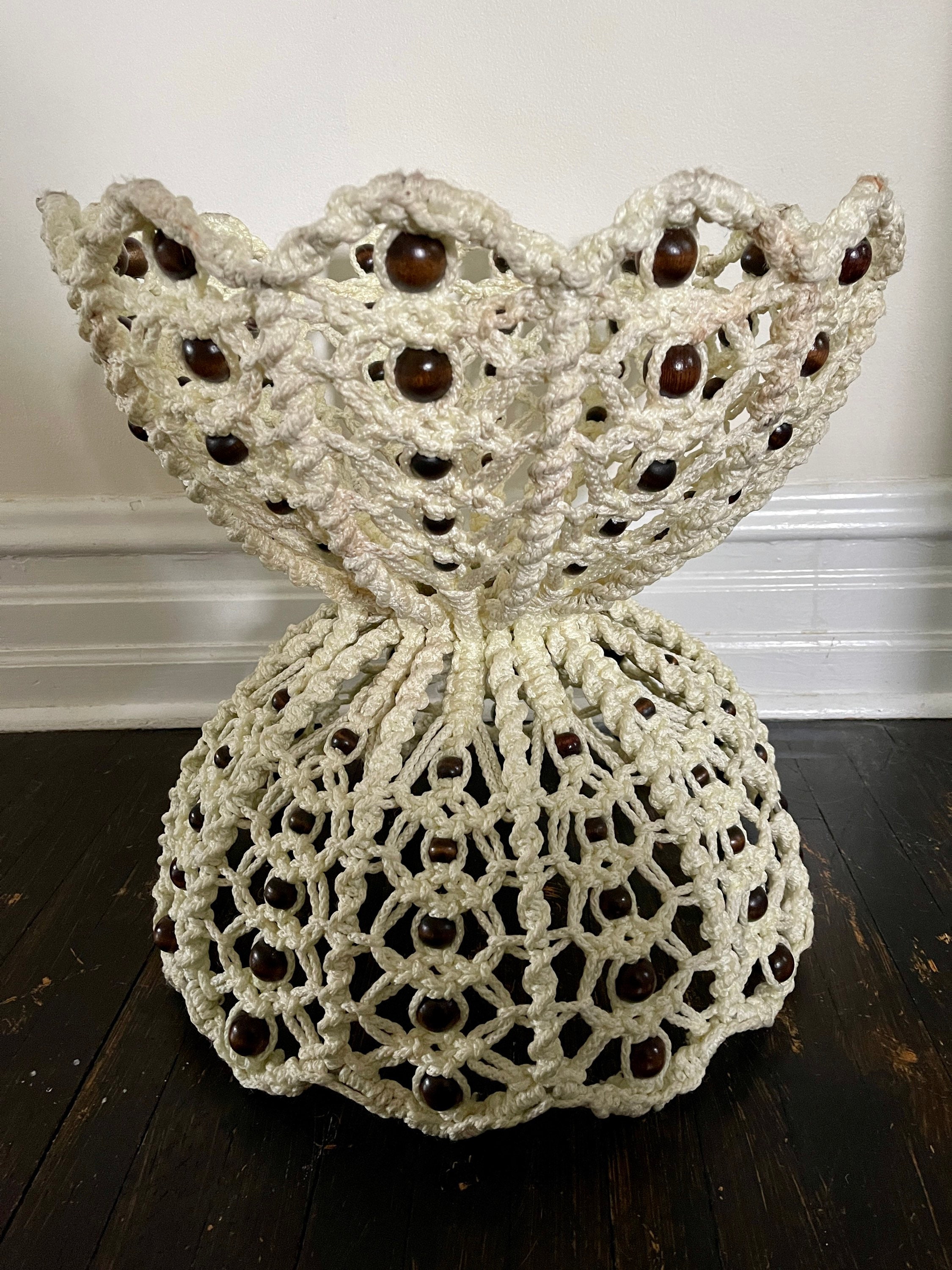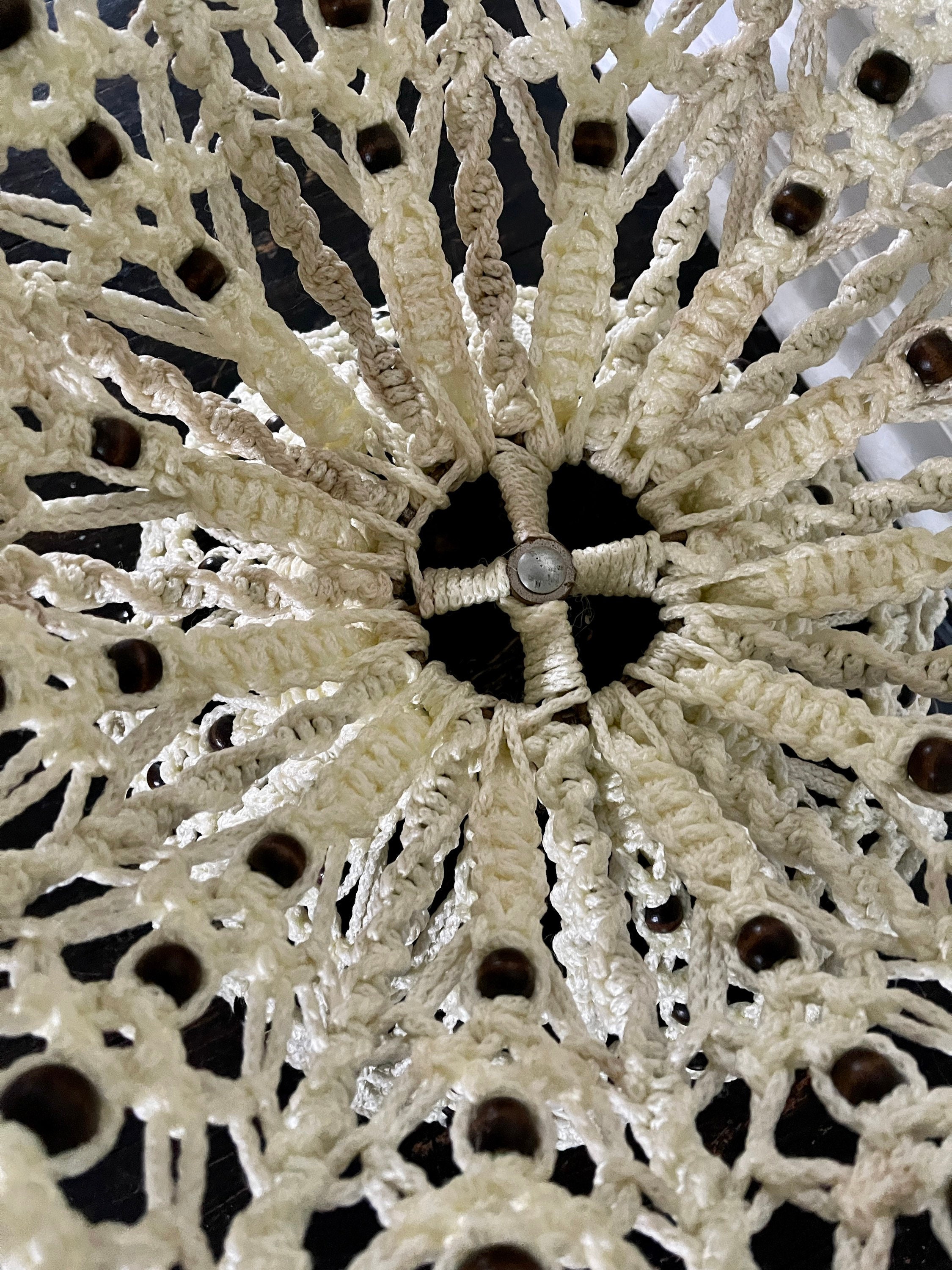 Such an unique and fabulous side table base, presented in macrame that has been woven over metal supports, giving it strength as a table! Shaped as an hourglass, the table sits on an 18” base, narrows and flares back out to 18”. Woven in a cream nylon with wooden beads stained a chocolate brown throughout, it is a great piece for a side table, cocktail table and would be great indoors or in a sunroom for that boho appeal!