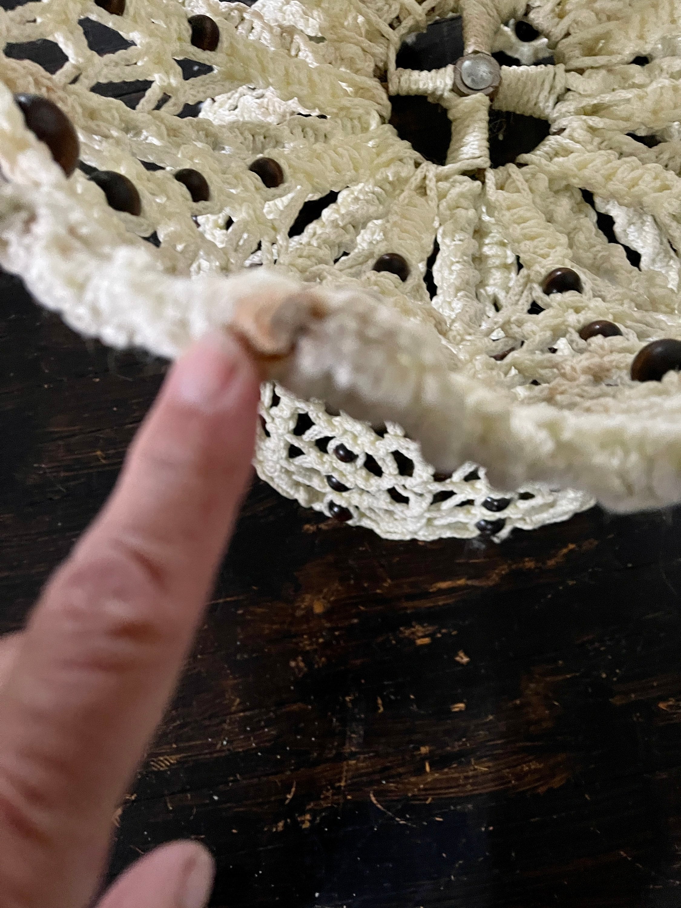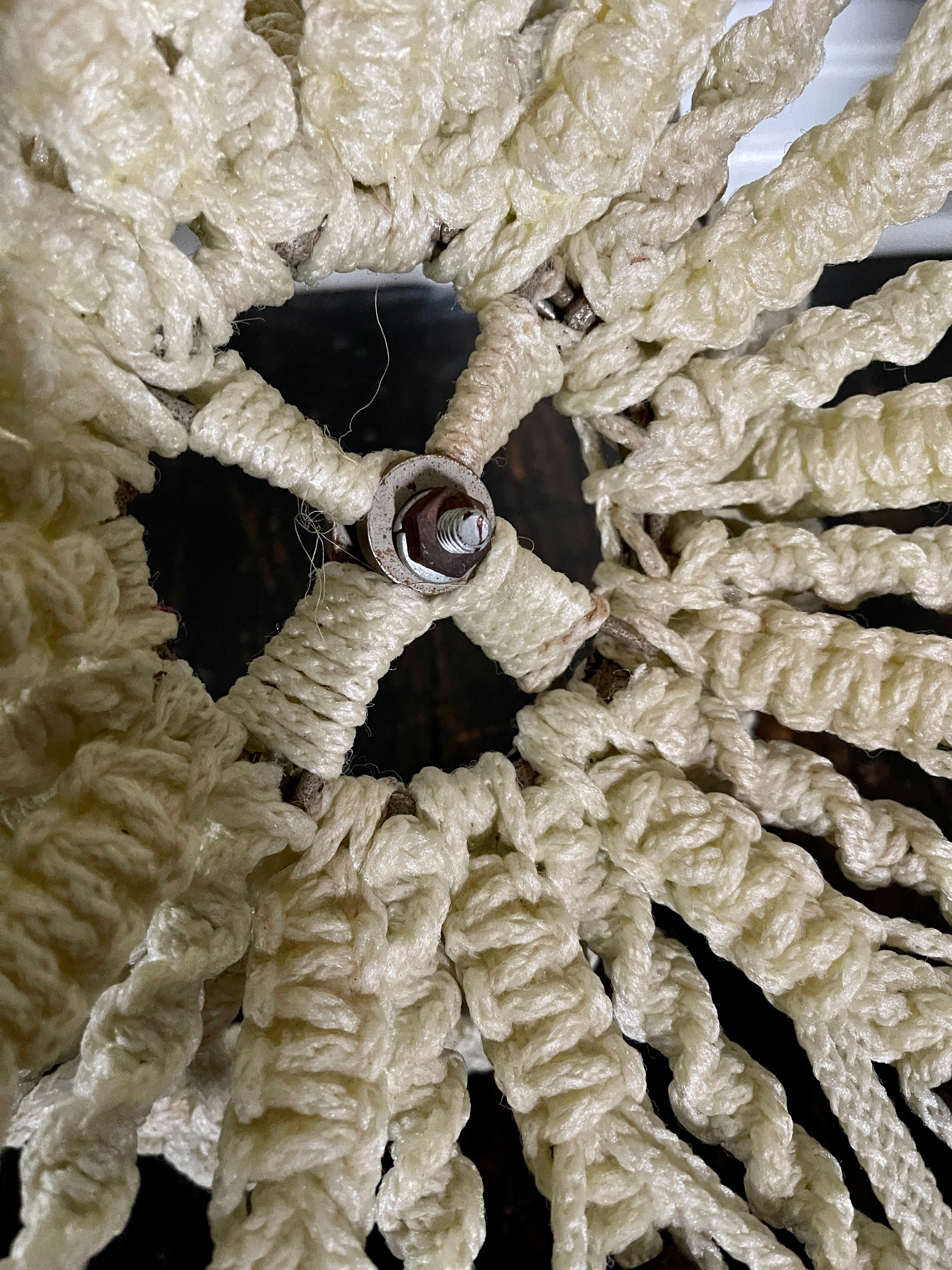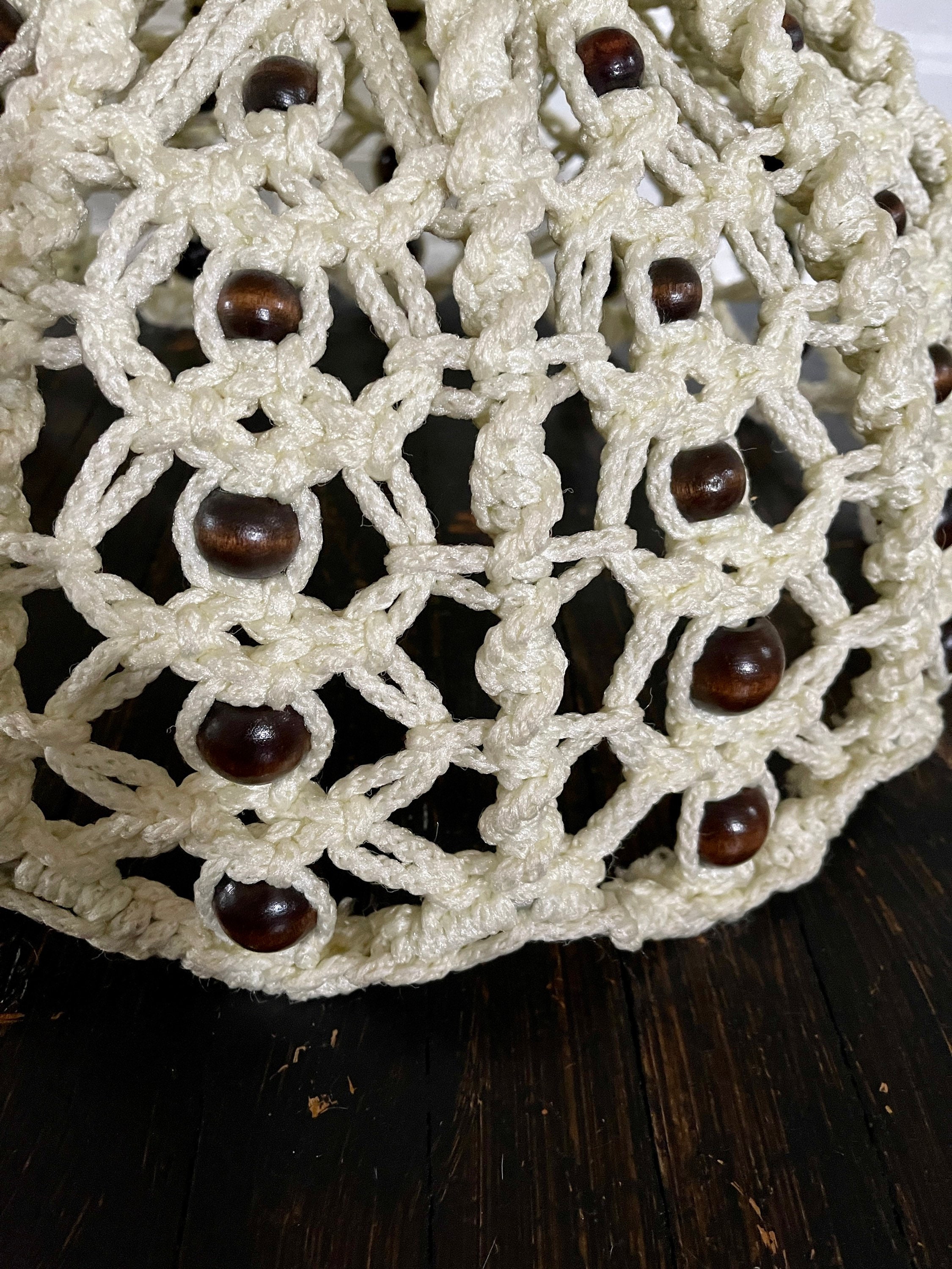 Such an unique and fabulous side table base, presented in macrame that has been woven over metal supports, giving it strength as a table! Shaped as an hourglass, the table sits on an 18” base, narrows and flares back out to 18”. Woven in a cream nylon with wooden beads stained a chocolate brown throughout, it is a great piece for a side table, cocktail table and would be great indoors or in a sunroom for that boho appeal!