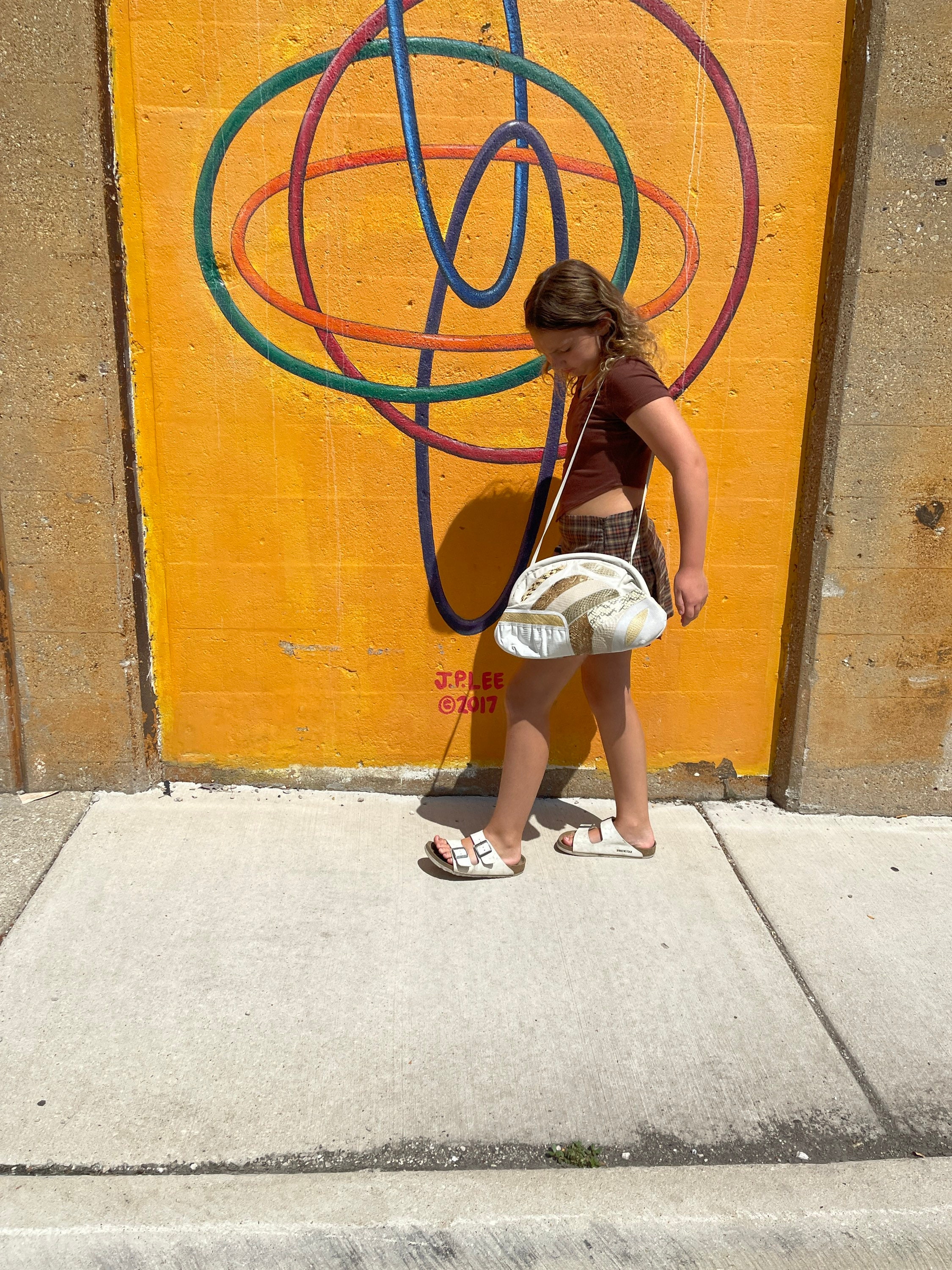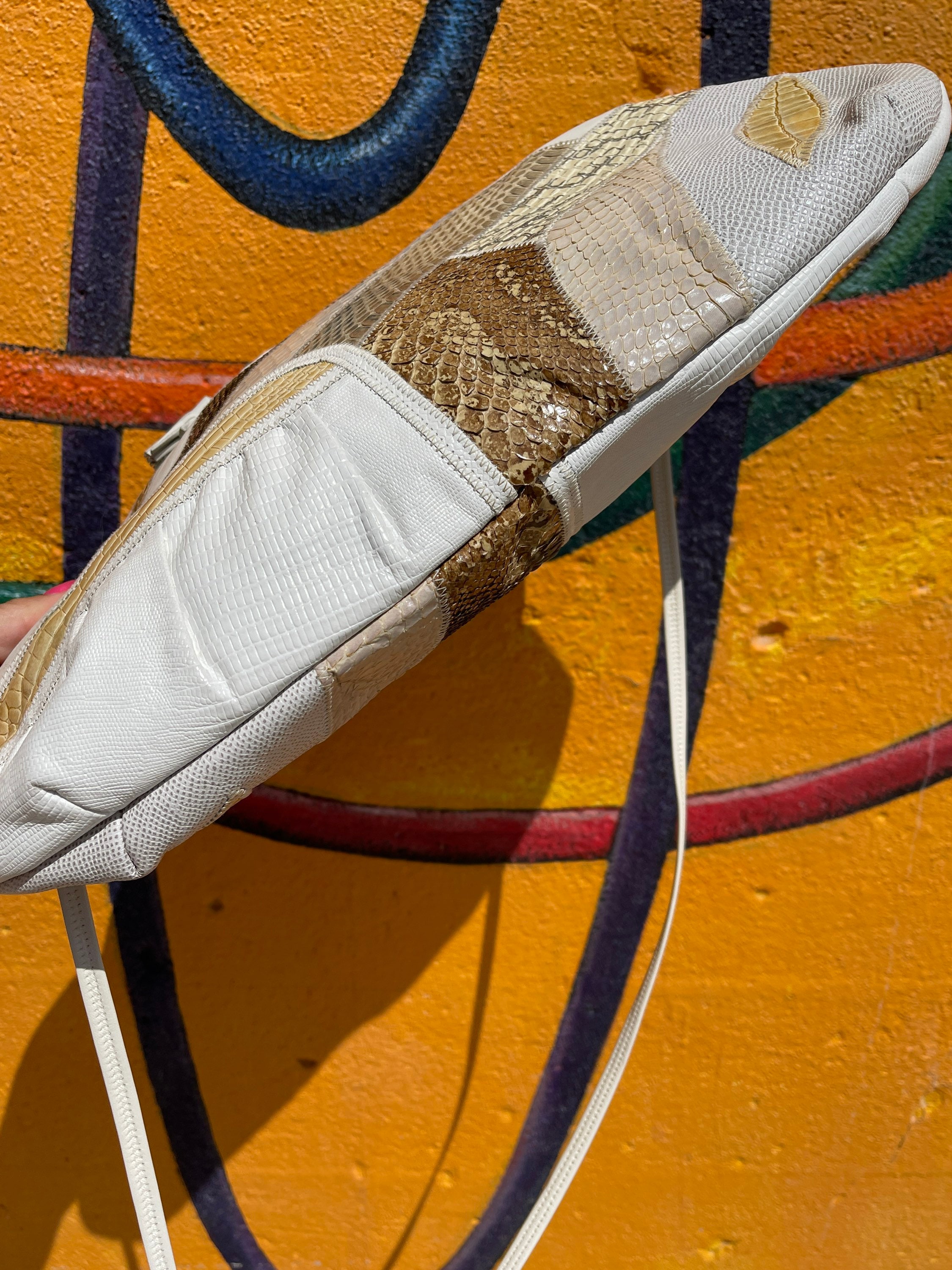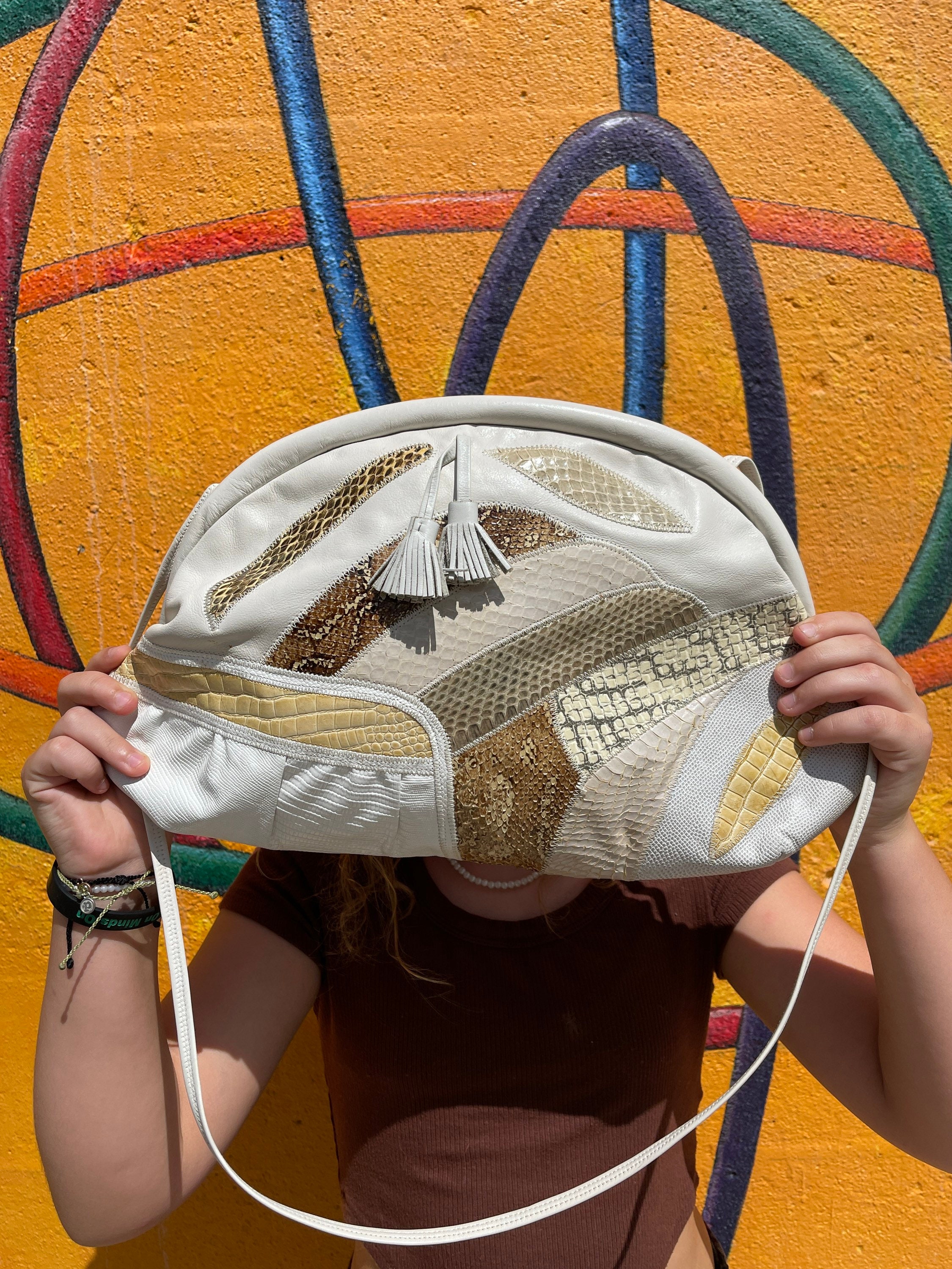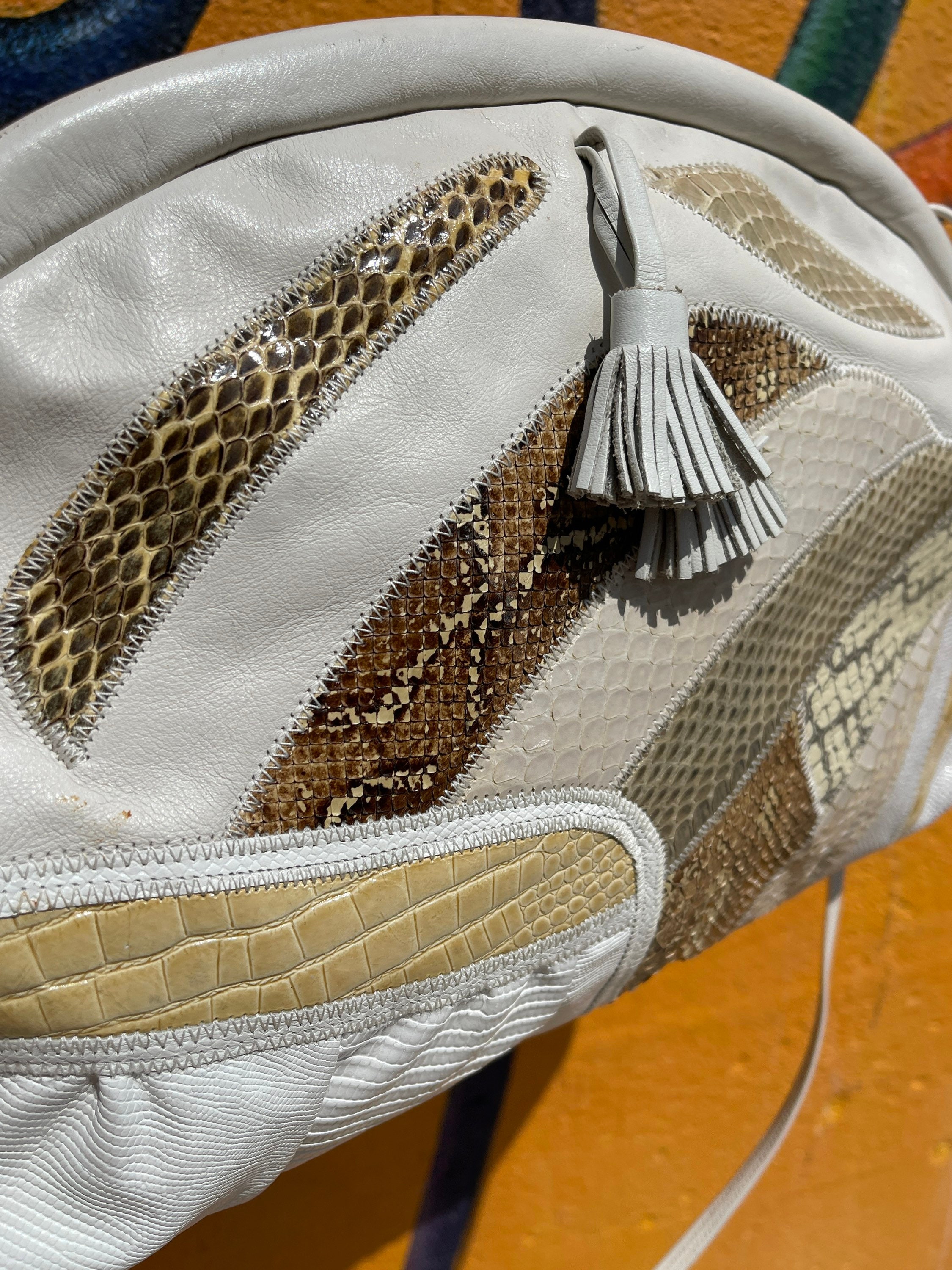 We love this vintage handbag, presented in a crisp white with a patchwork detail across front of faux exotic skins such as lizard, alligator, python - in shades of taupe, cream and soft buttery yellows. Both sides of bag are decorated in faux skins! The handbag has a hinged closure and opens to a wide mouth style opening. A shoulder strap adds ability to carry over shoulder or tuck strap into bag and it becomes a clutch. Two leather tassels hang from front of purse!
