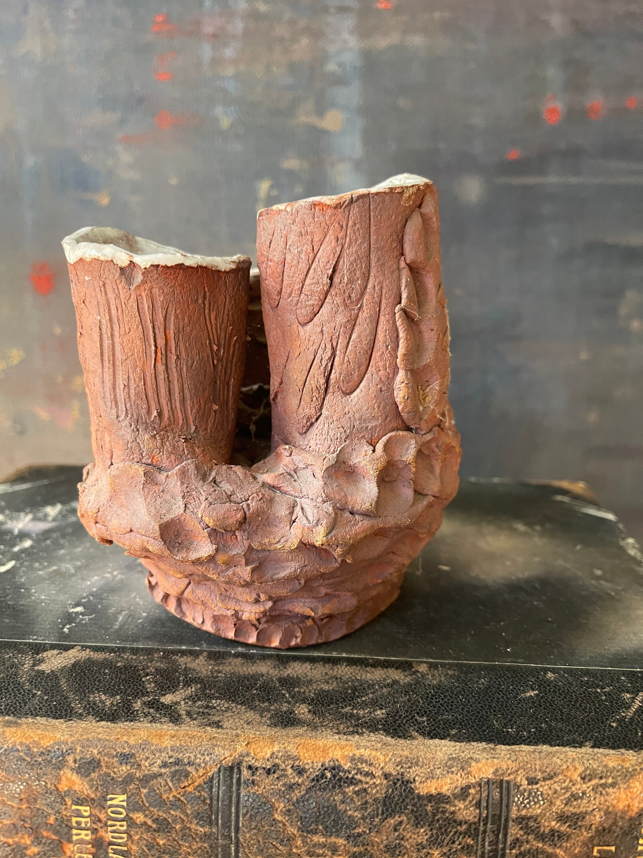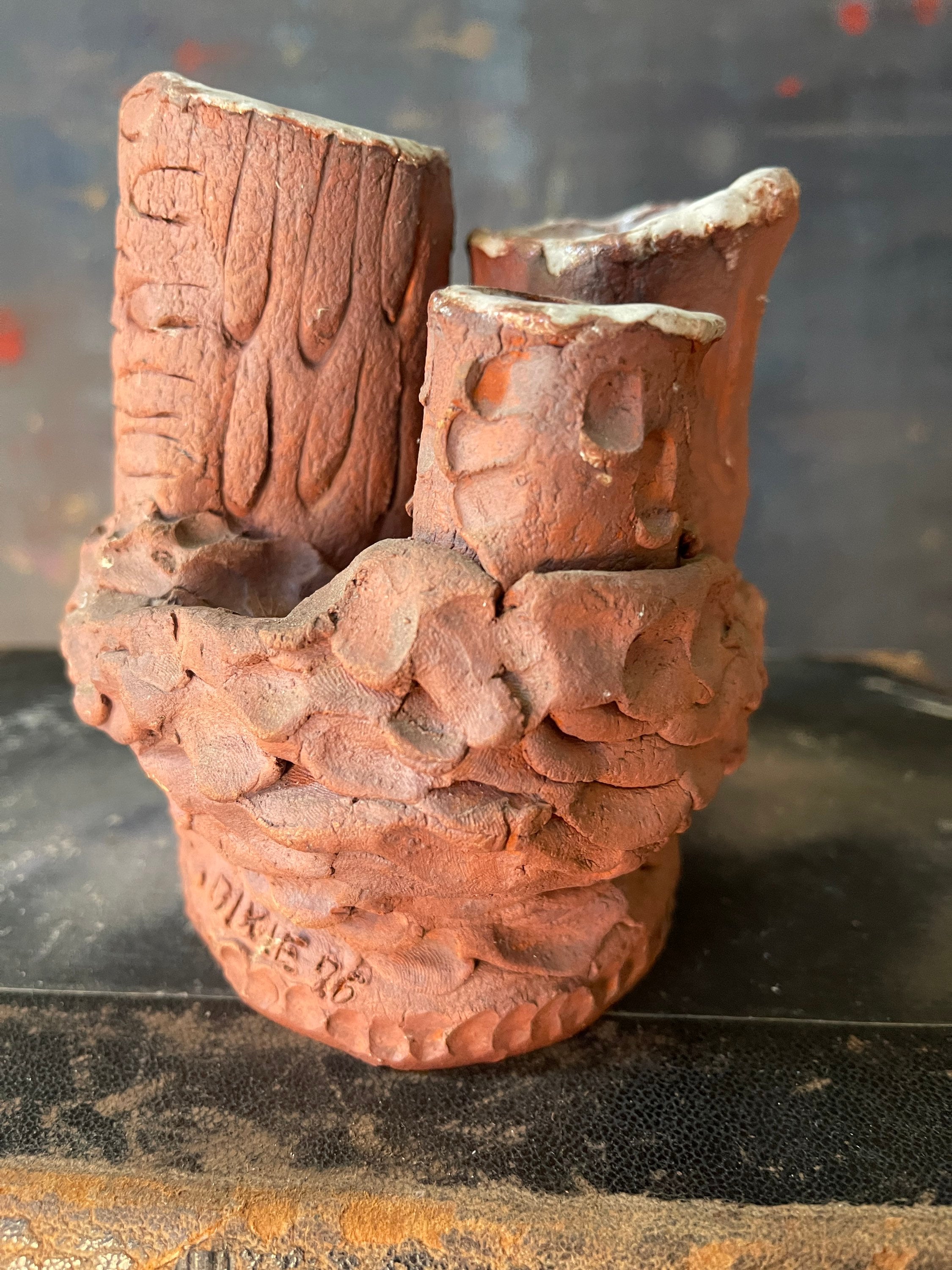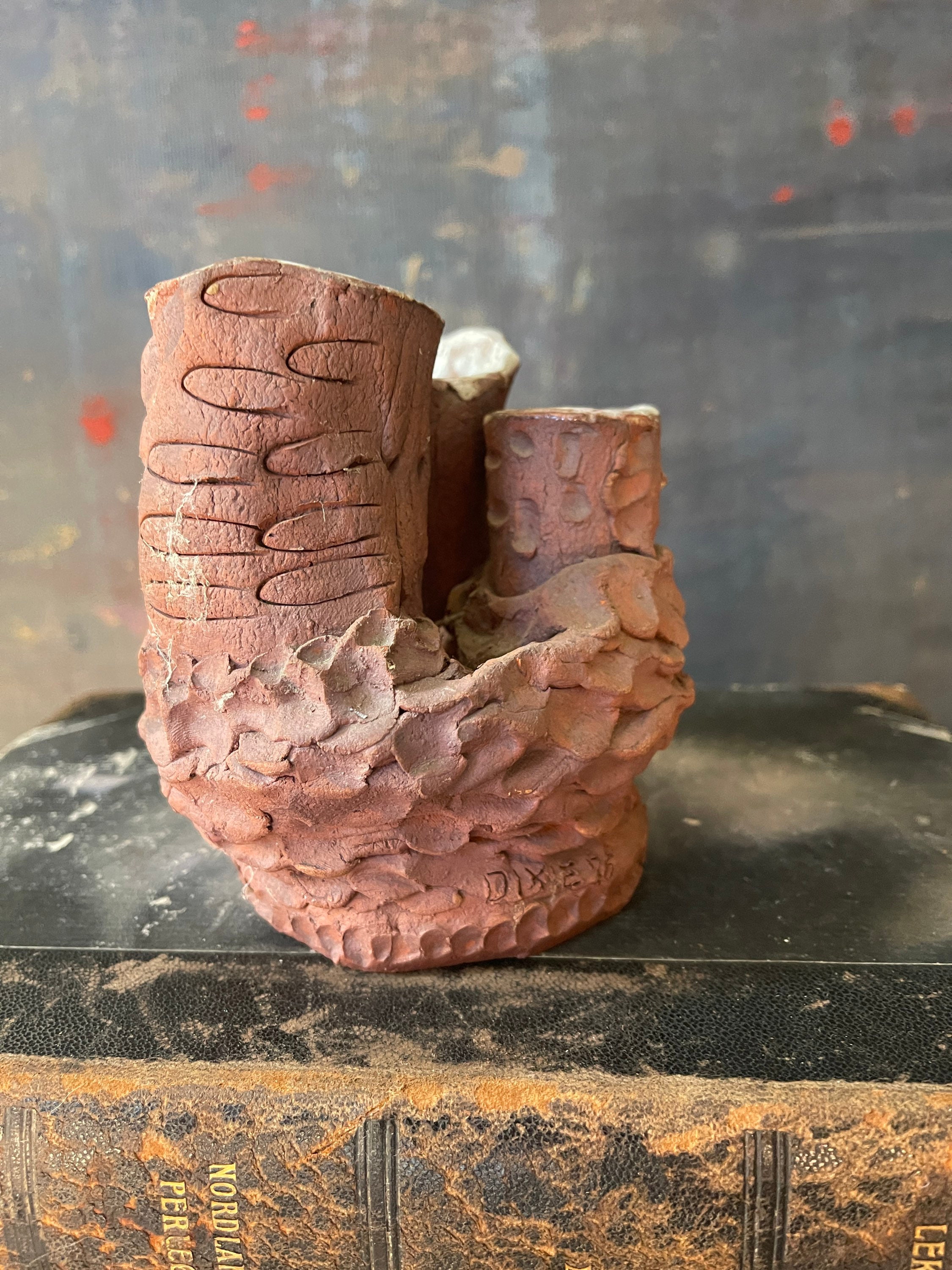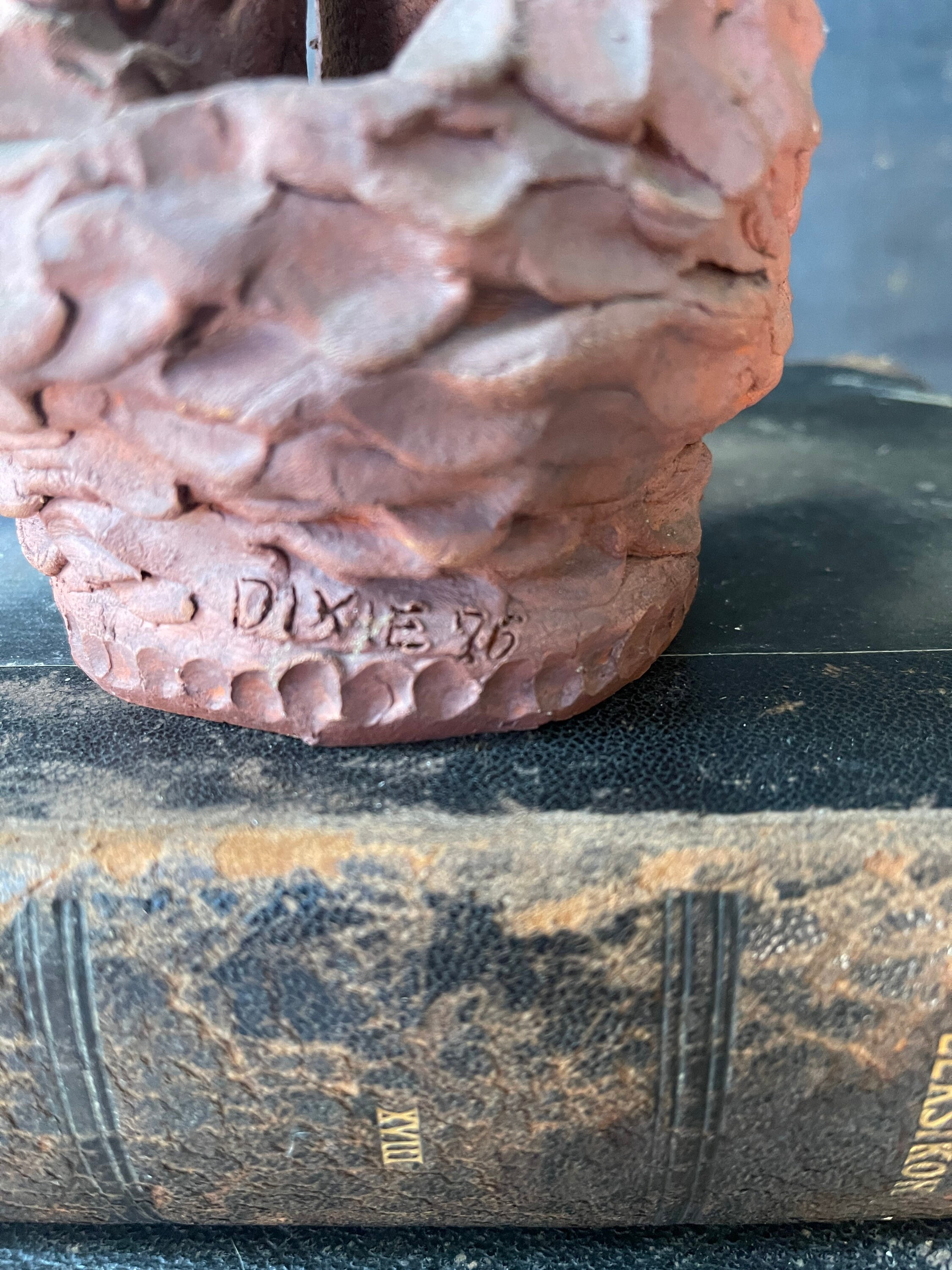 Wonderfully textured and creative piece of pottery, presented in a deep russet, matte glaze ester with white glaze on inside. Pattern imprinted into piece.