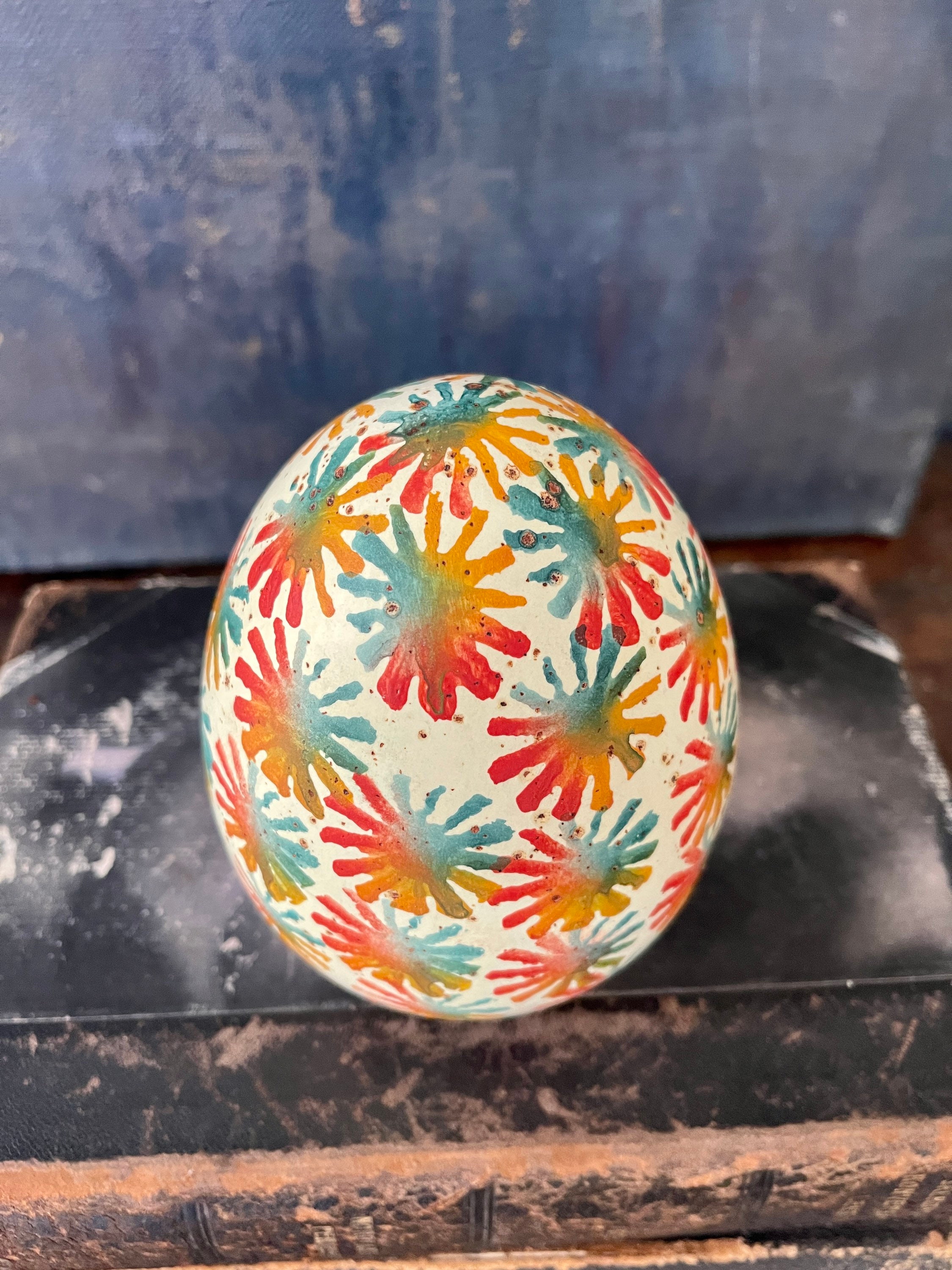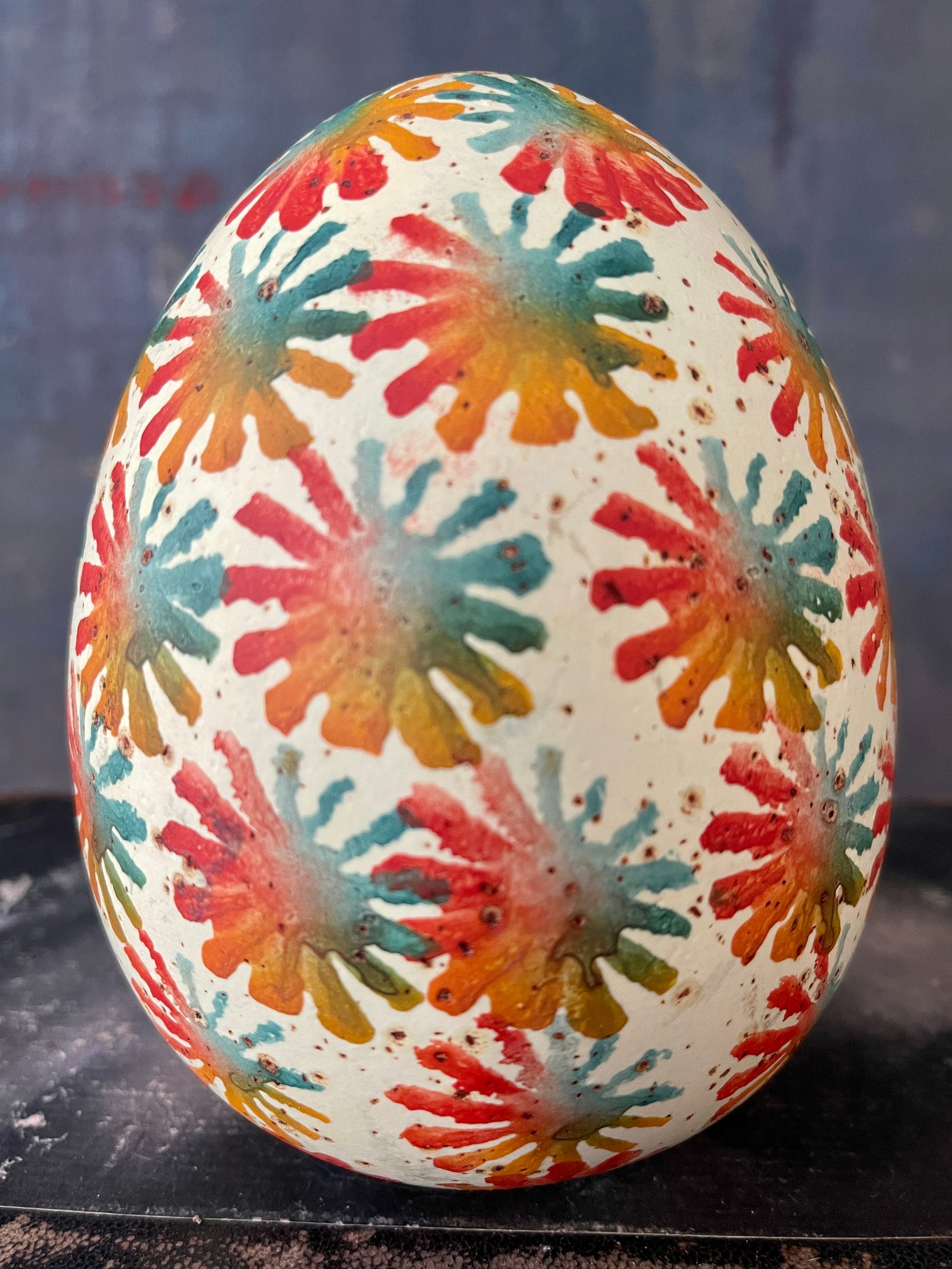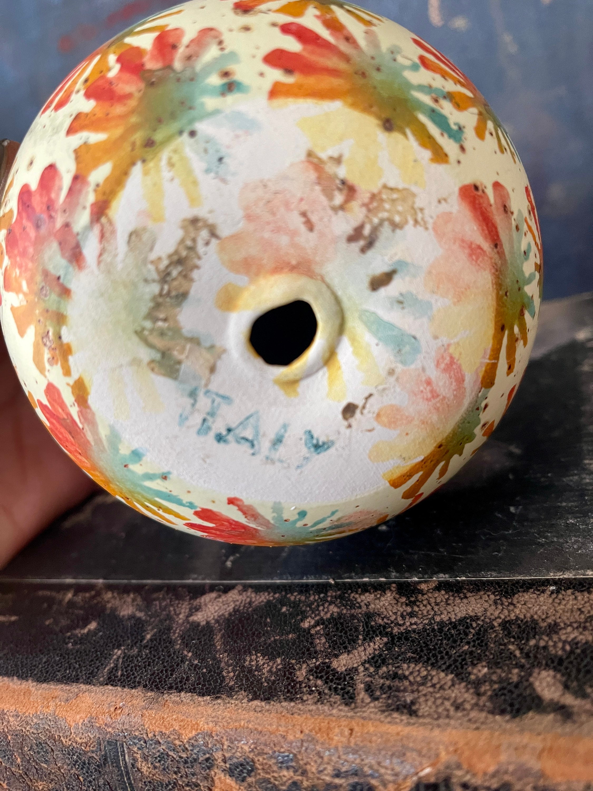 Wonderful colorful ceramic egg, Made in Italy, it’s a nice larger size, measuring 5” x 4”, presented in a cream with splashes of turquoise, red and an ochre color. Lovely addition to a bookshelf or mantel!