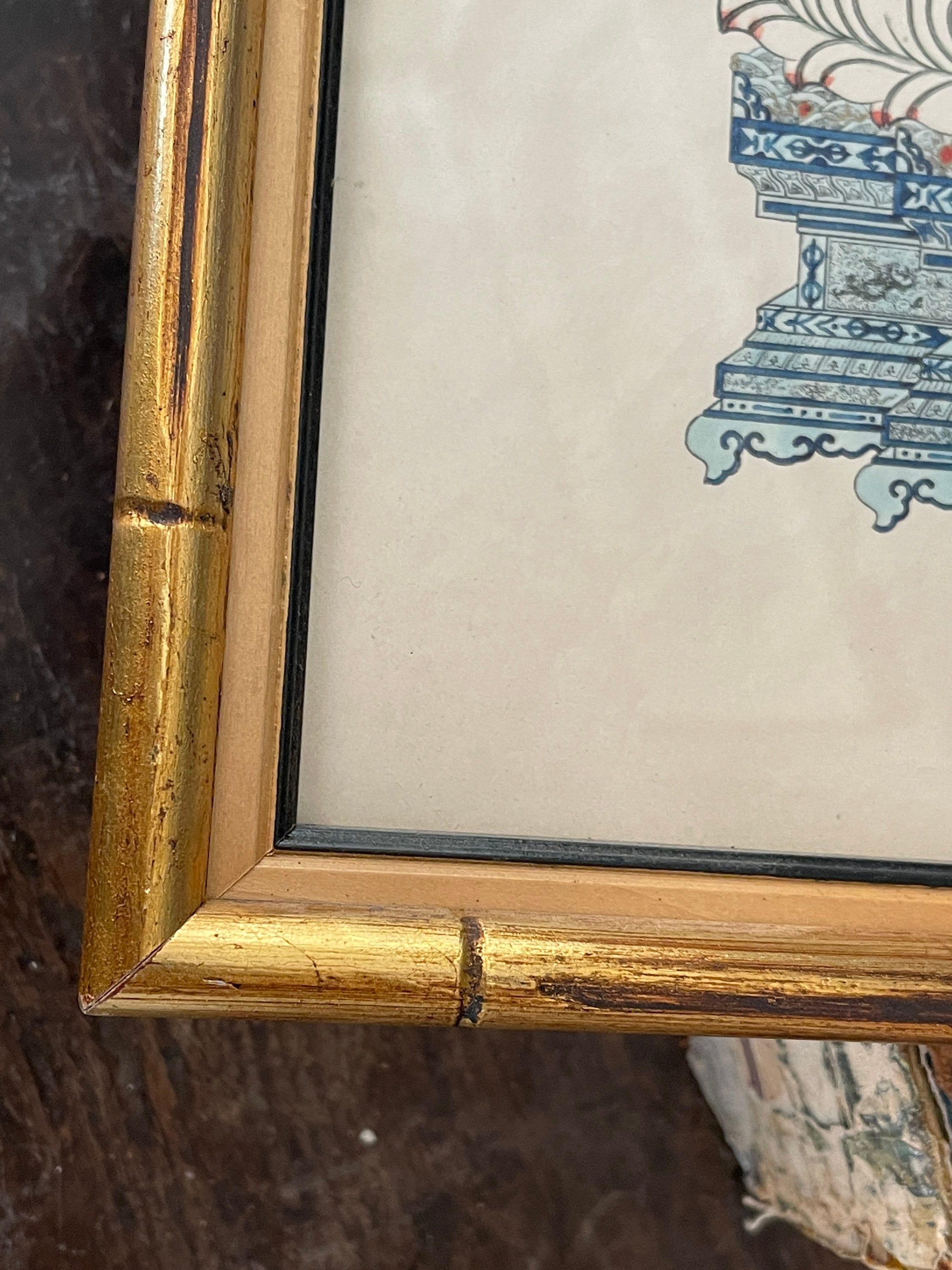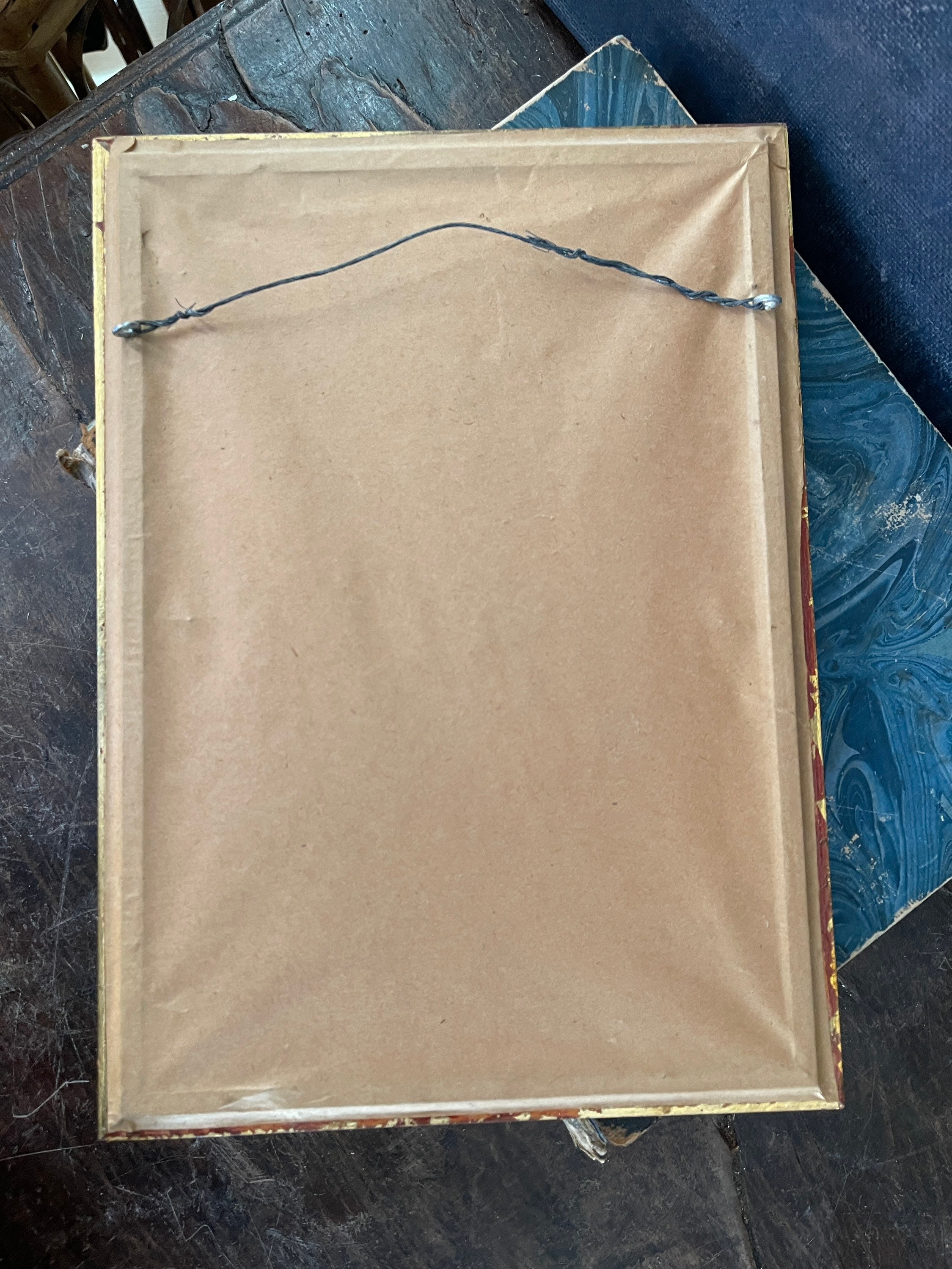 Paper has been previously creased with some ripples visible under glass. Art has not been examined out of frame. Minor scuffs to gold frame