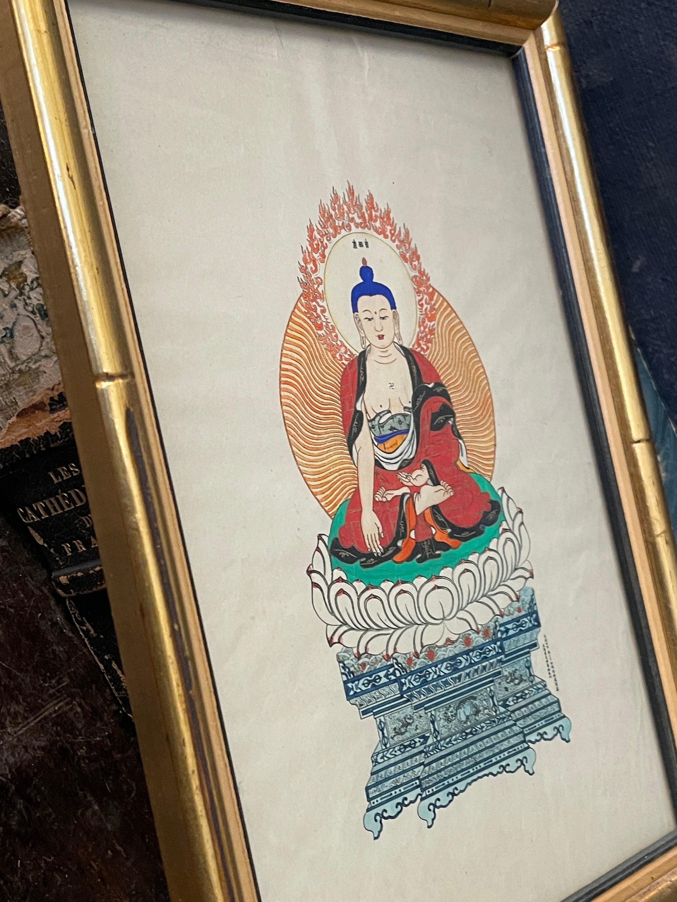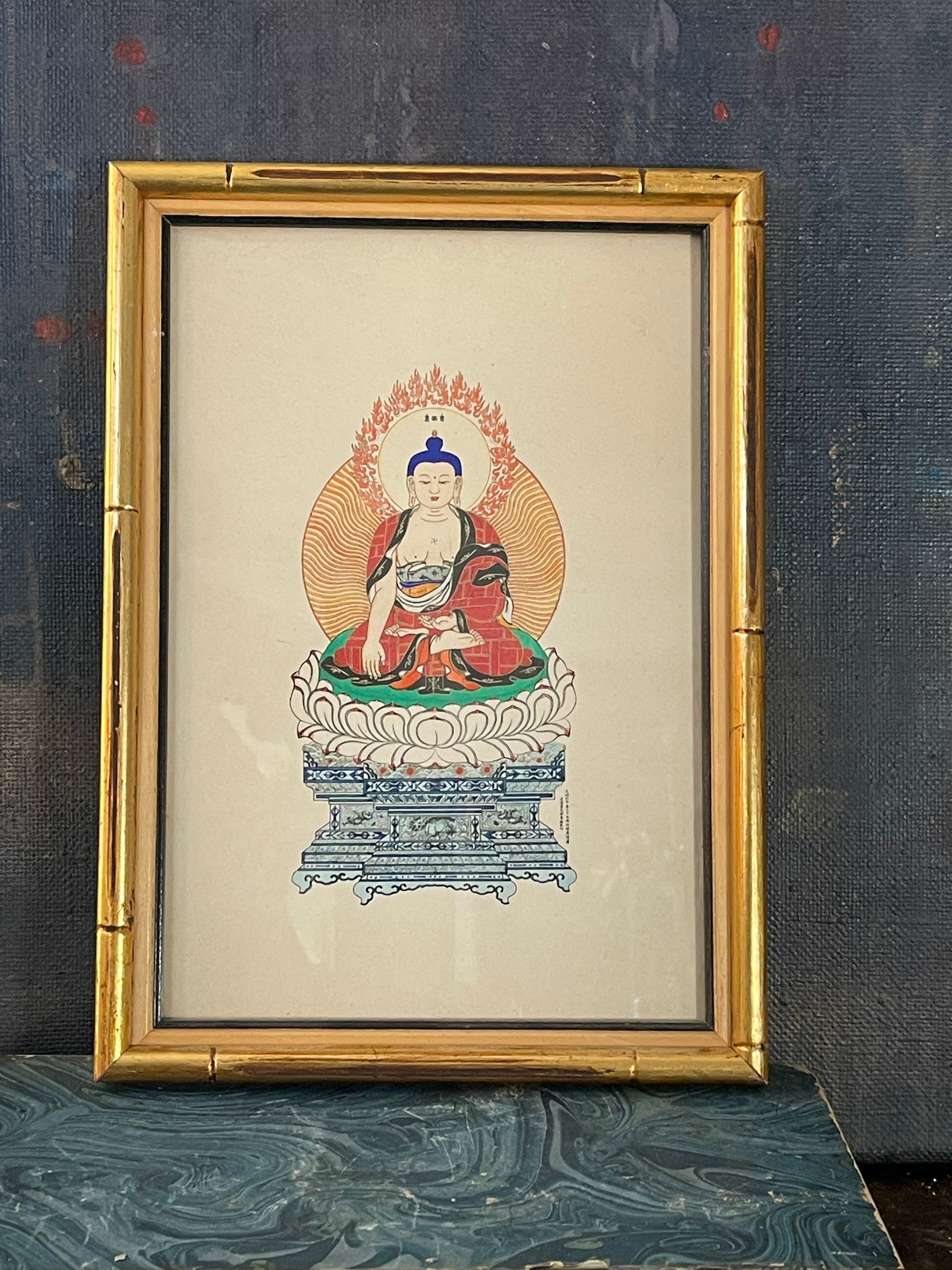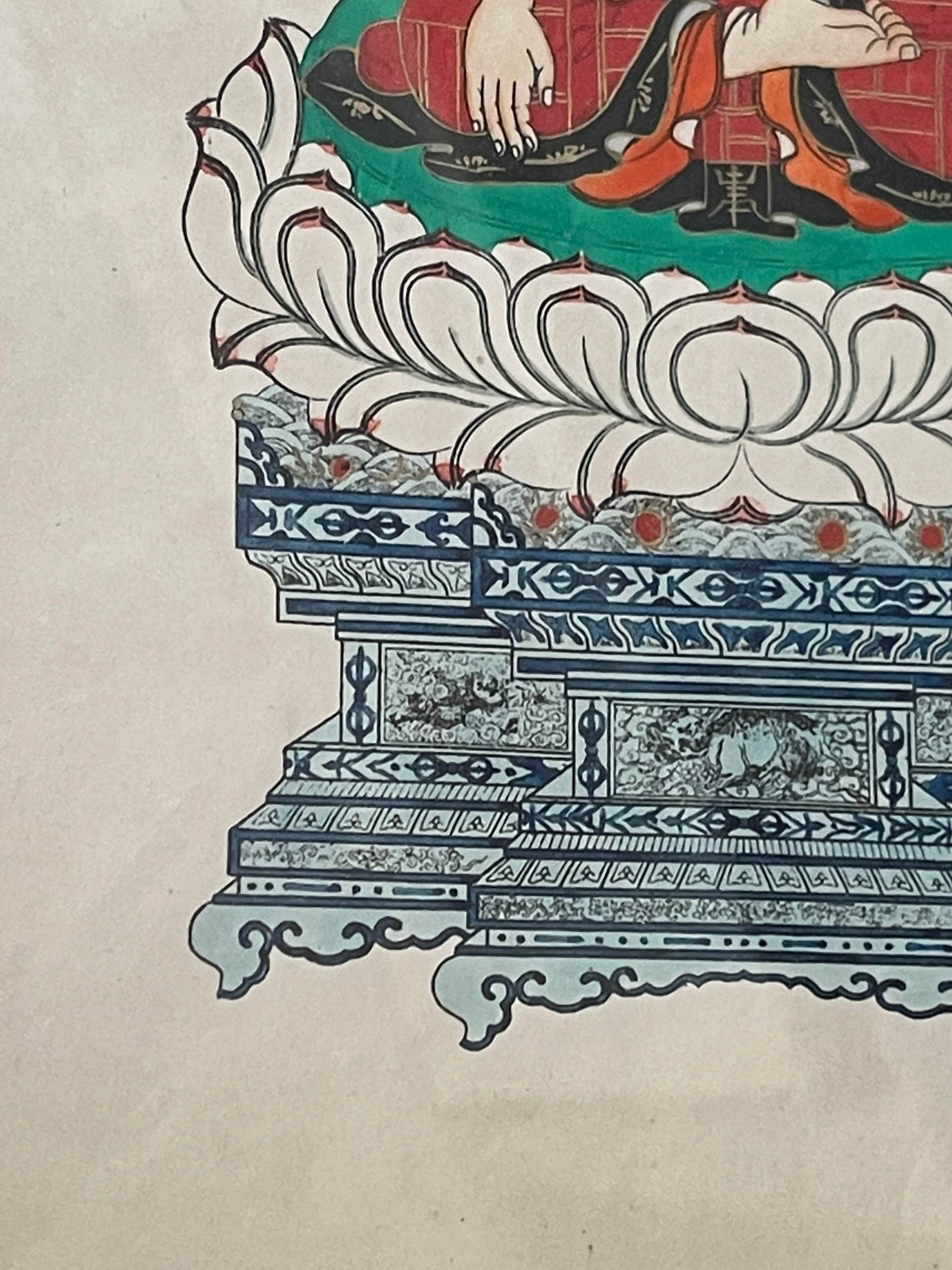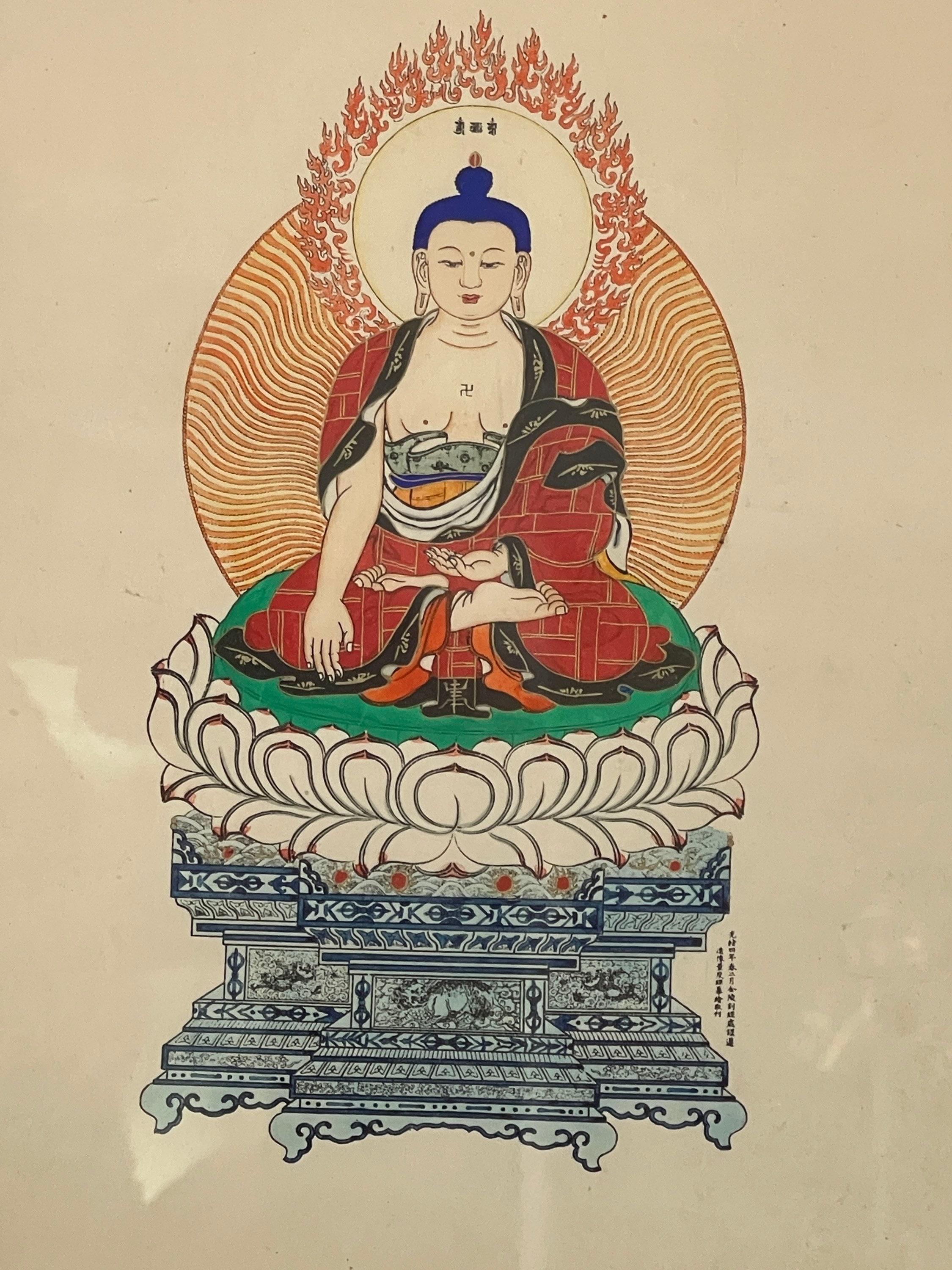 This extraordinary original painting was part of Chinese paintings that focused on Gods, Celestials, and Immortal Beings. The painting was done with ink and color in the 19th century on paper. This illustration features Buddha sitting atop a lotus blossom throne, with a large celestial orange sun behind him he offers his palm upward. Vivid royal blue, red and green decorate his draping robe and throne as it rests upon lotus blossoms. Signed by artist in lower right side.