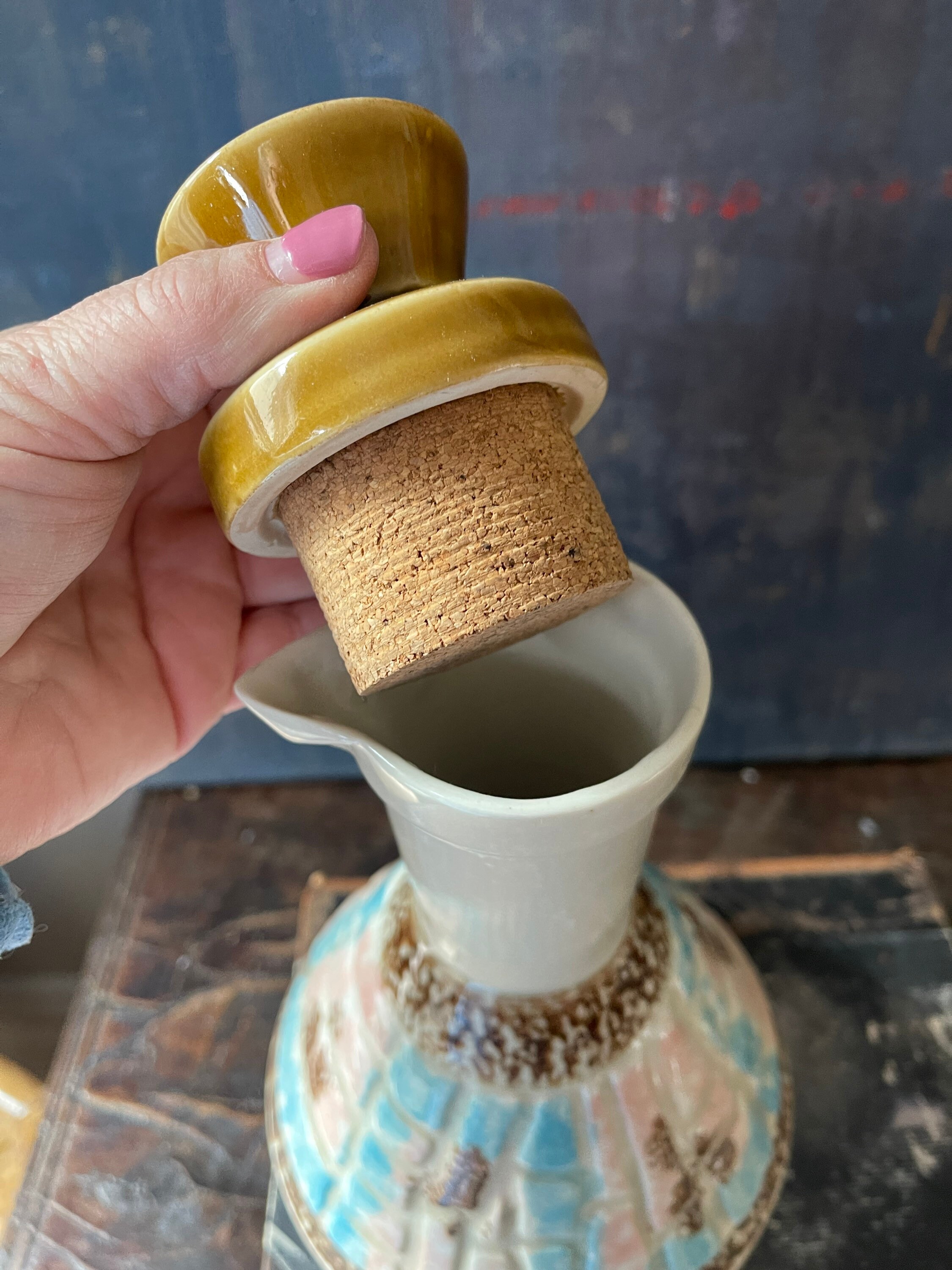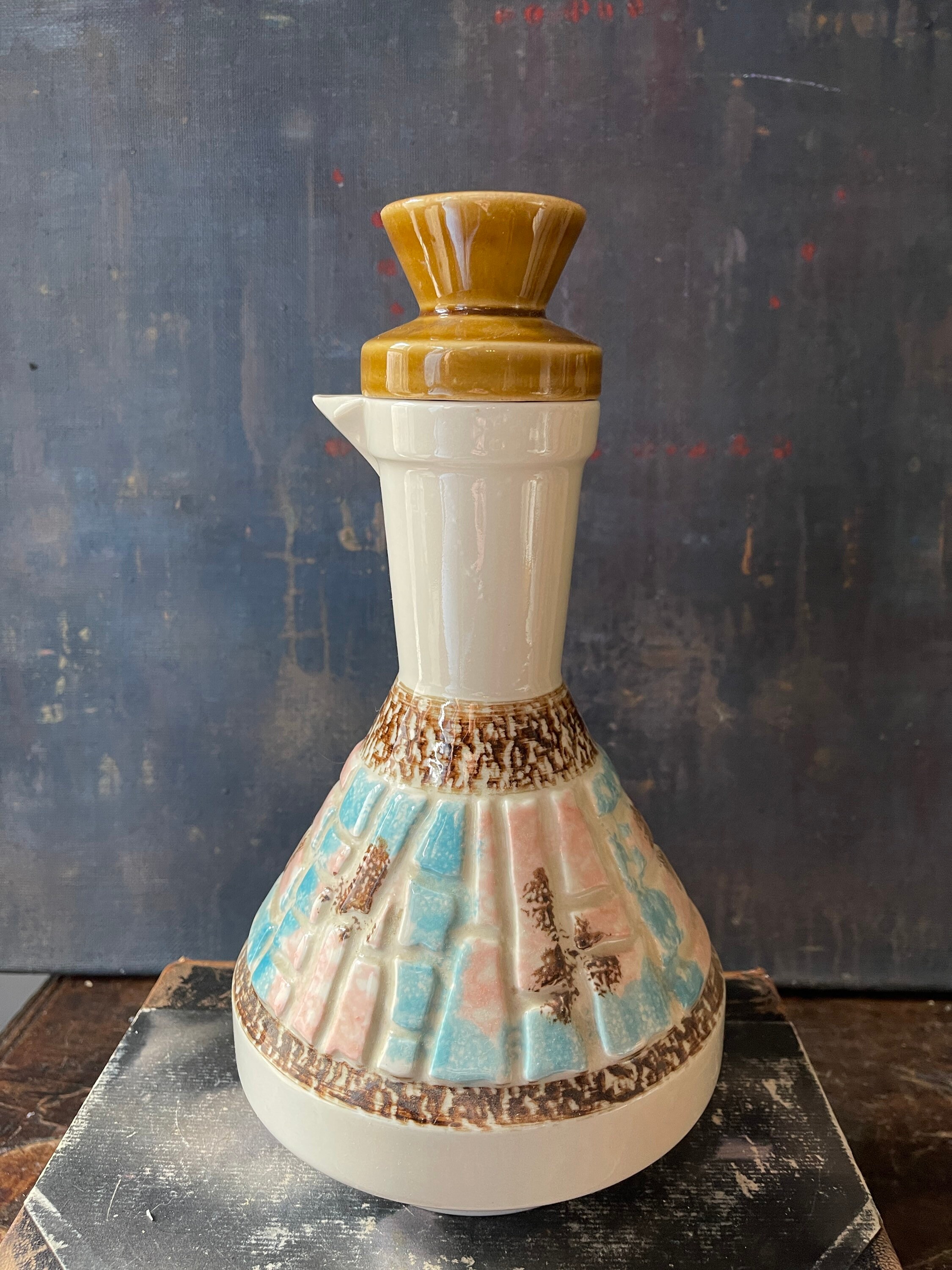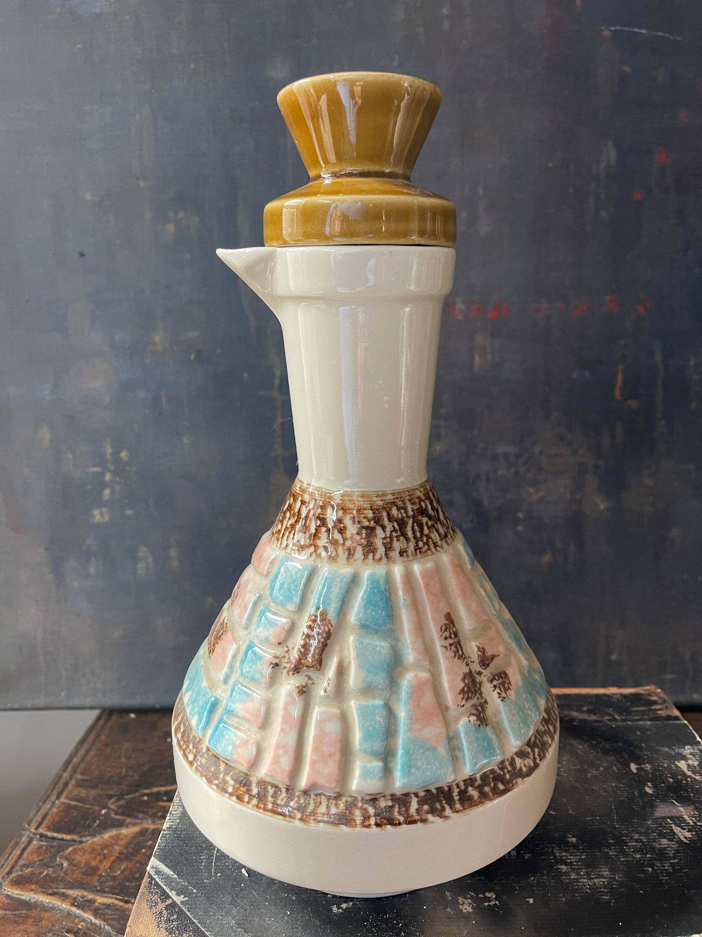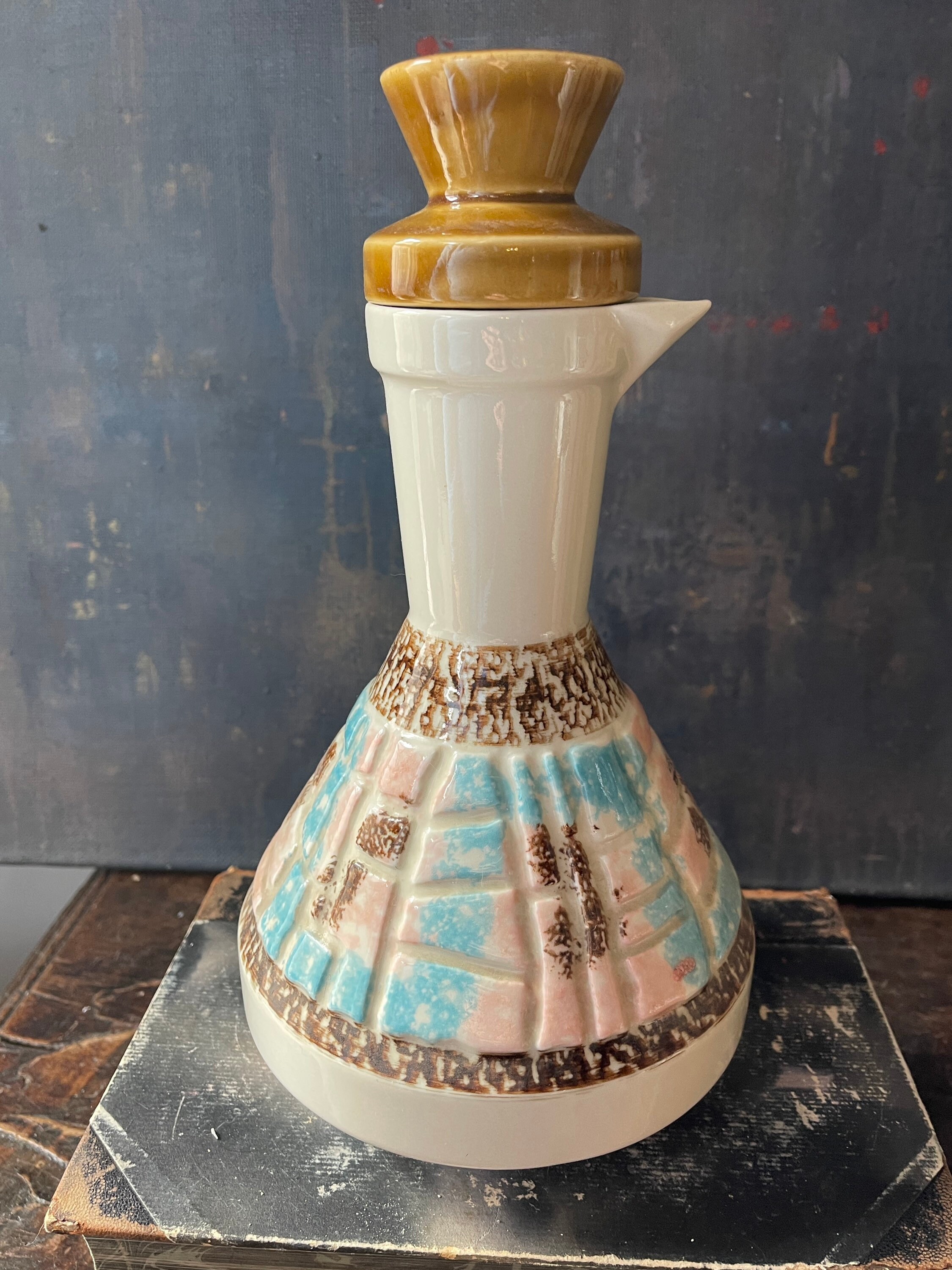 Wonderful, mid century, modern ceramic decanter, presented in a creamy angular bass that is white at the bottom and narrows to a slender neck and spout sitting atop the spout, is a lid with a thick cork. The base is a pale, pedal, pink, sky, blue and chocolate brown with a raised abstract relief around the side. The the colors are applied in a batter or sponge like technique. I however, decanter is signed and dated C. Miller, 1957 made in USA on the bottom. The fabulous piece to display where do use today.