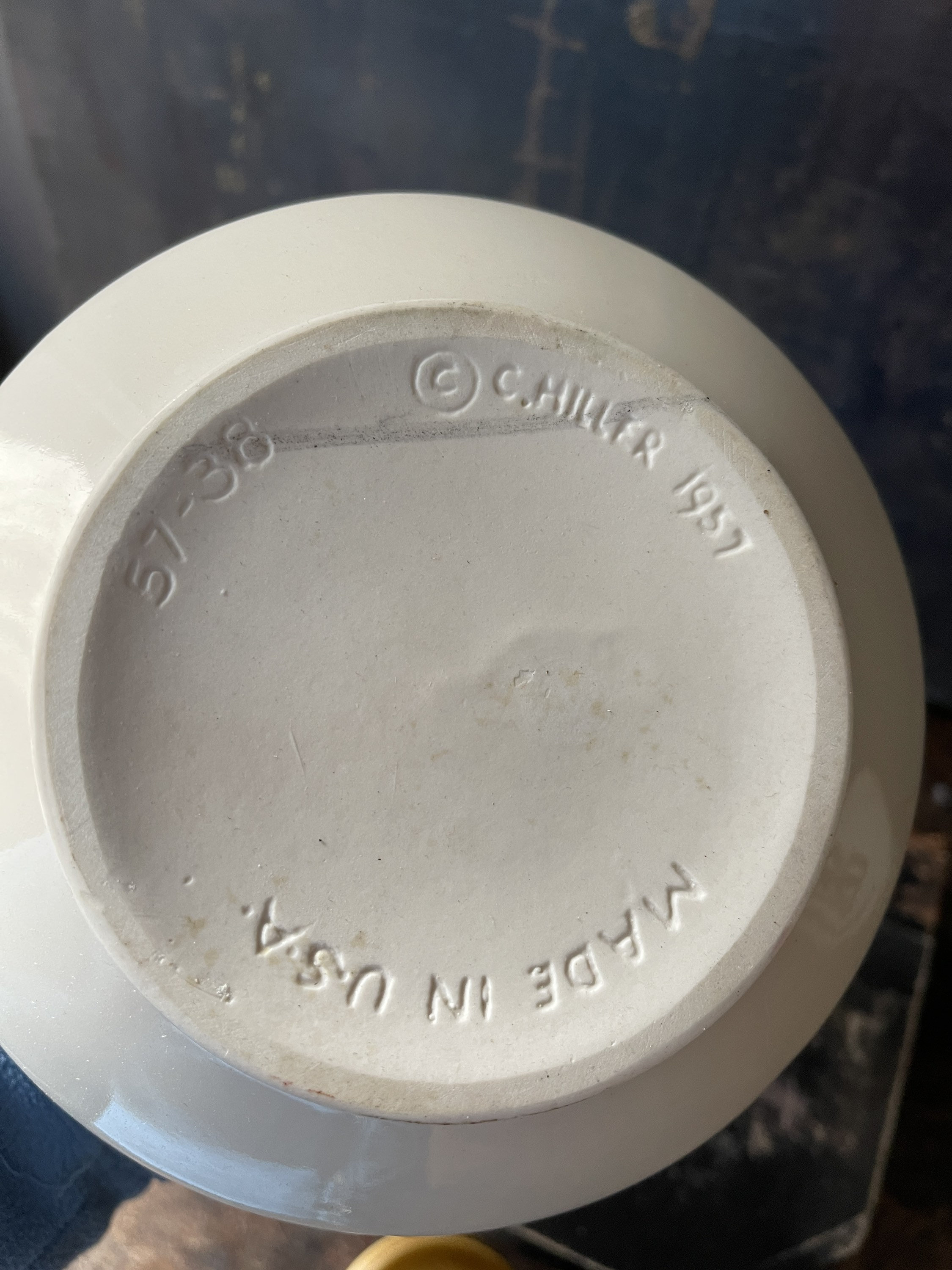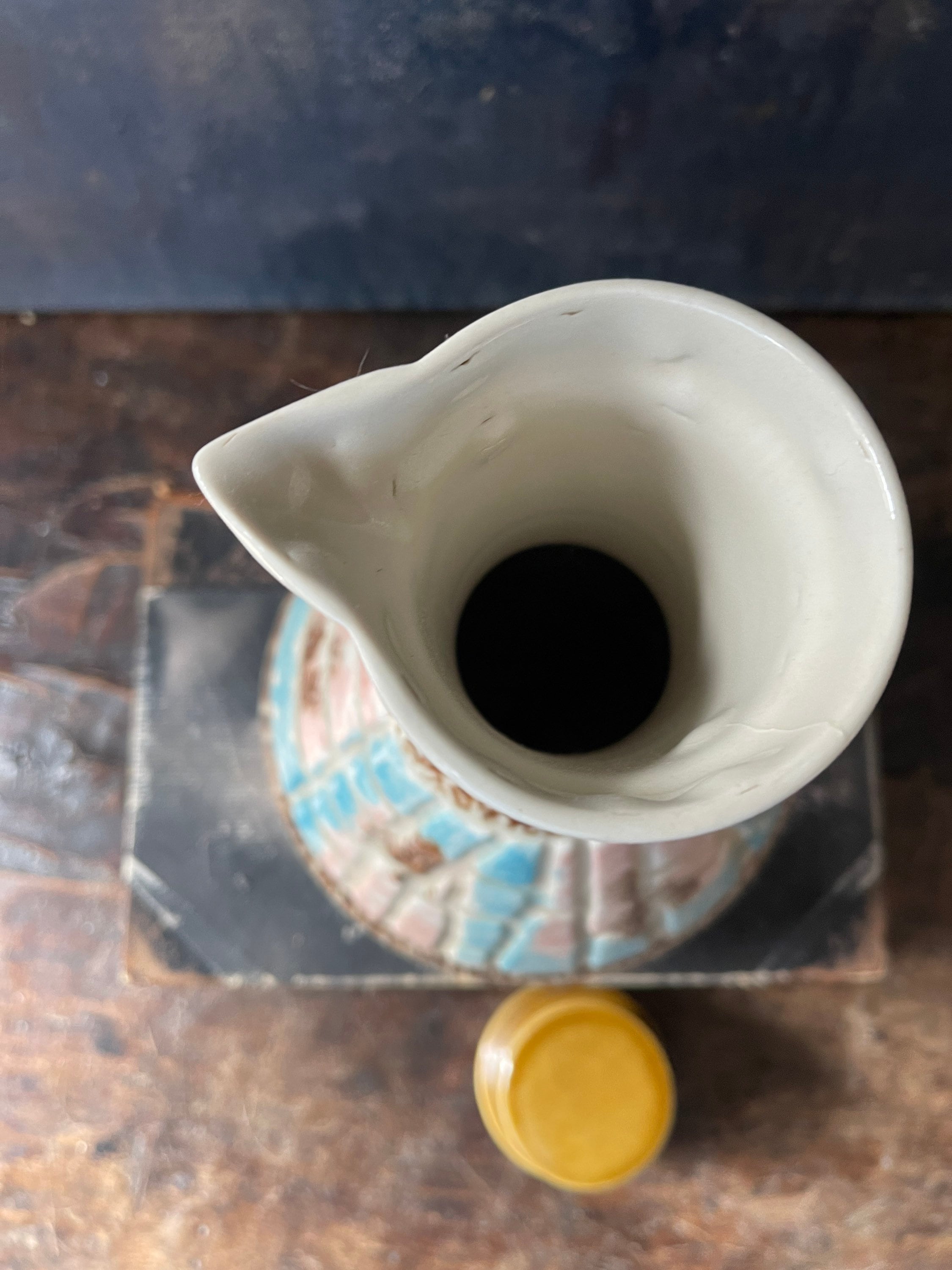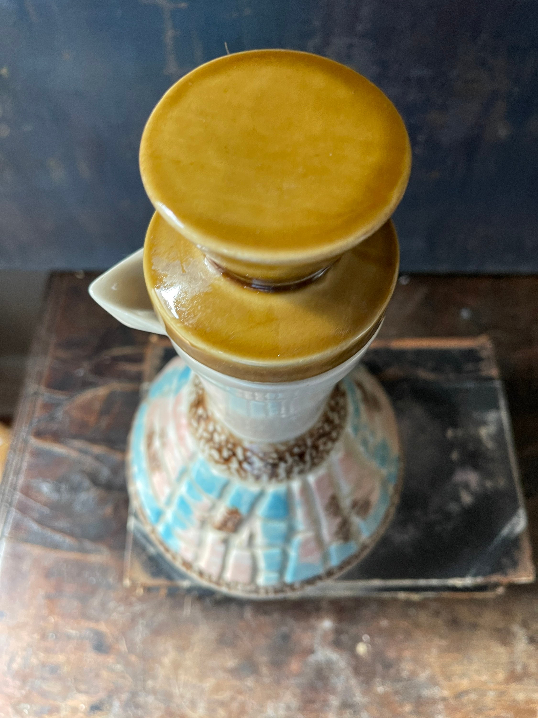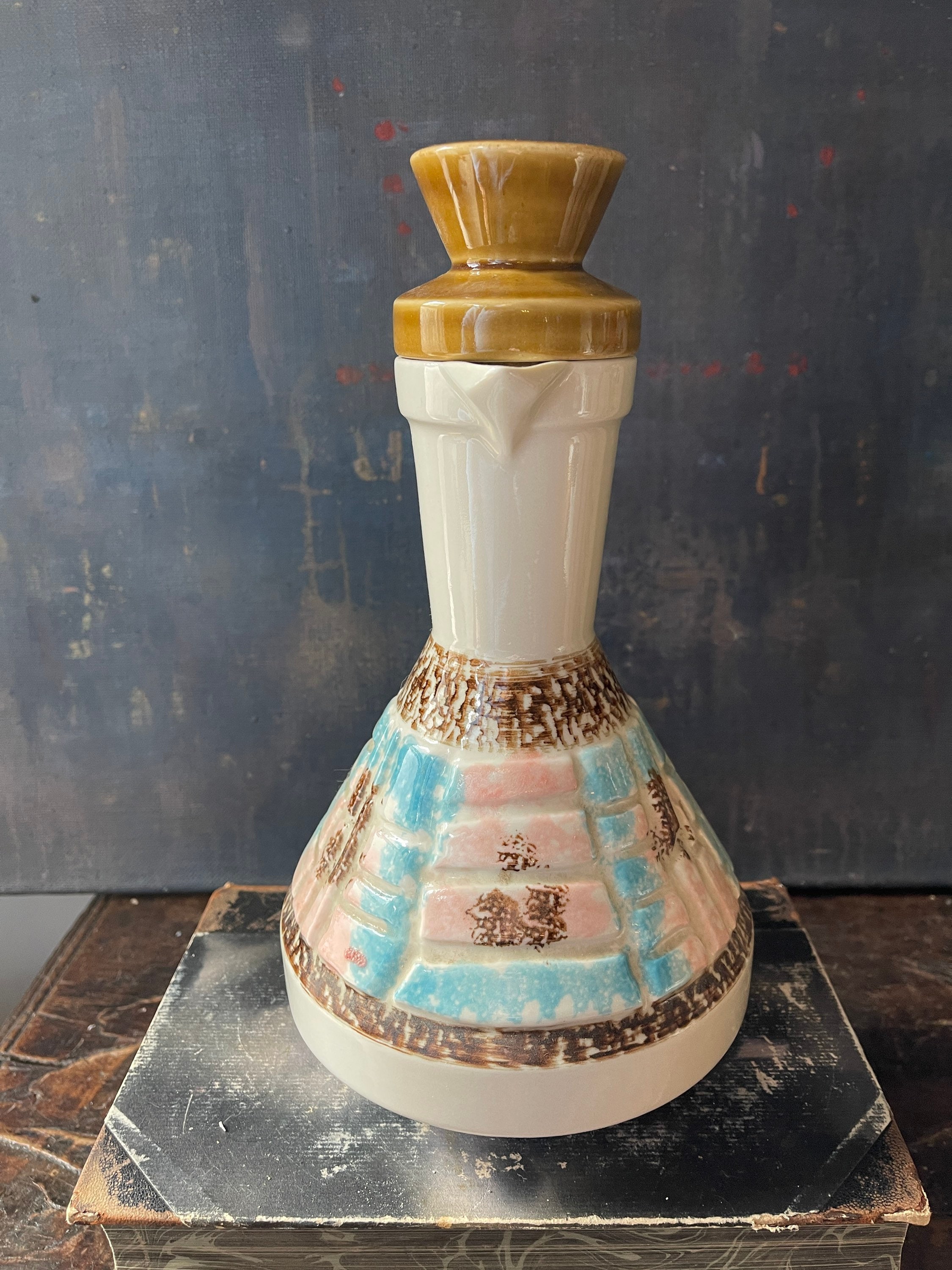 Wonderful, mid century, modern ceramic decanter, presented in a creamy angular bass that is white at the bottom and narrows to a slender neck and spout sitting atop the spout, is a lid with a thick cork. The base is a pale, pedal, pink, sky, blue and chocolate brown with a raised abstract relief around the side. The the colors are applied in a batter or sponge like technique. I however, decanter is signed and dated C. Miller, 1957 made in USA on the bottom. The fabulous piece to display where do use today.