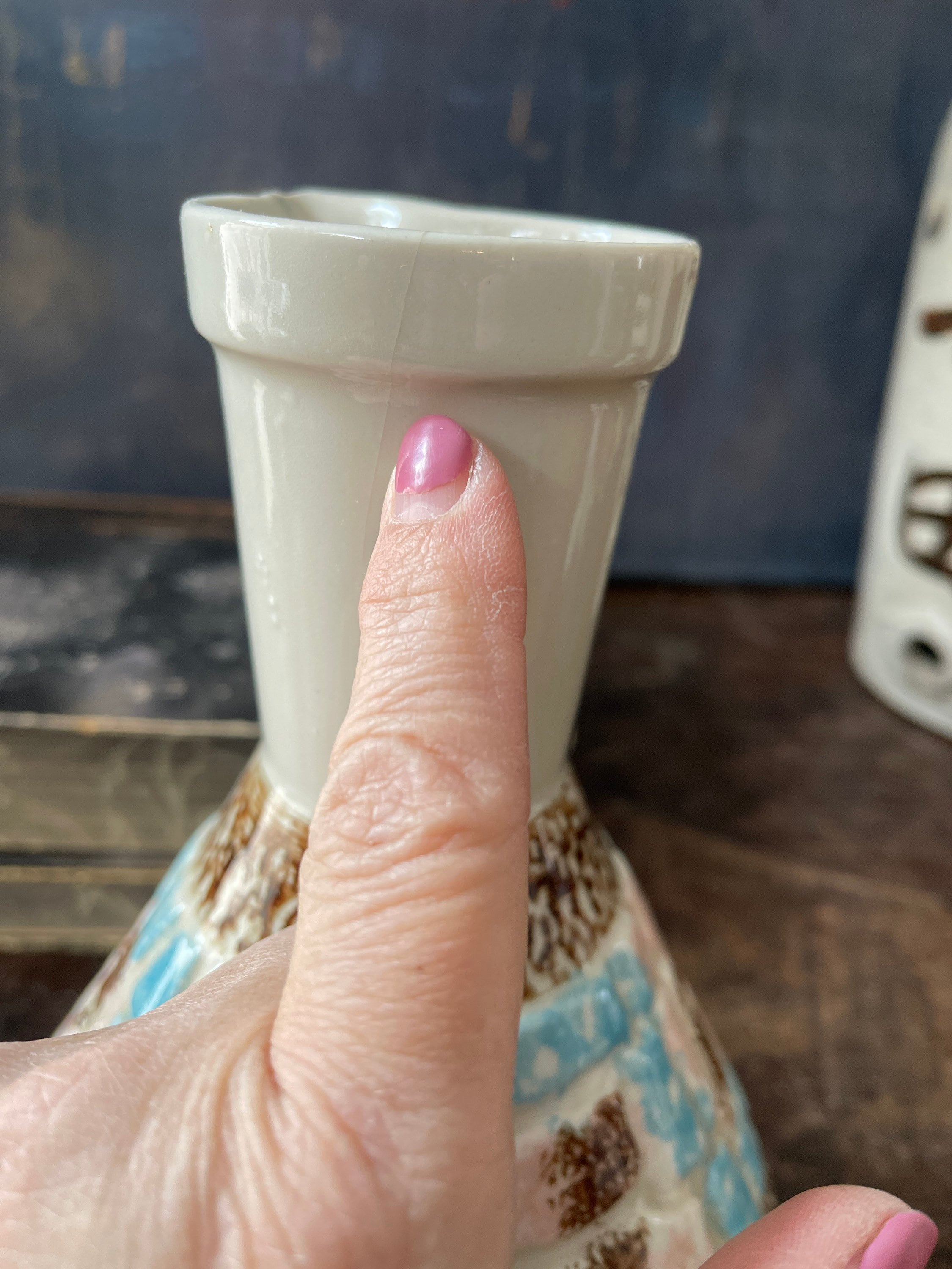 Nice condition overall, minor crazing around the neck and some Kim cracks along inside. One crazing appears to be a hairline fissure . It is stable however, we want you to know about it. We have priced it accordingly and pictures are provided for you.