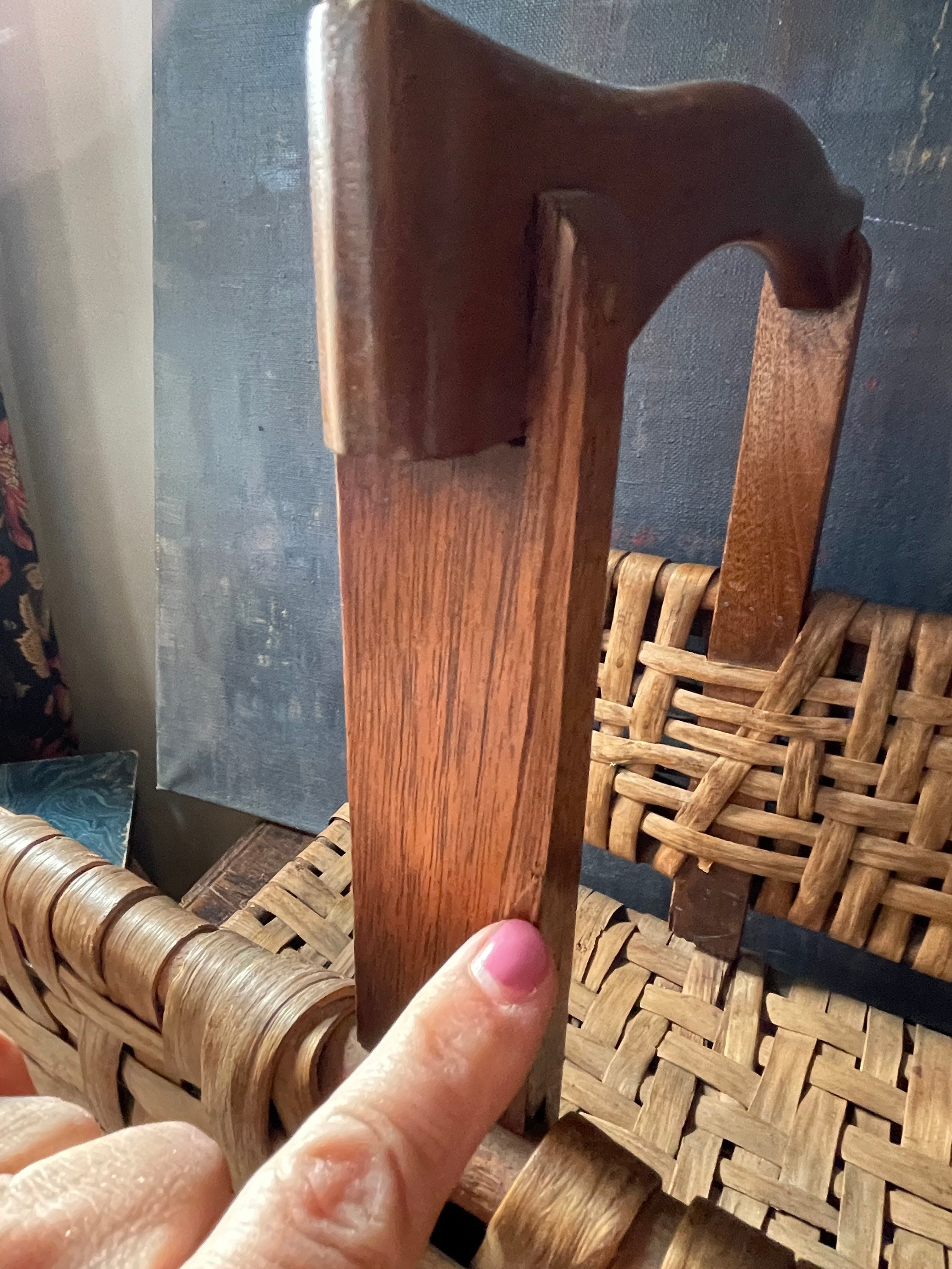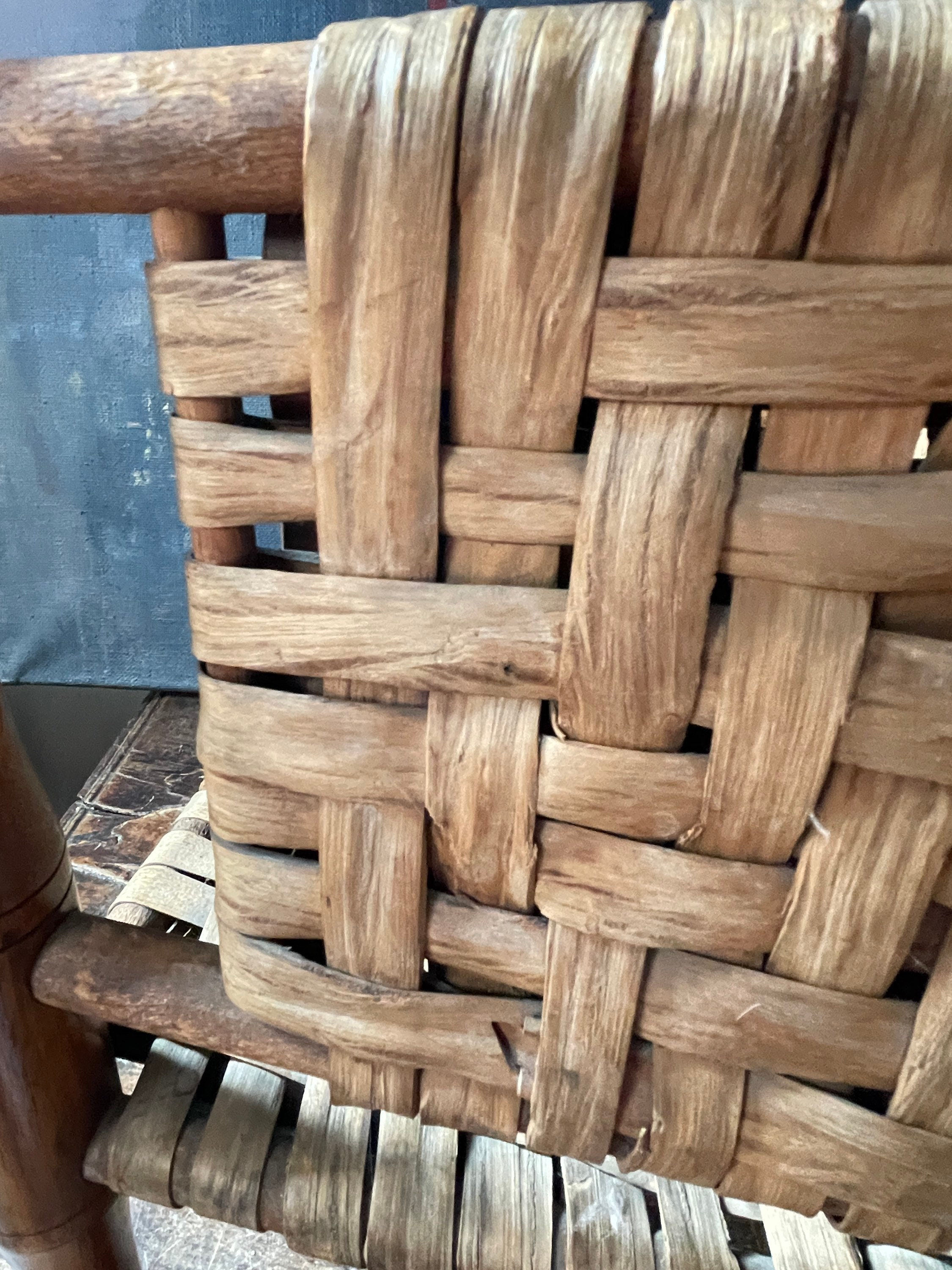 Wonderfully charming woven magazine rack, we believe the wood is walnut with strips of splint wood woven on sides and bottom to hold magazines or blankets. Pretty piece, with warm patina, for your cottage or cabin decor!