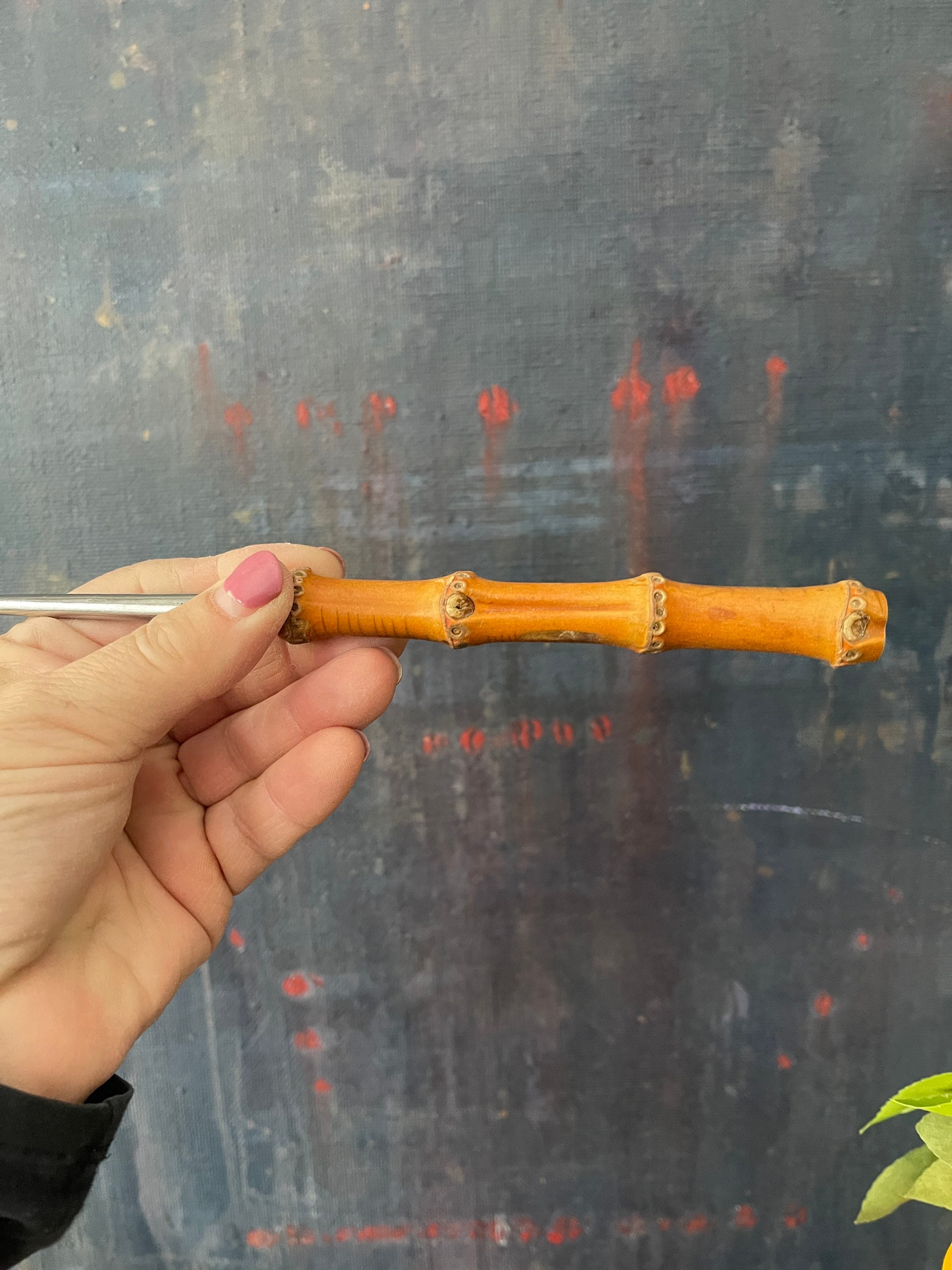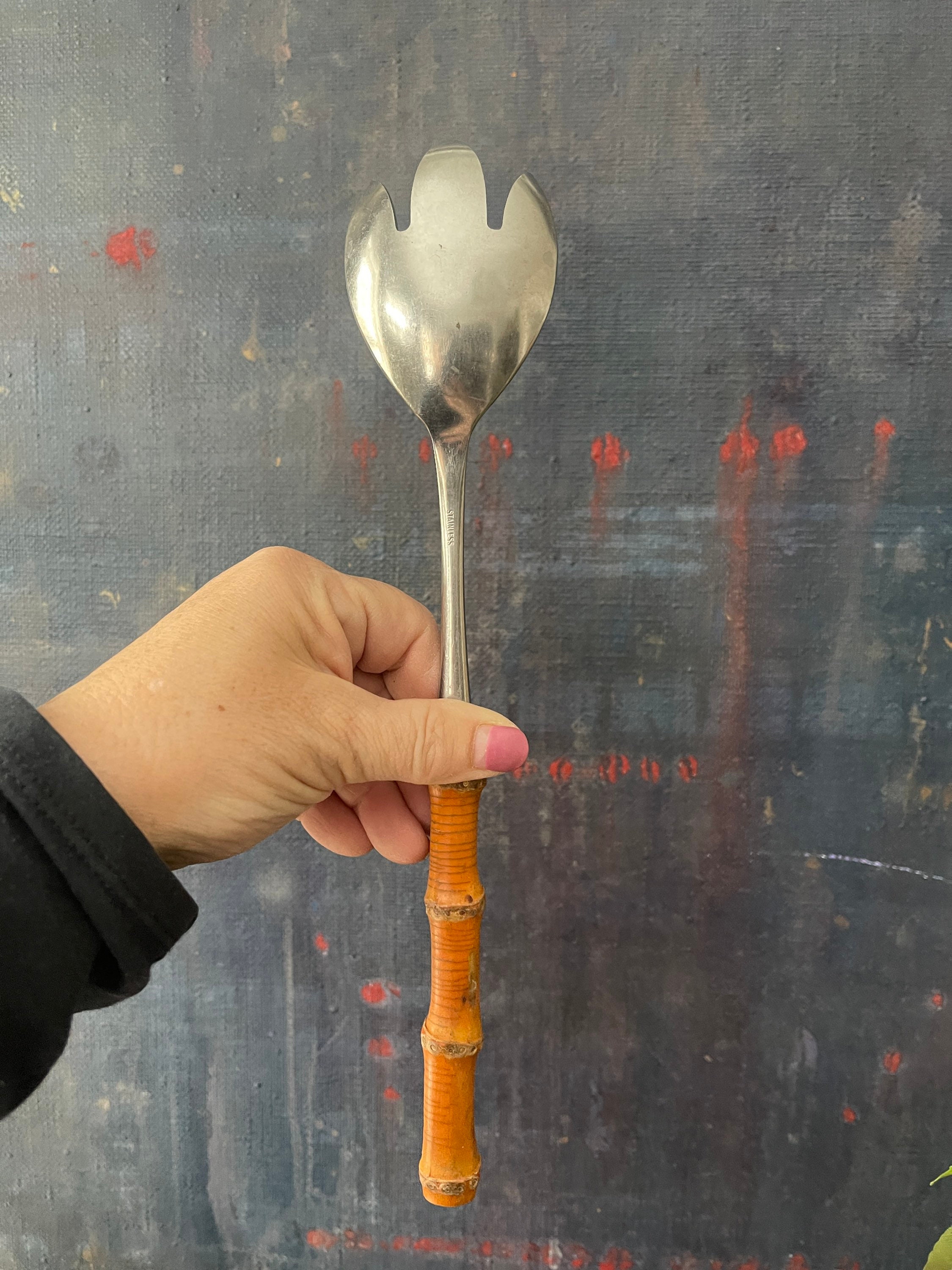 Lovely vintage bamboo handled, serving fork, perfect for bowls of pasta or other side dishes, easily used today. Bamboo handle has a nice aged patina that is warm and mellow, and the utensil is marked stainless steel. Brings a nice coastal or grand Millennial vibe to your decor.