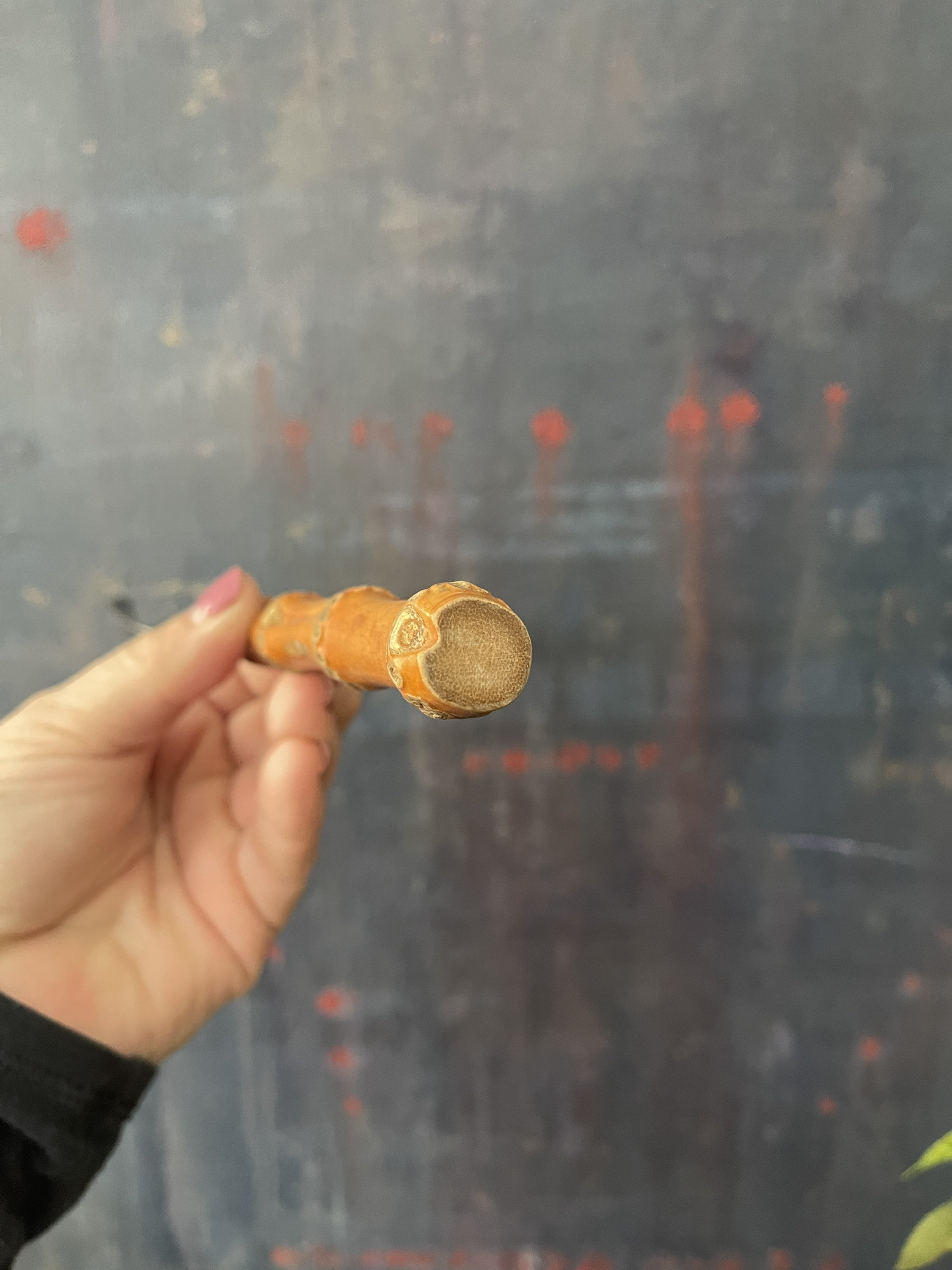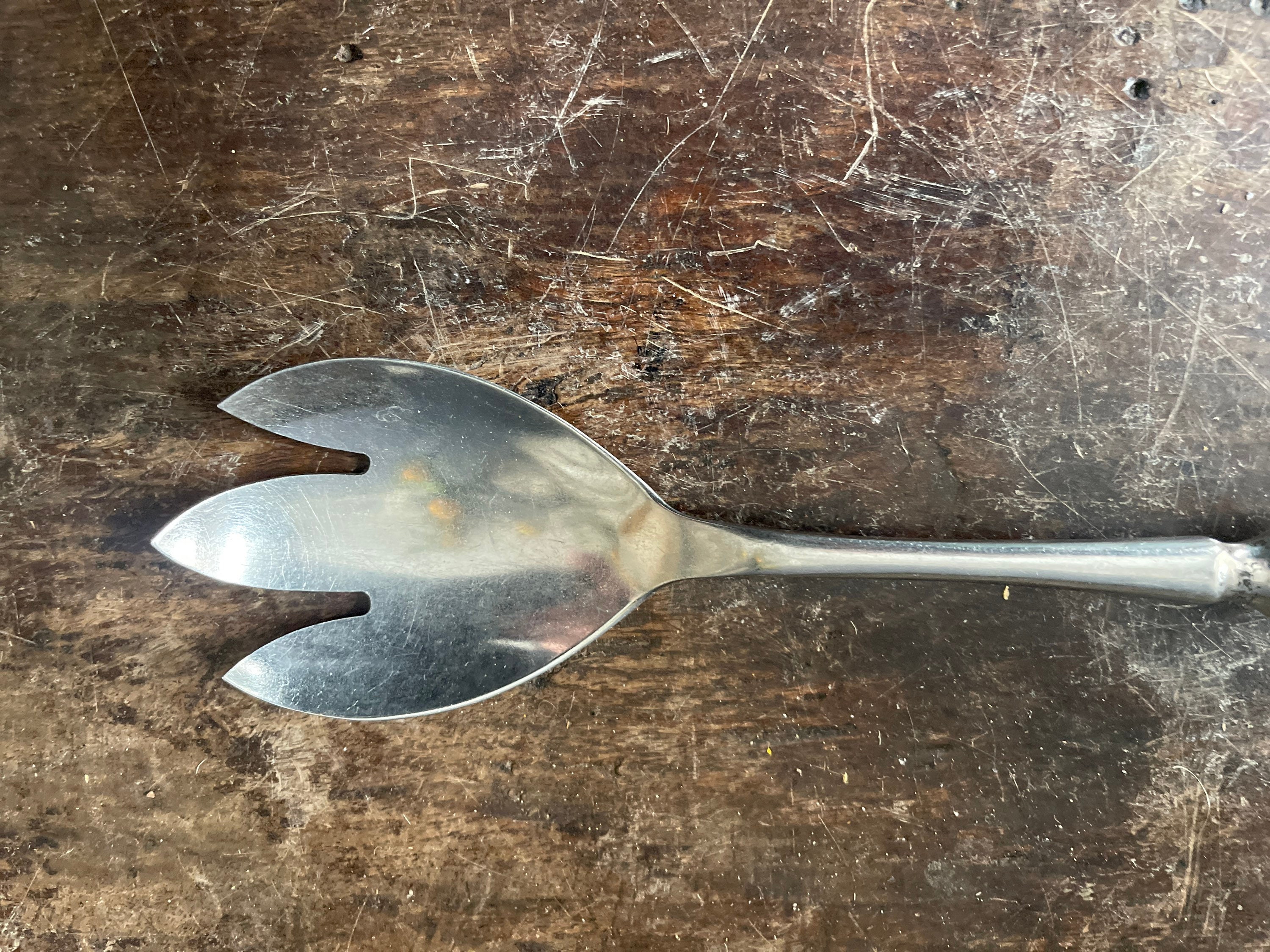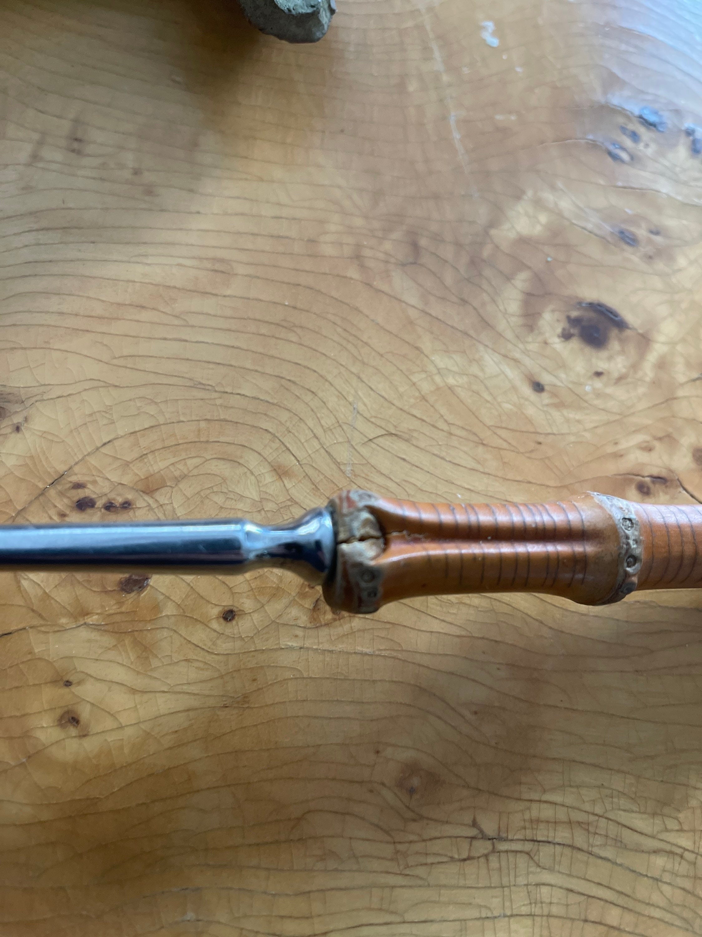 Stainless has some utensil marks appropriate to age and use, bamboo has worn edges and a darkened patina from use. There is a small split where it attaches to the utensil but it is stable and may be naturally occurring. We attached a photo for you.