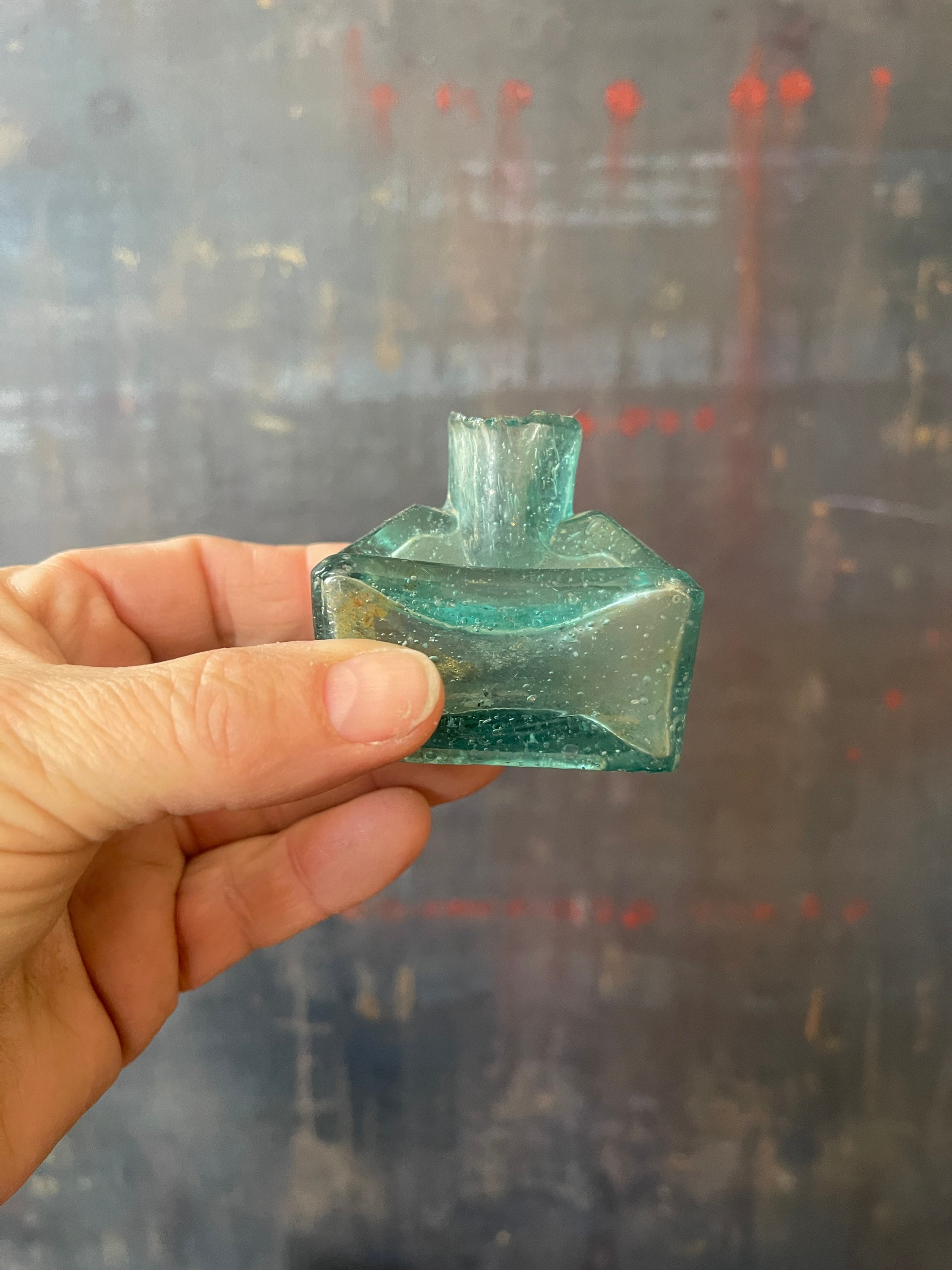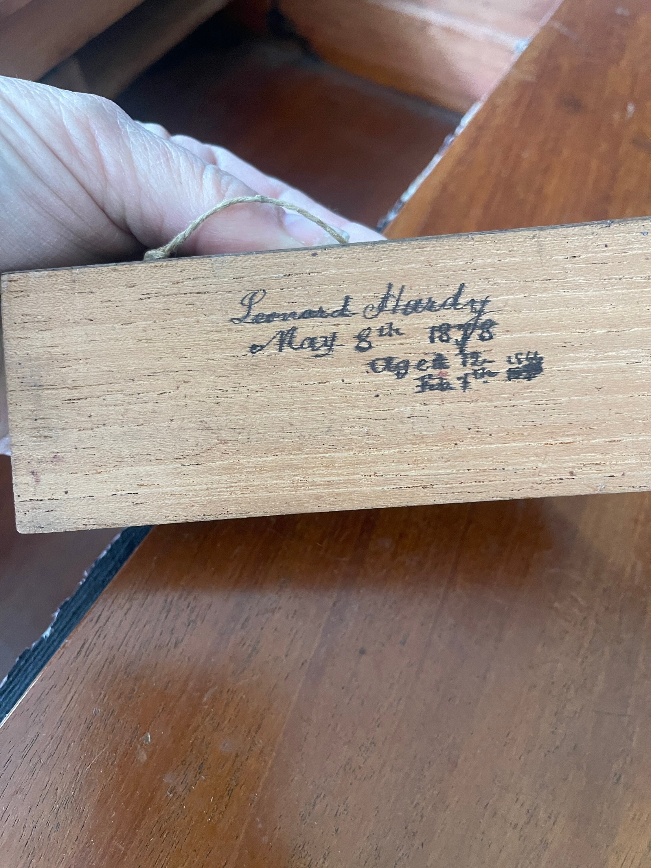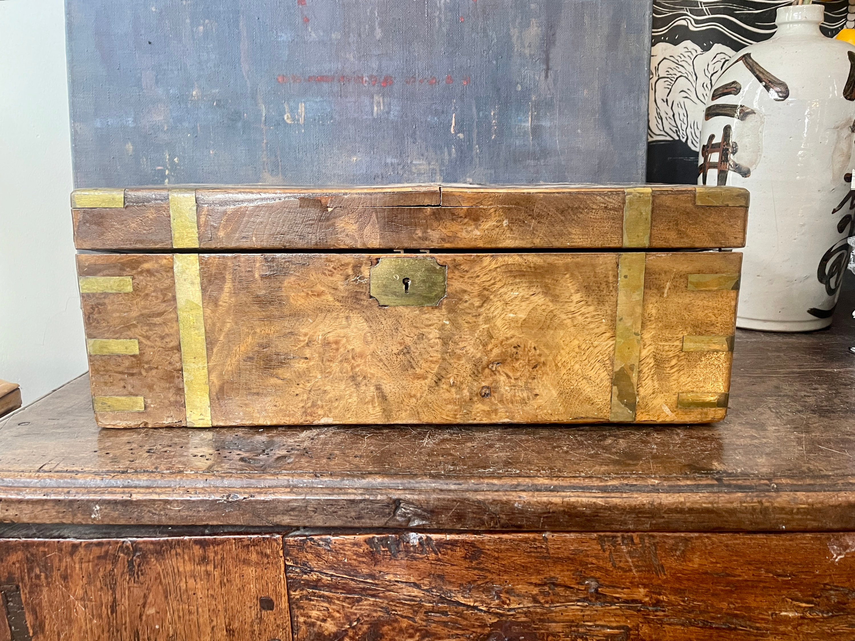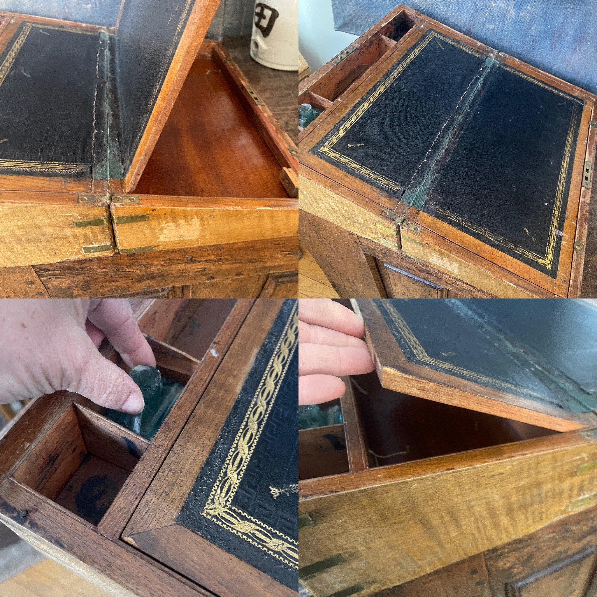 Stunning 1860s English lap desk, presented in Burlewood with brass accents. The the rectangular box opens to a sloped writing box. Once open, there is a leather writing surface with storage compartments at the top of the slope. In one storage compartment and glass inkwell remains. We did not know if it’s original, but it was found with the box and we are keeping it that way. each half of the sloped writing surface lifts to reveal storage compartment. The top leather section opens to reveal three tiny drawers with cotton thread pulls. One of the tiny drawers has the name of a man and two dates, 1866 and 1878
