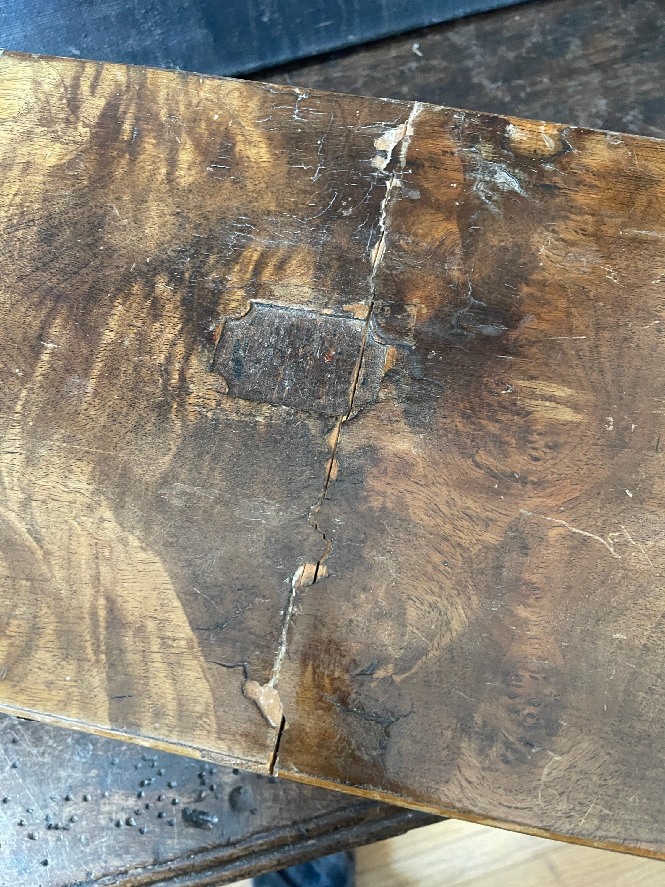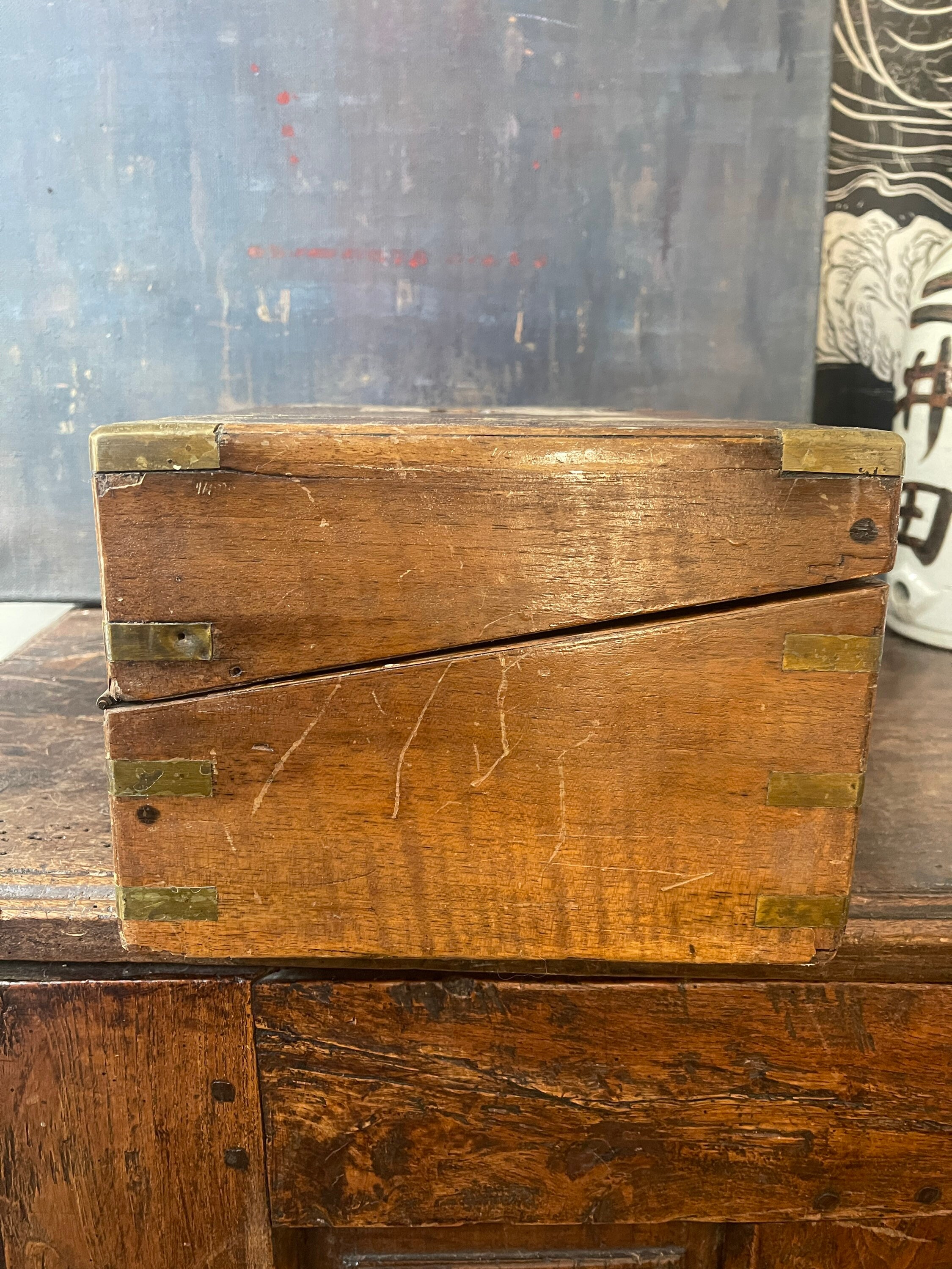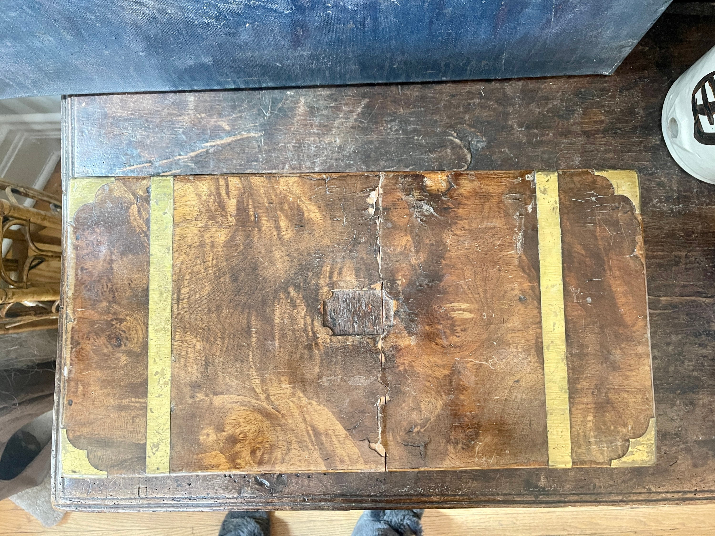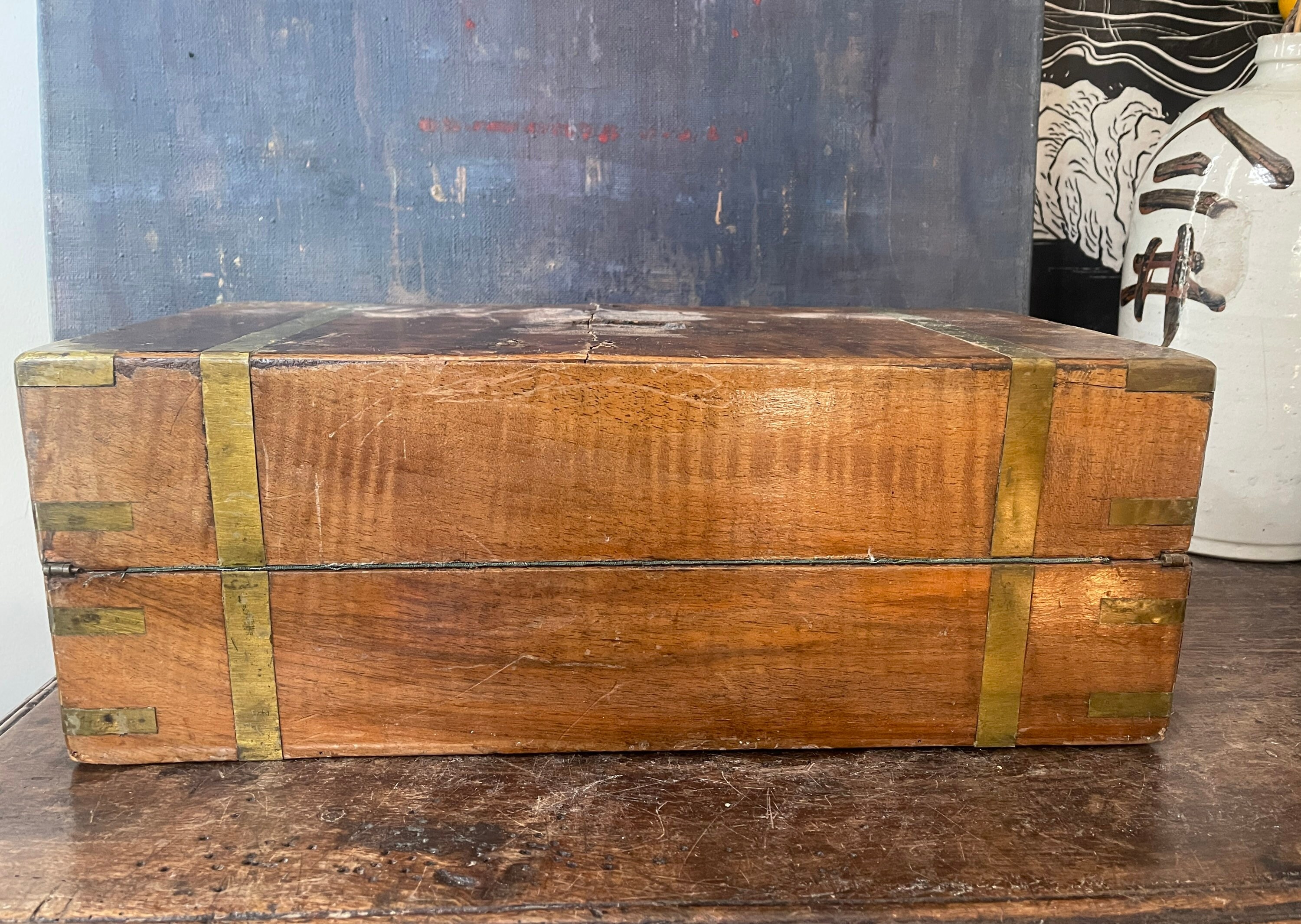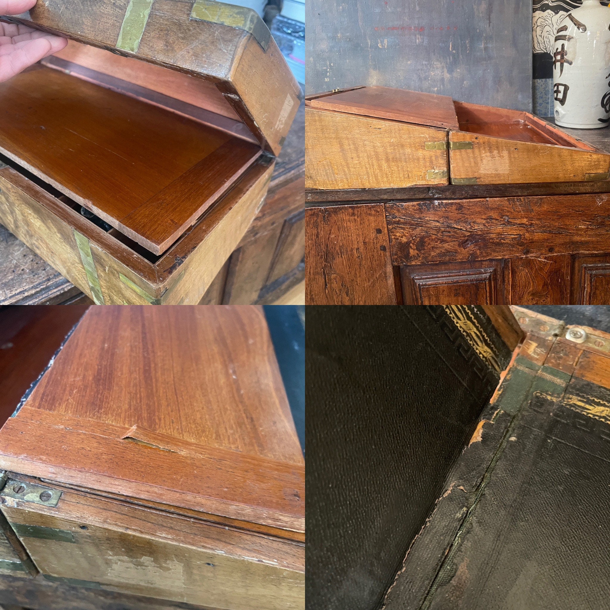 The box is solid, and it does show wear on the exterior There are visible scuffs with some cracking to the lid. There likely was a brass plate with the owners initials on it. That is no longer present on the top. There is no key. There is some chipping to the veneer on the top, and the brass accents are scratched with loss of brass surface. There is veneer that is loose on the side with scratches to the side. On the inside there is where around the edge , and where to the leather. The top leather drawer is separating, only a small piece of leather still connects it and it is fragile. The inkwell has some chips around the top.