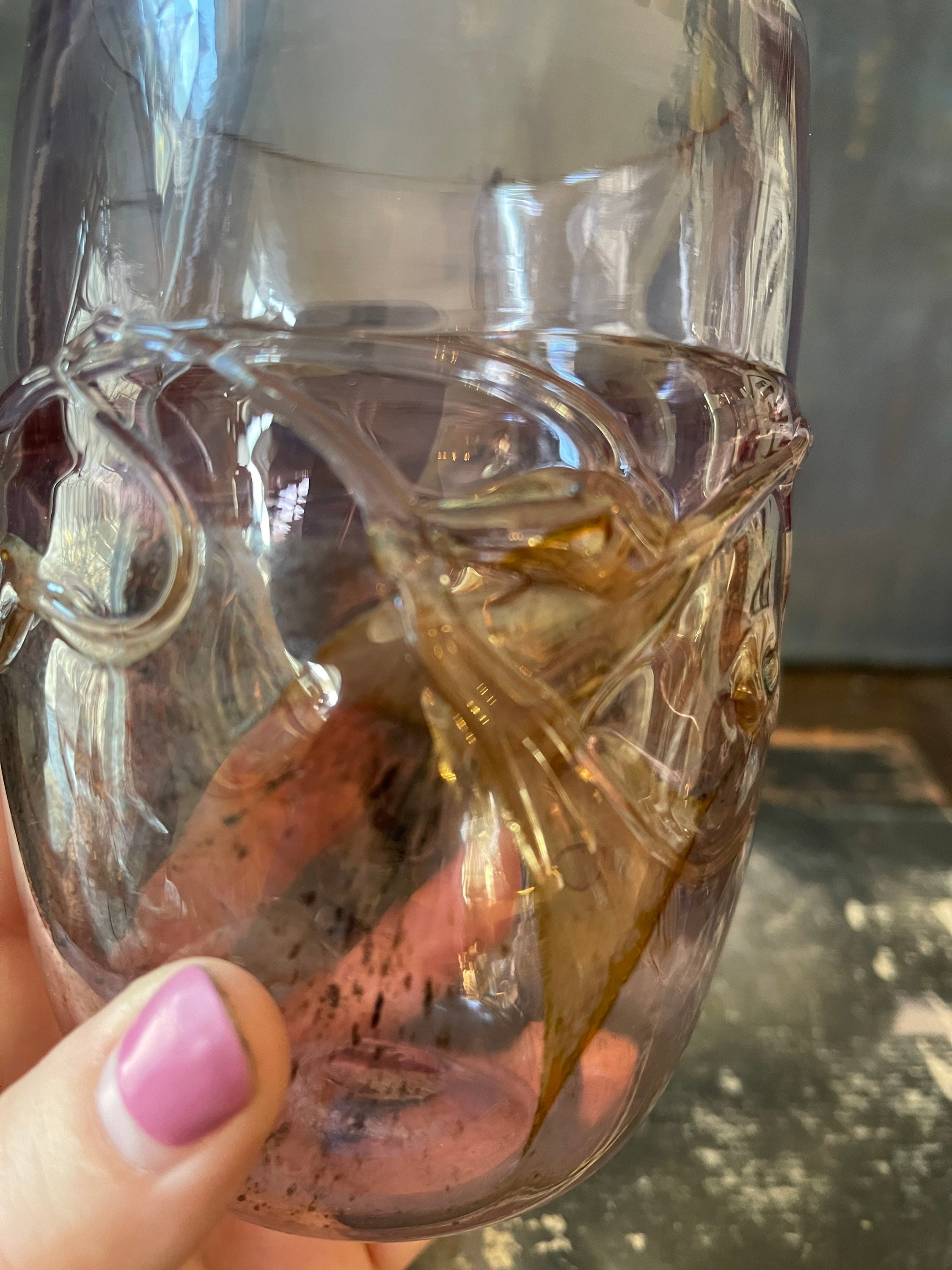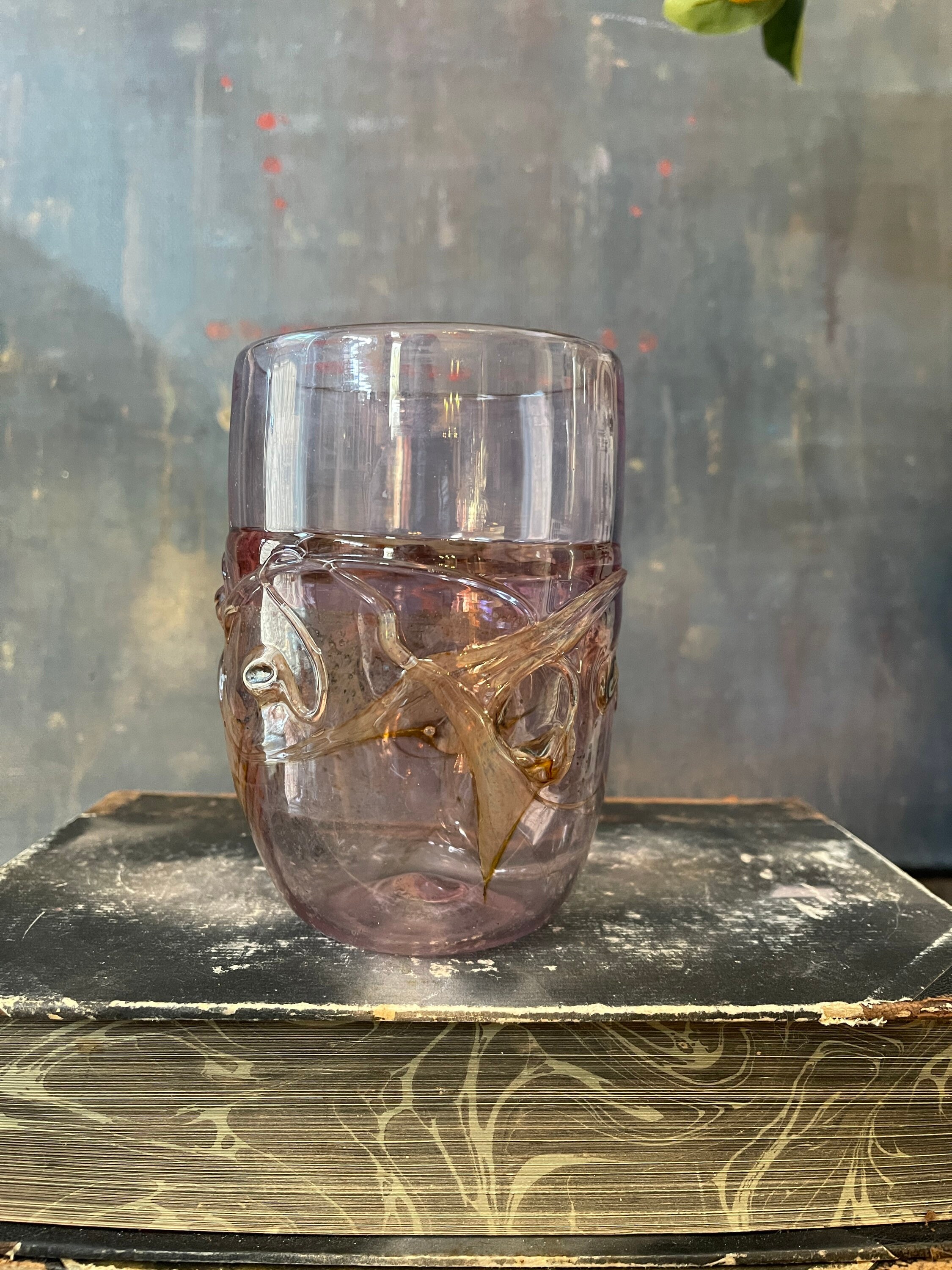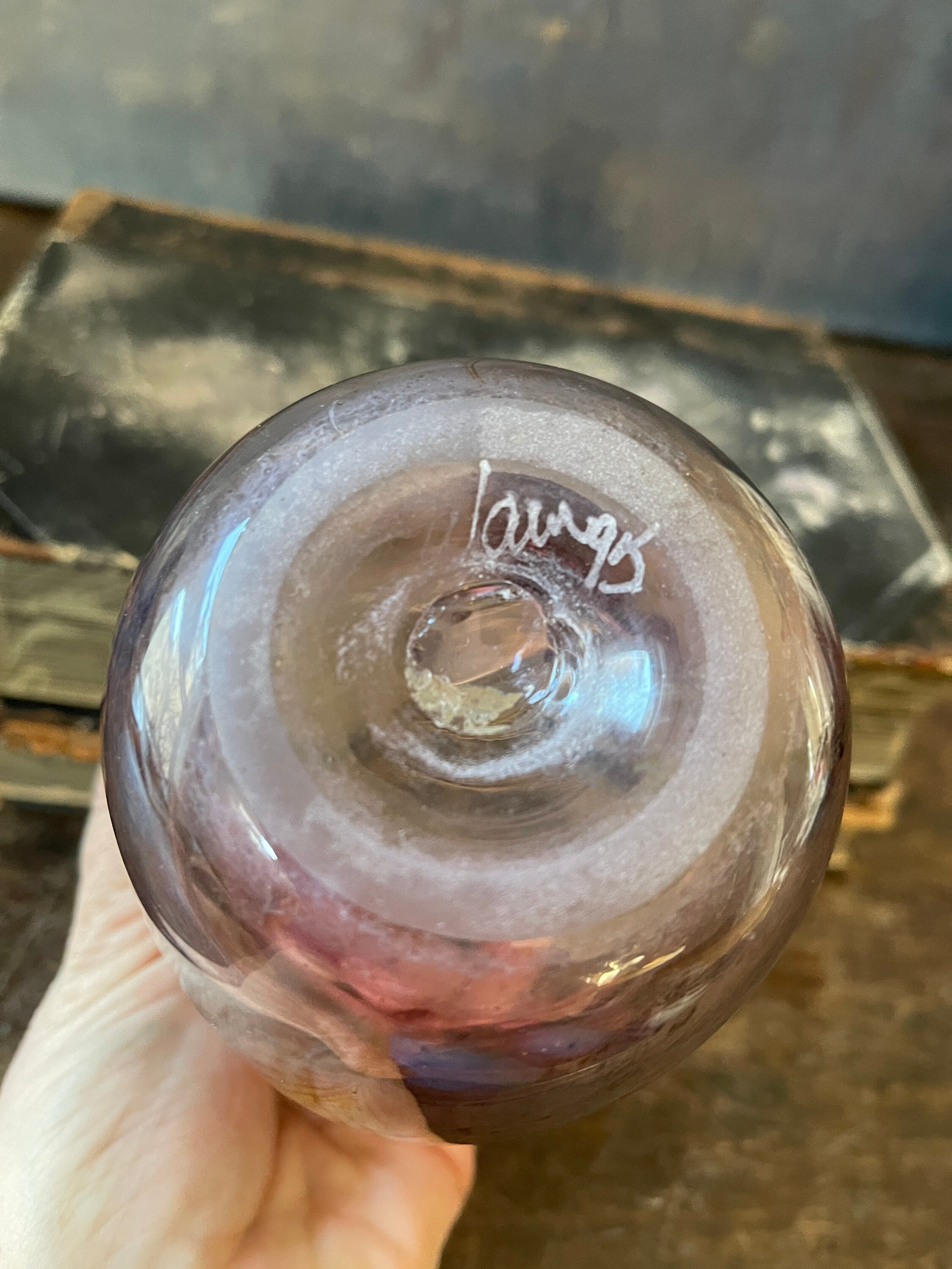 Gorgeous hand blown glass by Andrew Warren. Presented in soft, pink and lavender hues with a touch of gold throughout the sides. Swirls of applied hot glass around the sides add a level of texture and complexity to the peace. There is a touch of iridescence to that center design.