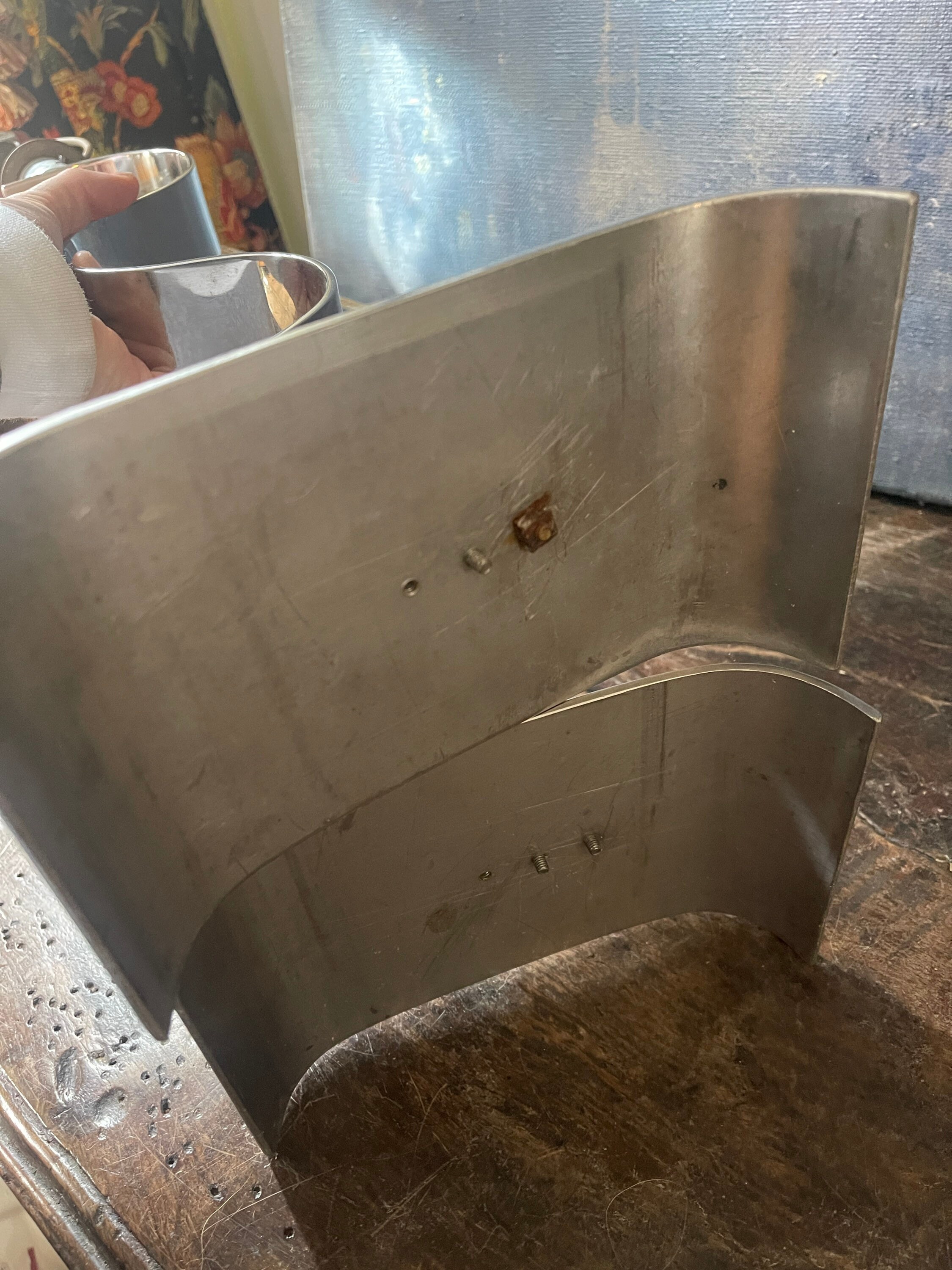 Chrome in nice condition, no rust. Minor surface abrasions appropriate to age. Chrome is a heavy chrome, a little sway in squiggle based upon design