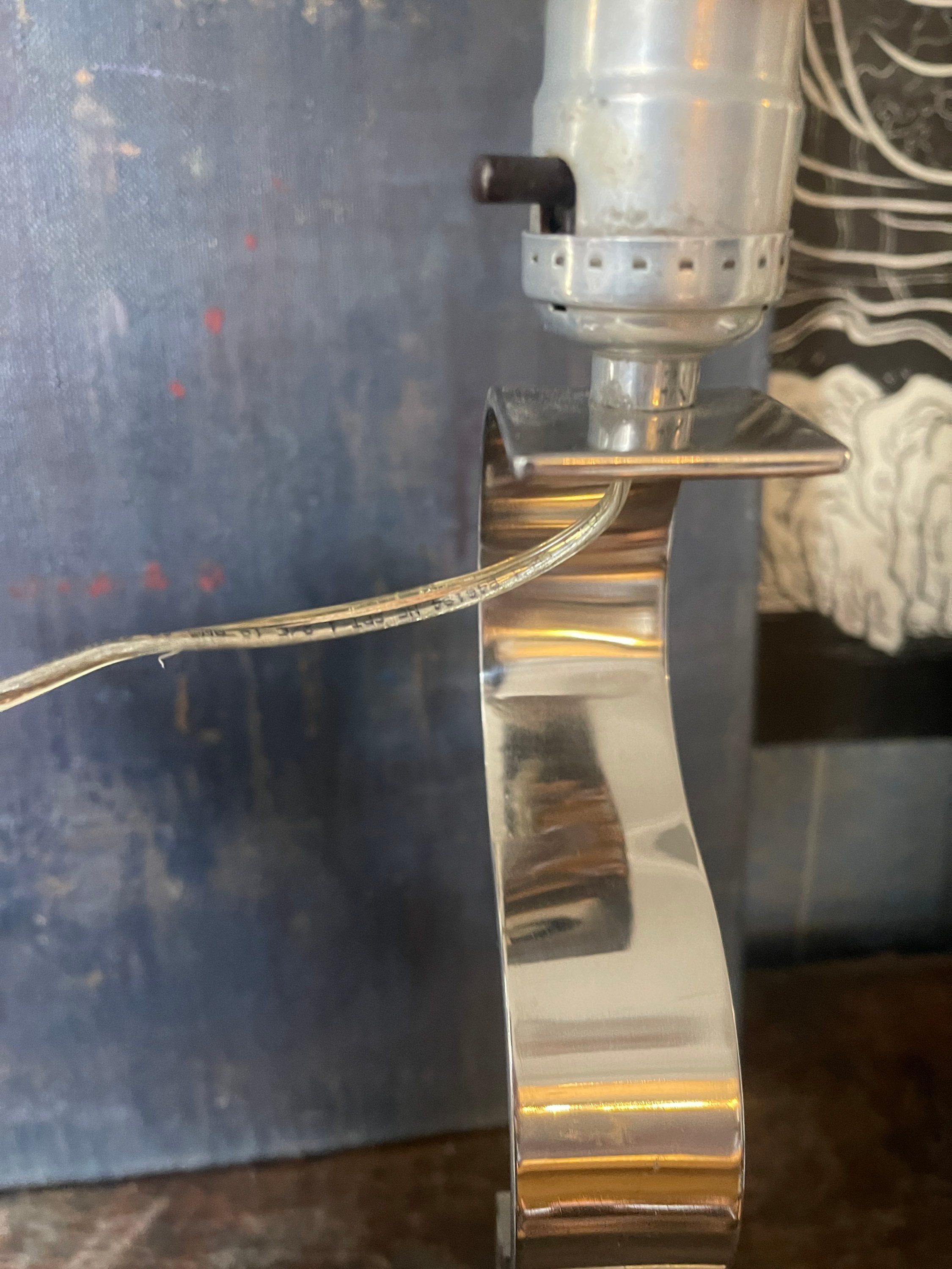 Resting on rectangular chrome bases that have a bit of lift , the chrome squiggles upward to the socket. Cord runs from socket. These lamps have the original finial, a square chrome finial. Fantastic mid century modern lamps that bring a very modern vibe!