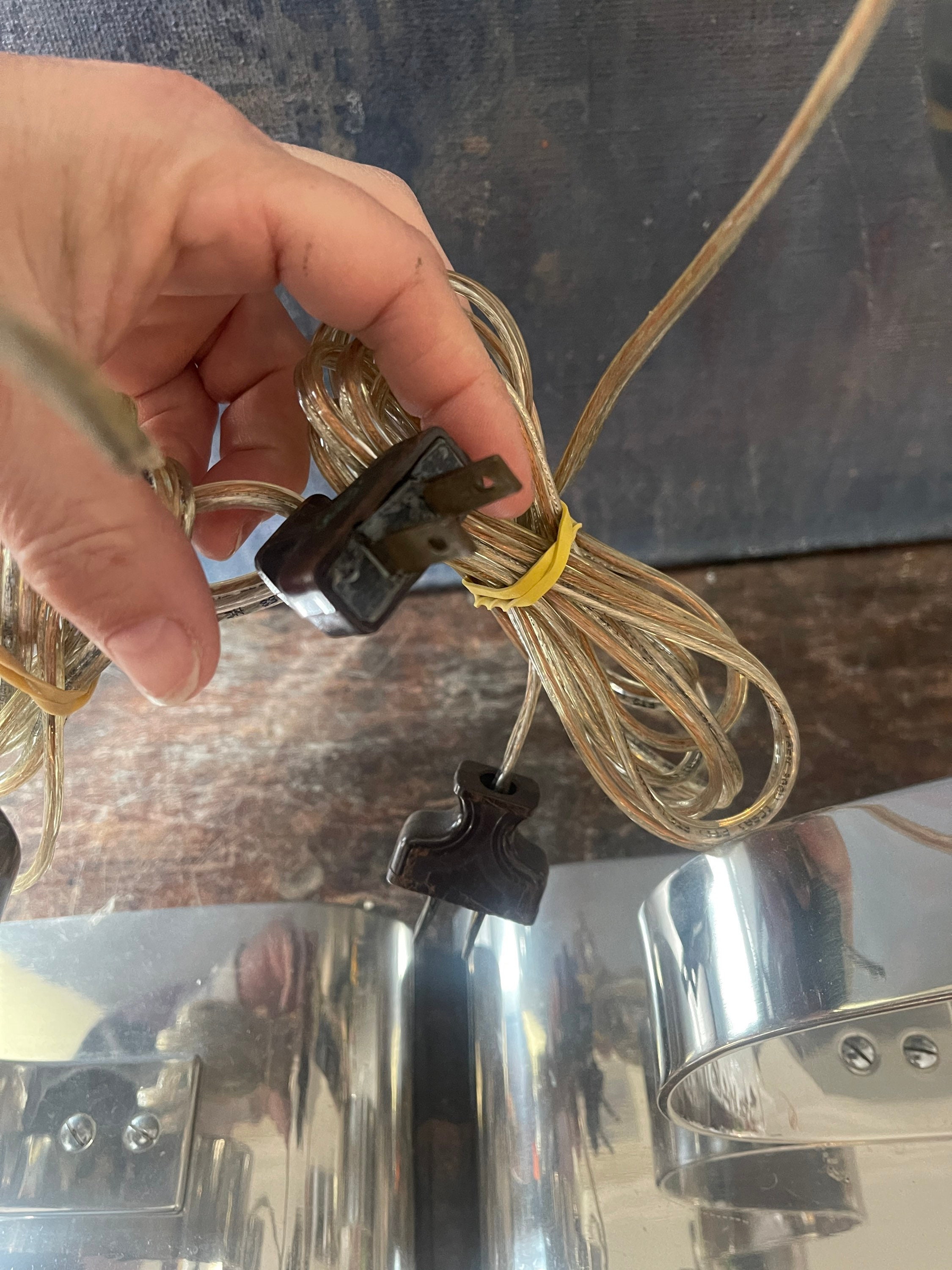 Cords have been replaced and are newer, plug is original plug, sockets appear to be original. Harp is screwed into socket and doesn’t seem to unscrew. Harp has oxidation.