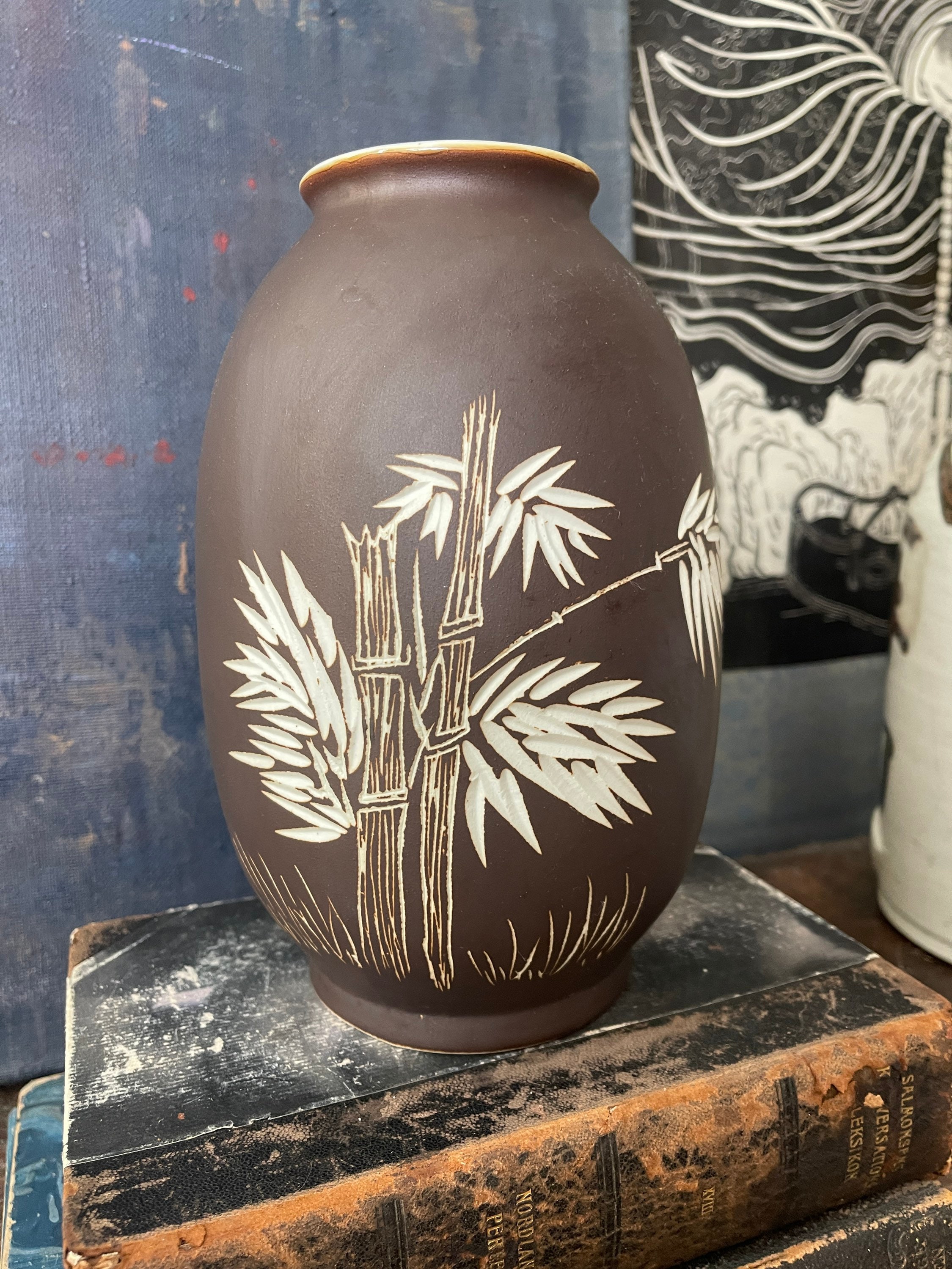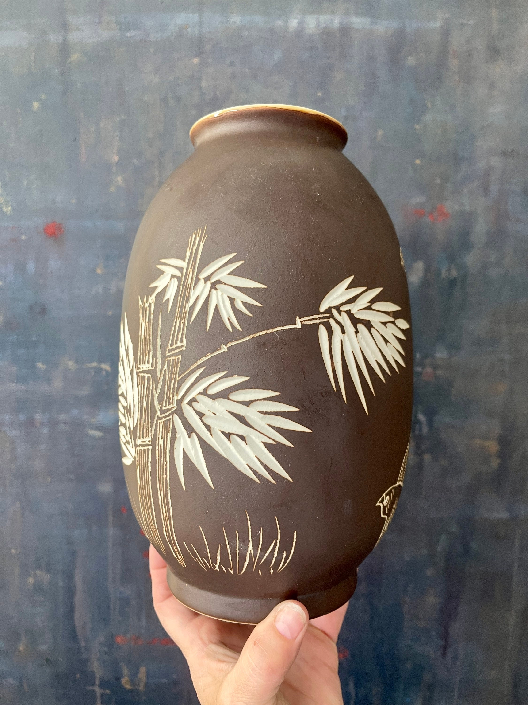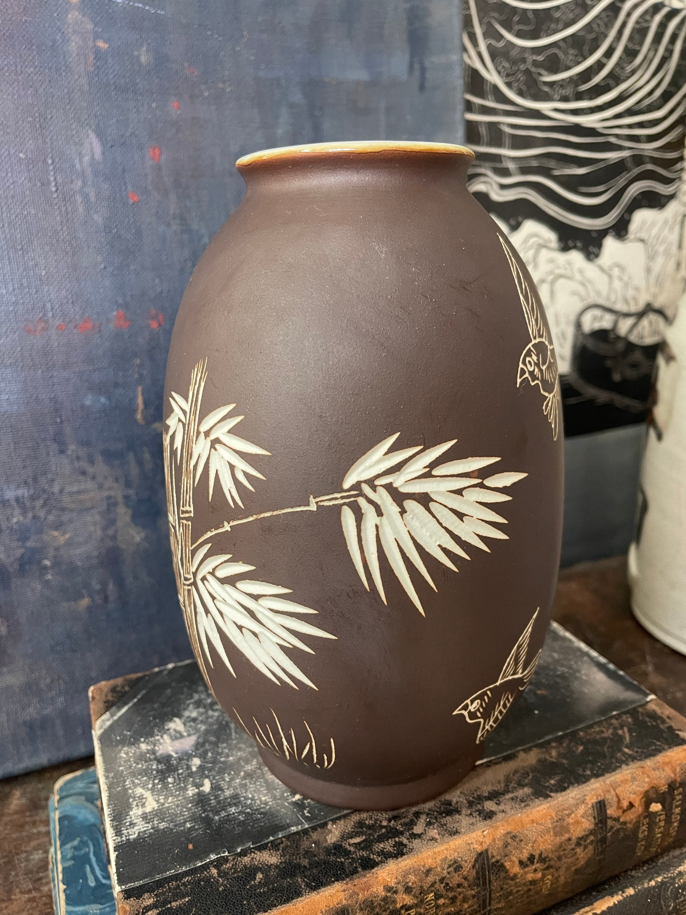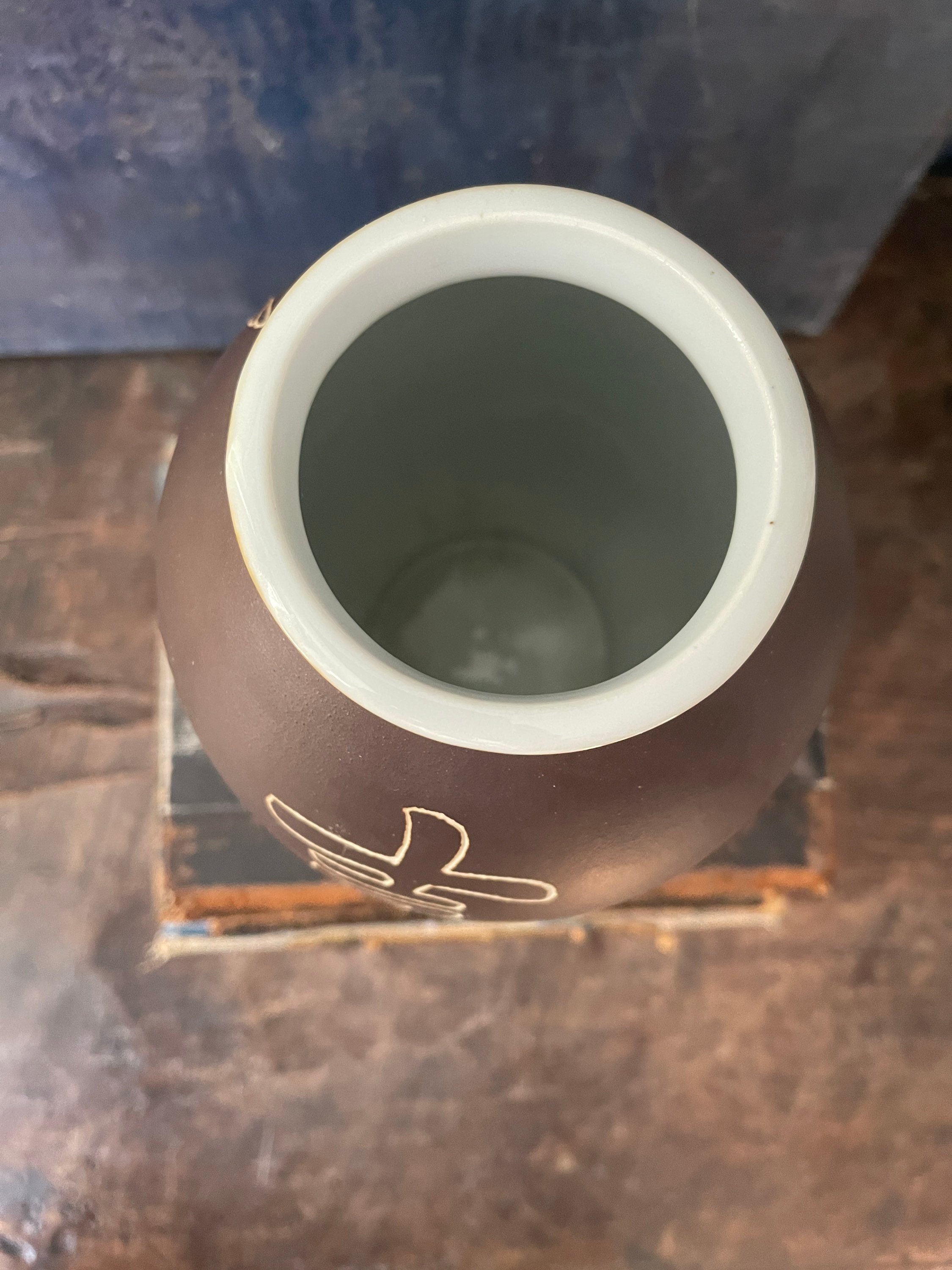 Very pretty Asian vase measuring 9.75 inches tall, it has a nice visual impact. Presented in a deep chocolate brown it depicts two birds flying around the stocks and leaves of a bamboo plant. On the back, two Chinese symbols appear vertically. The decoration has been carved into the clay vase, giving it a nice texture, and also revealing the creamy white of the clay below. The brown glaze has a smooth matte finish, the inside is a glossy creamy white glaze. So it should hold water if you were to use it as a vase. Pretty piece along a mantel or bookshelf!