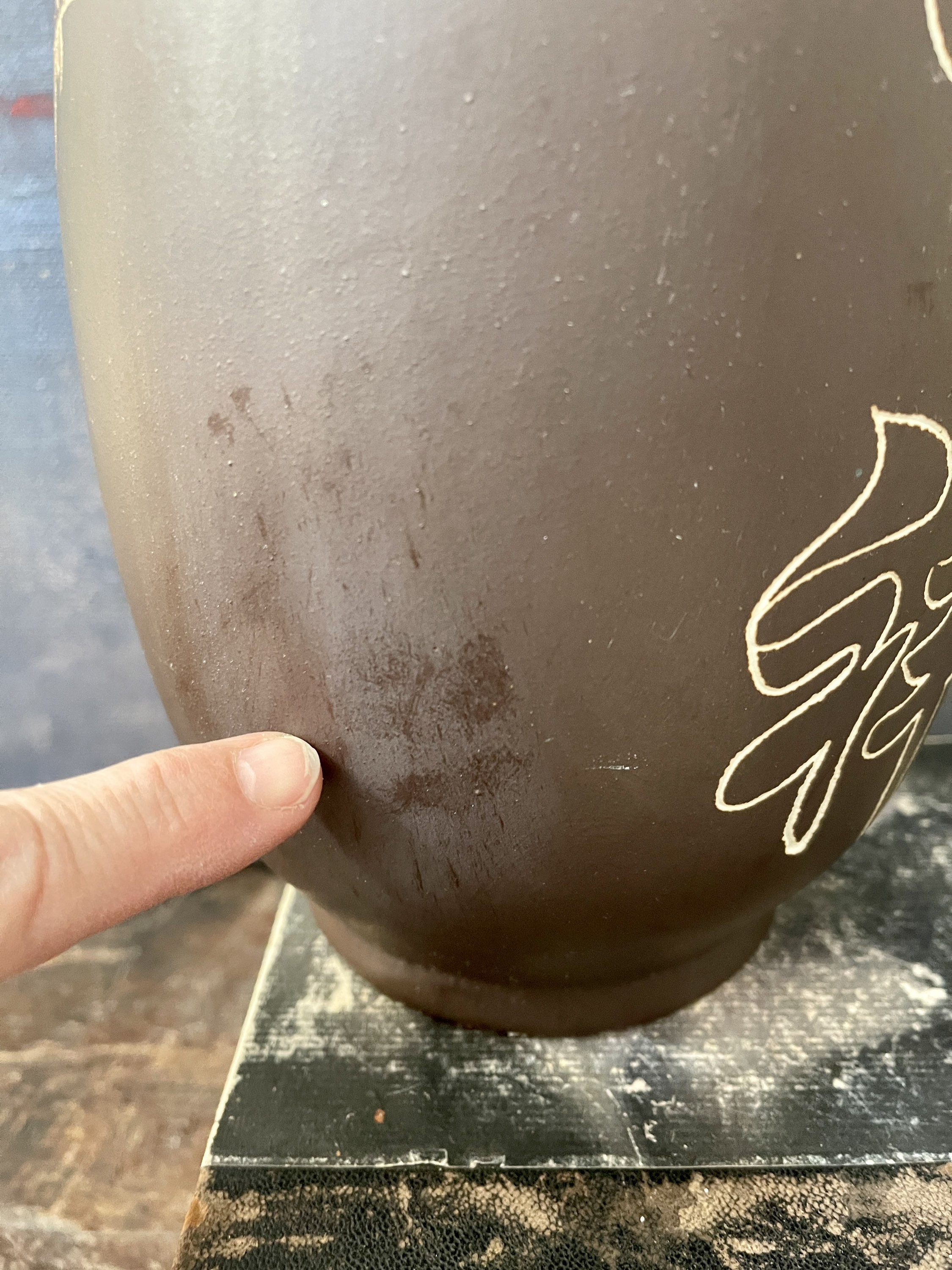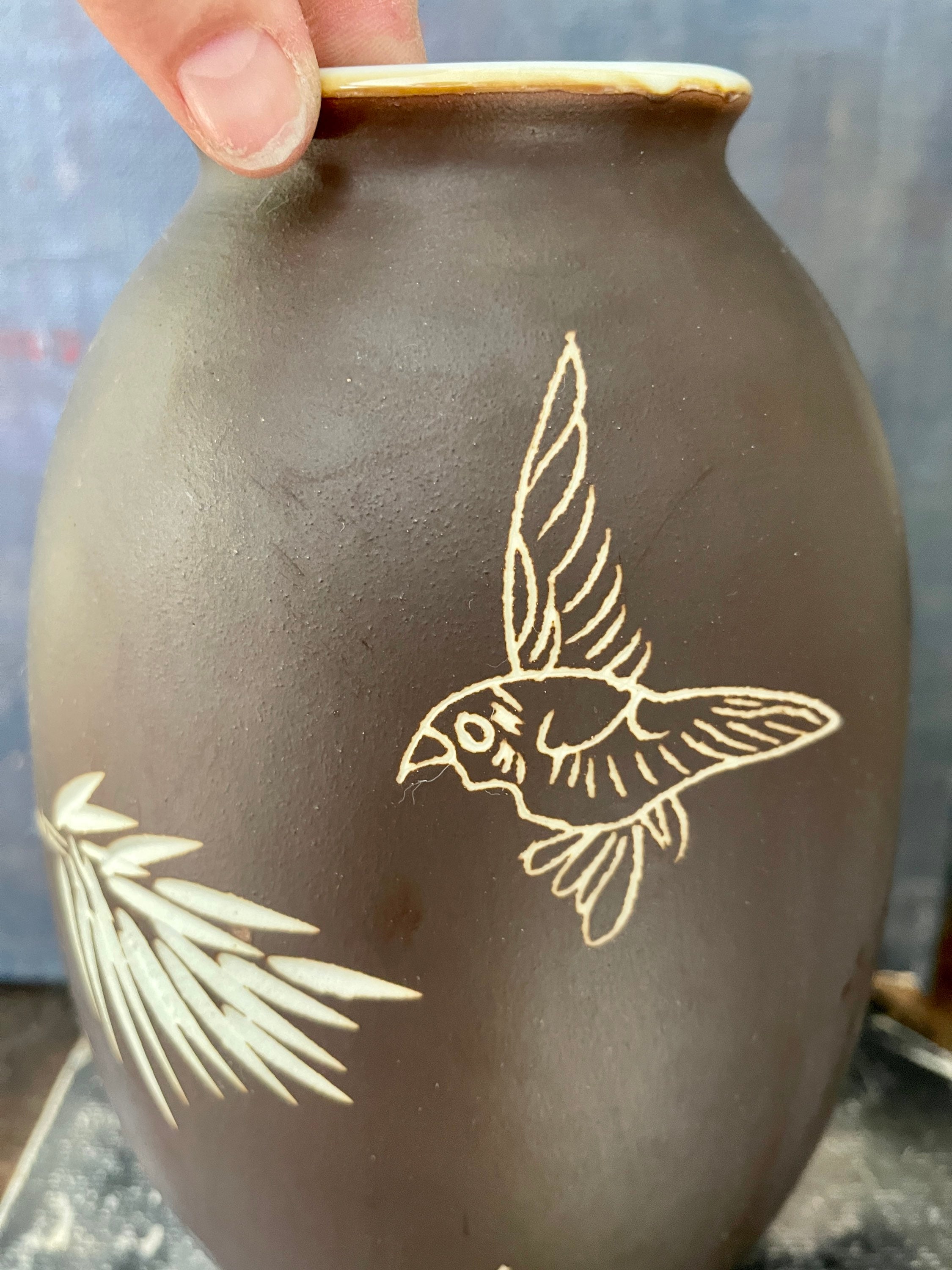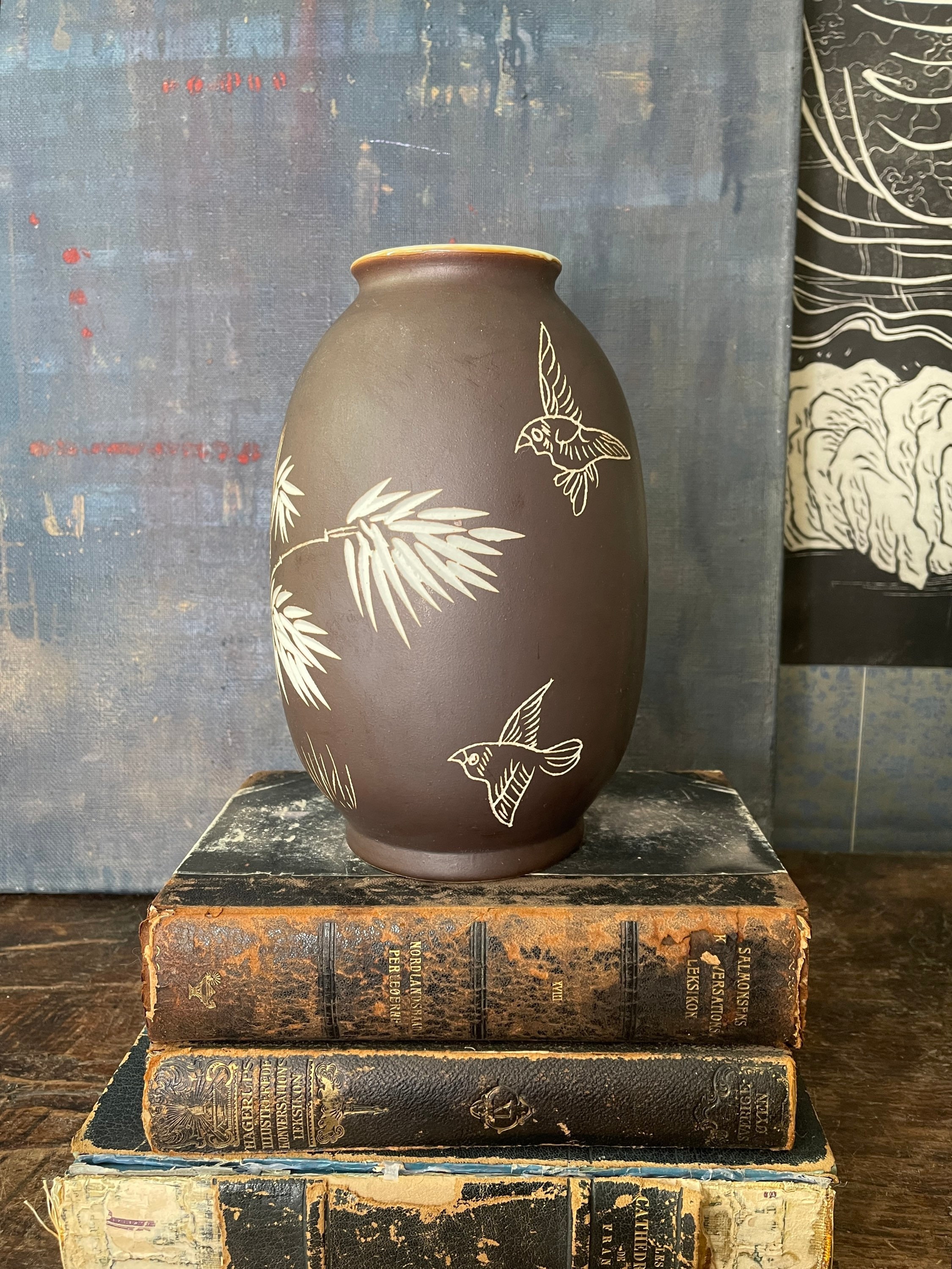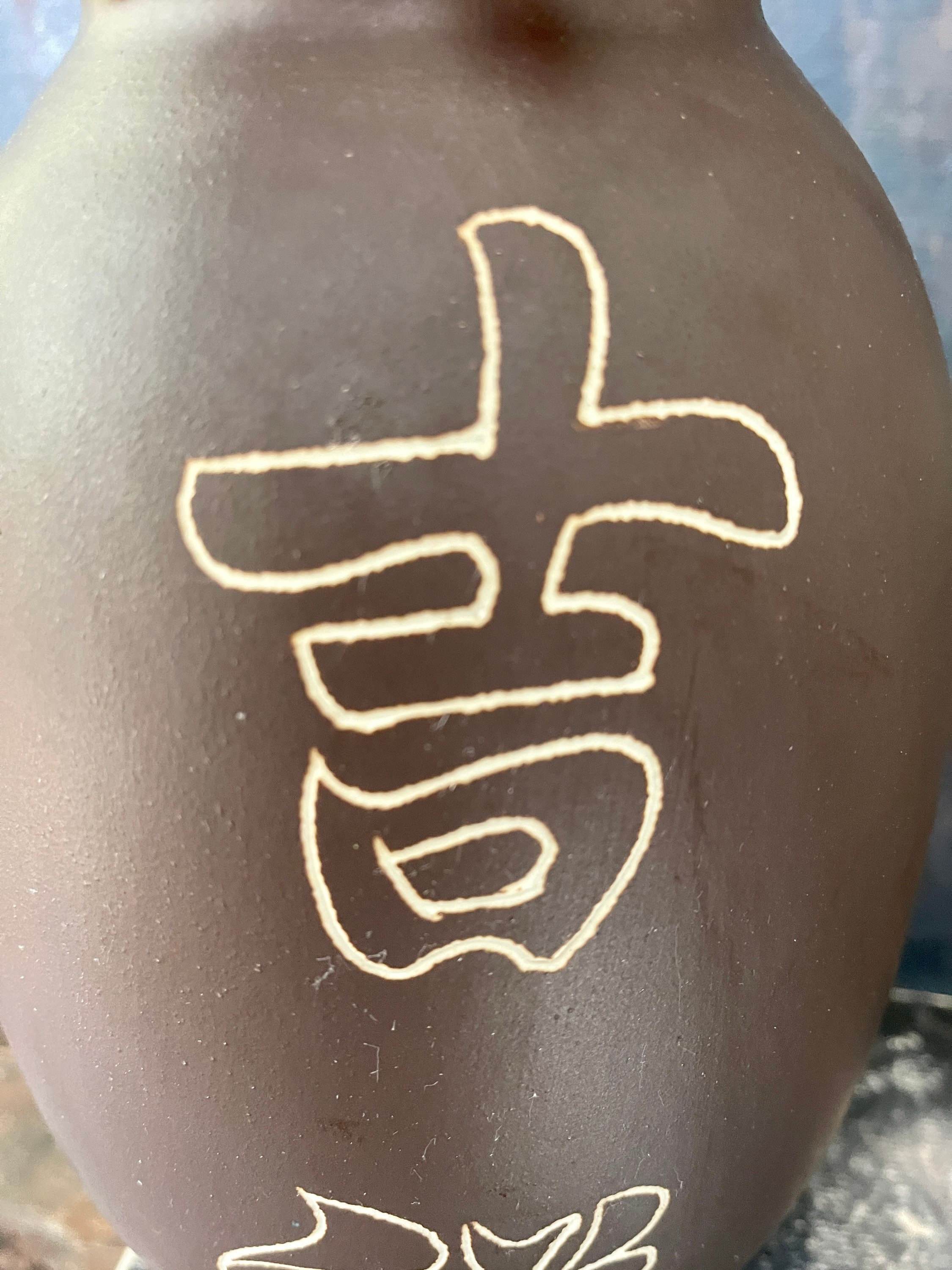 Very pretty Asian vase measuring 9.75 inches tall, it has a nice visual impact. Presented in a deep chocolate brown it depicts two birds flying around the stocks and leaves of a bamboo plant. On the back, two Chinese symbols appear vertically. The decoration has been carved into the clay vase, giving it a nice texture, and also revealing the creamy white of the clay below. The brown glaze has a smooth matte finish, the inside is a glossy creamy white glaze. So it should hold water if you were to use it as a vase. Pretty piece along a mantel or bookshelf!