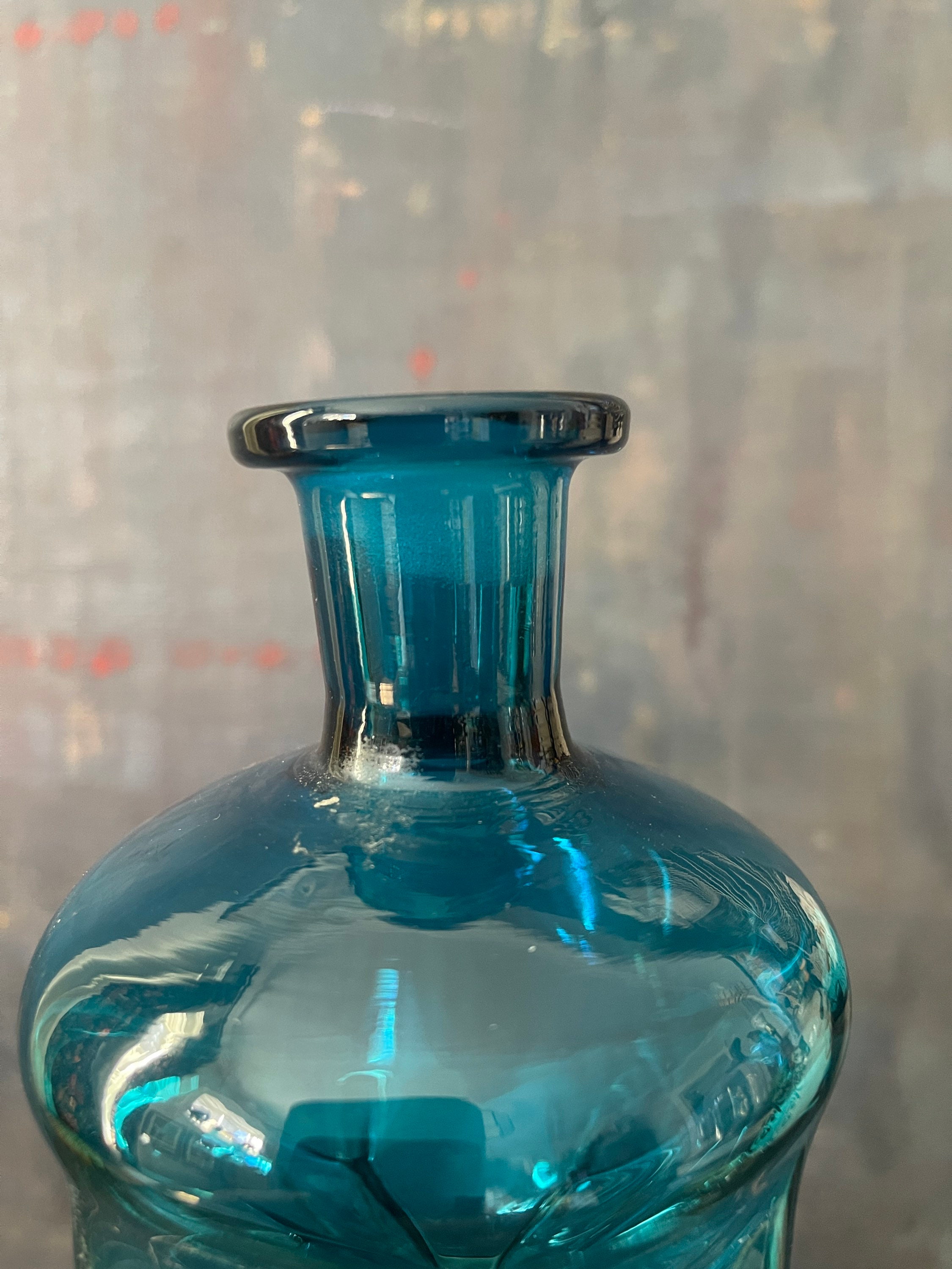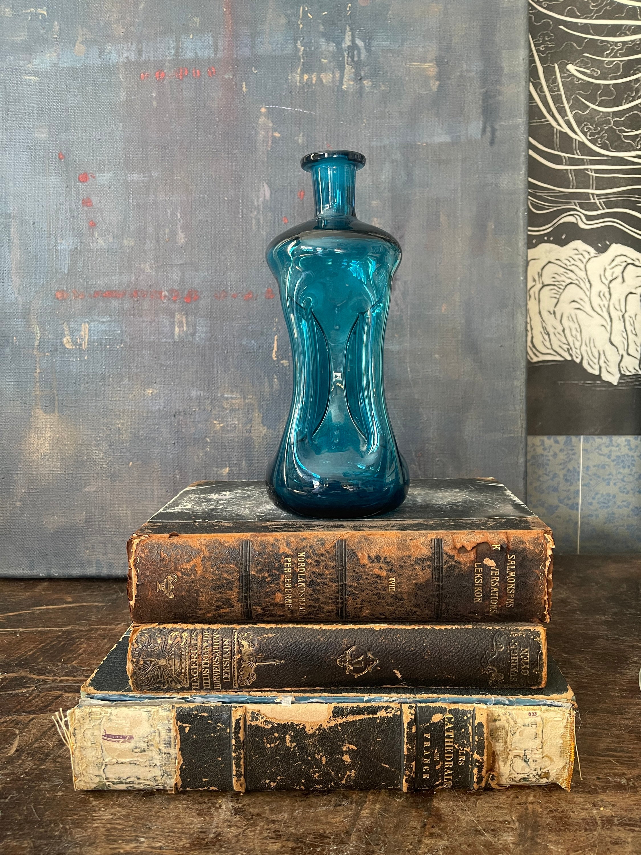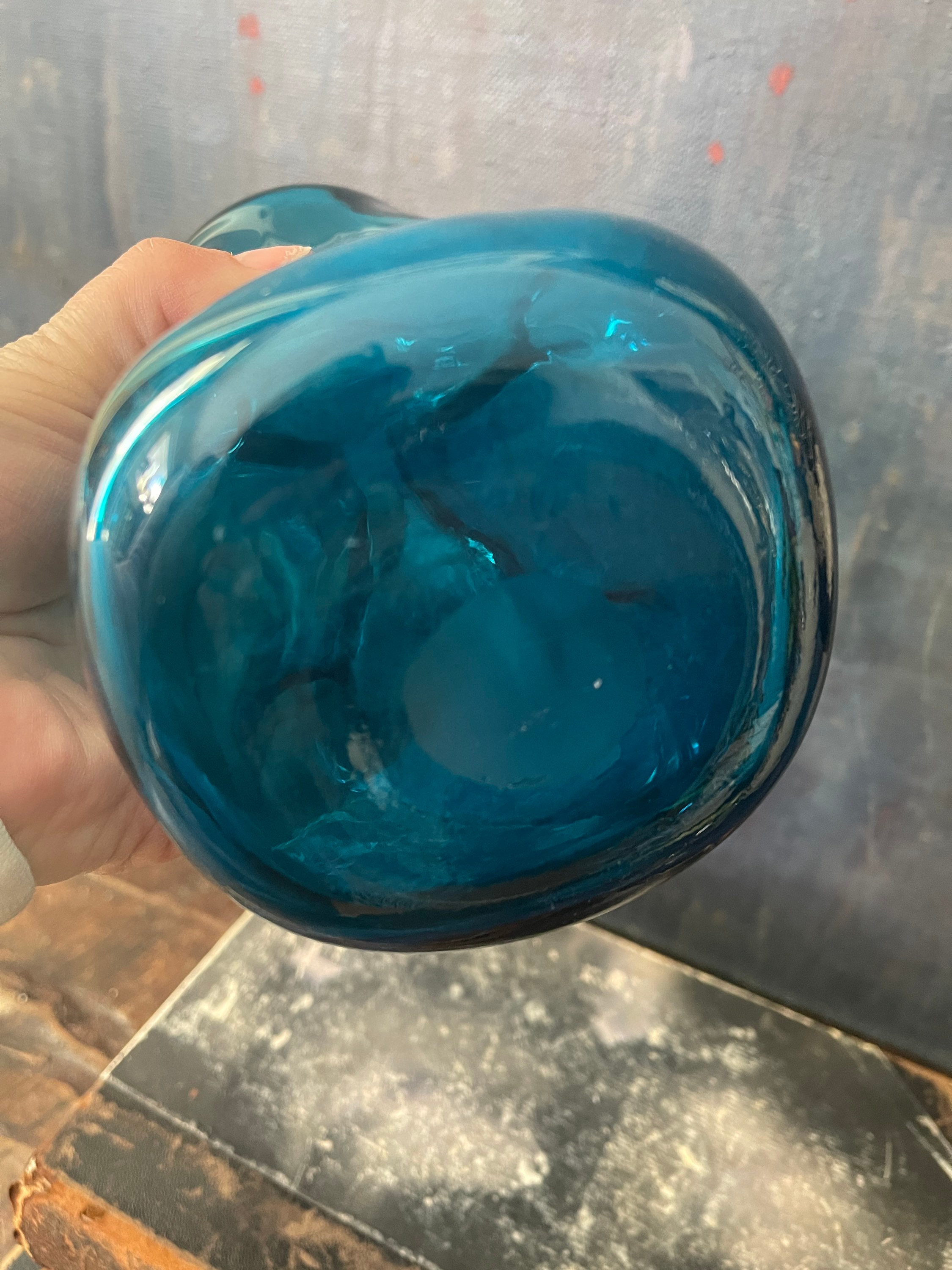 Stunning, turquoise, glass vase, brings a vibrant pop of color. By. Holmegaard, it is danish glass. It looks gorgeous, with a single branch tucked into it, or a single stem. It is a nice way to complement art on a bookshelf.