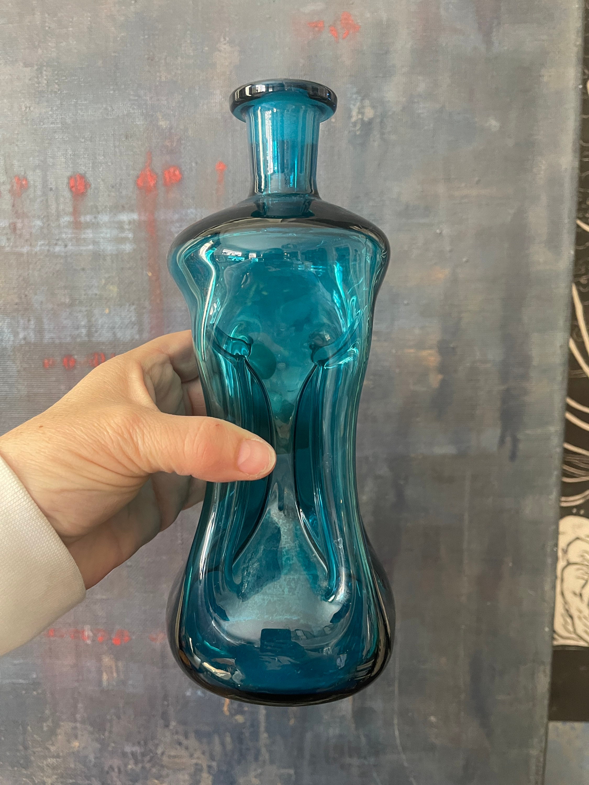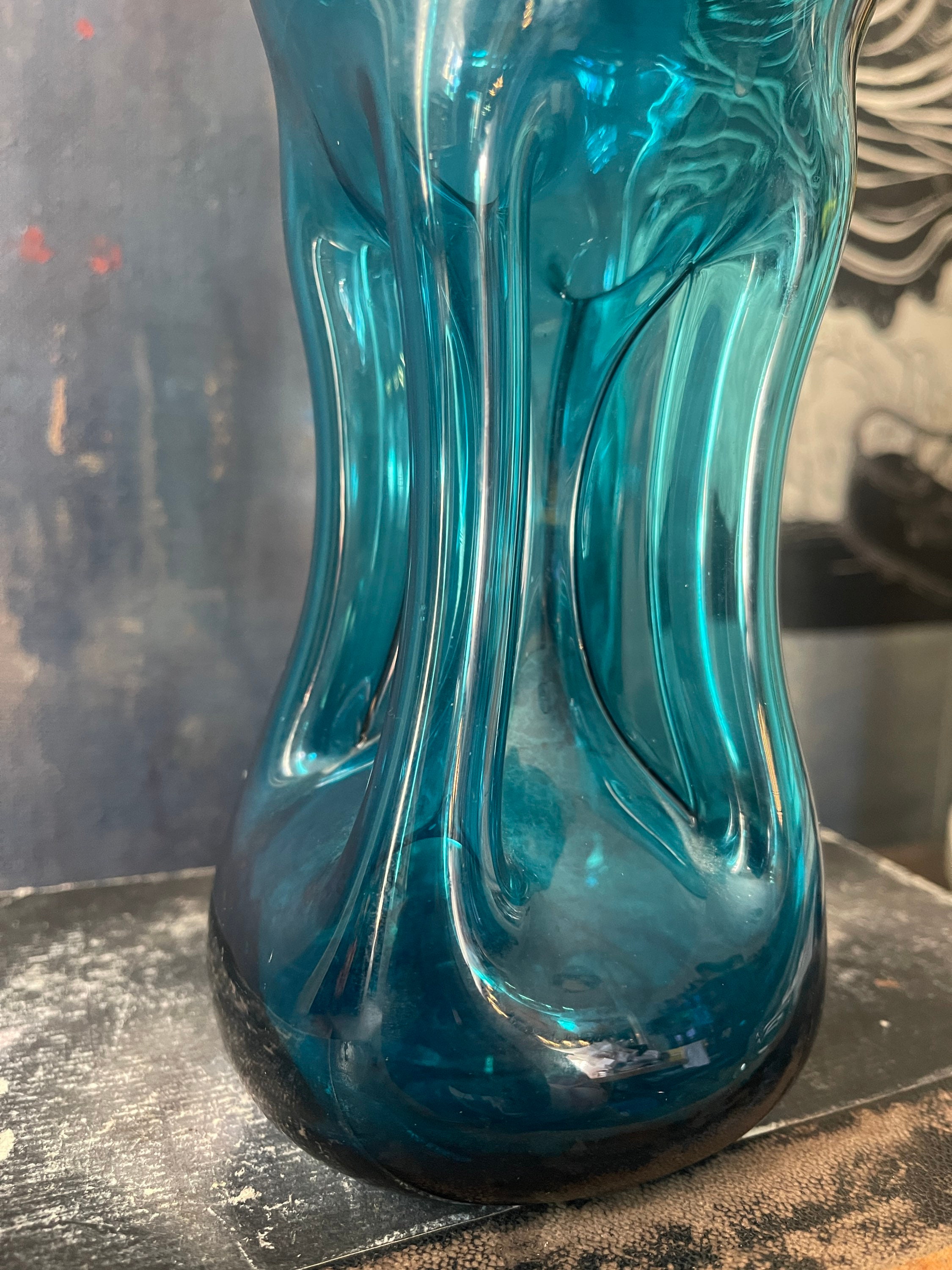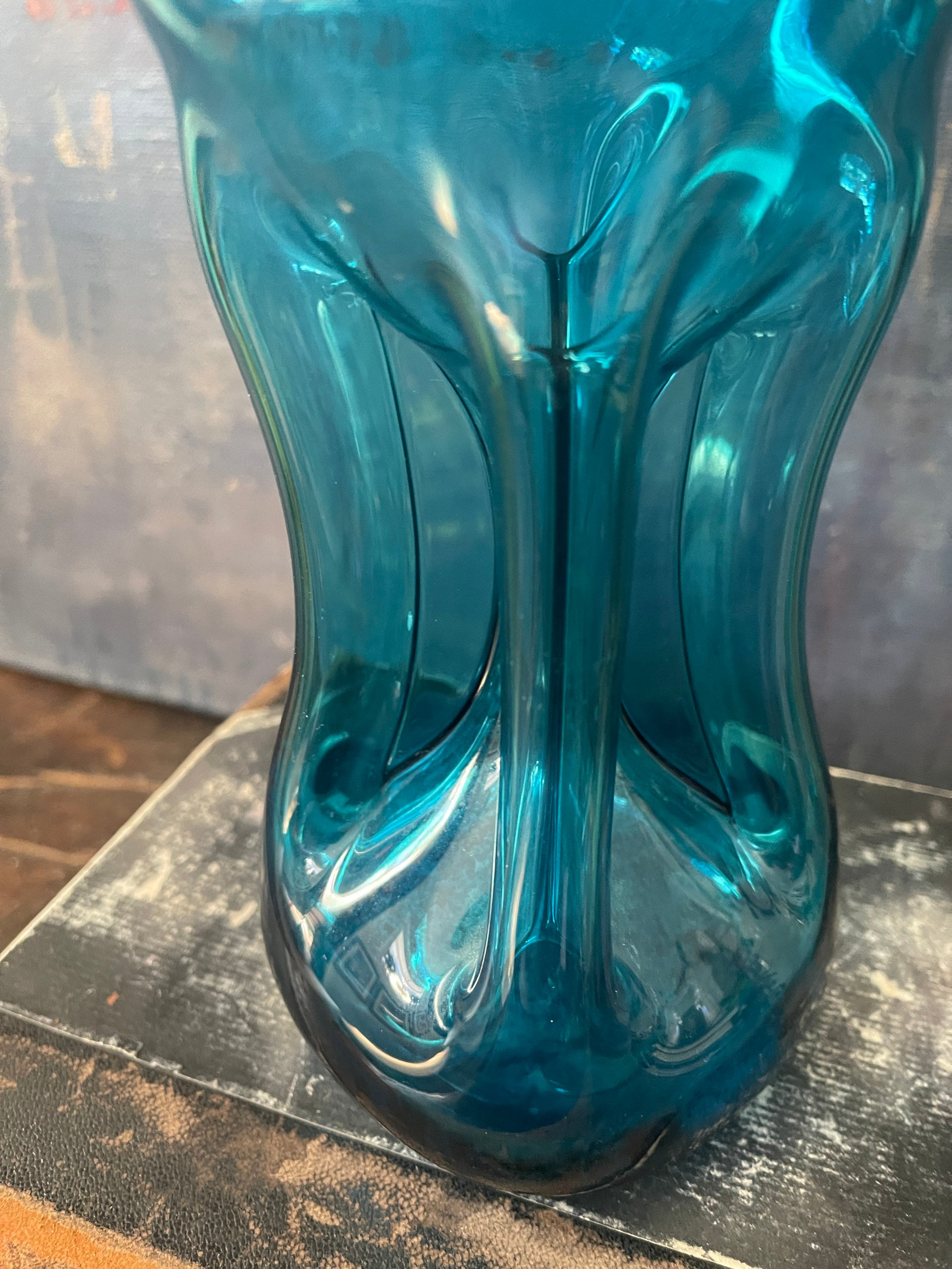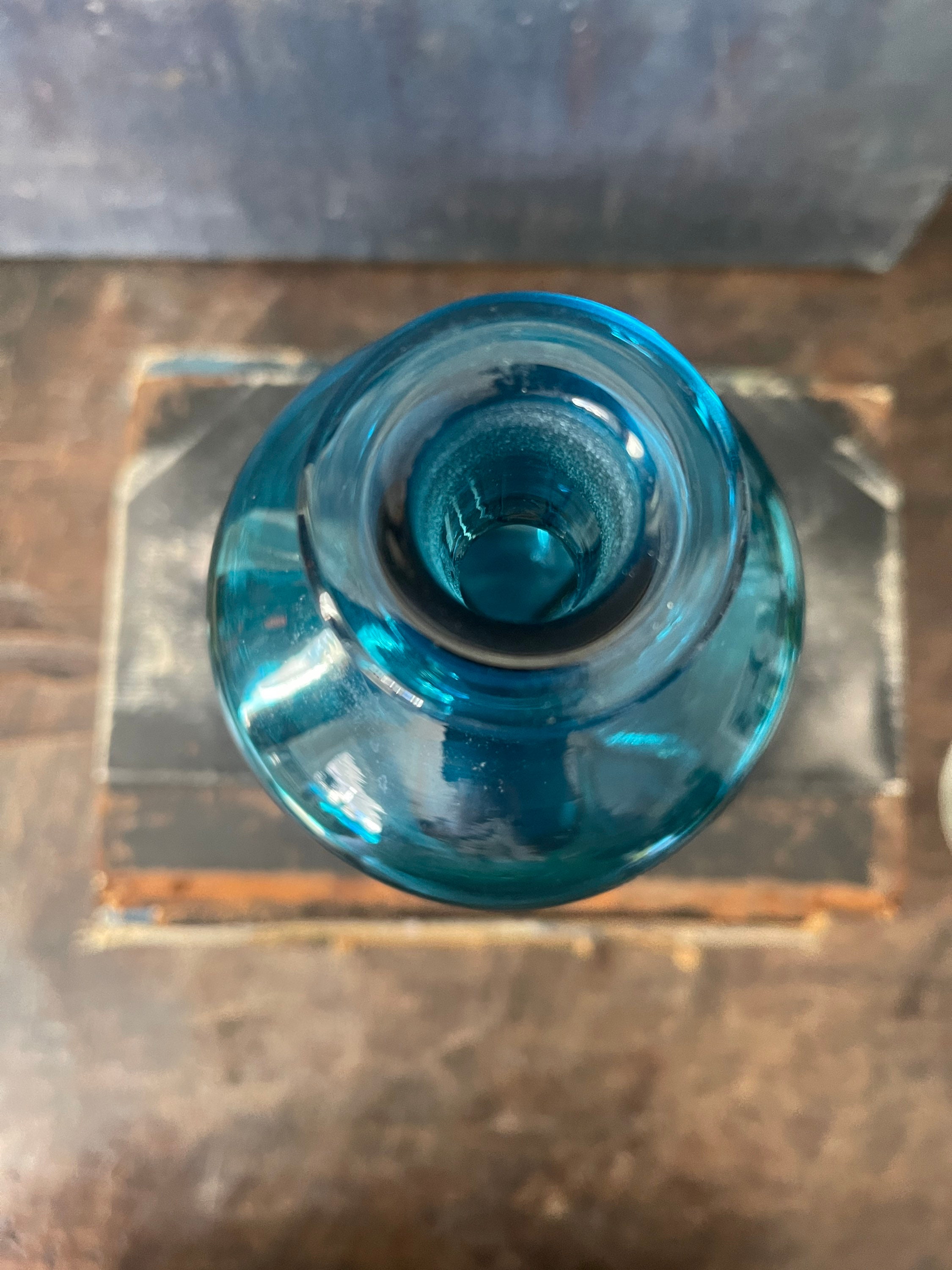 Stunning, turquoise, glass vase, brings a vibrant pop of color. By. Holmegaard, it is danish glass. It looks gorgeous, with a single branch tucked into it, or a single stem. It is a nice way to complement art on a bookshelf.