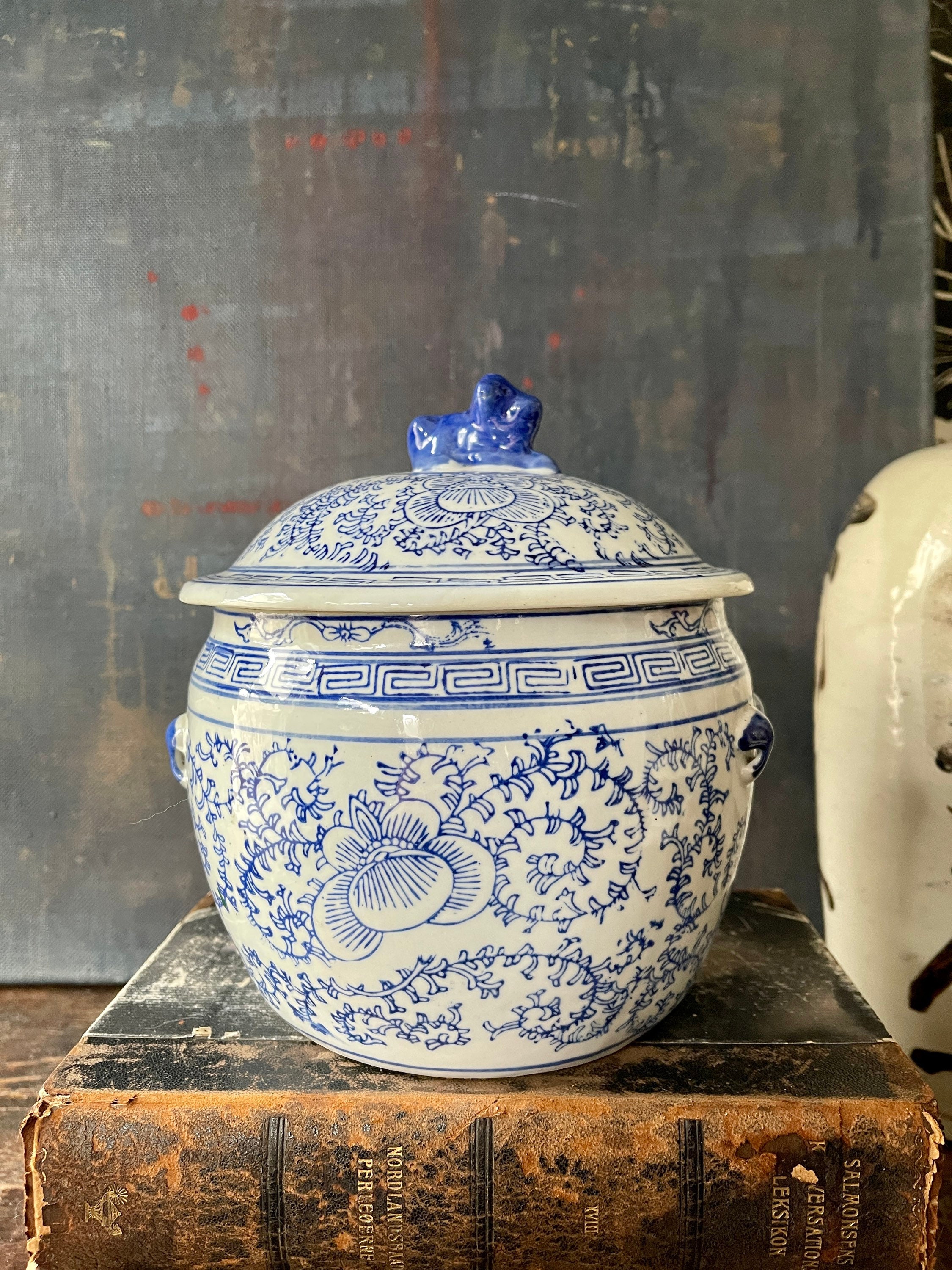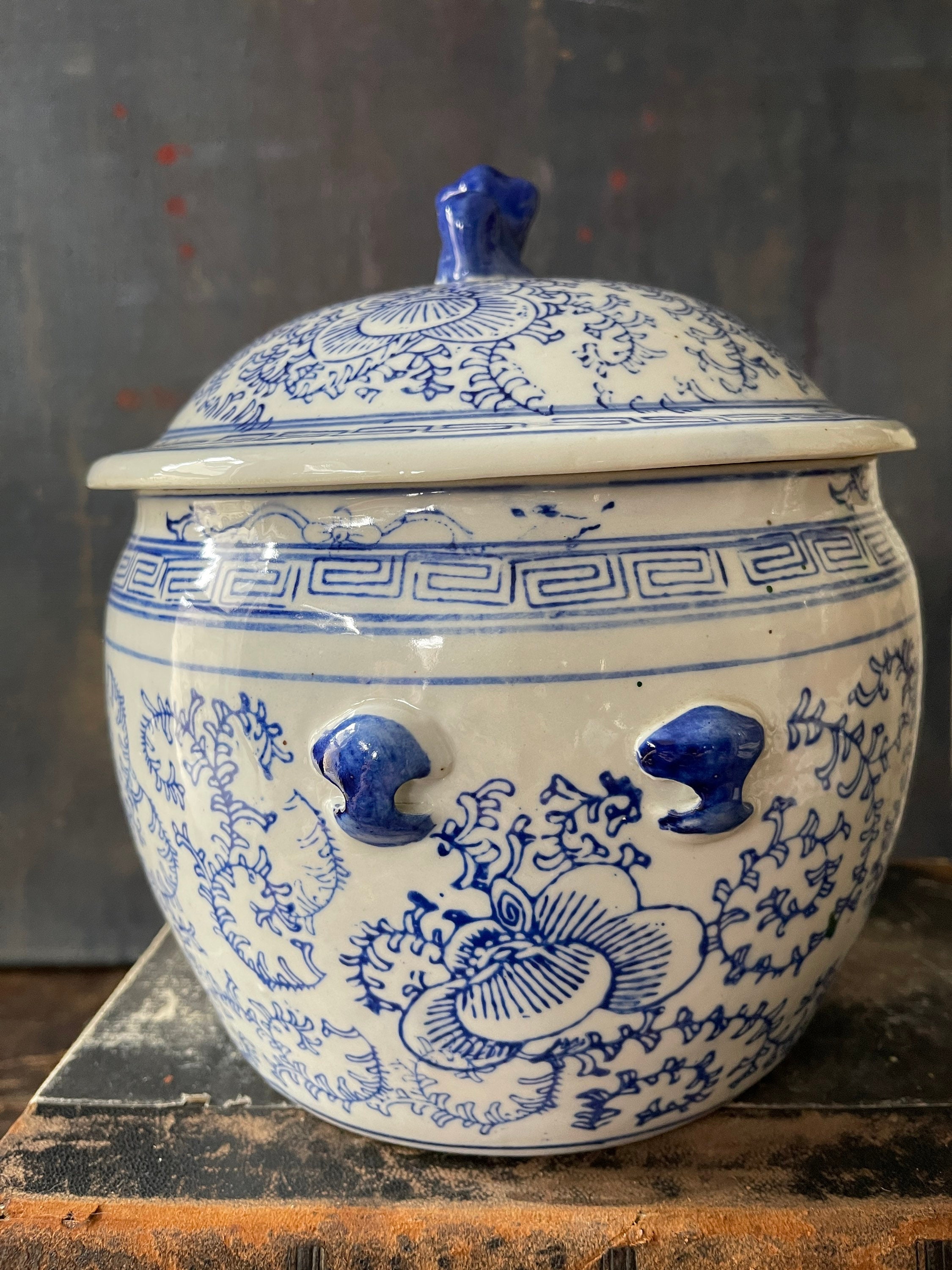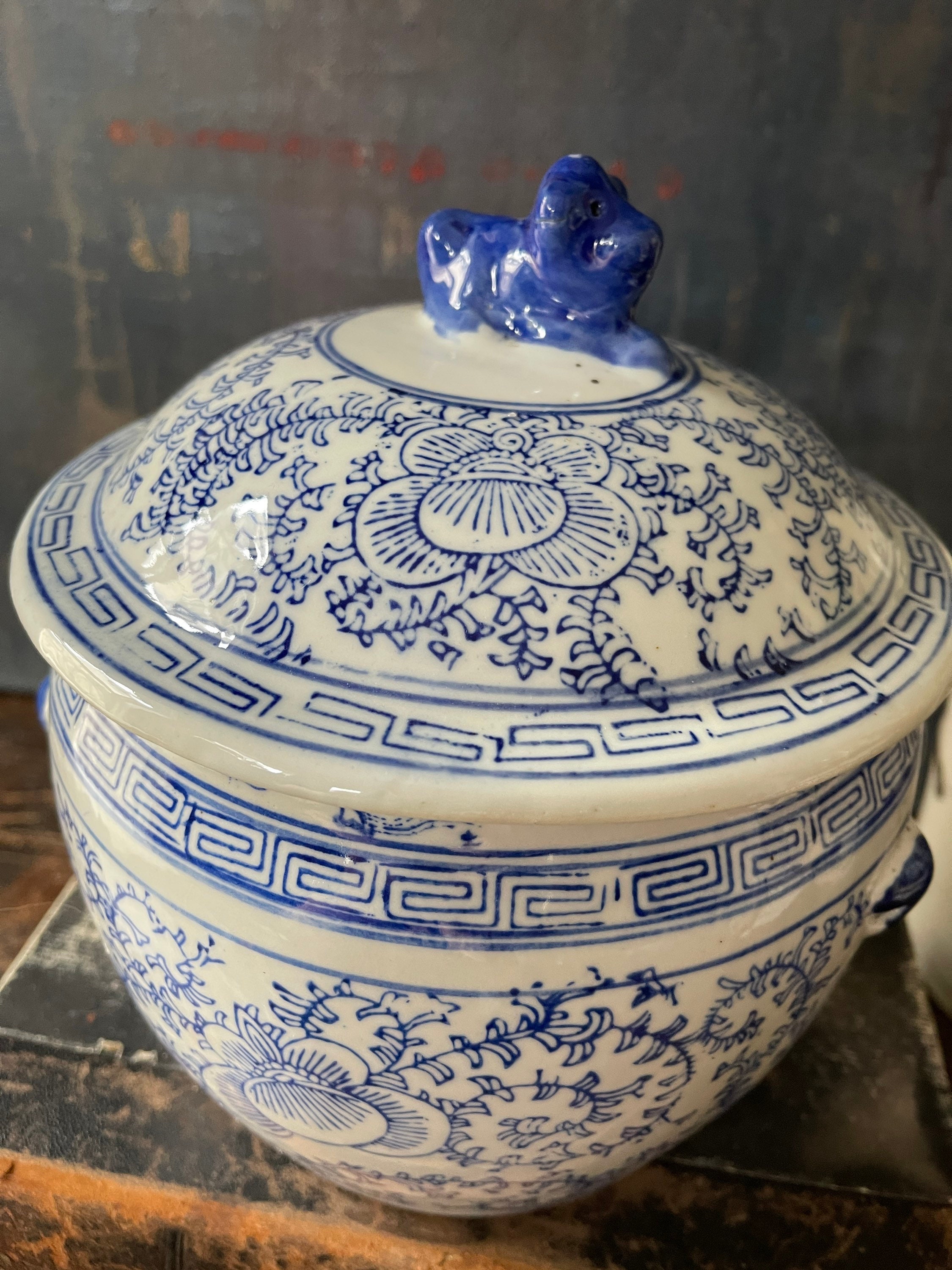 Lovely Asian, ceramic blue and white litted bowl, sitting a top, the lid is a blue foo dog. Crisp, white, glossy ceramic with a rich, royal blue floral pattern scrolls around the side. Greek key design edge is the rim of the base and the lid, while tiny handles are painted a royal blue on the sides. The handles are more for a visual interest versus use. We love this ball placed into a collection of other Asian blue and white, and it is also a great place to hide away things such as keys or other small.