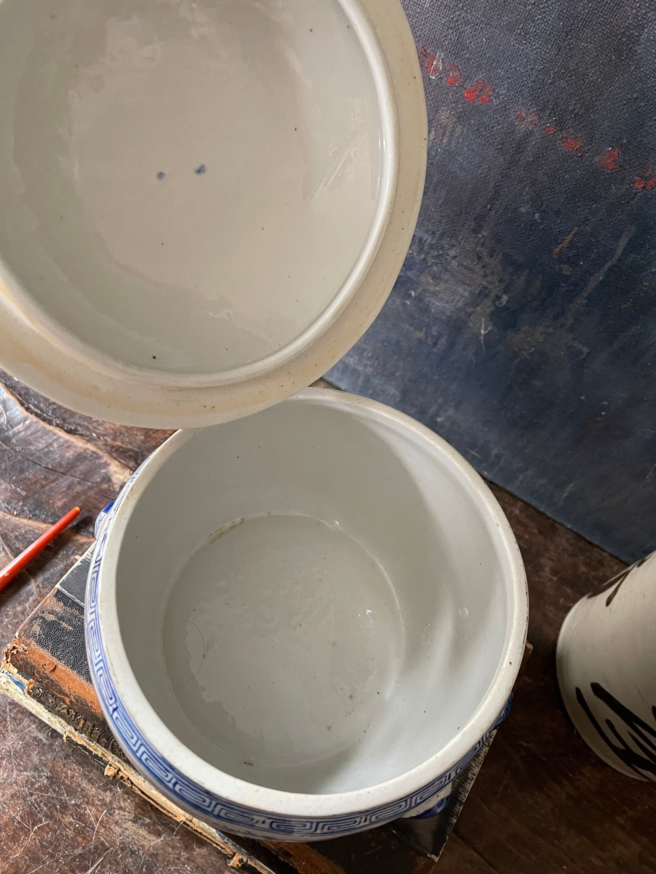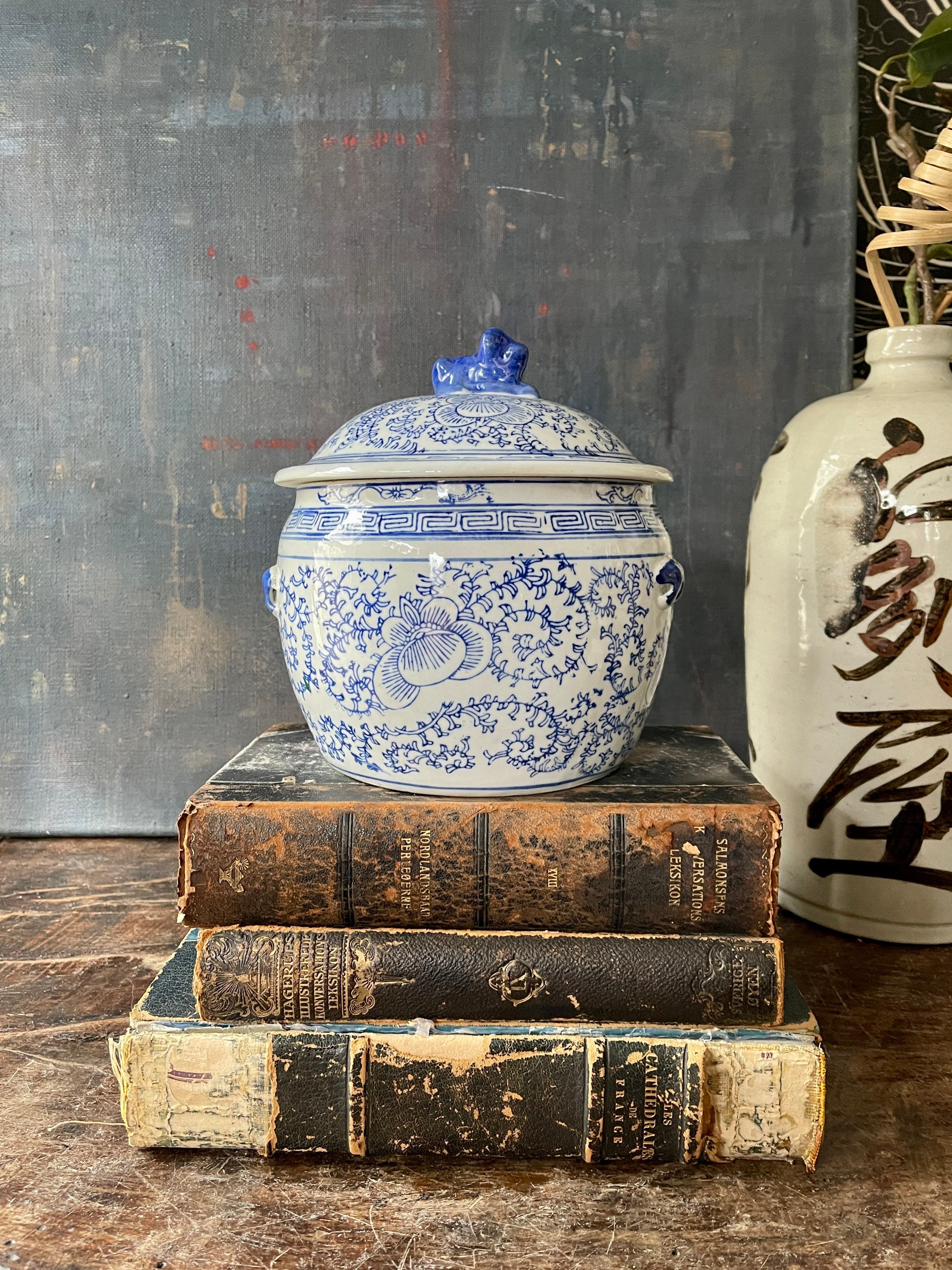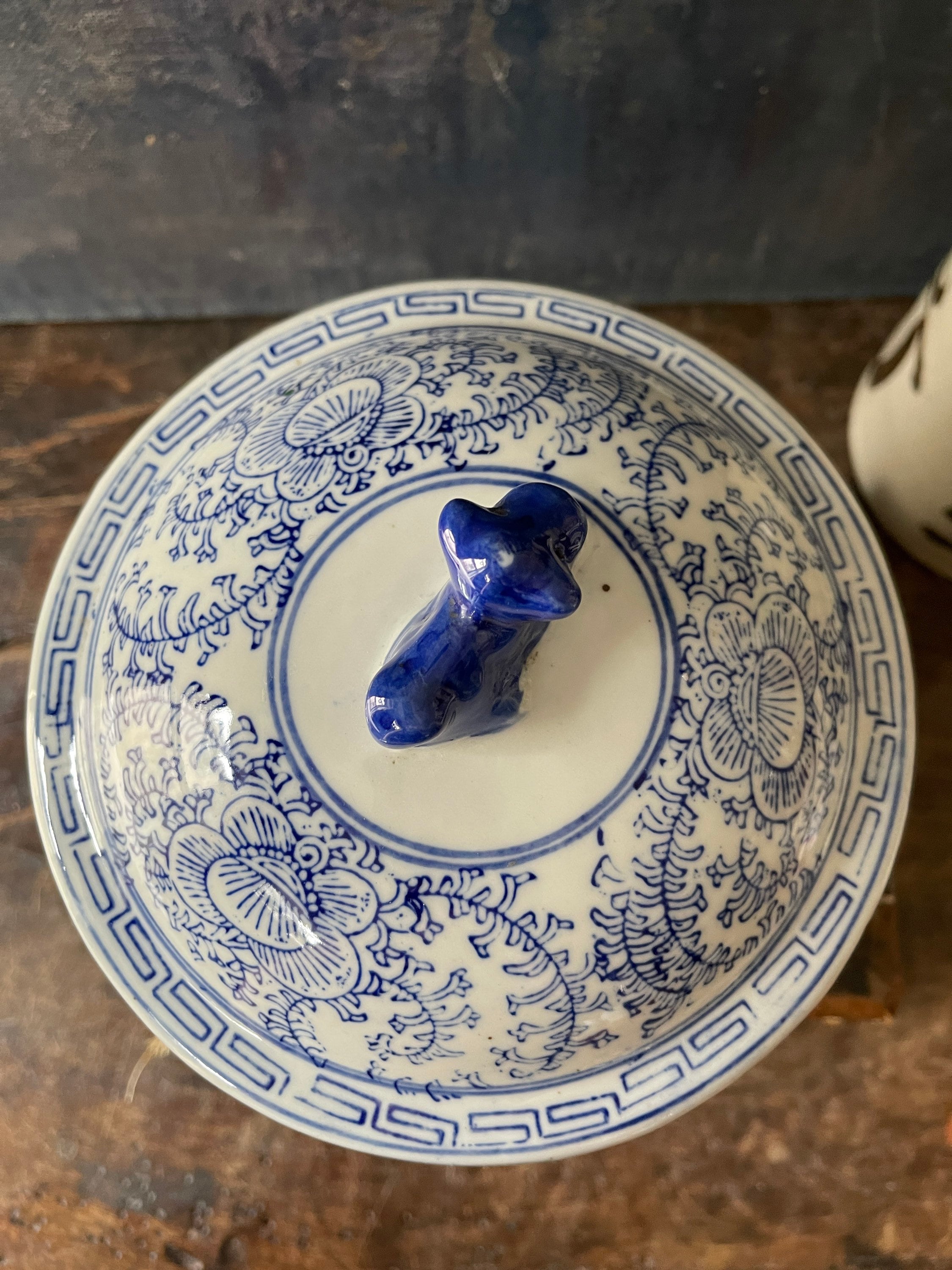 Lovely Asian, ceramic blue and white litted bowl, sitting a top, the lid is a blue foo dog. Crisp, white, glossy ceramic with a rich, royal blue floral pattern scrolls around the side. Greek key design edge is the rim of the base and the lid, while tiny handles are painted a royal blue on the sides. The handles are more for a visual interest versus use. We love this ball placed into a collection of other Asian blue and white, and it is also a great place to hide away things such as keys or other small.