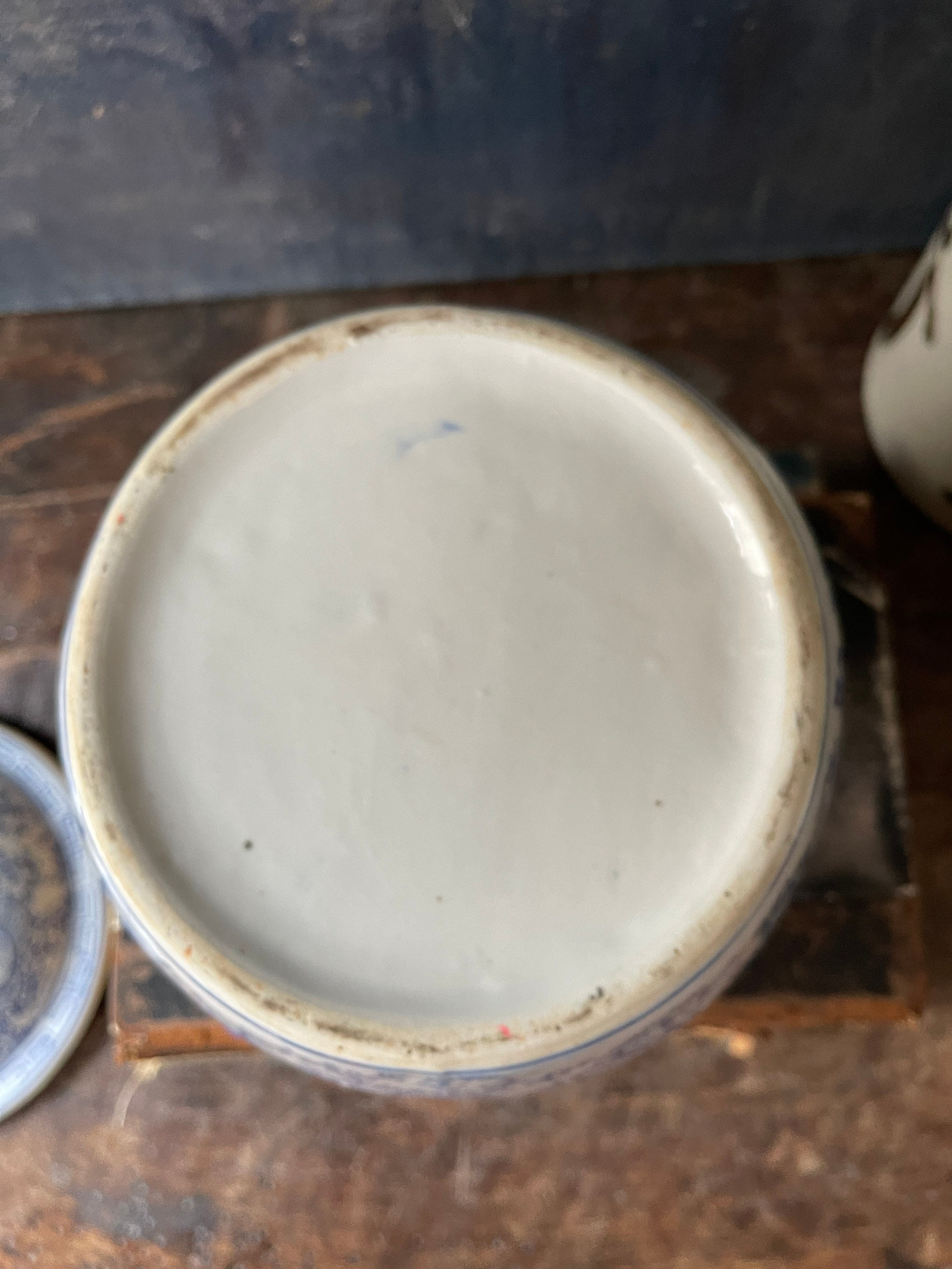 Very nice condition and there are no cracks. There are no chips. There is a spot sitting on top the food dogs head that does not have the royal blue paint, it is not a chip. It’s glazed over, so this was done at the time of manufacturing. There are also some imperfections in the application of the blue paint that would have been done at manufacturing