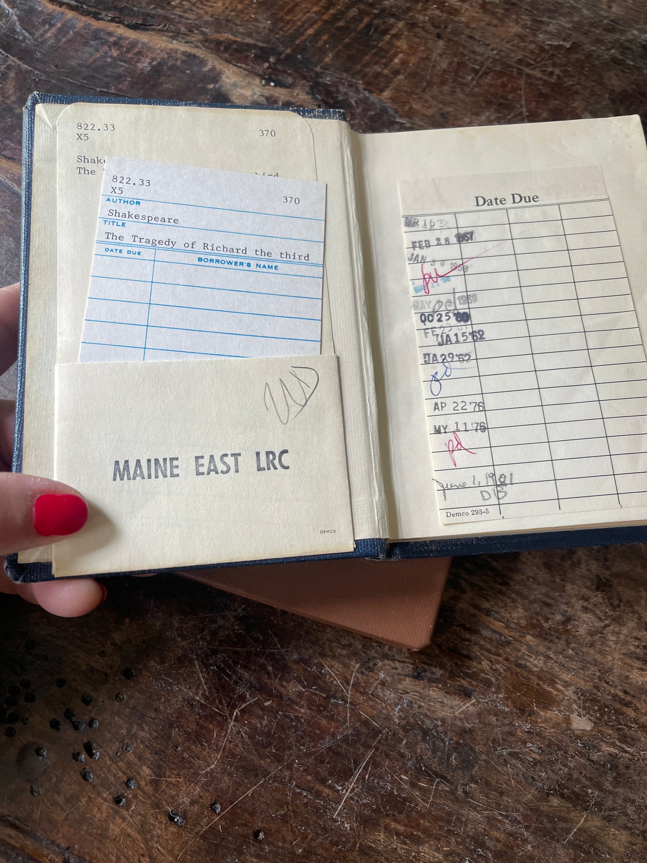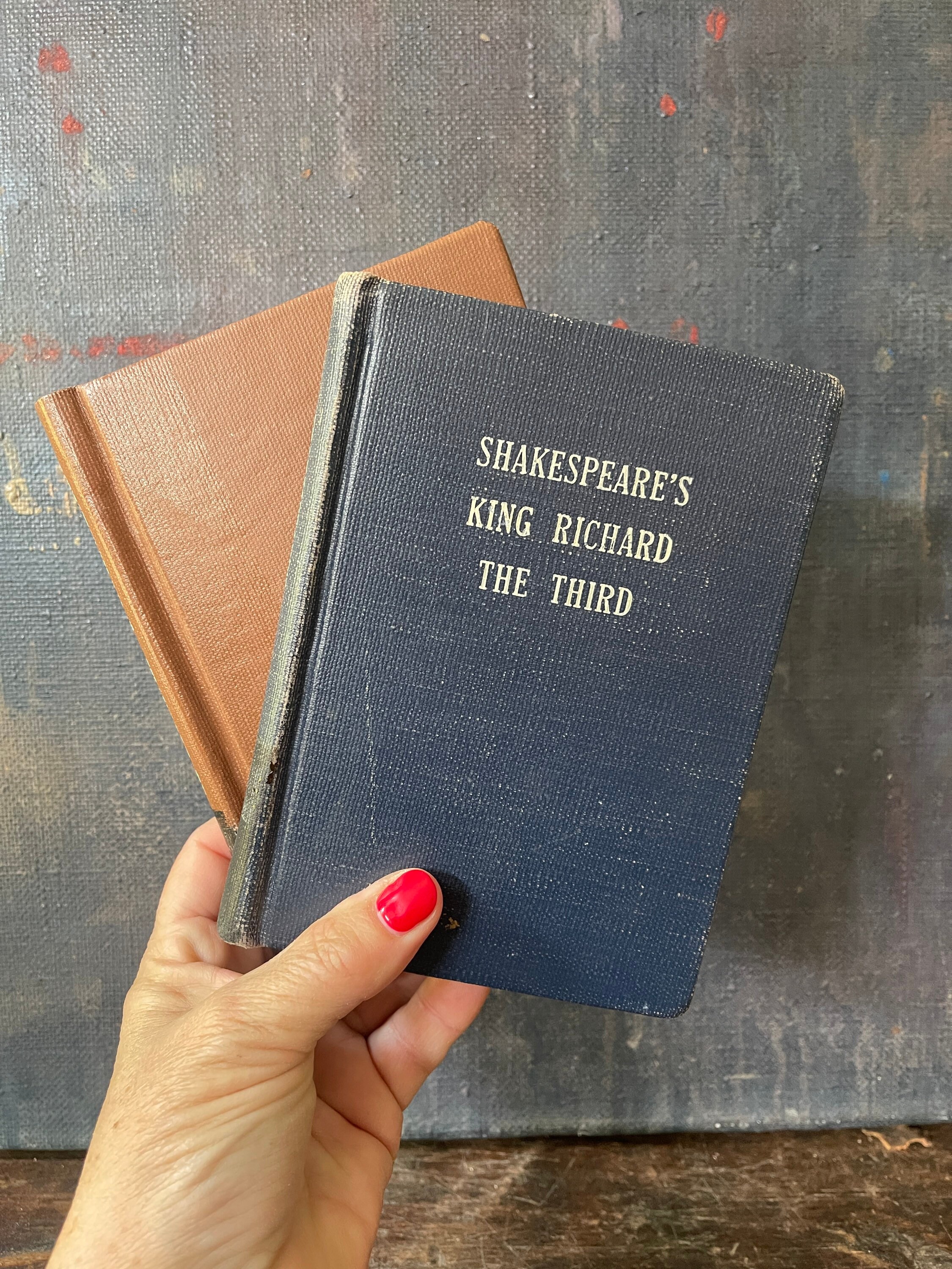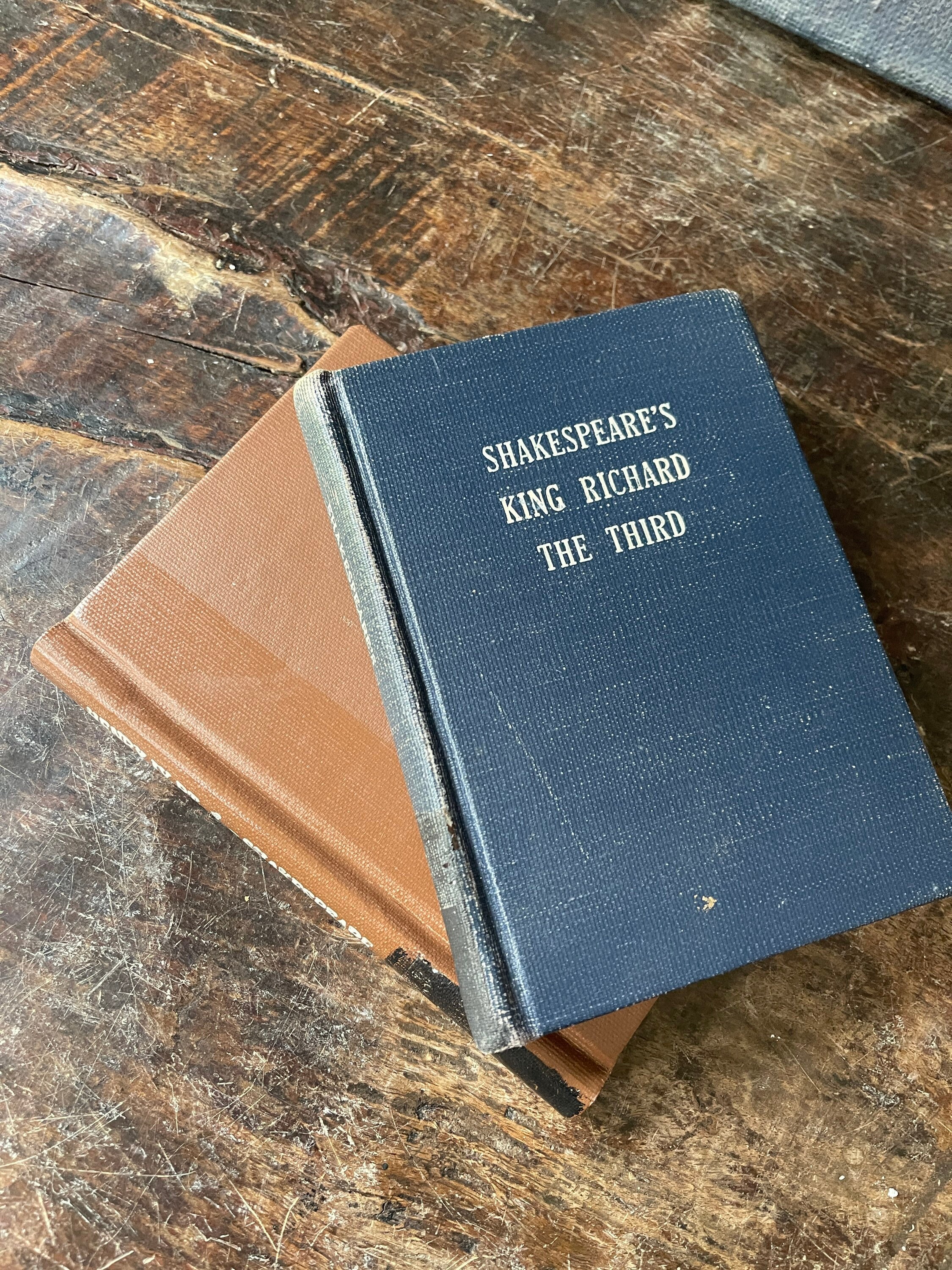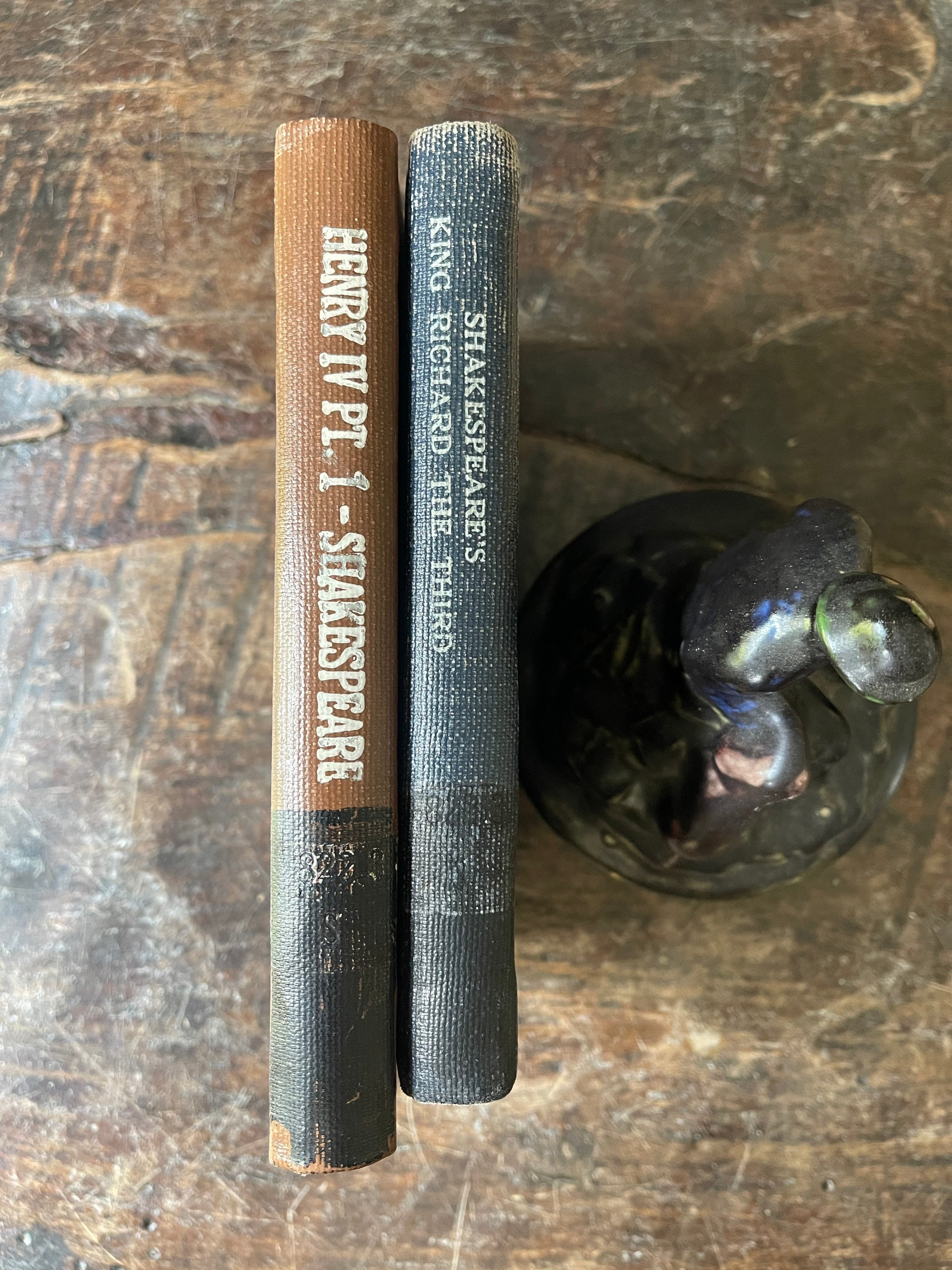 We love these old decommissioned library books, smaller in size, it makes the perfect to talk into basket or to stack upon another stack of books on the coffee table or a shelf. The king Richard book is presented in a nice navy blue that has a bit of a denim text year with that’s wear. Henry IV is a light brown and has this awesome font in a white ink down the side. Both of them have evidence of library cards from the 1970s still on the inside in the library name stamped on the sides of the book.