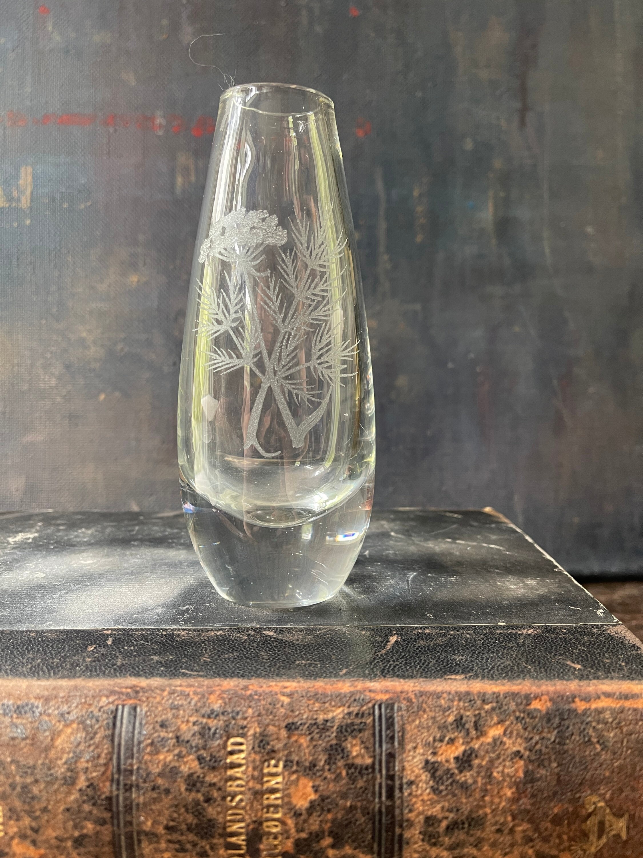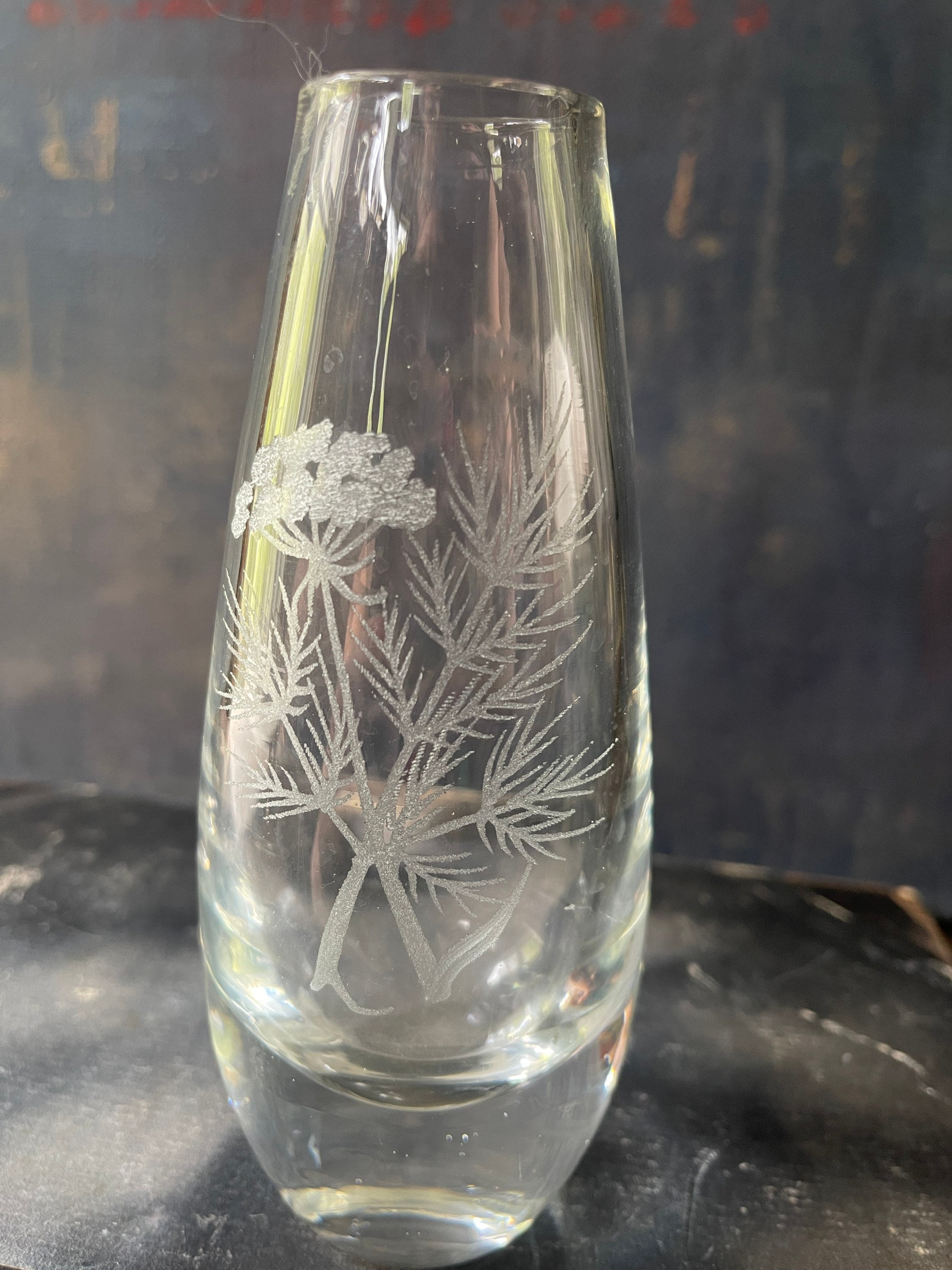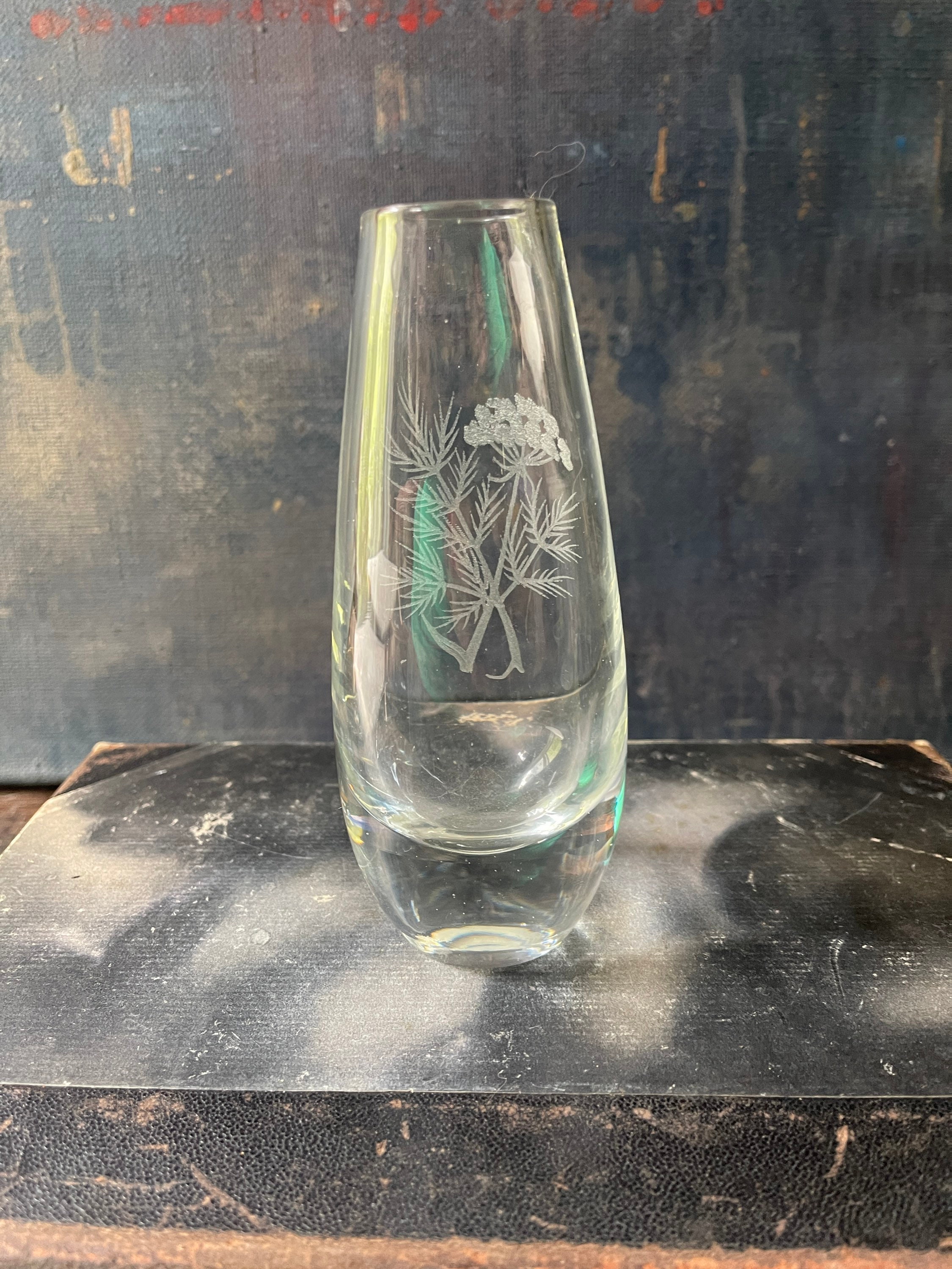 Lovely, Swedish glass vase, with a thick bass it narrows as it descends. Across the front, a flower has been etched into the glass. The backside does not have any etching. Beautiful piece to add a single stem to for a centerpiece