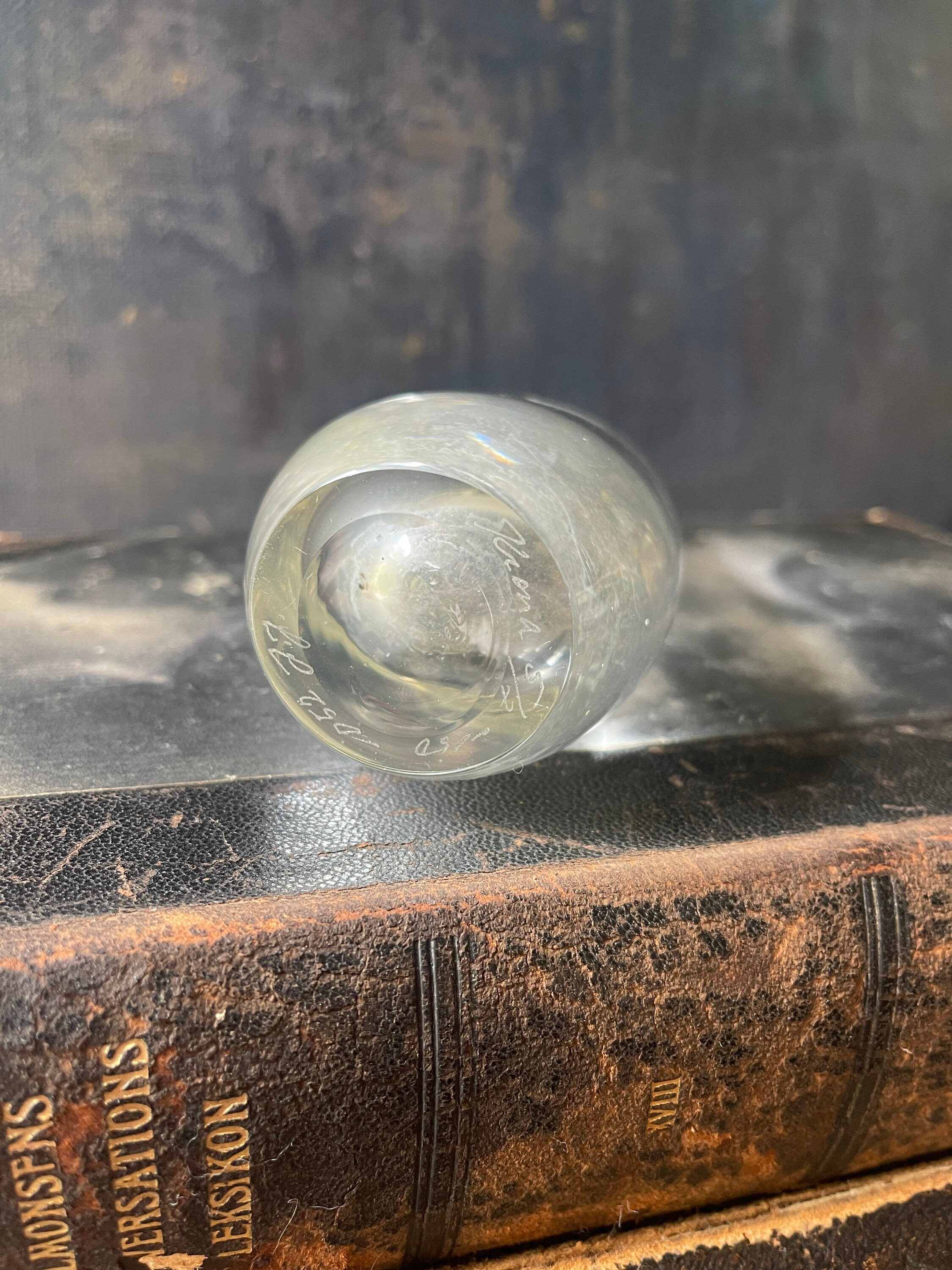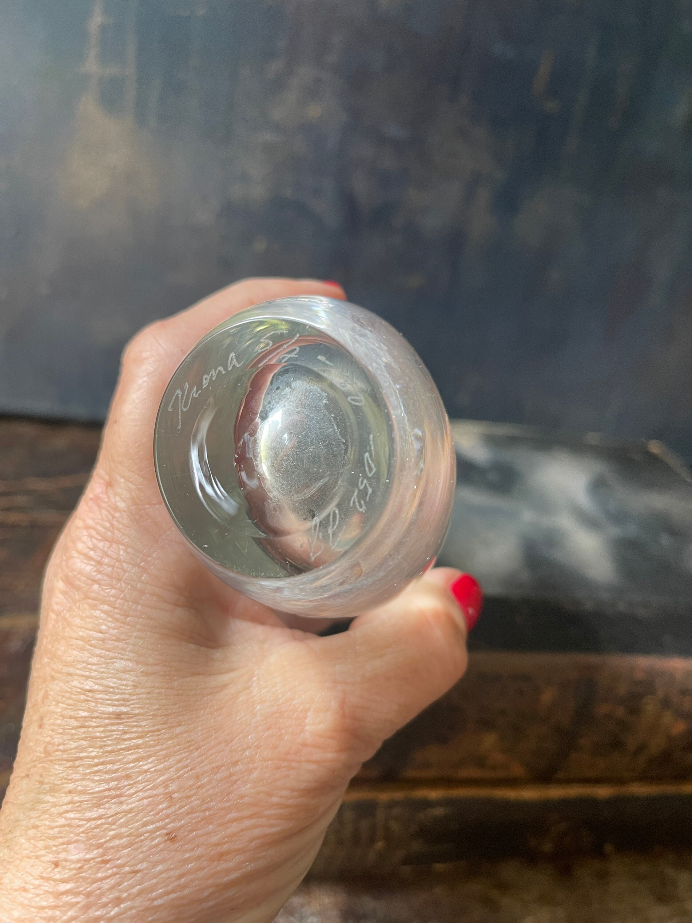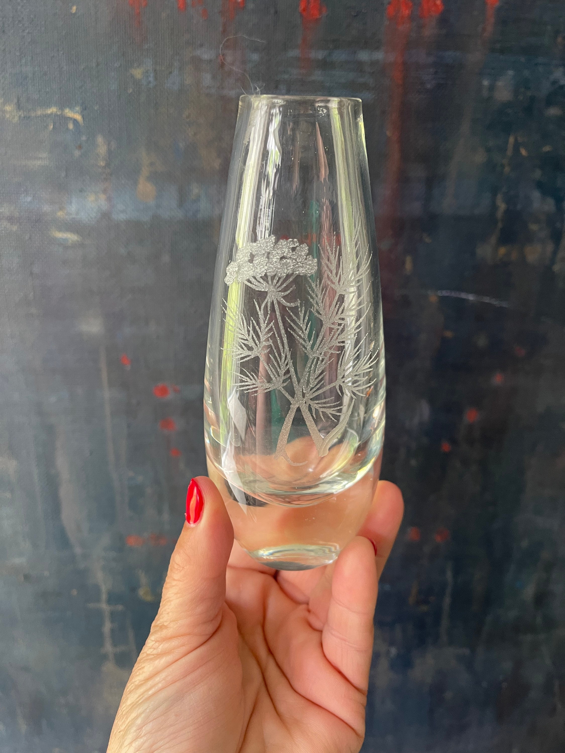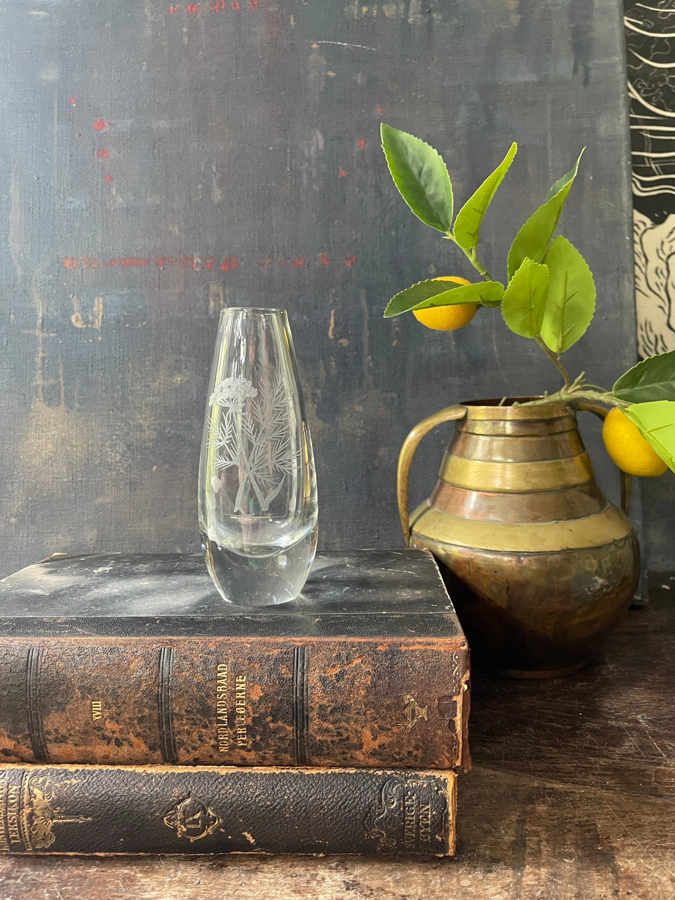 Lovely, Swedish glass vase, with a thick bass it narrows as it descends. Across the front, a flower has been etched into the glass. The backside does not have any etching. Beautiful piece to add a single stem to for a centerpiece