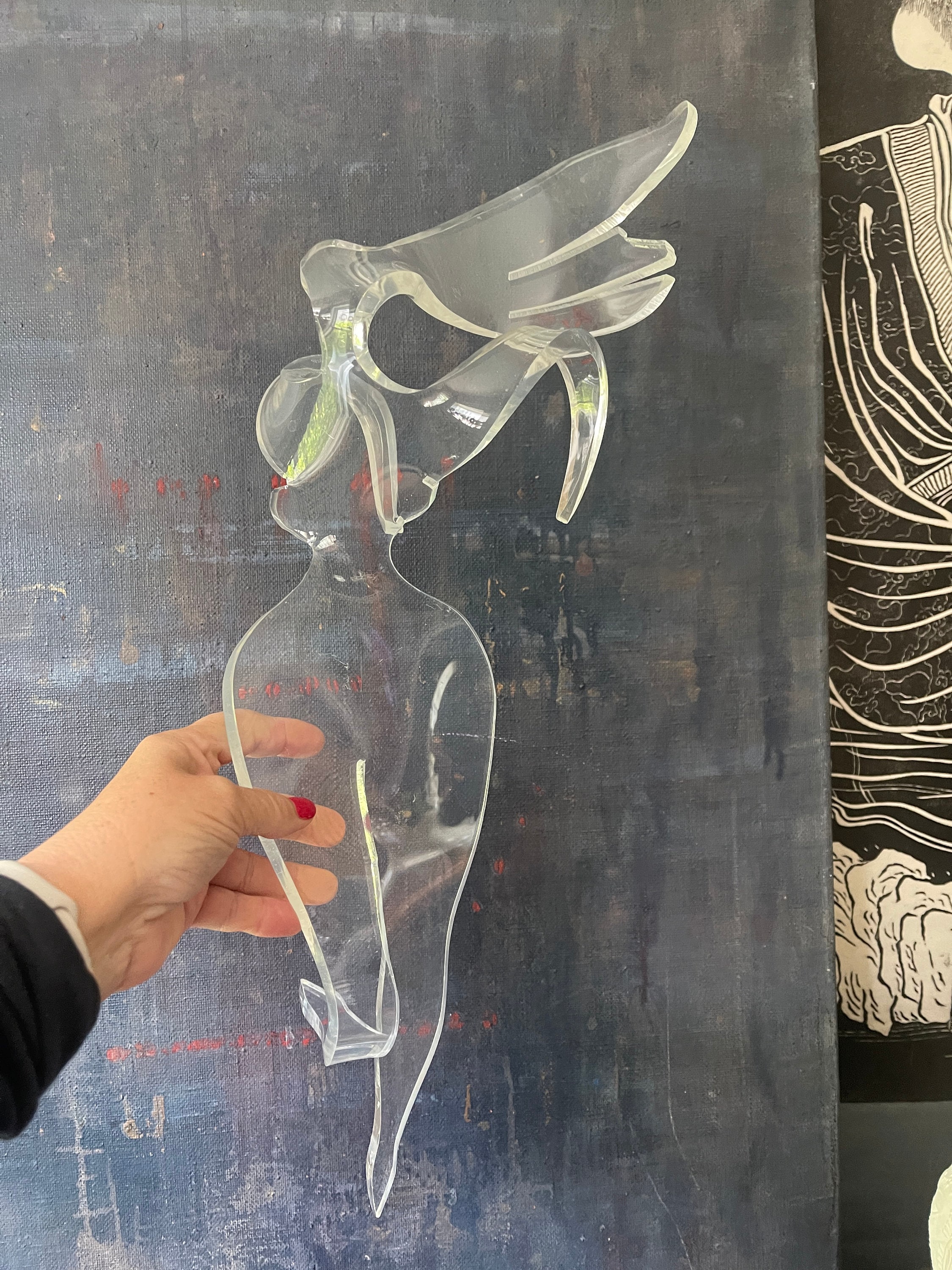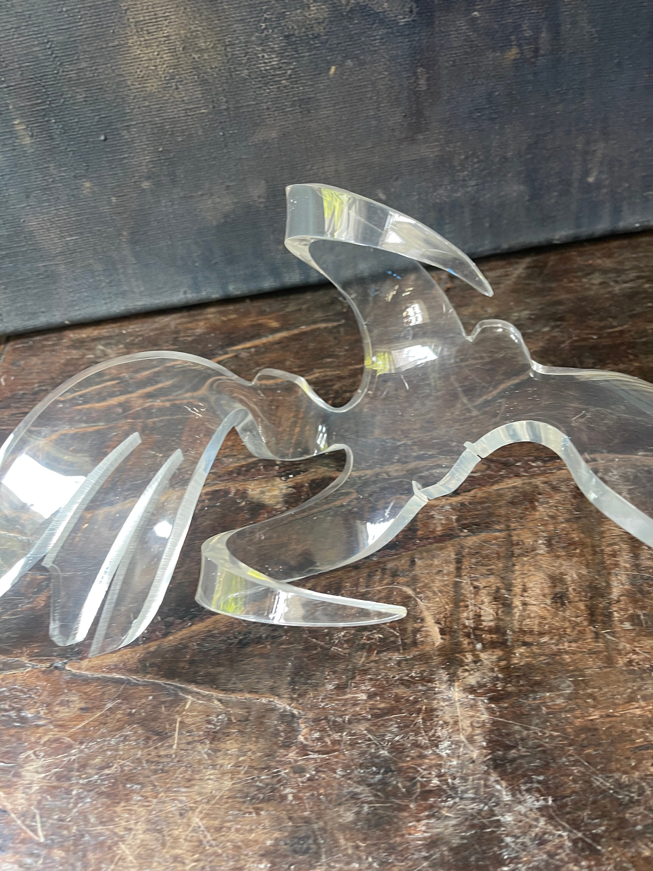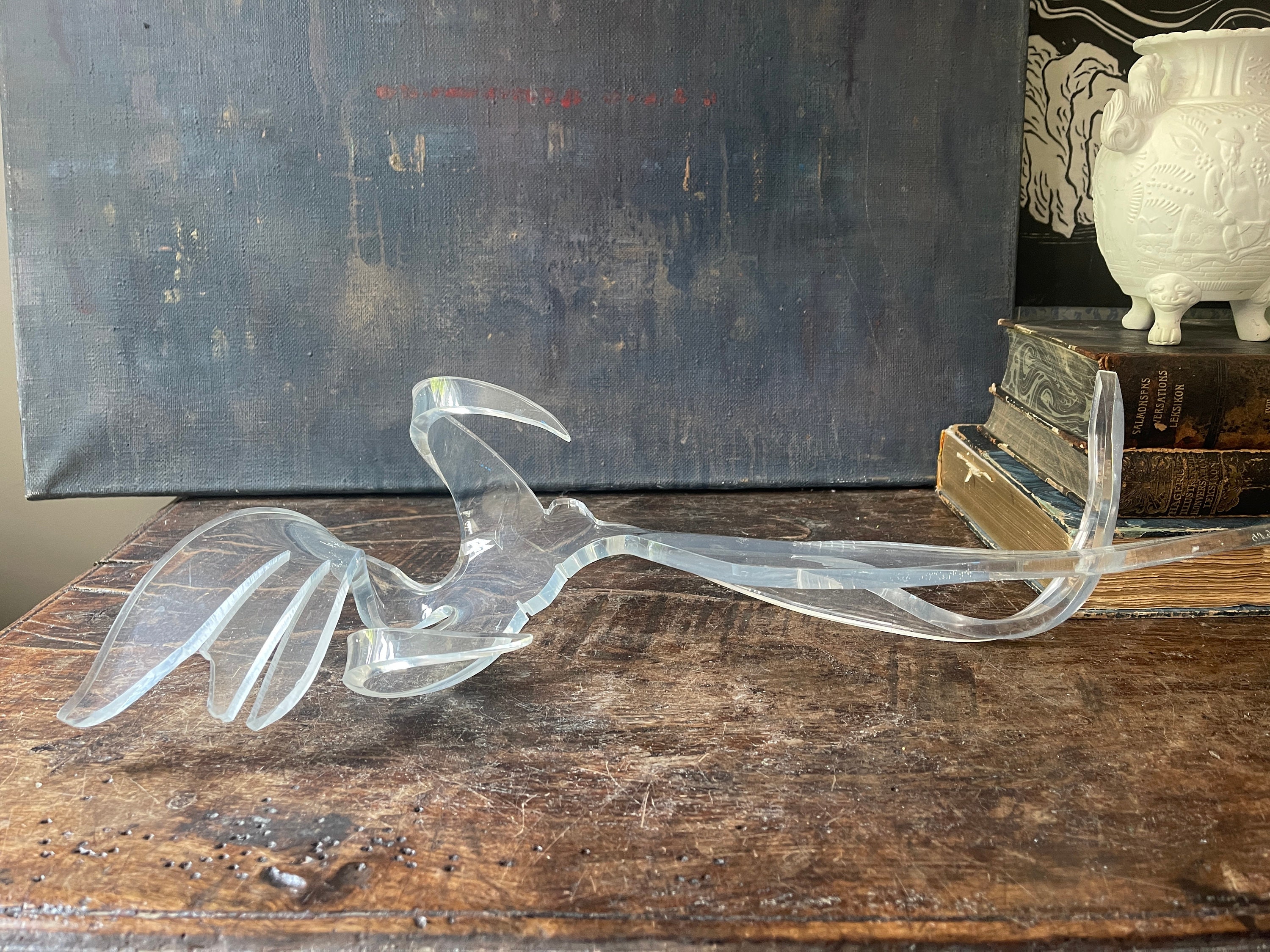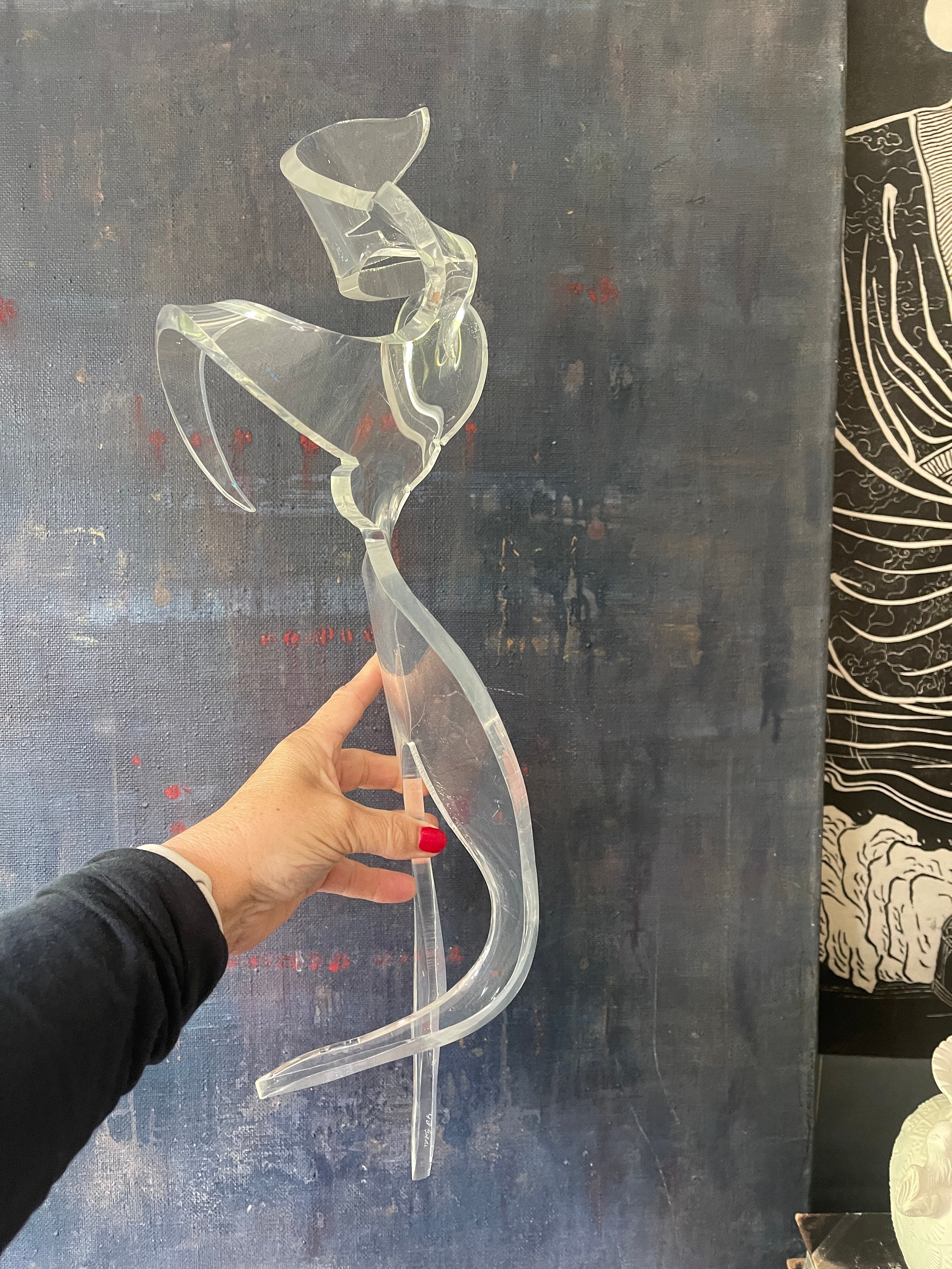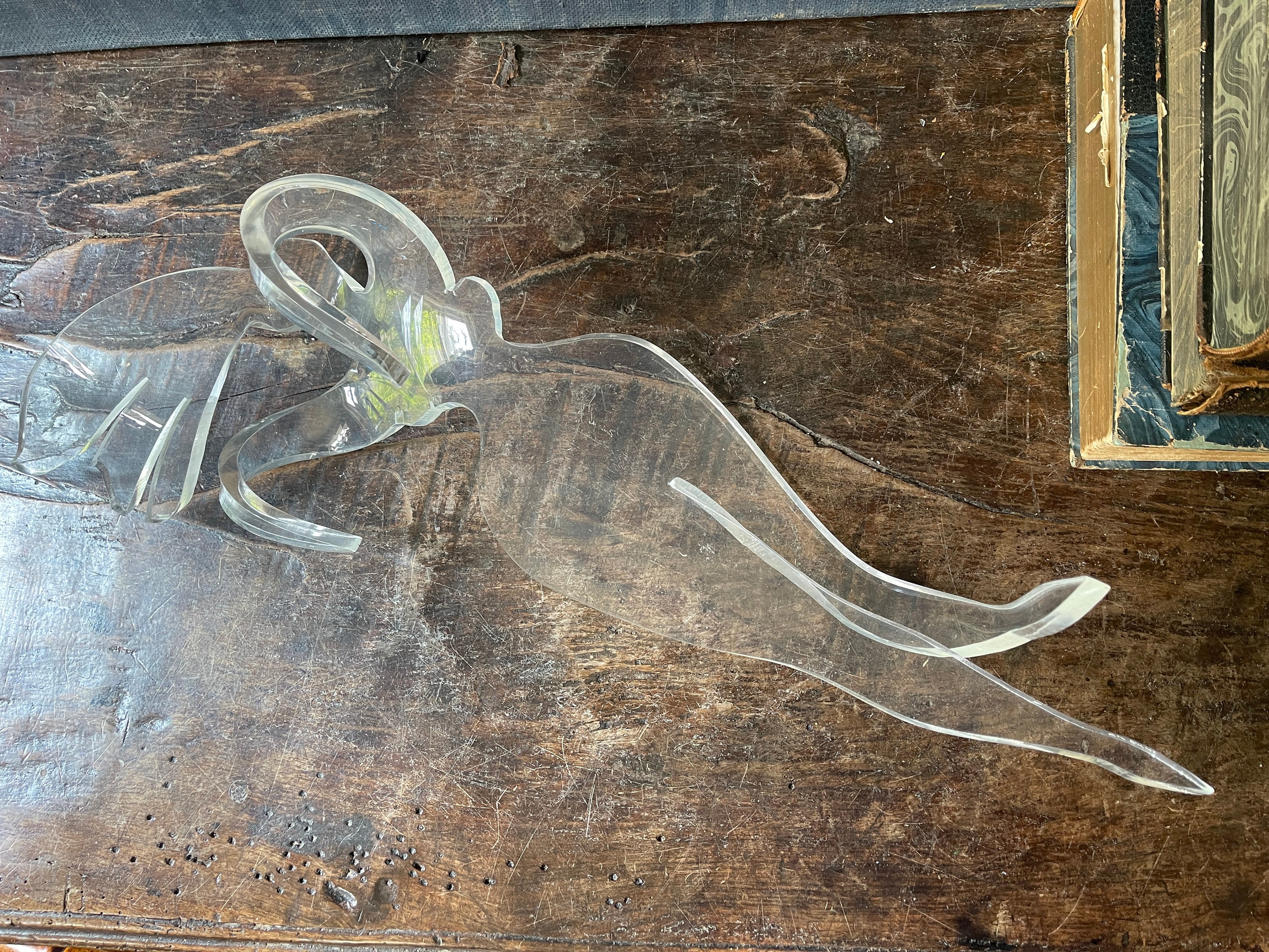 Very interesting and eclectic Lucite sculpture, signed by the artist, along the inside of the leg, it depicts a reclining nude, figure of a female with one knee raised, arms folded, and hair flowing. Made from one piece of Lucide that has been shaped, the nude can lay many different directions and balance. It can lay on its side. It can lay on it back. Perfect piece to put onto a cocktail table, coffee table or entrance table.