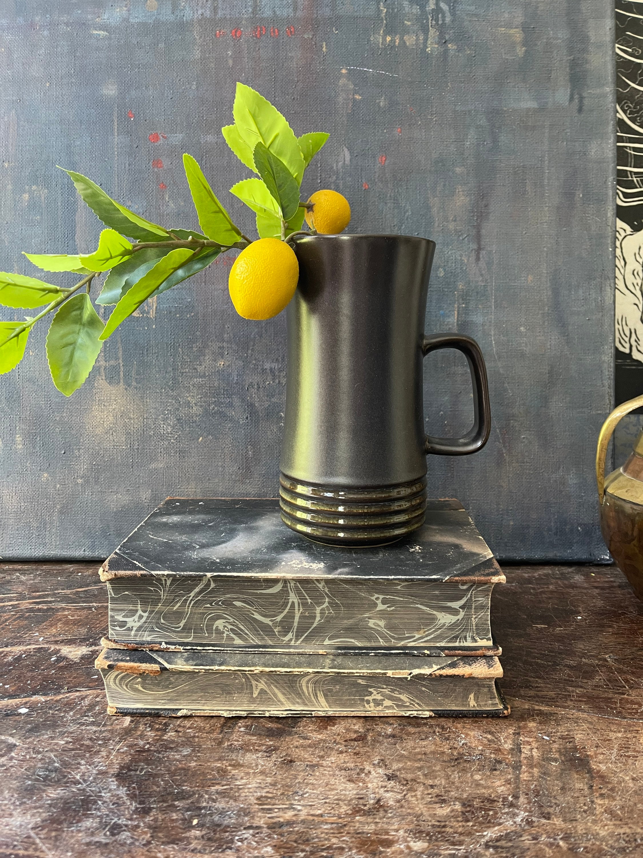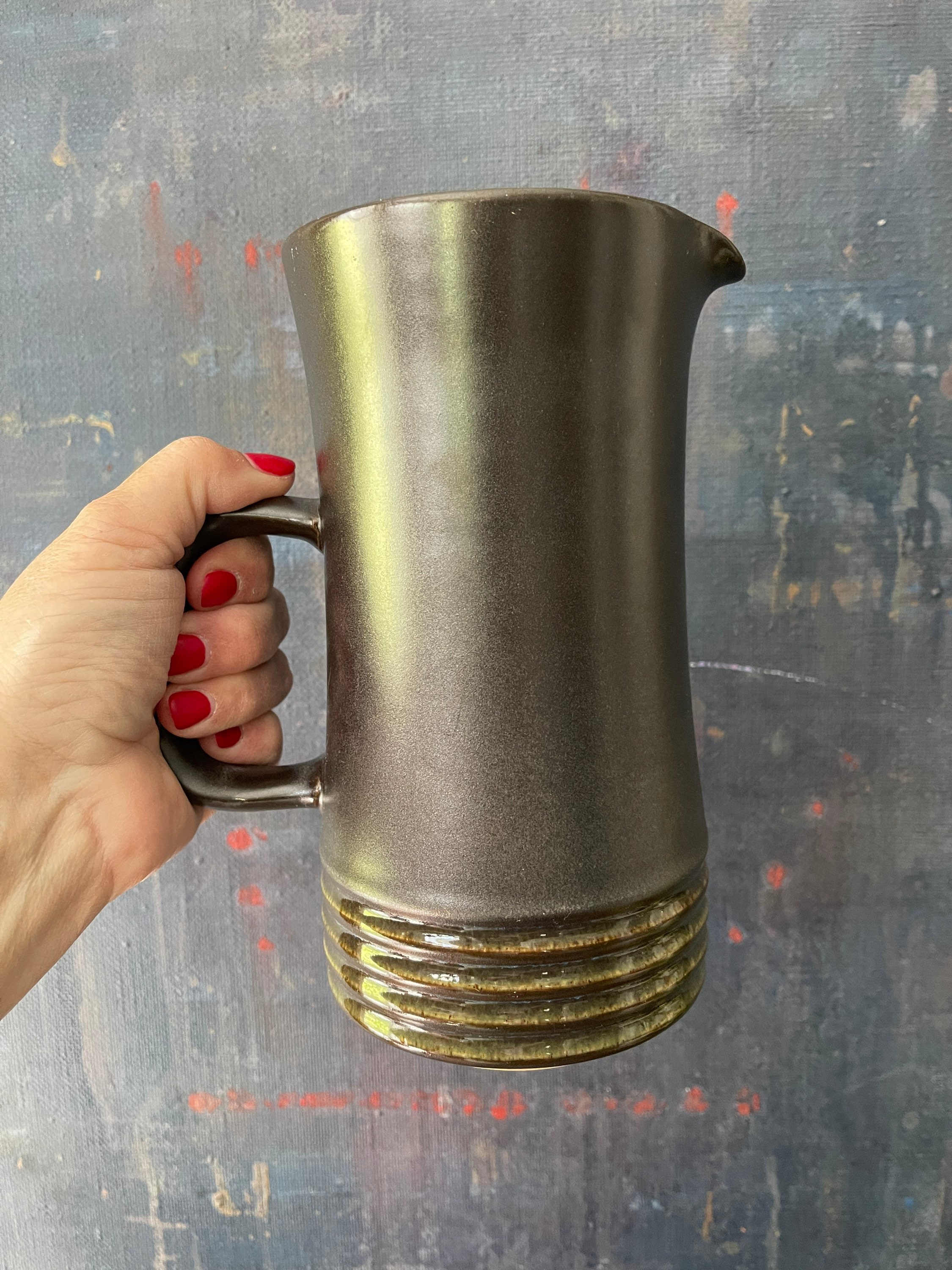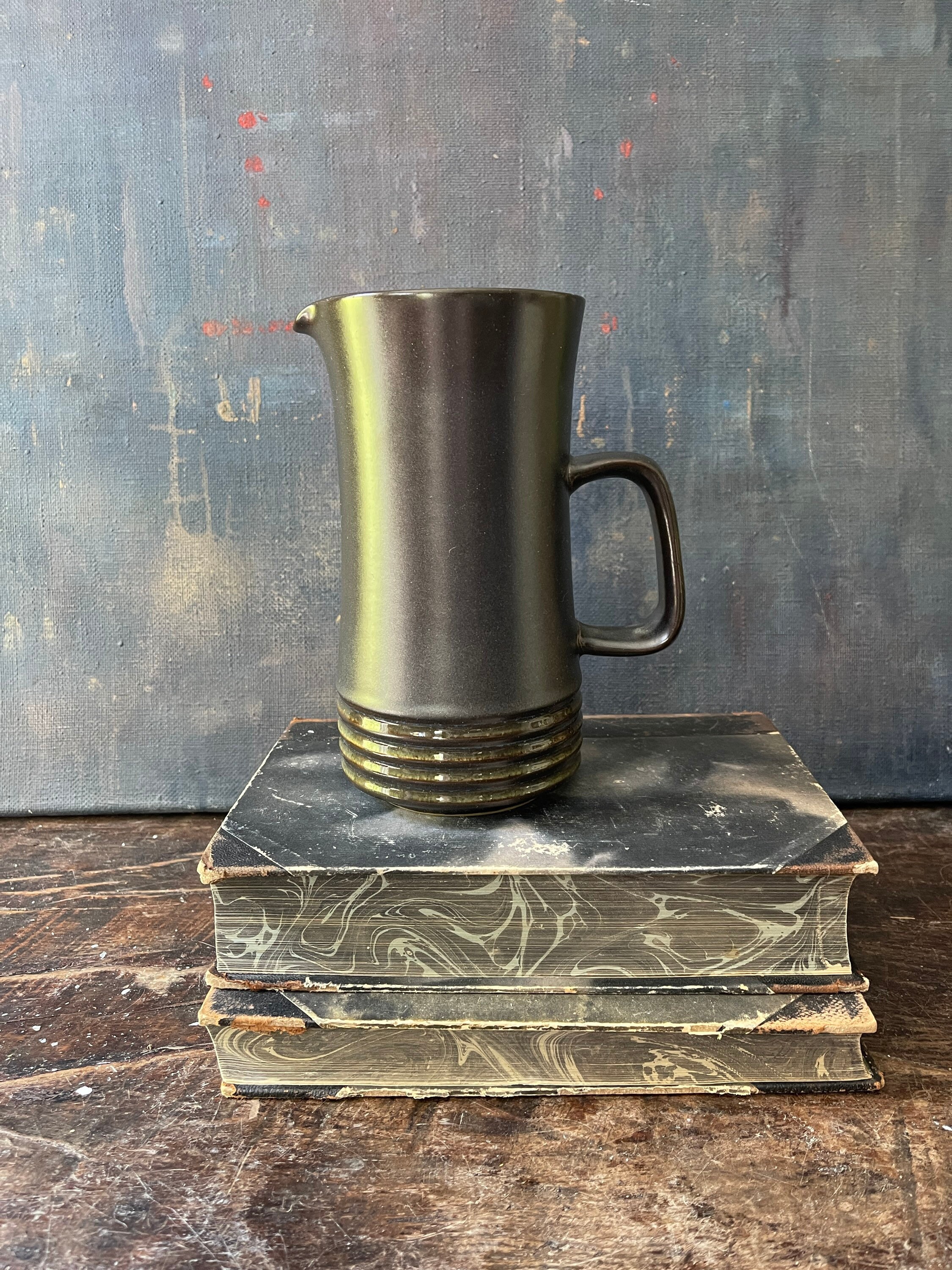 Fantastic, vintage, stoneware pitcher by Denby, this English pitcher accompany the pattern of Langley Bucara. It is a steely gray with a faint blue under glaze, two broad sea foam stripes appear around a ribbed side. Perfect to serve your favorite cocktail or at breakfast with orange juice look