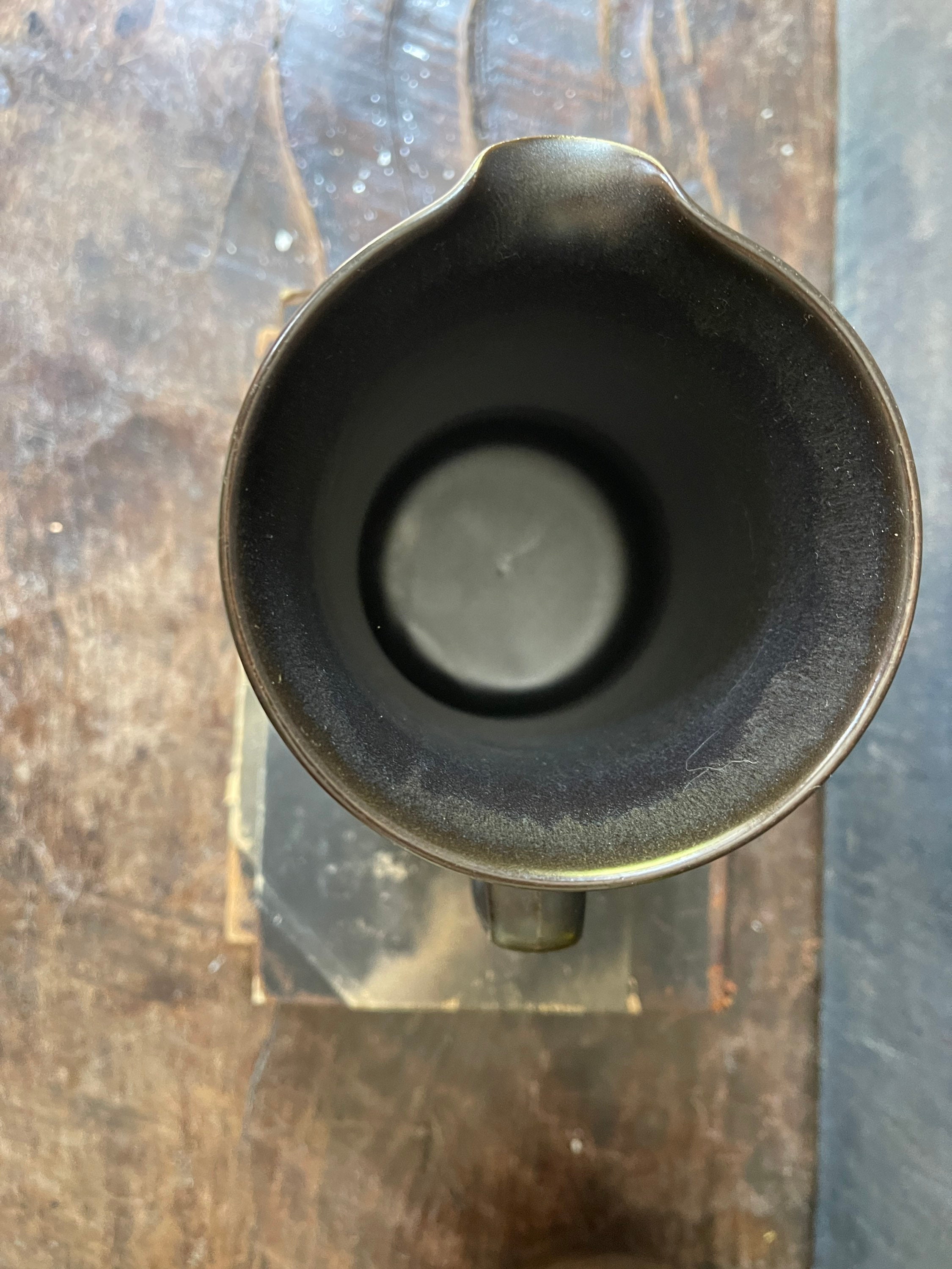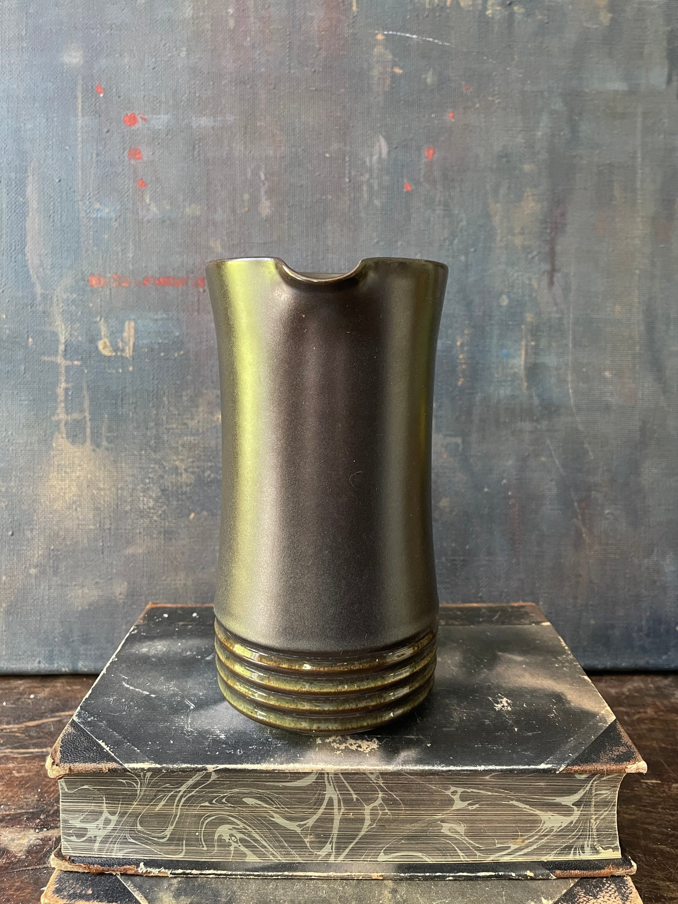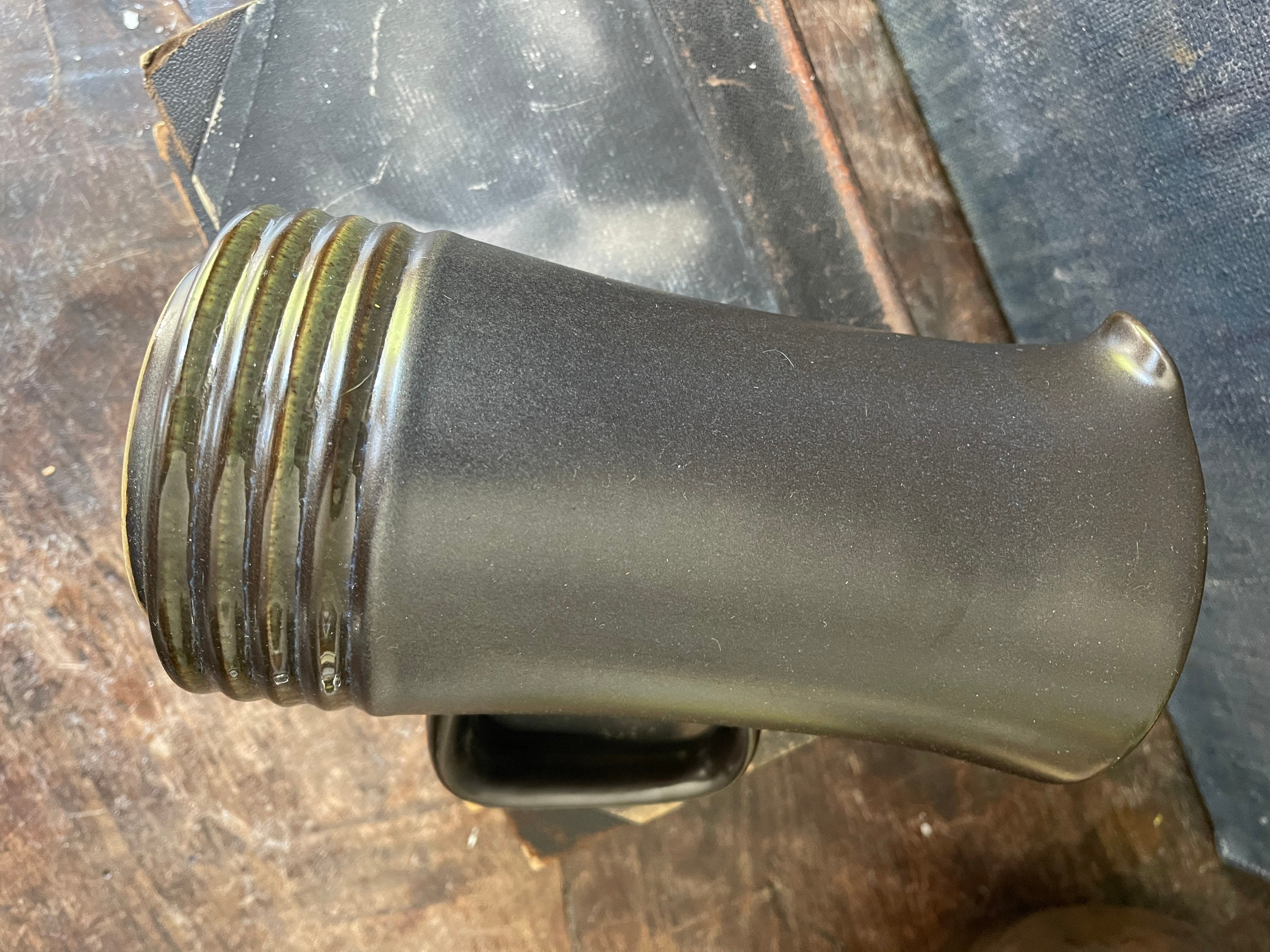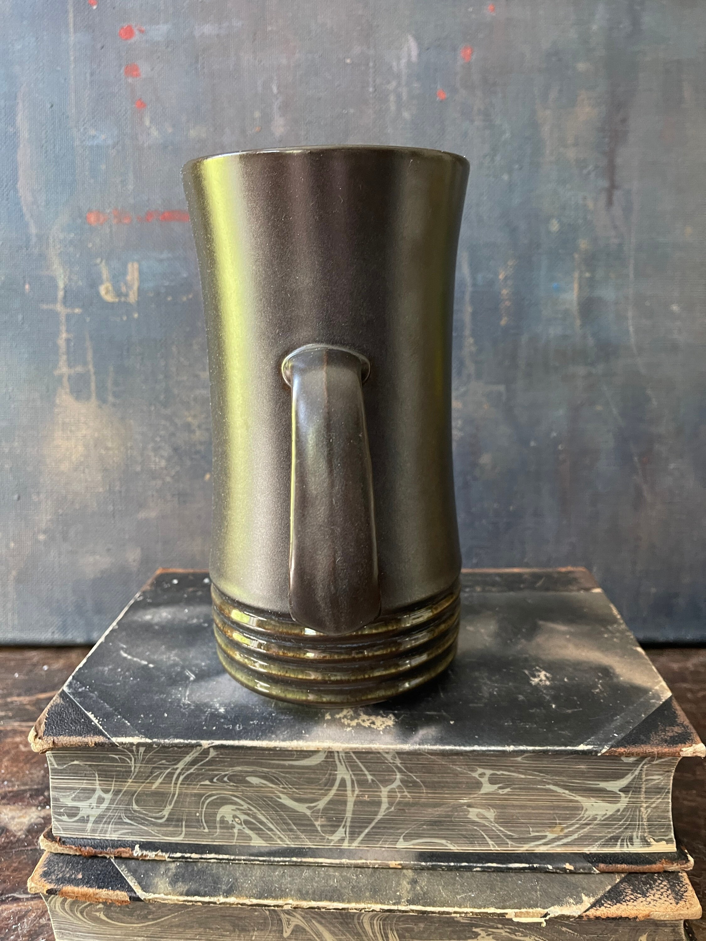 Fantastic, vintage, stoneware pitcher by Denby, this English pitcher accompany the pattern of Langley Bucara. It is a steely gray with a faint blue under glaze, two broad sea foam stripes appear around a ribbed side. Perfect to serve your favorite cocktail or at breakfast with orange juice look