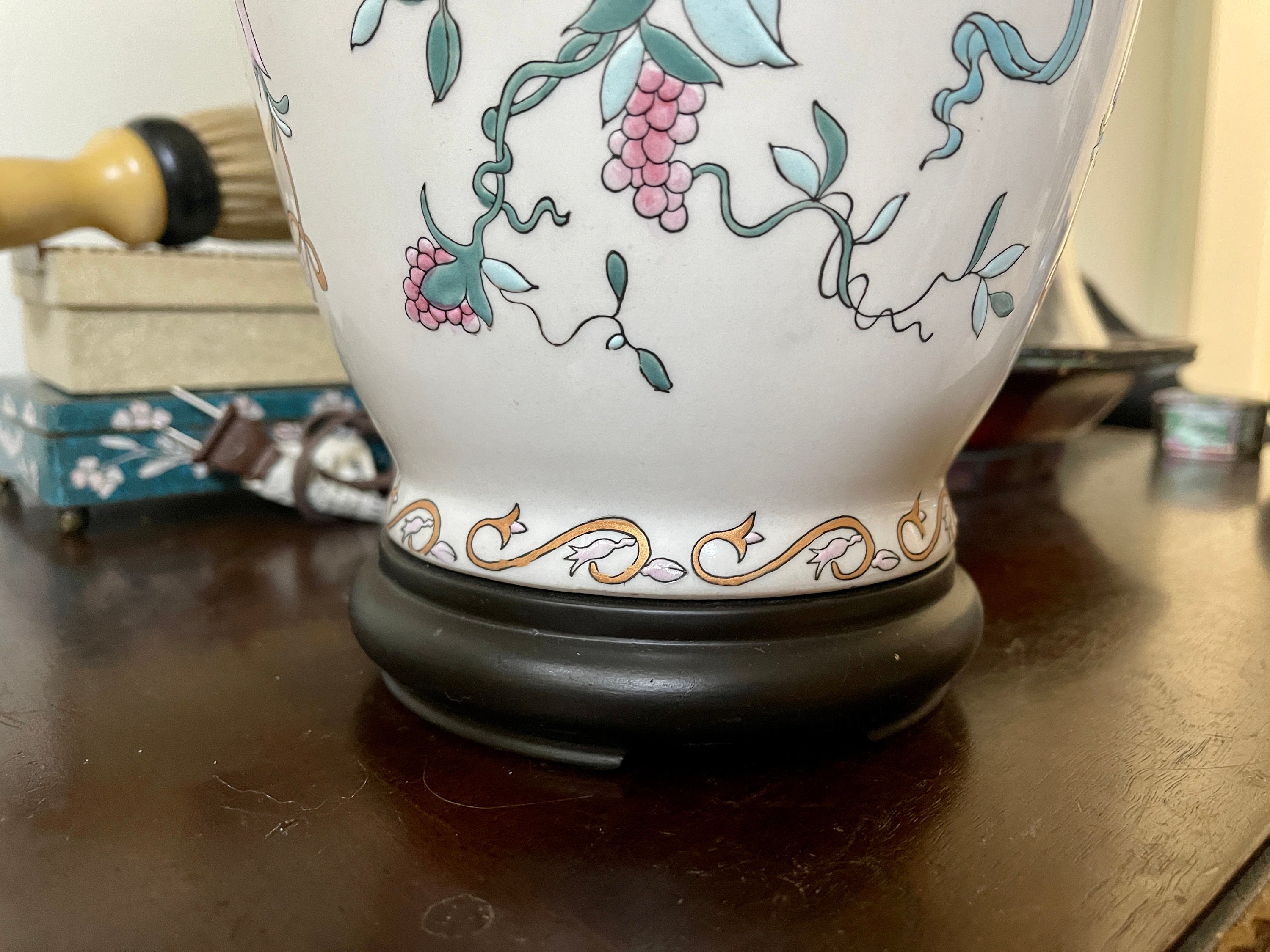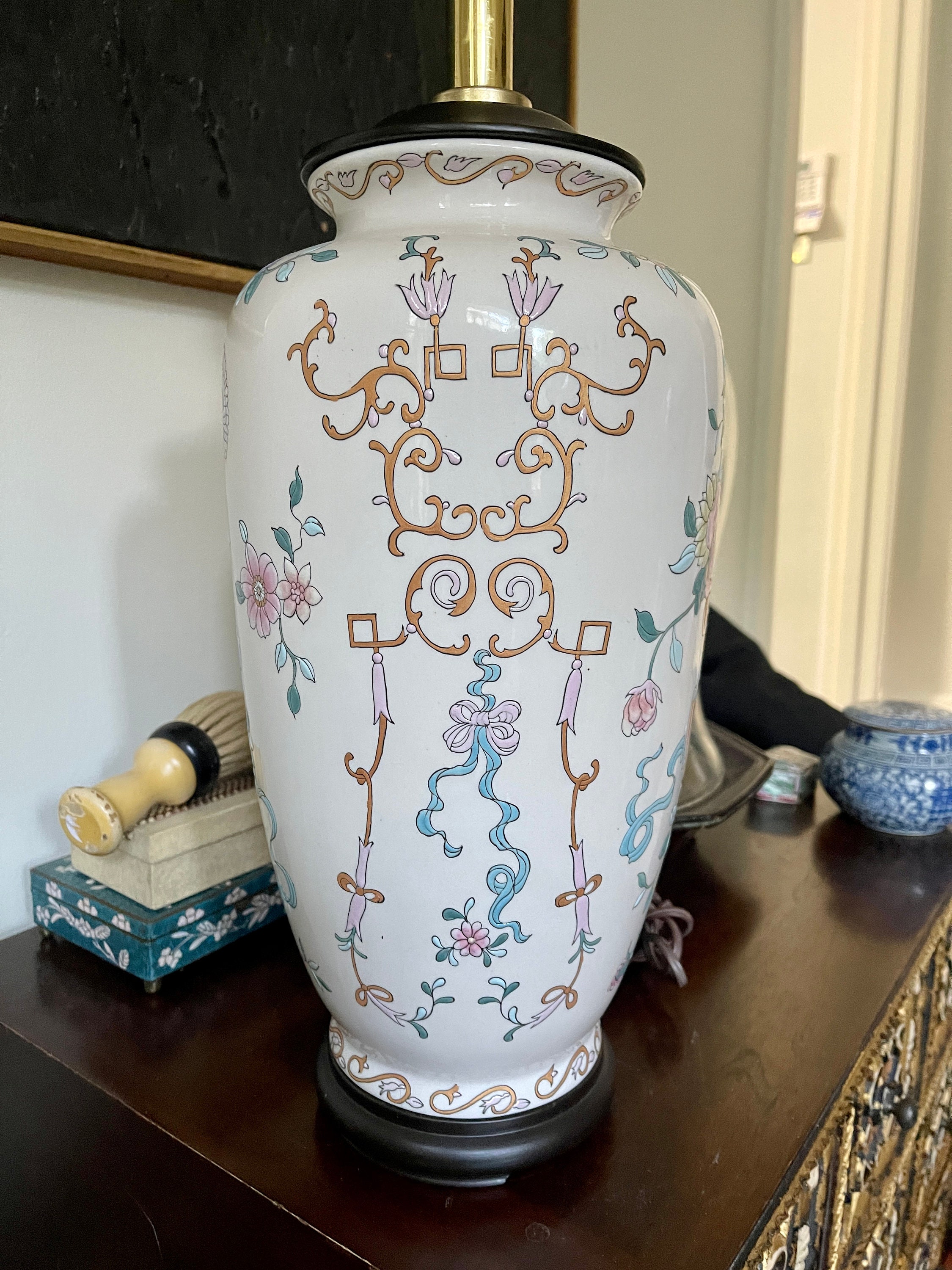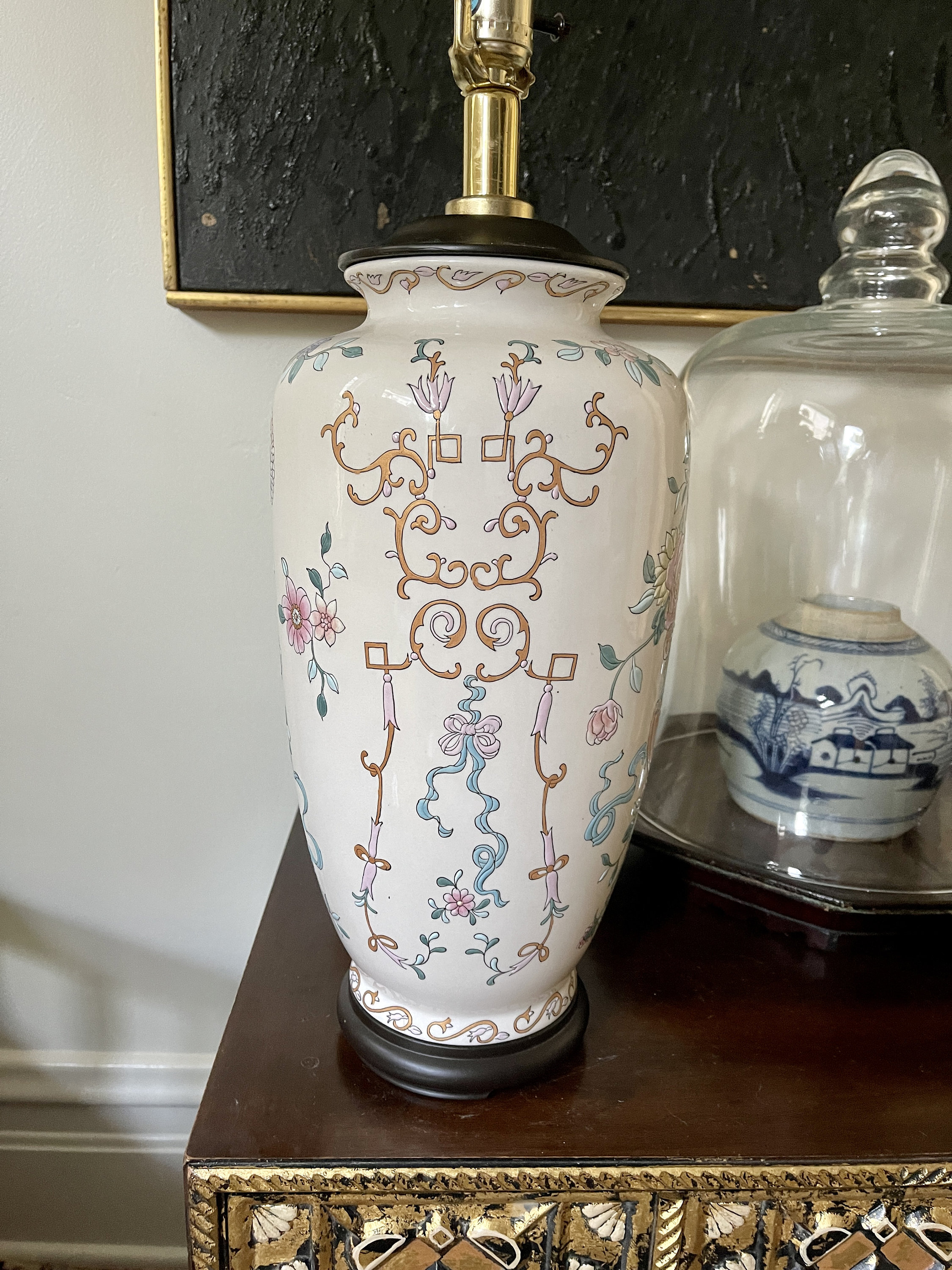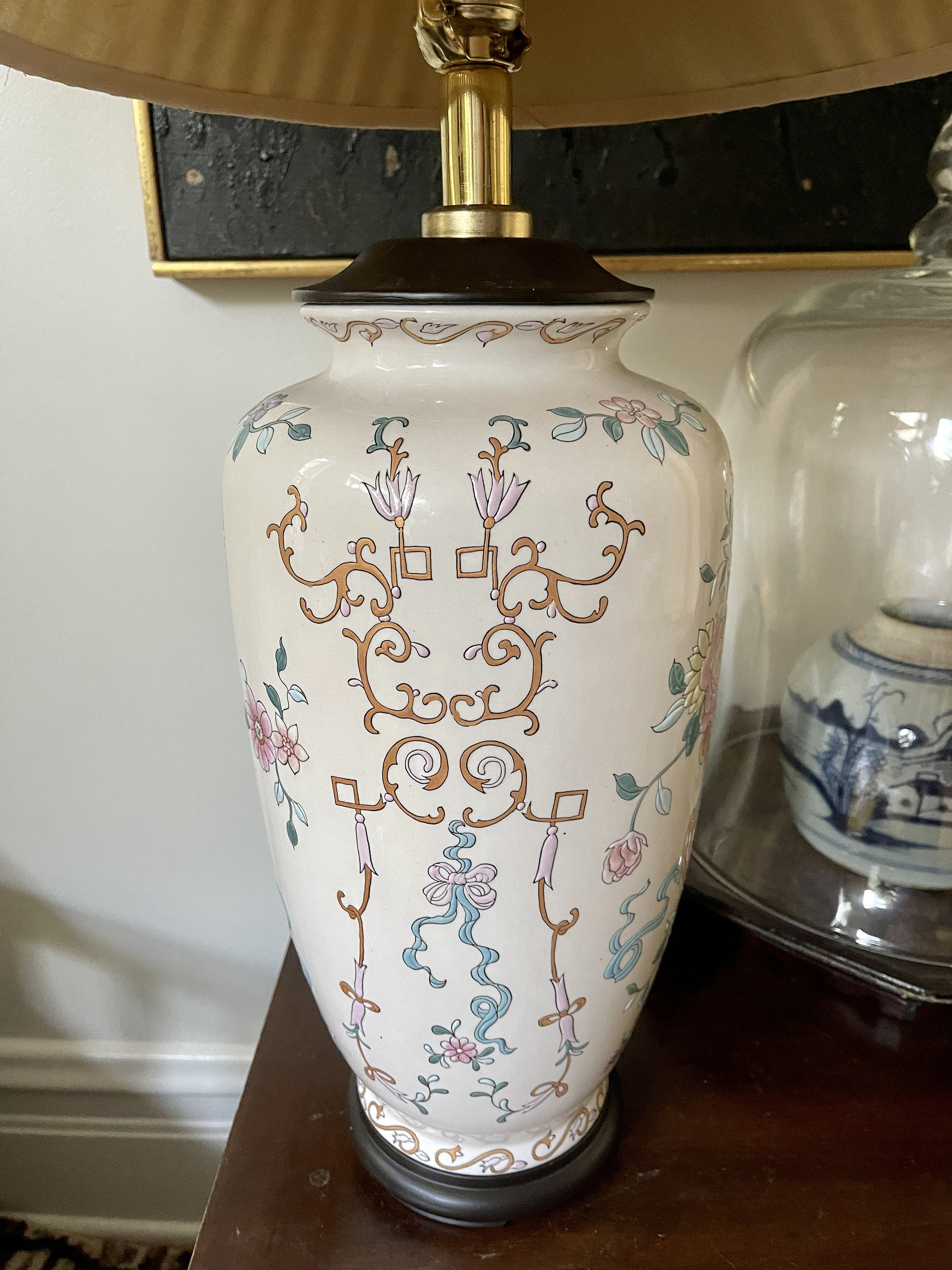 Pretty Asian influenced table lamp, likely dating from the 1990s, this creamy glaze has a floral and scrolling vine and ribbon pattern that wraps around the body of the lamp. On two sides of the lamp, floral blooms bursting from an urn, while the alternating sides have scrolling design and scrolling ribbons. The blooms are in shades of rosy pink, soft, yellow, and lavender with green stems. Light blue ribbon design can be seen scrolling from the urn and on the alternating sides. The ceramic lamp body upon an espresso brown stained Asian influenced base. It is a nice piece that is predominantly neutral with soft pastel colors.