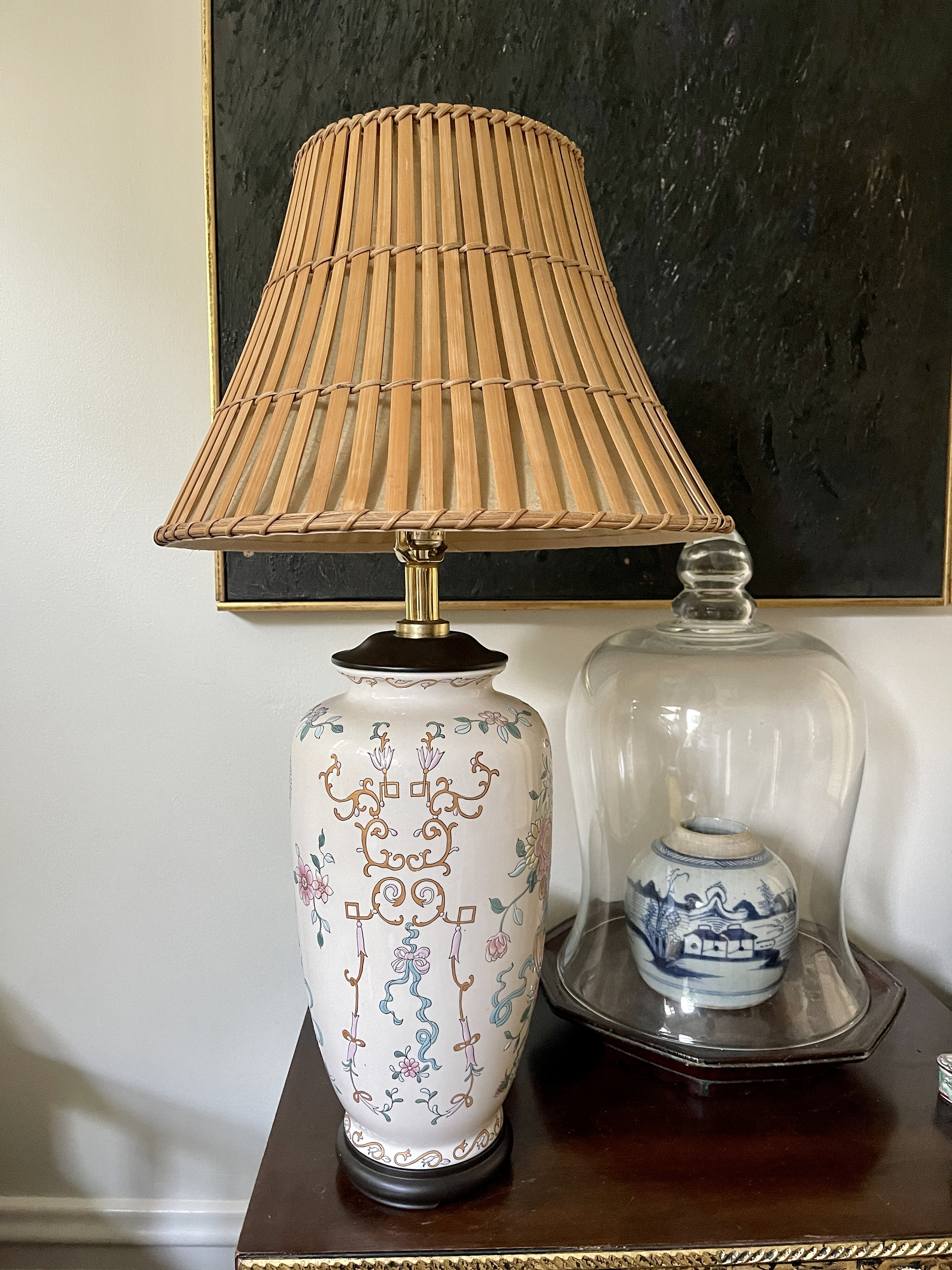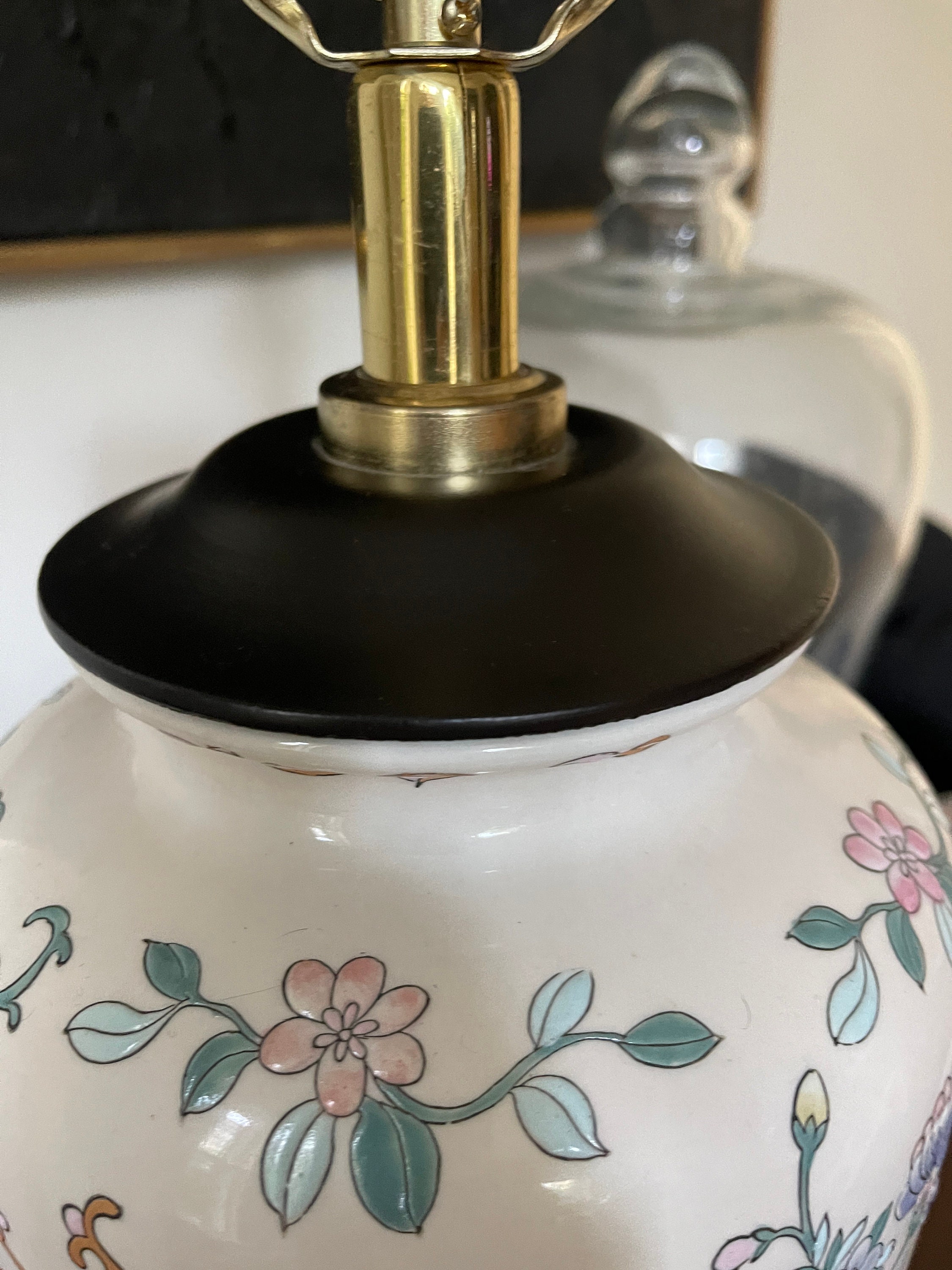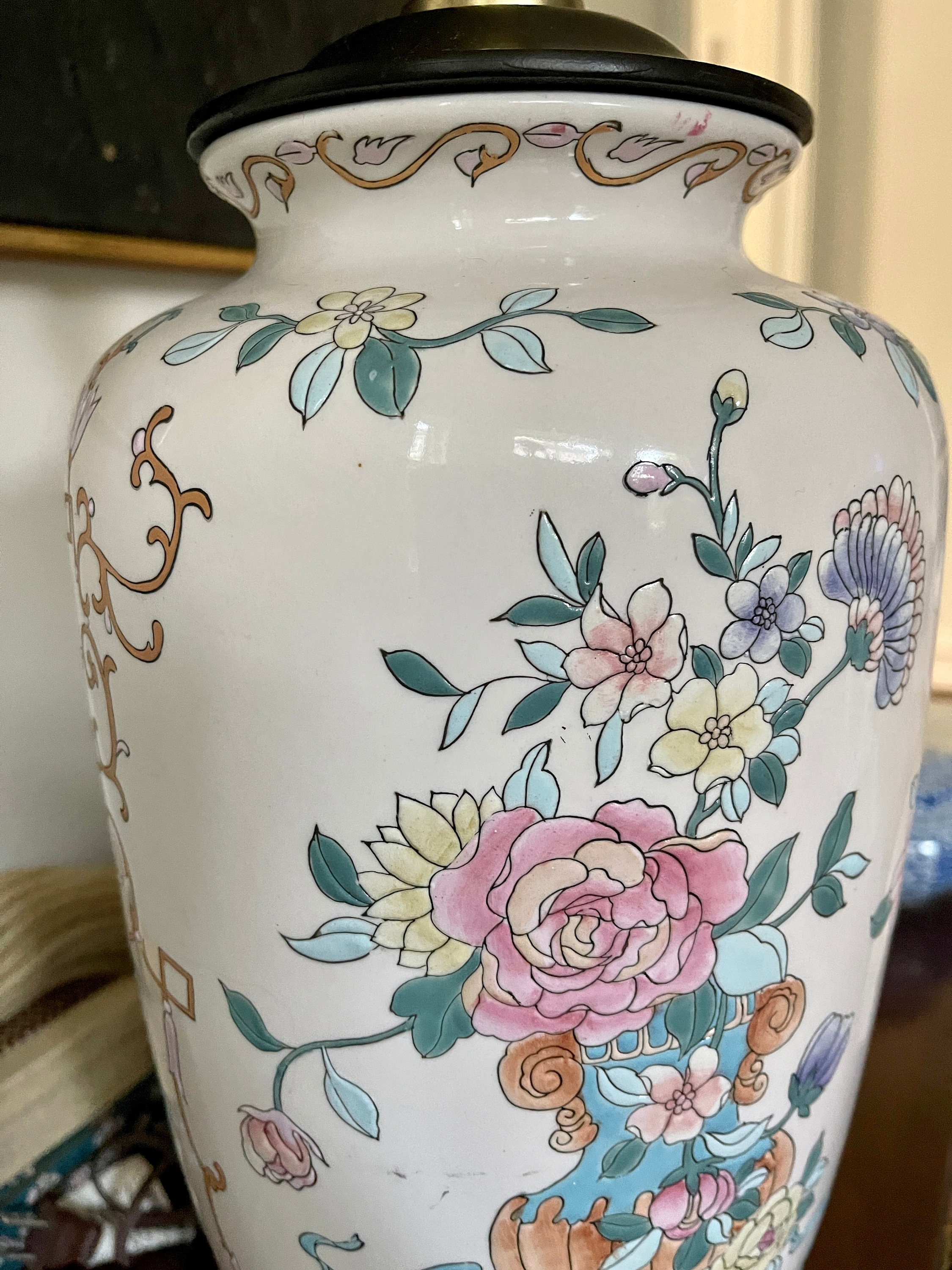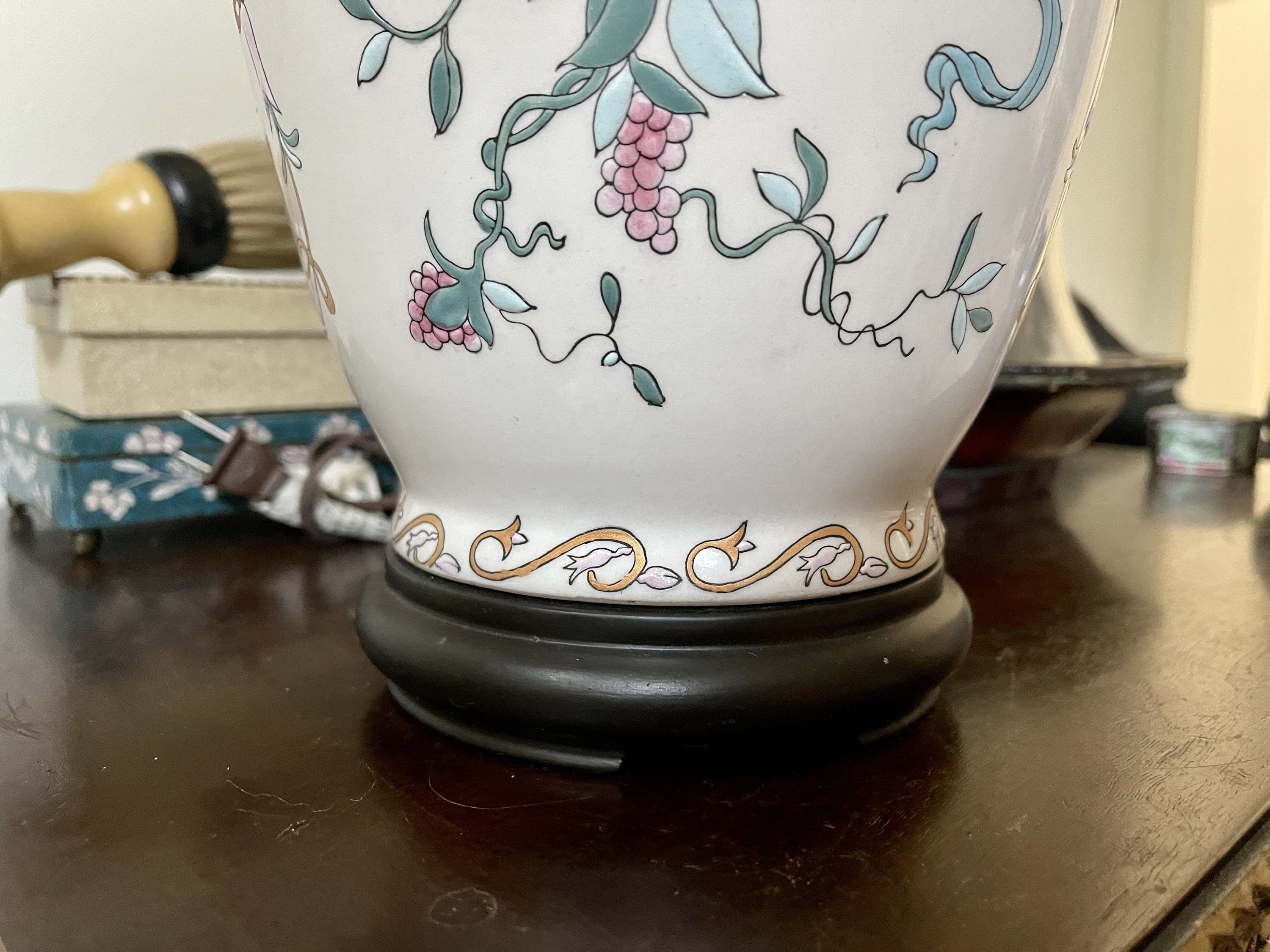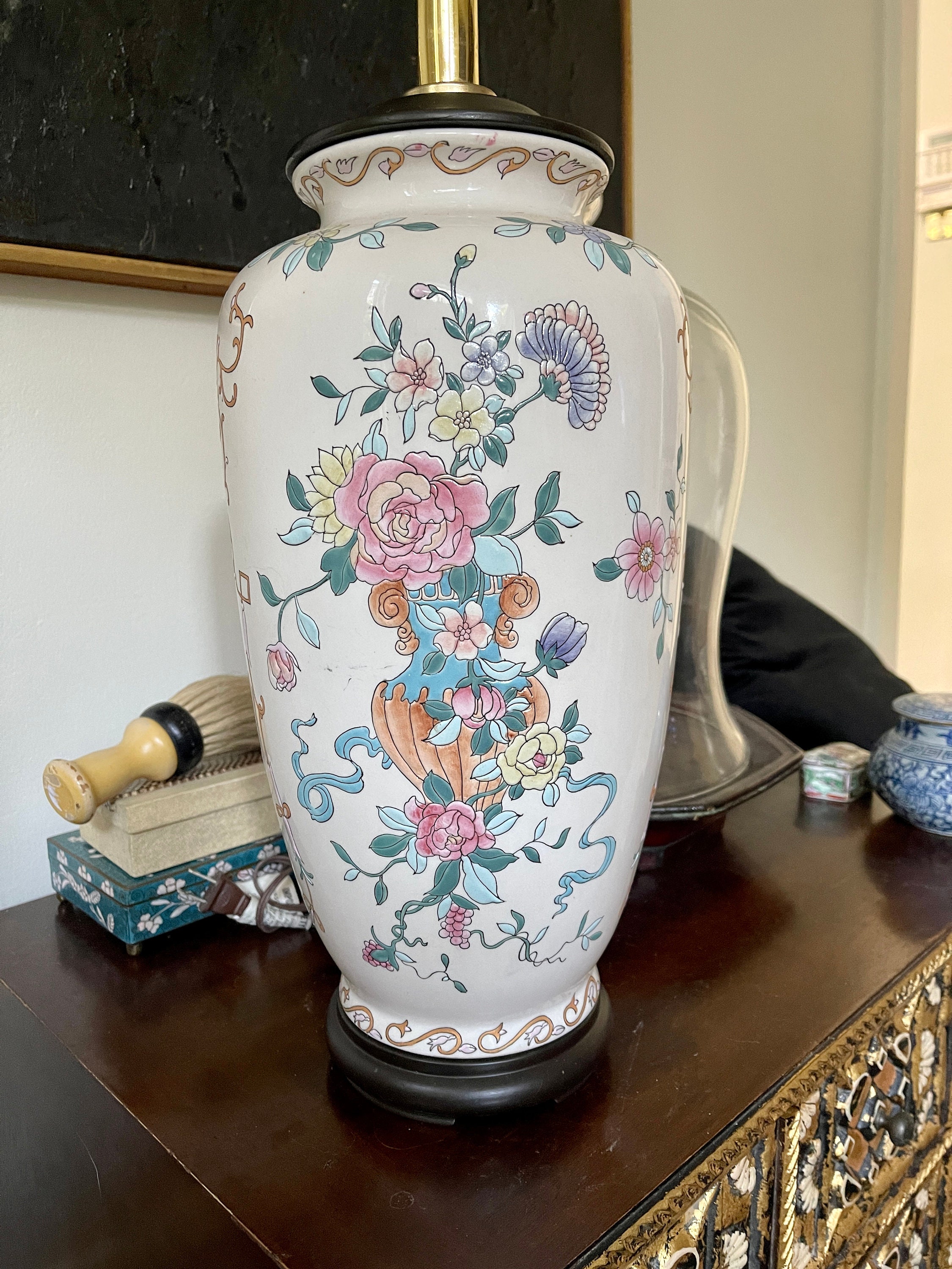 Pretty Asian influenced table lamp, likely dating from the 1990s, this creamy glaze has a floral and scrolling vine and ribbon pattern that wraps around the body of the lamp. On two sides of the lamp, floral blooms bursting from an urn, while the alternating sides have scrolling design and scrolling ribbons. The blooms are in shades of rosy pink, soft, yellow, and lavender with green stems. Light blue ribbon design can be seen scrolling from the urn and on the alternating sides. The ceramic lamp body upon an espresso brown stained Asian influenced base. It is a nice piece that is predominantly neutral with soft pastel colors.