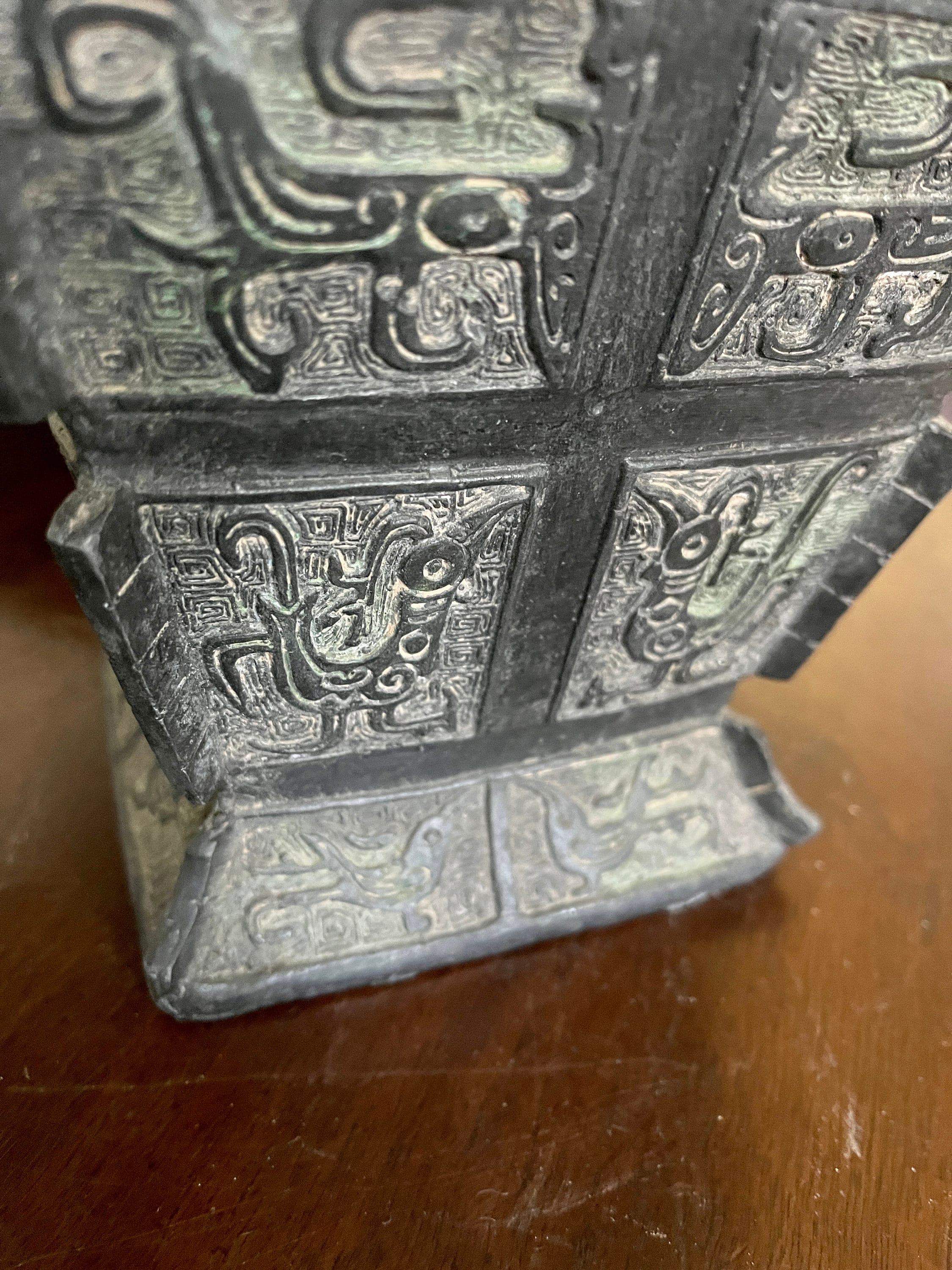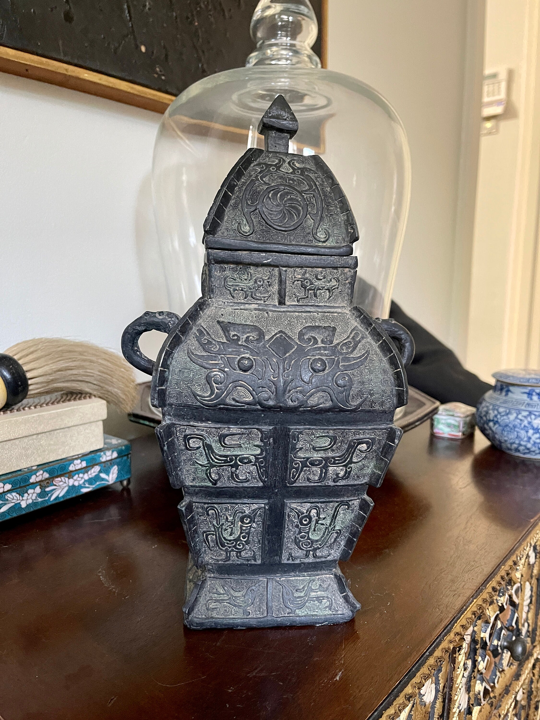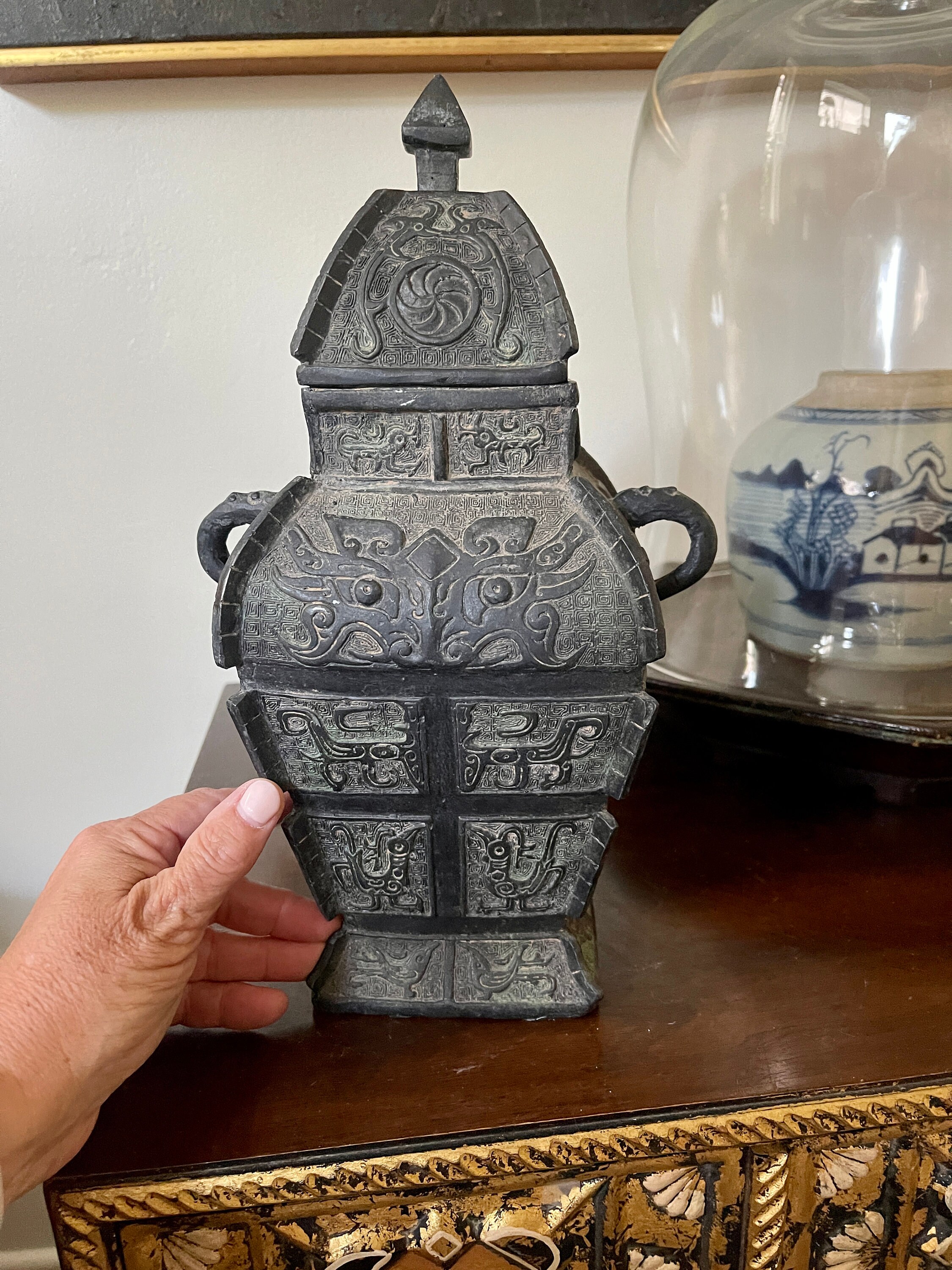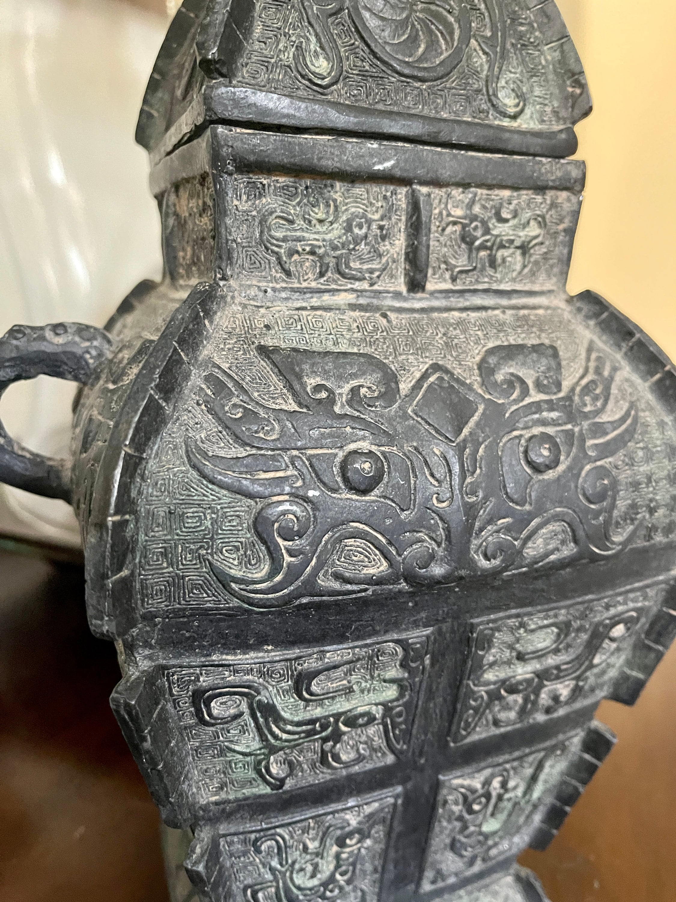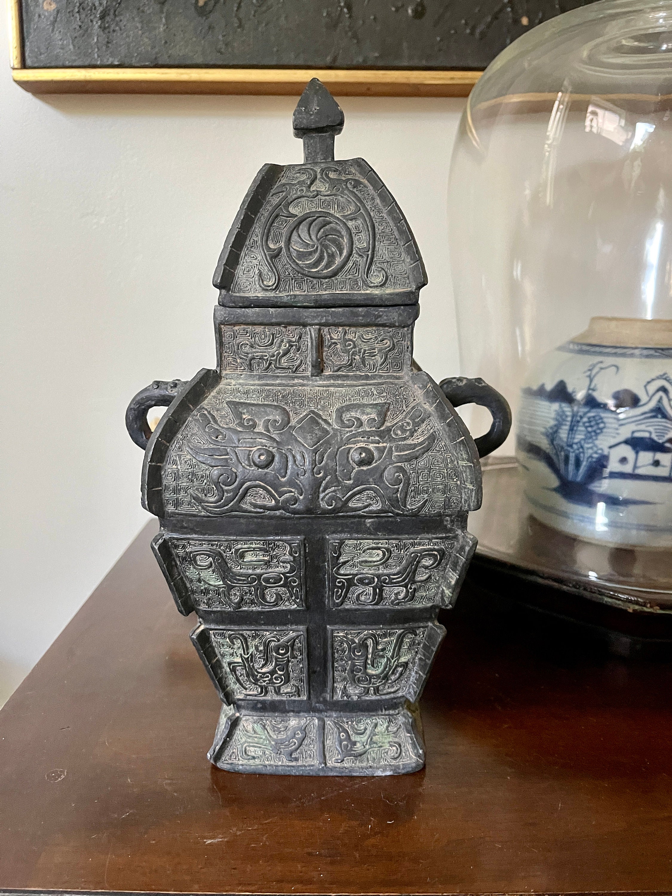 Fabulous old bronze, metal vessel, depicting, animals, and panels around the side. The style is very James Mont in appeal. Two handles on the side with fines. Running down the corners of the vessel, the piece is finished with a lid with a triangular knob, a top the lid. A piece has an overall Verda greed or tarnish vibe, it is black in color with green verdigris or oxidation in the design of the piece. We believe that this would date to the mid 20th century or early 20th century and would be a reproduction from an ancient vessel, as designs and symbols have been reused throughout Chinese history This is a fabulous piece for display and is a work of art on its own