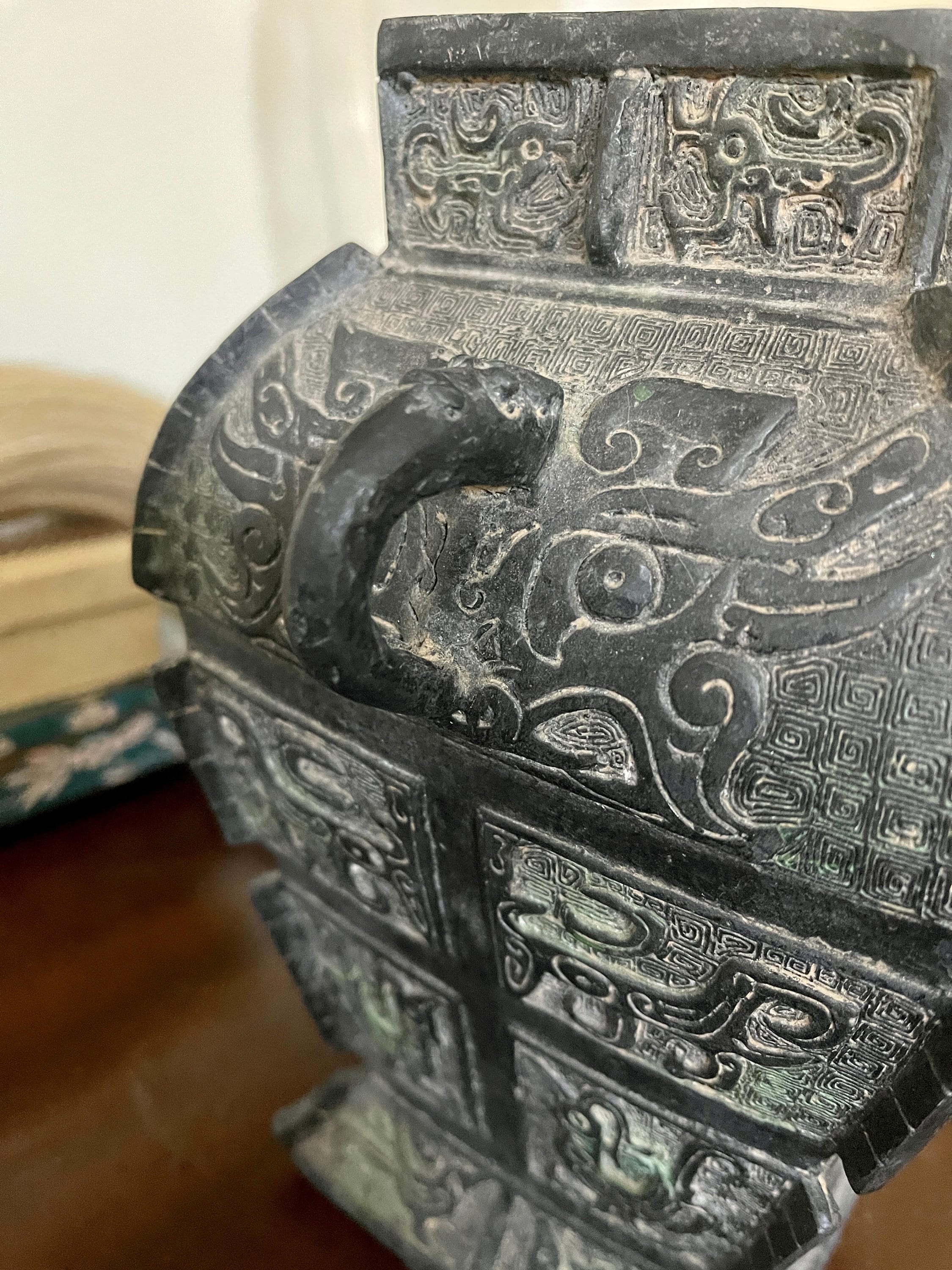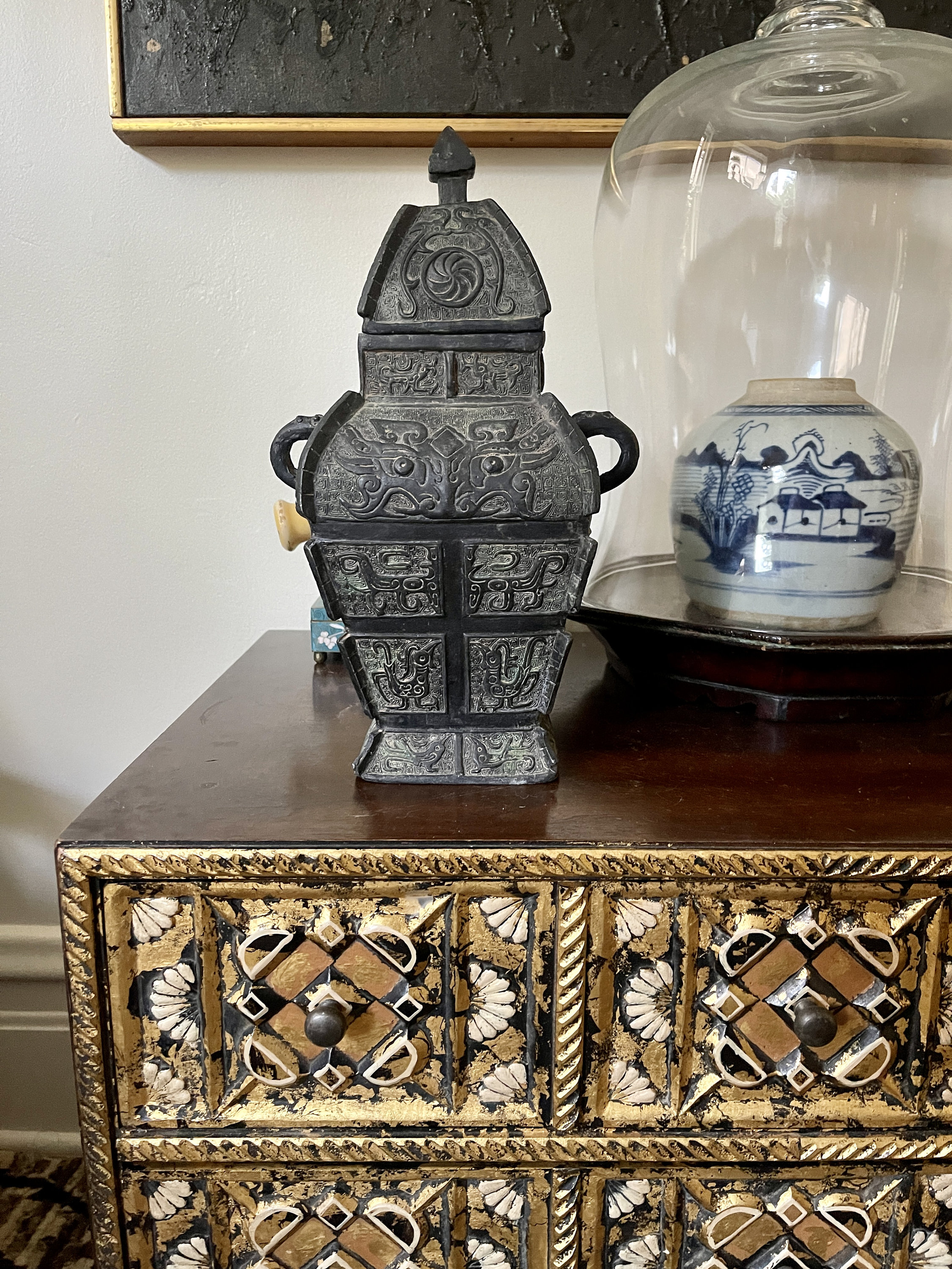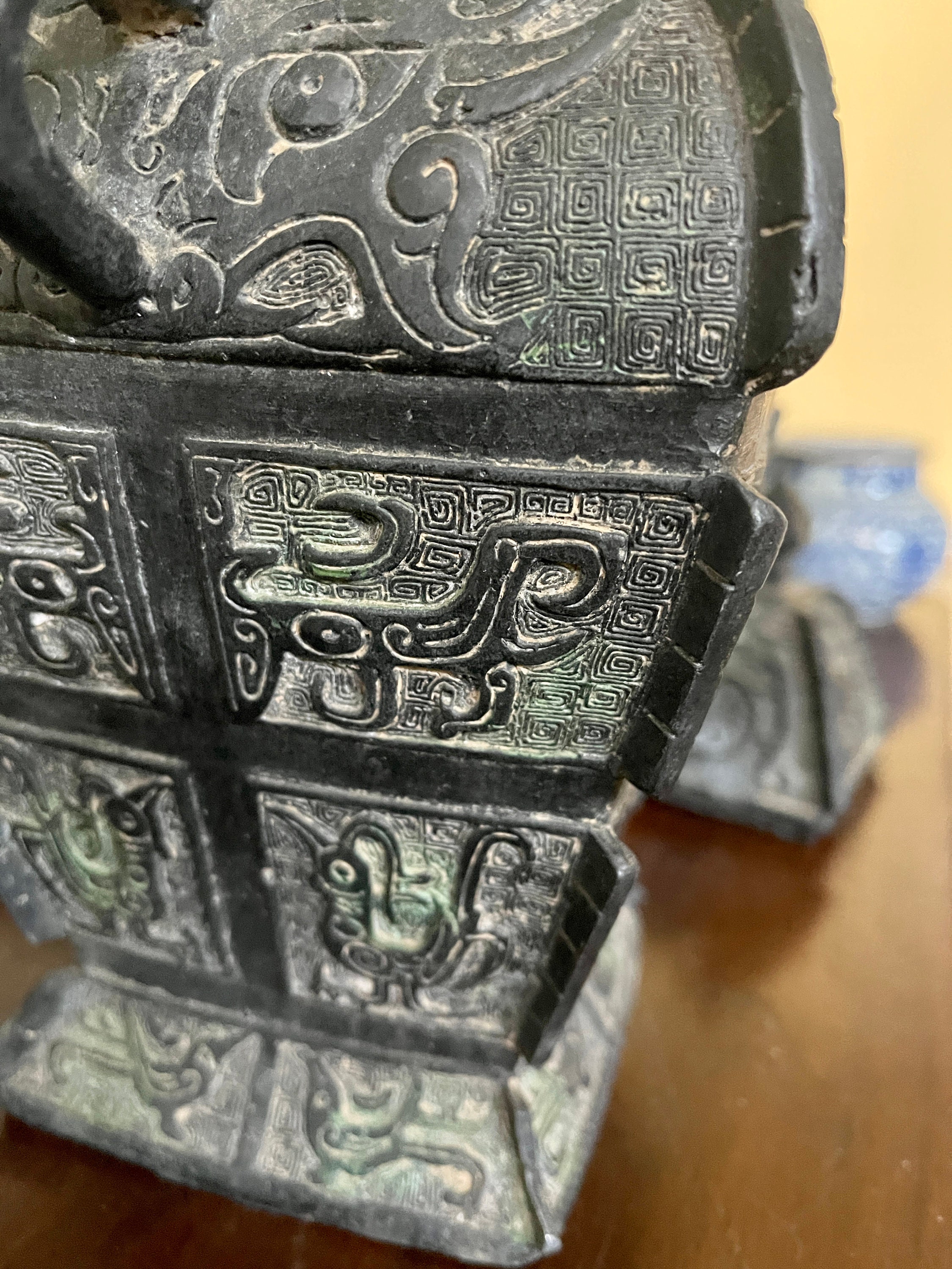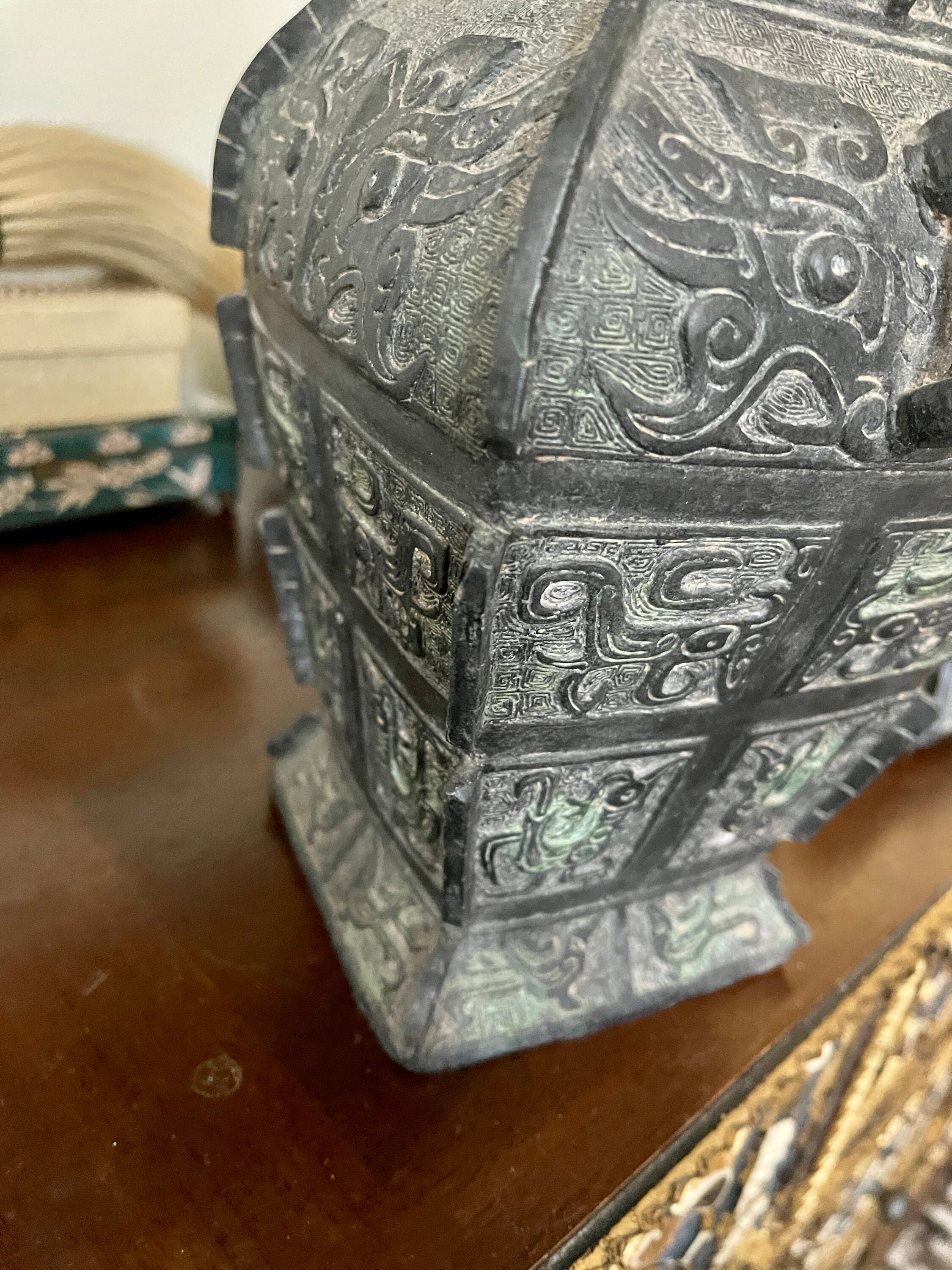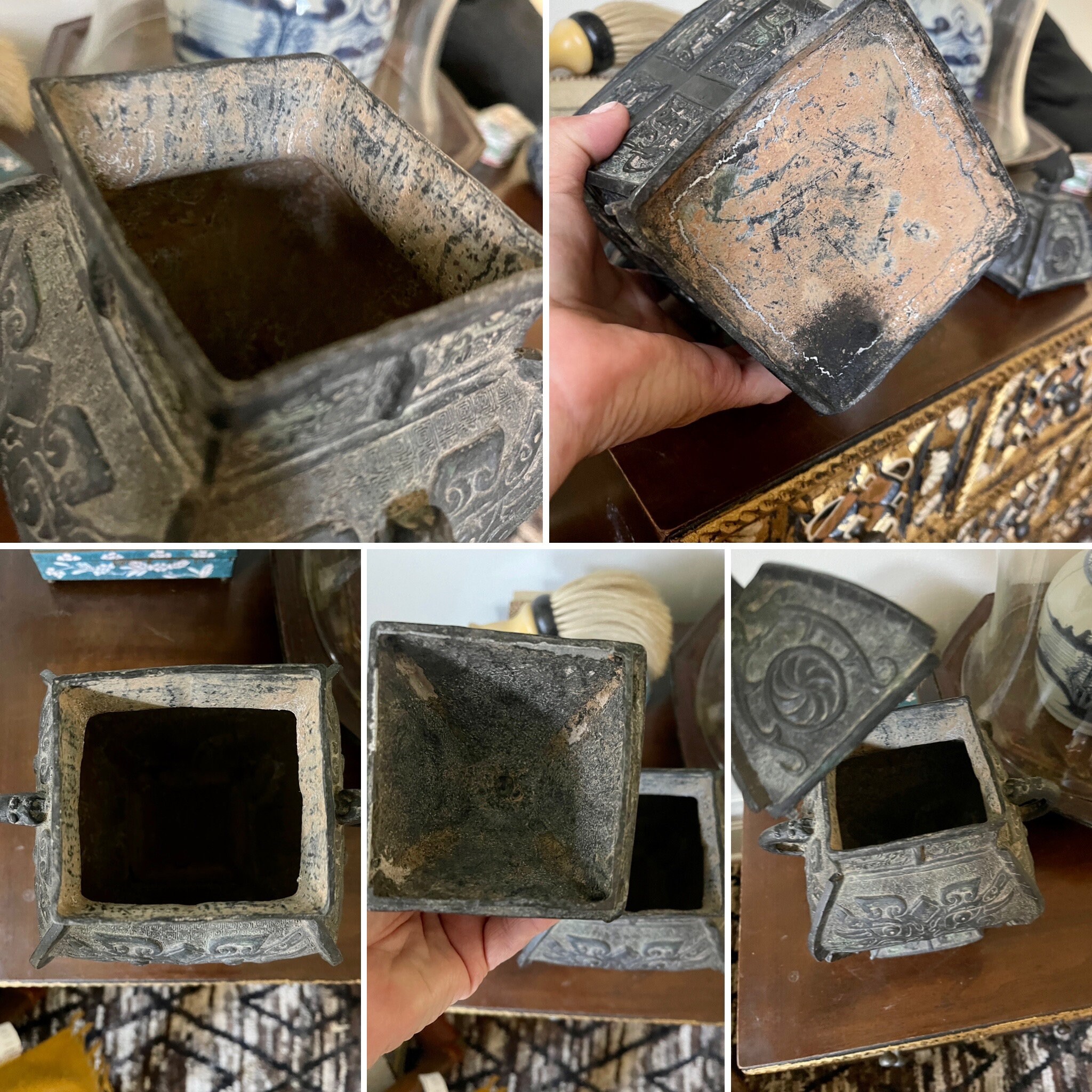 Fabulous old bronze, metal vessel, depicting, animals, and panels around the side. The style is very James Mont in appeal. Two handles on the side with fines. Running down the corners of the vessel, the piece is finished with a lid with a triangular knob, a top the lid. A piece has an overall Verda greed or tarnish vibe, it is black in color with green verdigris or oxidation in the design of the piece. We believe that this would date to the mid 20th century or early 20th century and would be a reproduction from an ancient vessel, as designs and symbols have been reused throughout Chinese history This is a fabulous piece for display and is a work of art on its own