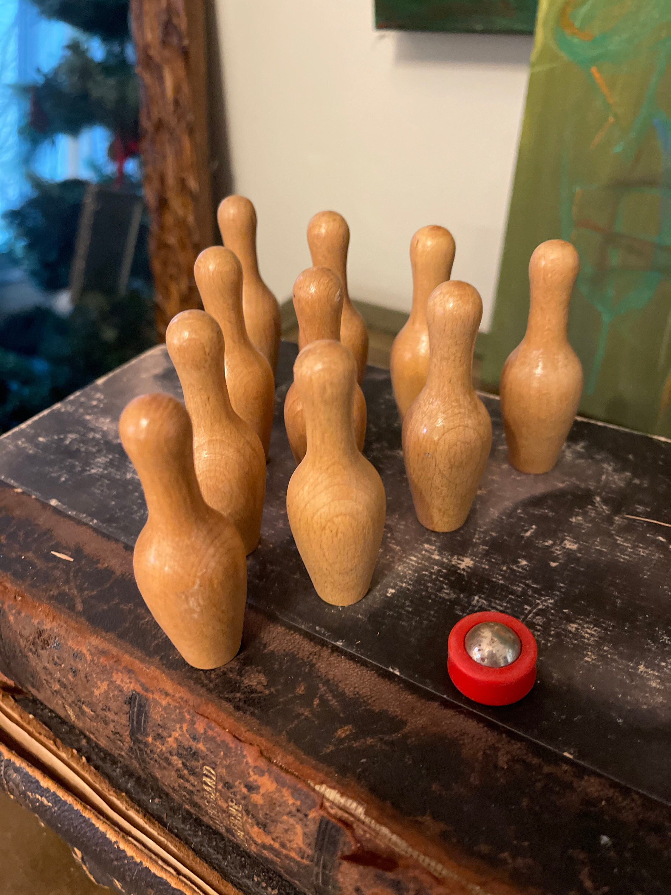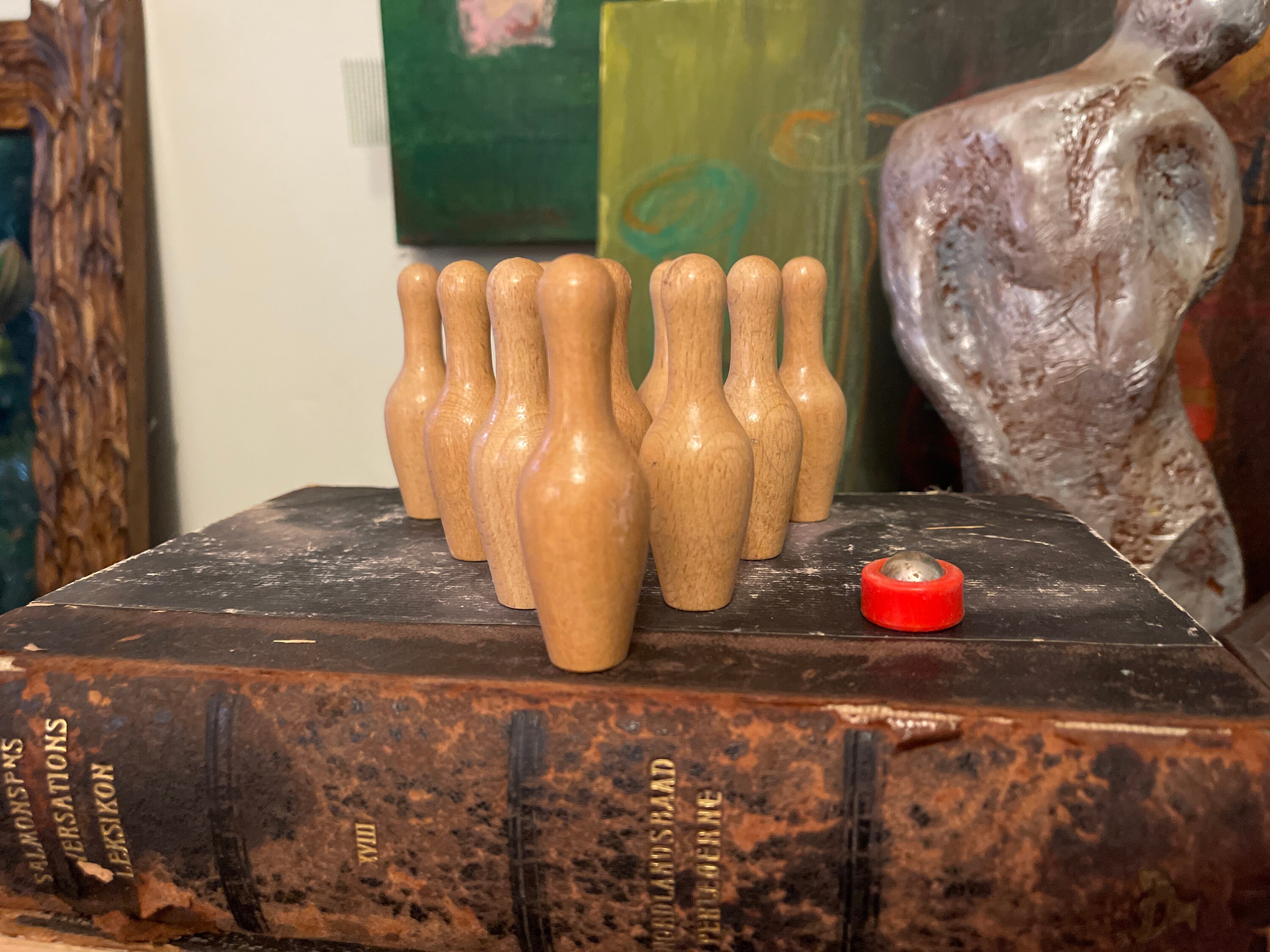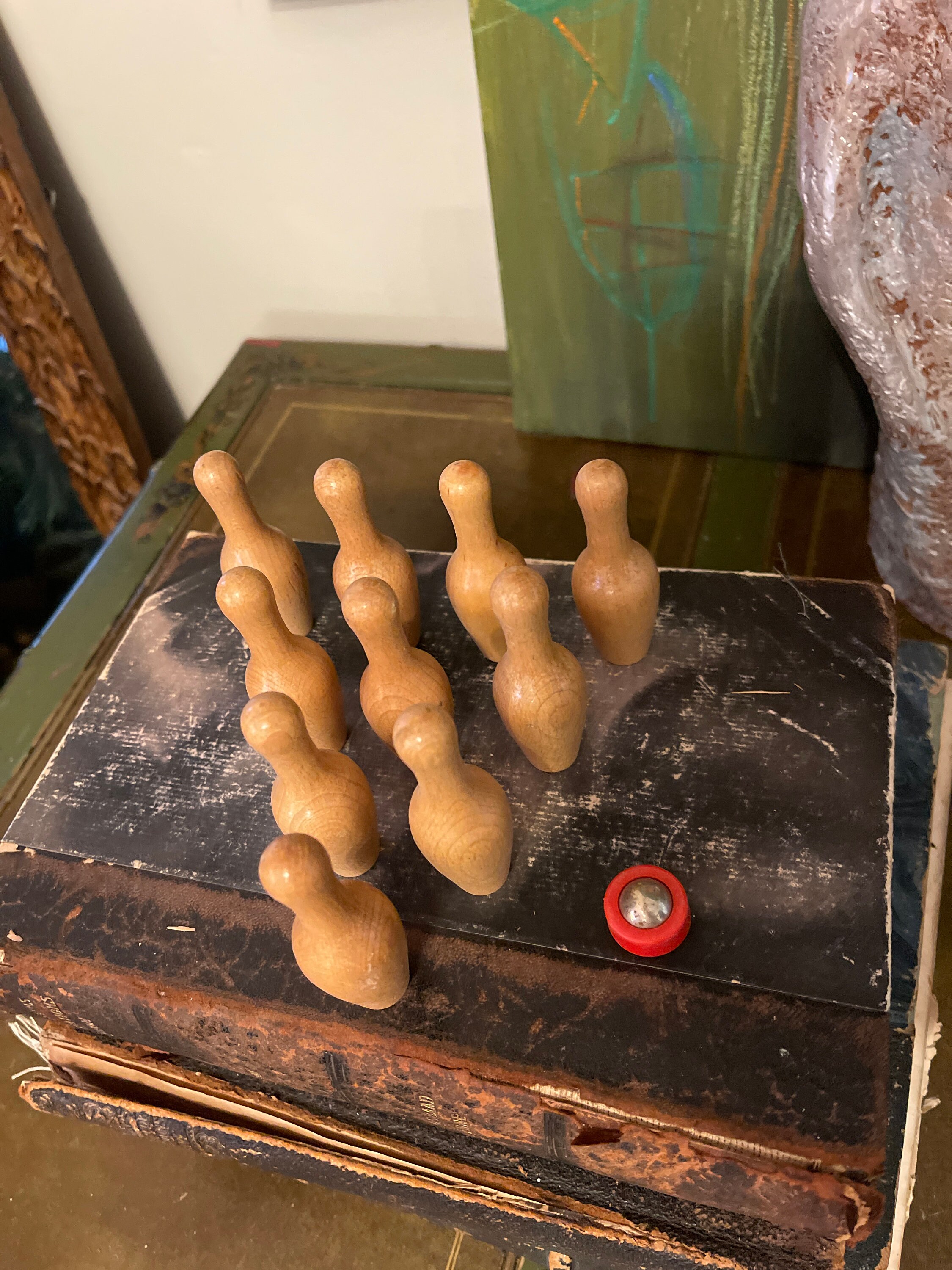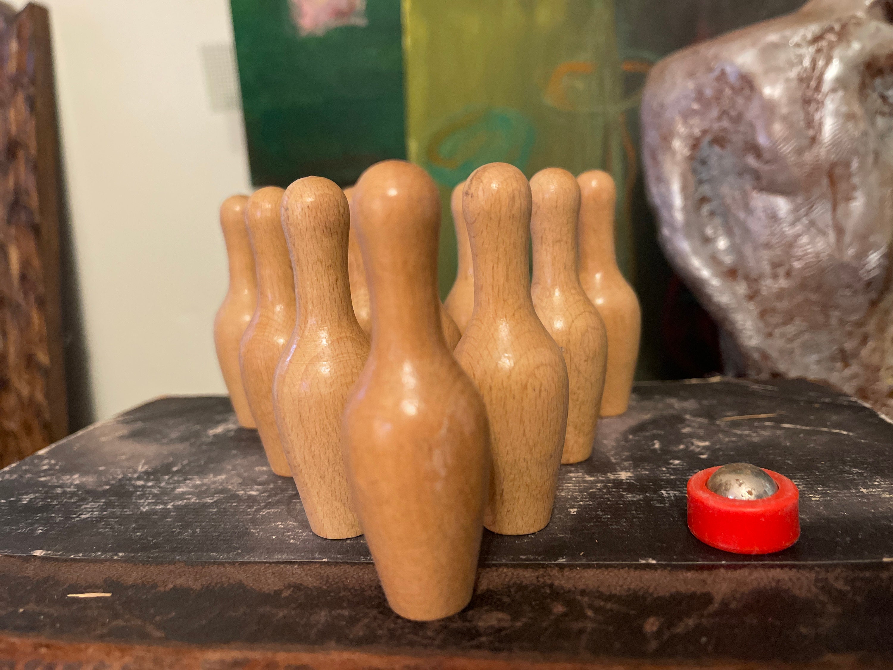 Vintage bowling pin, toy set, includes 10 pins and a metal ball that skims the surface to roll into the pins. We think this makes an adorable display for a bowling lover, especially in their office or on a desk.