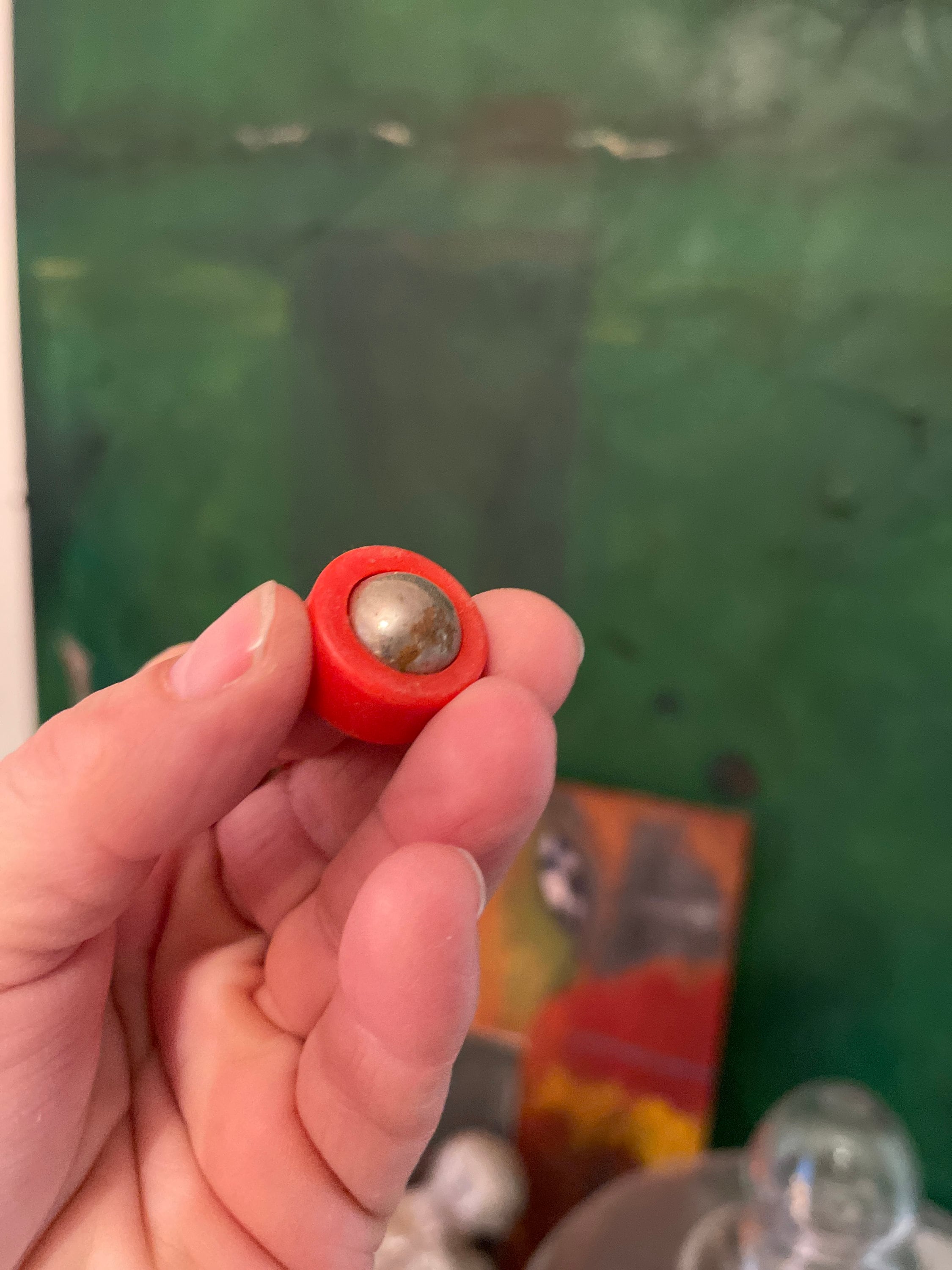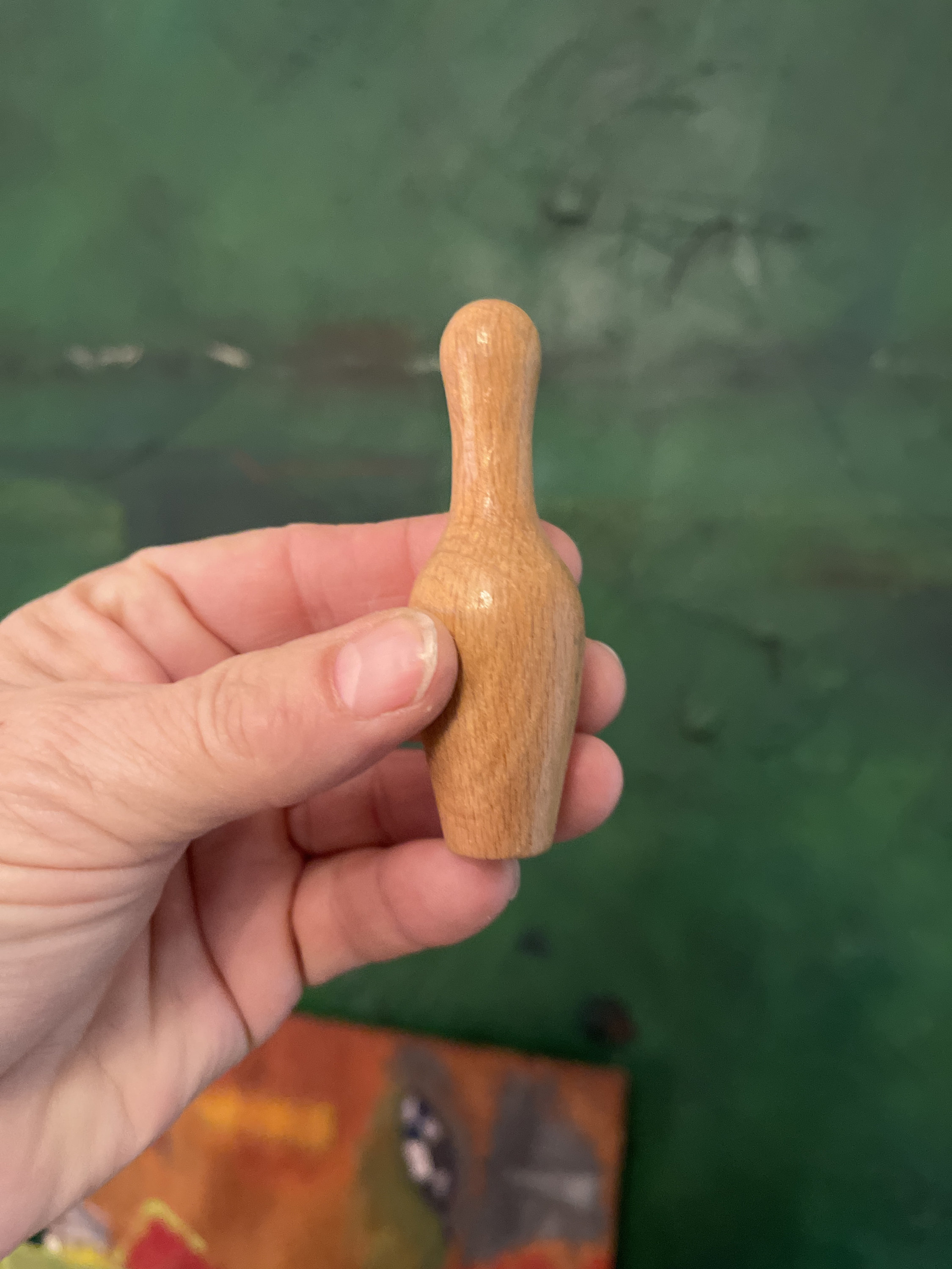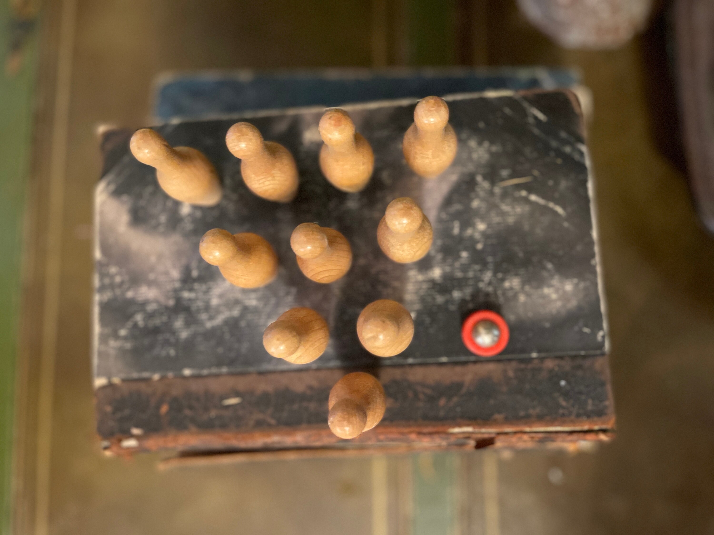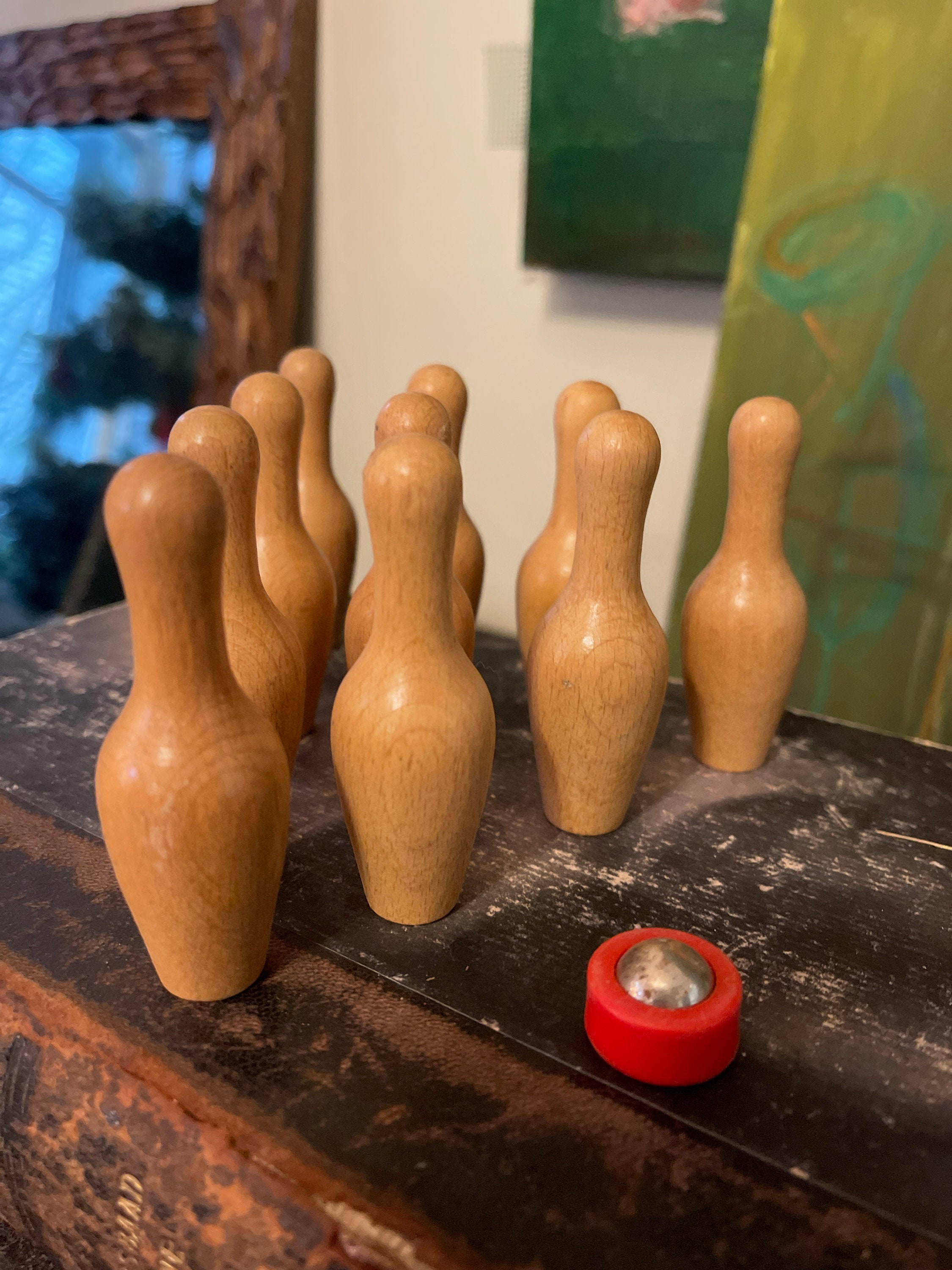 Vintage bowling pin, toy set, includes 10 pins and a metal ball that skims the surface to roll into the pins. We think this makes an adorable display for a bowling lover, especially in their office or on a desk.
