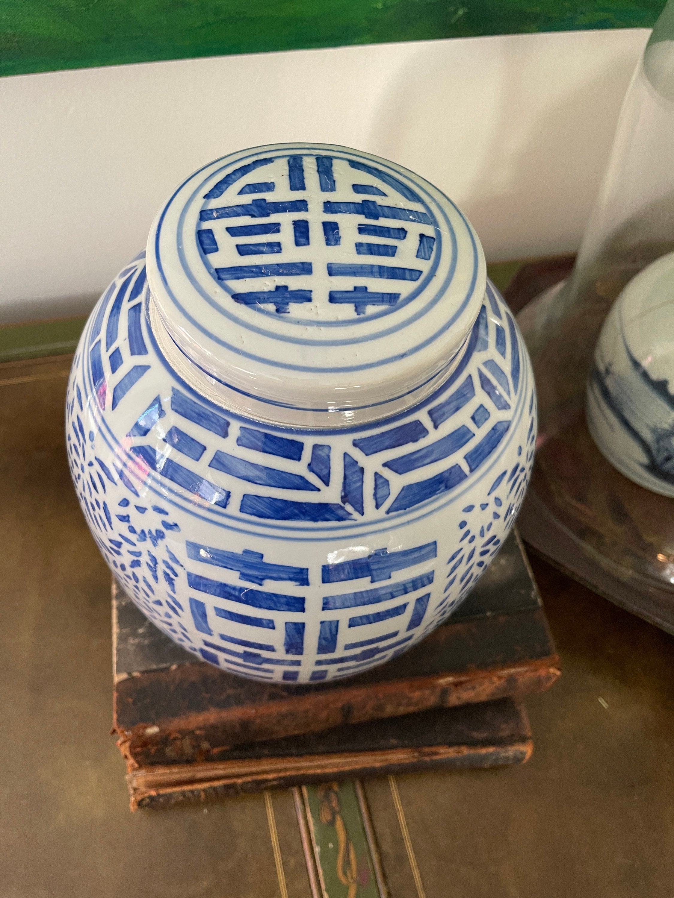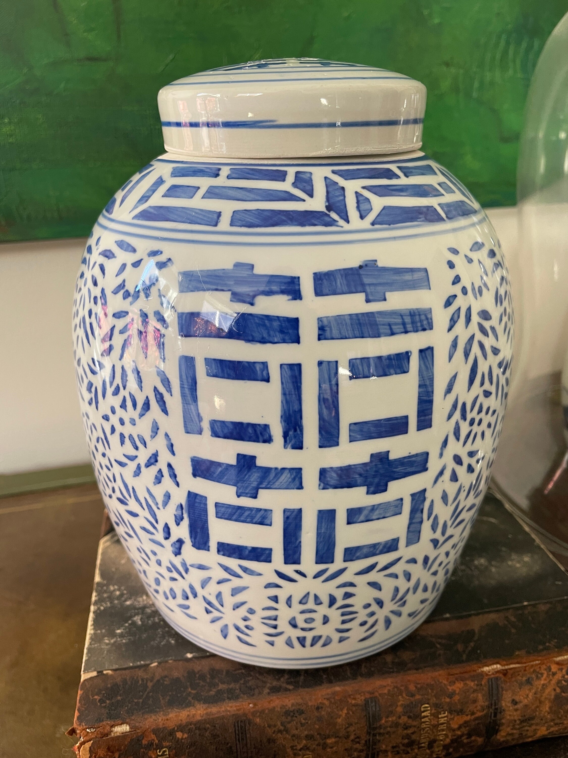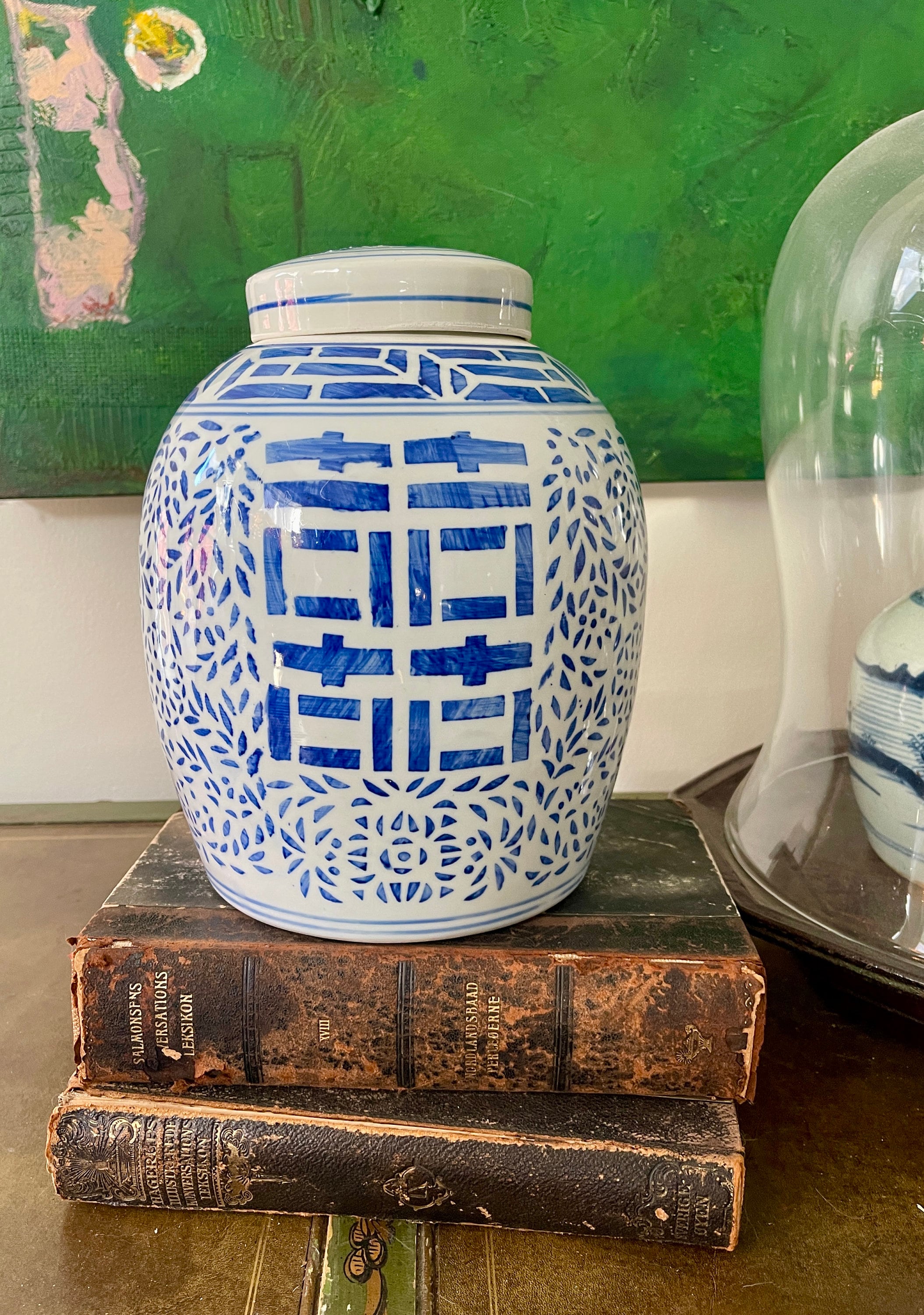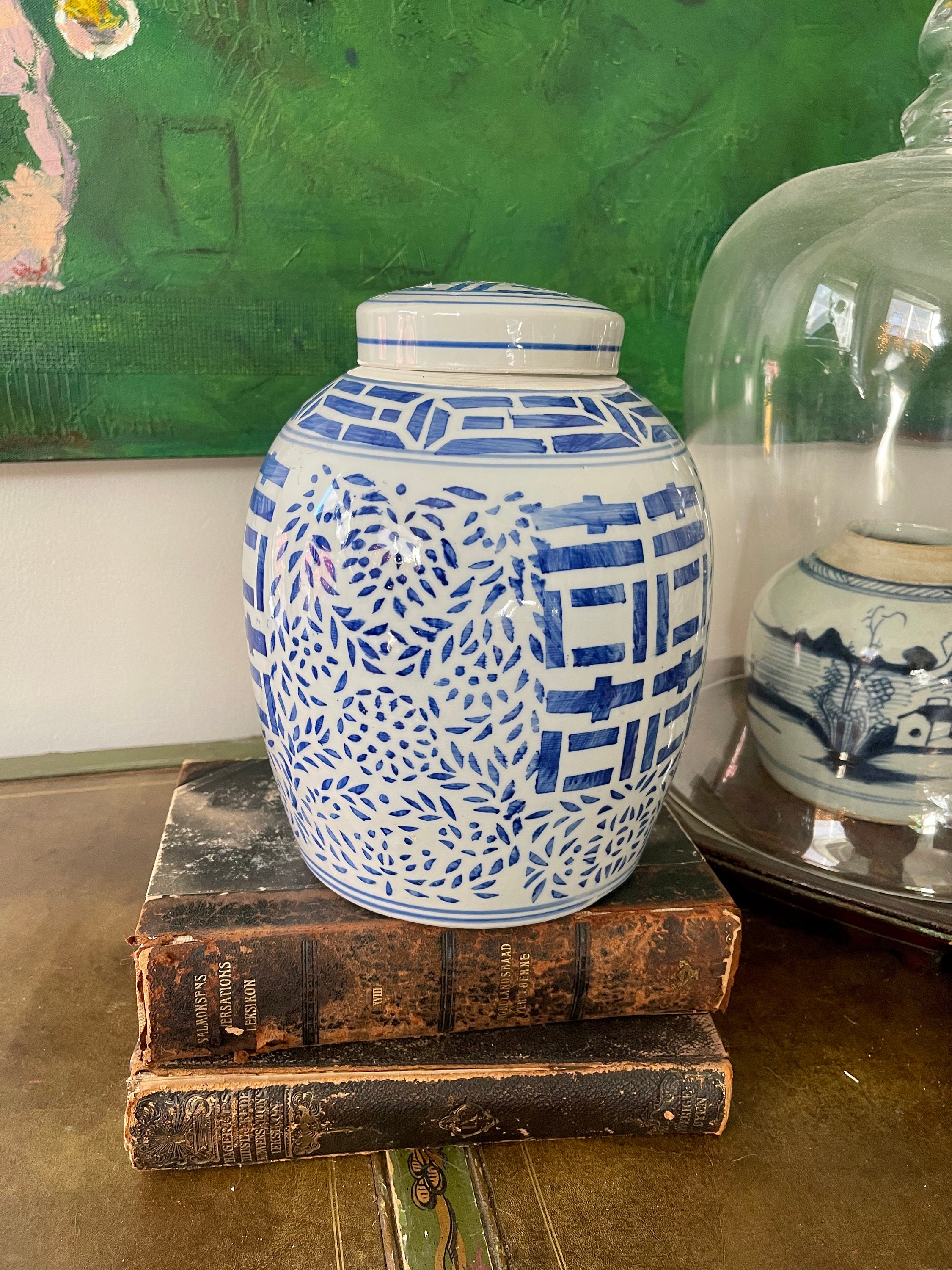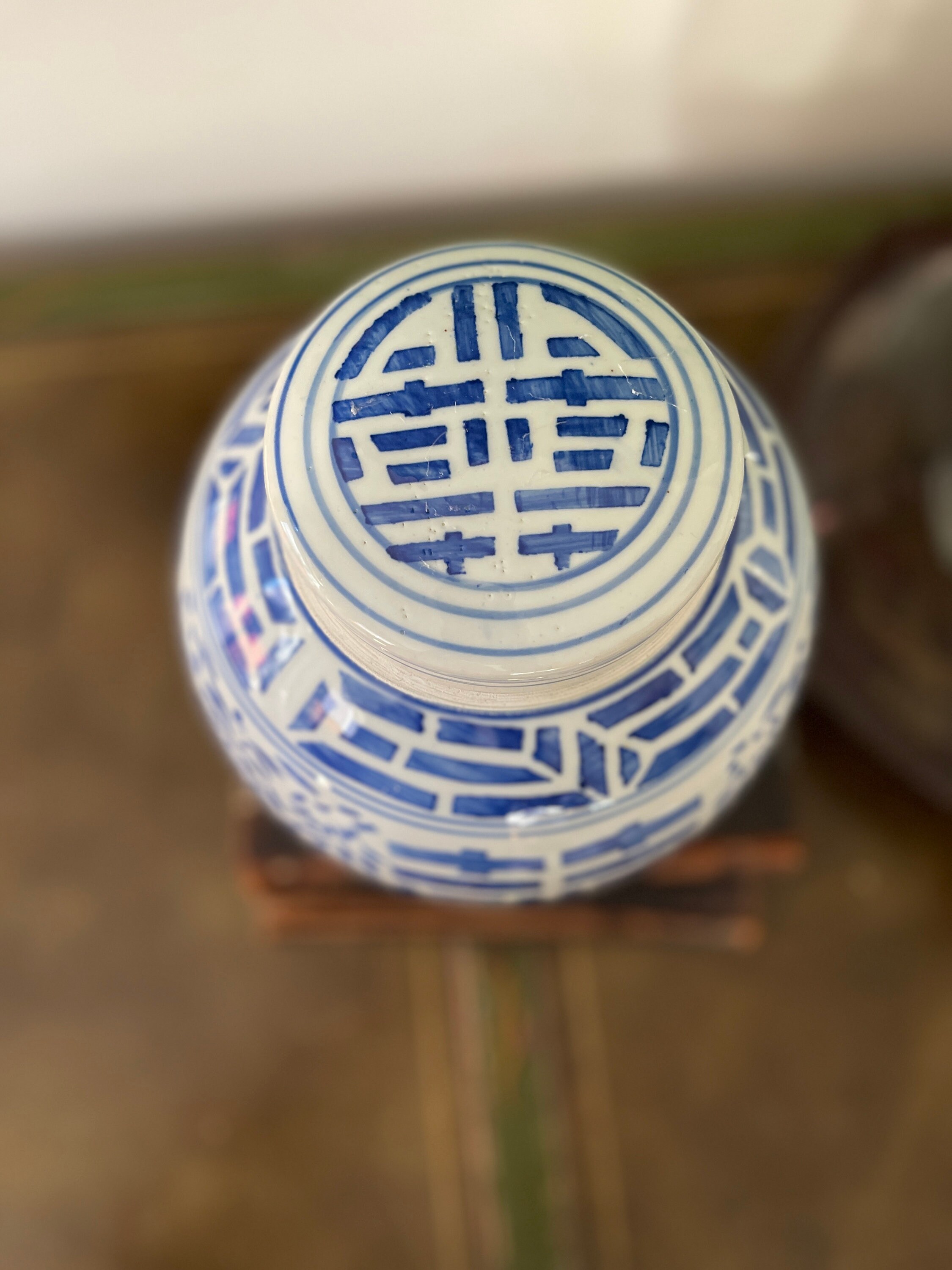 Wonderful, vintage double happiness, lidded jar, presented in a soft white with a rich, royal blue pattern, the double happiness symbol appears on the front, and the back with panels of floral and geometric in between and pattern repeats itself on the lid top. Slightly round body with a flattened lid, it looks great to set among a collection or to bring a bit of chinoiserie vibes into your home